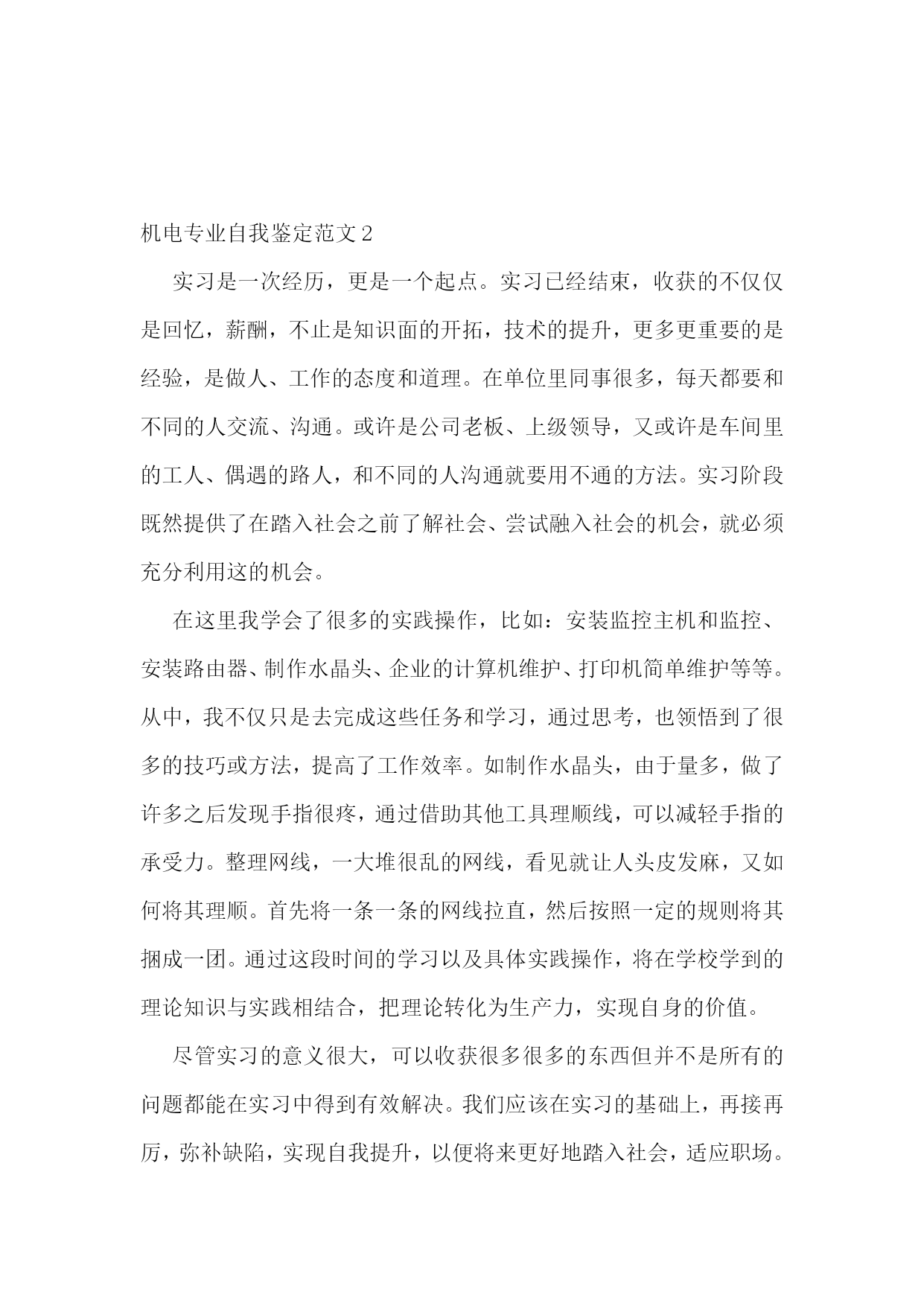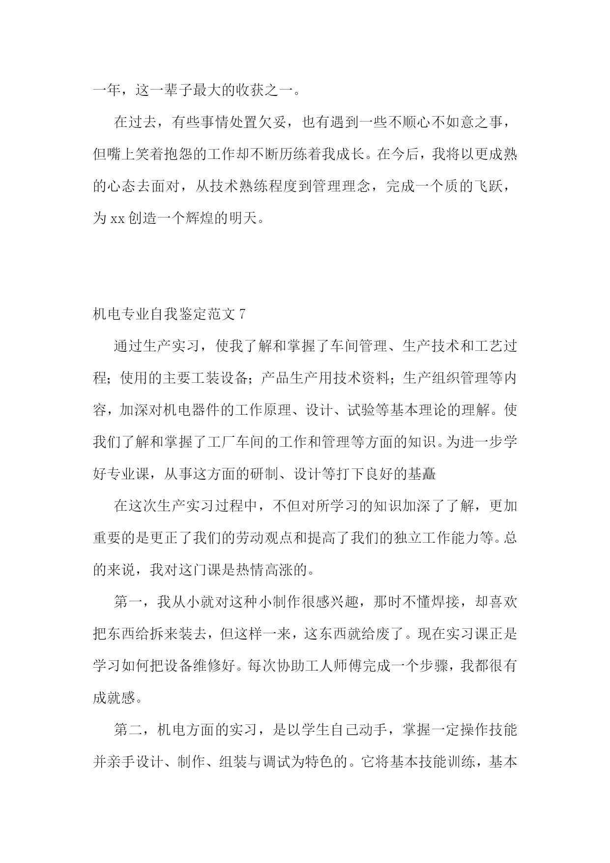 机电专业自我鉴定范文通用9篇机电专业自我鉴定范文1回首三年来的大学生涯,有渴望、有追求、有成功也有失败,我孜孜不倦,执着探求,百般锻炼,逐渐成为了一个能适应社会要求的新时代大学生,并为以后的工作打下坚实的基础。且我相信:用心就一定能赢得精彩!以下就本人三年来的大学生活来作一个自我鉴定:这段大学生活,给了我一次重新塑造自我、完善自我的机会。在思想上:我积极地向党组织靠拢,使我对我们党有了更为深刻的认识。在学习上,我十分热爱自己的专业,在历次的考试中都取得了优异的成绩。我最大的特点是:诚实守信,热心待人,勇于挑战自我。为人处世上,我坚持严于律已,宽以待人。若要人敬已,先要已敬人,良好的人际关系正是建立在理解与沟通基础之上的。同时作为一名即将毕业的xx年应届机电专业的大学生,我所拥有的是年轻和知识,使我不畏困难,善于思考,但年轻也意味着阅历浅,更需要虚心向学。我也深知,毕业只是求学的一小步,社会才是一所真正的大学。我今天的求职,也正是希望得到一个更好的学习机会,同时希望贵单位领导能够给我一个发展的空间,去实现我人生的价值。三年的大学生活,使自己的知识水平、思想境界、工作能力等方面都迈上了一个新的台阶。在这即将挥手告别美好大学生活,踏上社会征途的时候,我整军待发,将以饱满的热情、坚定的信心、高度的责任感投入到新的生活环境中,去迎接新的挑战,攀登新的高峰。机电专业自我鉴定范文2实习是一次经历,更是一个起点。实习已经结束,收获的不仅仅是回忆,薪酬,不止是知识面的开拓,技术的提升,更多更重要的是经验,是做人、工作的态度和道理。在单位里同事很多,每天都要和不同的人交流、沟通。或许是公司老板、上级领导,又或许是车间里的工人、偶遇的路人,和不同的人沟通就要用不通的方法。实习阶段既然提供了在踏入社会之前了解社会、尝试融入社会的机会,就必须充分利用这的机会。在这里我学会了很多的实践操作,比如:安装监控主机和监控、安装路由器、制作水晶头、企业的计算机维护、打印机简单维护等等。从中,我不仅只是去完成这些任务和学习,通过思考,也领悟到了很多的技巧或方法,提高了工作效率。如制作水晶头,由于量多,做了许多之后发现手指很疼,通过借助其他工具理顺线,可以减轻手指的承受力。整理网线,一大堆很乱的网线,看见就让人头皮发麻,又如何将其理顺。首先将一条一条的网线拉直,然后按照一定的规则将其捆成一团。通过这段时间的学习以及具体实践操作,将在学校学到的理论知识与实践相结合,把理论转化为生产力,实现自身的价值。尽管实习的意义很大,可以收获很多很多的东西但并不是所有的问题都能在实习中得到有效解决。我们应该在实习的基础上,再接再厉,弥补缺陷,实现自我提升,以便将来更好地踏入社会,适应职场。机电专业自我鉴定范文3在本次实习中,我不仅对单片机、传感器、伺服电机拖动、电路、电力电子技术等方面的知识有了更加深刻的认识,也锻炼了自己的编程能力,而且增强了自己团队合作意识以及遇到问题解决问题的能力。我们两个人一组,每天都在学院的工程训练中心编程调试宝贝车中度过,每天都在坚持着,虽然这其中的过程不是那么的顺利,经常遇到挫折使我们多次感到气馁,几乎想要放弃,但是最终还是坚持了下来,得到满意的结果。总的来说实习过程是充实的,本次实习让我们对机电一体化技术有了更加深入的了解,实习之中遇到了许多书本上没有的问题,激发了我们运用不同的知识来解决问题的潜能,培养了我们自主学习、运用知识解决问题的能力。在实习中,我和刘俊同学积极讨论,不断分析研究,各施所长,努力配合,这次的实习锻炼了我们团队合作的意识,为我们以后的工作打下良好的基础。本次实习的第一个任务是学习本次实习的专用软件知识和硬件电路,并且完成龙人宝贝机器人的组装与测试,这是我们实习的第一步也是最基础的一步,只有这一步顺利的完成了下面的实习才能够得以继续。在此次实习中,在杭州发动机厂的时间最长,历时12天,分别介绍了凸轮轴孔的加工,数控设备的加工特点,分类及具体运用,曲轴的加工工序以及发动机的具体工作原理。在最后一天,我们还参观了其铸造部,参观了其铸造生产过程。在该厂的实习中,深刻明白了数控机床的生产中发挥的切实作用,以及目前社会对数控机床及数控人才的急需,而在一些重要数控产品,如量大面广的数控车床、铣床、高速高精高性能数控机床等的需求上,决不能过于依赖进口。历时将近一个月的实习结束,该次实习,真正到达机械制造业的第一前线,了解了我国目前制造业的发展状况也粗步了解了机械制造也的发展趋势。在新的世纪里,科学技术必将以更快的速度发展,更快更紧密得融合到各个领域中,而这一切都将大大拓宽机械制造业的发展方向。机电专业自我鉴定范文4光阴似箭,一转眼,我已完成在镇江高等专科学校机电专业的学习了。在大学四年的美丽时光中,我