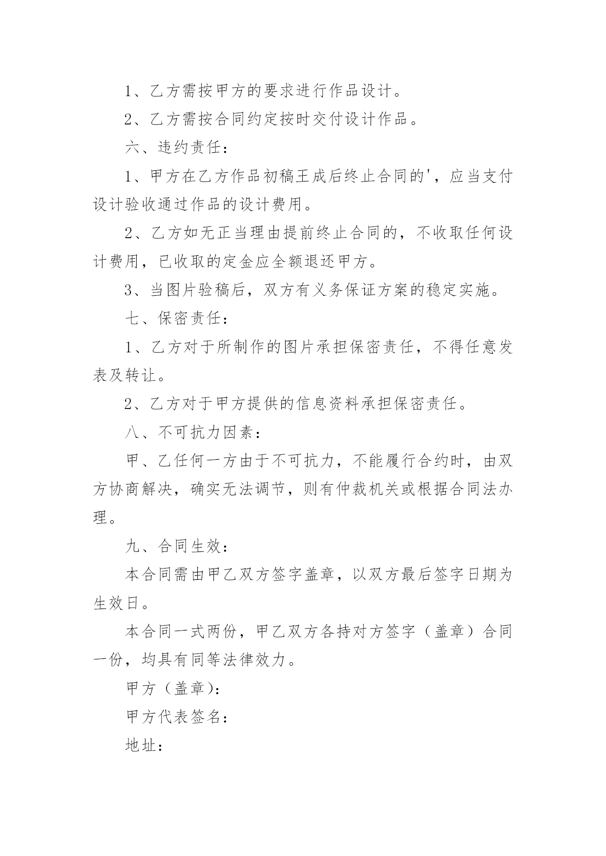 设计合同关于设计合同随着时间的推移,合同的类型越来越多,签订合同是为了保障双方的利益,避免不必要的争端。你所见过的合同是什么样的呢?下面是小编帮大家整理的关于设计合同,欢迎大家借鉴与参考,希望对大家有所帮助。关于设计合同1甲方:代表人:乙方依据《中华人民共和国共和国合同法》和有关法规的规定,乙方接受甲方的委托,就委托涉及事项,双方经协商一致、签订本合同、信守执行。一、设计项目:(每项/元)1、项目价格:2、项目内容:公司网站美工设计3、图片格式:PNG、PDS文件二、付款方式:1、乙方开始设计前,甲方支付项目设计费定金20%;2、乙方完成项目设计后,甲方结清尾款费用80%;三、设计的时间:1、样稿图片:乙方在收到预付款后第二个工作日开始设计,初稿设计时间3-5个工作日;2、修改图片:根据甲方建议对项目图片进行相应的调整与修改,修改时间2个工作日;四、知识产权约定:1、乙方保证所设计的图片为原创作品,不得侵犯任何人的权利;2、乙方设计完的作品,甲方将委托设计的所有费用结算完毕后,所有作品使用权及设计著作权均归甲方所有,乙方不得以任何形式转让设计作品。五、双方的权利义务:甲方权利:1、甲方有权对乙方的设计提出建议和思路,以使乙方设计的作品更符合甲方企业文化内涵。2、甲方有权对乙方所设计的作品提出修改意见。甲方义务:1、甲方按照合同约定支付相关费用。2、甲方有义务提供有关企业资料或其他有关的资料给乙方,并保证资料的真实性。乙方权利:1、乙方有权要求甲方提供有关企业资料供乙方设计参考。2、乙方有权要求甲方按照合同约定支付相应款项。乙方义务:1、乙方需按甲方的要求进行作品设计。2、乙方需按合同约定按时交付设计作品。六、违约责任:1、甲方在乙方作品初稿王成后终止合同的',应当支付设计验收通过作品的设计费用。2、乙方如无正当理由提前终止合同的,不收取任何设计费用,已收取的定金应全额退还甲方。3、当图片验稿后,双方有义务保证方案的稳定实施。七、保密责任:1、乙方对于所制作的图片承担保密责任,不得任意发表及转让。2、乙方对于甲方提供的信息资料承担保密责任。八、不可抗力因素:甲、乙任何一方由于不可抗力,不能履行合约时,由双方协商解决,确实无法调节,则有仲裁机关或根据合同法办理。九、合同生效:本合同需由甲乙双方签字盖章,以双方最后签字日期为生效日。本合同一式两份,甲乙双方各持对方签字(盖章)合同一份,均具有同等法律效力。甲方(盖章):甲方代表签名:地址:传真:日期:乙方(盖章):乙方代表签名:地址:传真:日期:关于设计合同2发包人(甲方):承包人(乙方):依照《中华人民共和国合同法》、《中华人民共和国建筑法》及其它有关法律、行政法规,遵循平等、自愿、公平和诚实信用的原则,双方就本合同范围内拆除工程施工事项协商一致,订立本合同。一、工程概况、承包范围及技术要求1、工程概况:工程名称:结构加固改造工程2、主要施工范围:(地上1至3层、地下1层)以甲方年月日下发的施工图纸所包含的加固、新建、拆除的已确定的工程内容。零星变更及其它加固、拆改、新建等工作,以现场确认单形式确认,并单独批价。二、合同工期工程质量标准:满足发包方设计、使用、技术要求,达到国家备案验收标准,工程质量合格。三、规范及质量标准:1、执行规范:《建筑拆除工程安全技术规范》(JGJ147-20xx)、《建筑施工扣件式钢管脚手架安全技术规范》(JGJ130-20xx)、《施工现场临时用电安全技术规范》(JGJ46-20xx)、2、质量标准:工程质量满足甲方要求。四、合同价款、承包方式及支付方式1、本工程采用以下承包方式:固定单价。本合同暂定总价款人民币¥:元,大写。暂估总价包含因施工无场地及材料周转、保证工期采取的特殊措施性费用固定包死共计万元,若因承包人原因无法按期完工,发包人有权扣除该特殊措施费万元。合同期内不得因政府调整预算定额或市场原材料价格上涨或自身管理费上升或承包人图纸理解错误等各种因素而调整固定单价。本合同的工程量均为暂估,结算时工程量按实调整。本预算不含工程水电费,工程水电费按实计取。2、工程款支付方式:①、本工程签订合同后,按照乙方上报施工进度计划,乙方前完成全部具备施工条件的部位的加固粘钢工作,甲方支付合同价款的;同时乙方提供相应金额的正式发票。②、图纸范围内具备施工条件的工程全部完工并提供相应金额的正式发票后,经甲方同意后支付至合同金额的85%;③、工程竣工验收合格后,办理结算手续后支付至结算总价款的95%(提供全额发票);④、乙方必须提供真实、有效、合法的正式发票,否则甲方有权拒绝付款,若因乙方提供发票给甲方造成任何经济损失的,由乙方负责。⑤、在质量保修期(12个月)满后一次性支付剩余价款(无息支付)。3、竣工结算:⑴工程验收合格后一周内,乙方向甲方上报工程结算书
