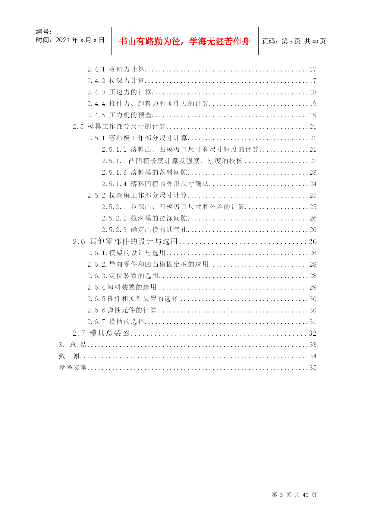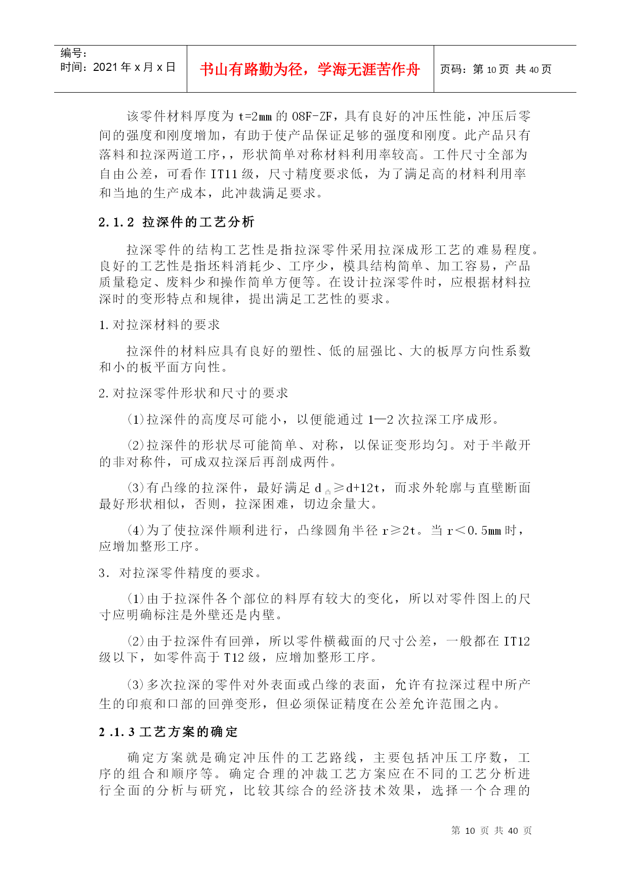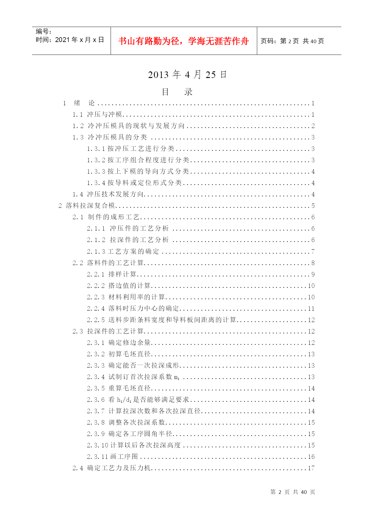 编号:时间:2021年x月x日书山有路勤为径,学海无涯苦作舟页码:第PAGE40页共NUMPAGES40页第PAGE\*MERGEFORMAT40页共NUMPAGES\*MERGEFORMAT40页****************学校毕业设计说明书毕业设计题目:落料拉深复合模具的设计系部:材料工程系专业:模具设计与制造班级:************学生姓名:**********学号:**********指导教师:**********2013年4月25日目录TOC\o"1-4"\h\uHYPERLINK\l_Toc185621绪论1HYPERLINK\l_Toc163771.1冲压与冲模1HYPERLINK\l_Toc99991.2冷冲压模具的现状与发展方向2HYPERLINK\l_Toc250351.3冷冲压模具的分类3HYPERLINK\l_Toc62231.3.1按冲压工艺进行分类3HYPERLINK\l_Toc236961.3.2按工序组合程度进行分类3HYPERLINK\l_Toc175571.3.3按上下模的导向方式分类4HYPERLINK\l_Toc270371.3.4按导料或定位形式分类4HYPERLINK\l_Toc125251.4冲压技术发展方向4HYPERLINK\l_Toc37612落料拉深复合模5HYPERLINK\l_Toc54952.1制件的成形工艺6HYPERLINK\l_Toc121312.1.1冲压件的工艺分析6HYPERLINK\l_Toc275422.1.2拉深件的工艺分析6HYPERLINK\l_Toc69182.1.3工艺方案的确定7HYPERLINK\l_Toc68602.2落料件的工艺计算8HYPERLINK\l_Toc6822.2.1排样计算9HYPERLINK\l_Toc84992.2.2搭边值的计算10HYPERLINK\l_Toc246082.2.3材料利用率的计算10HYPERLINK\l_Toc155982.2.4落料时压力中心的确定11HYPERLINK\l_Toc241122.2.5送料步距条料宽度和导料板间距离的计算12HYPERLINK\l_Toc15562.3拉深件的工艺计算12HYPERLINK\l_Toc49582.3.1确定修边余量12HYPERLINK\l_Toc94252.3.2初算毛坯直径13HYPERLINK\l_Toc112462.3.3确定能否一次拉深成形13HYPERLINK\l_Toc281312.3.4试制订首次拉深系数m113HYPERLINK\l_Toc176812.3.5重算毛坯直径14HYPERLINK\l_Toc162762.3.6看h1/d1是否能够满足要求14HYPERLINK\l_Toc26462.3.7计算拉深次数和各次拉深直径14HYPERLINK\l_Toc30352.3.8调整各次拉深系数15HYPERLINK\l_Toc286372.3.9确定各工序圆角半径15HYPERLINK\l_Toc82782.3.10计算以后各次拉深高度15HYPERLINK\l_Toc304262.3.11画工序图16HYPERLINK\l_Toc8212.4确定工艺力及压力机17HYPERLINK\l_Toc59872.4.1落料力计算17HYPERLINK\l_Toc133872.4.2拉深力计算17HYPERLINK\l_Toc4292.4.3压边力的计算18HYPERLINK\l_Toc235232.4.4推件力、卸料力和顶件力的计算19HYPERLINK\l_Toc148762.4.5压力机的预选19HYPERLINK\l_Toc320152.5模具工作部分尺寸的计算21HYPERLINK\l_Toc283652.5.1落料模工作部分尺寸计算21HYPERLINK\l_Toc121612.5.1.1落料凸﹑凹模刃口尺寸和尺寸精度的计算21HYPERLINK\l_Toc67922.5.1.2凸凹模长度计算及强度、刚度的校核22HYPERLINK\l_Toc177222.5.1.3落料模的落料间隙23HYPERLINK\l_To