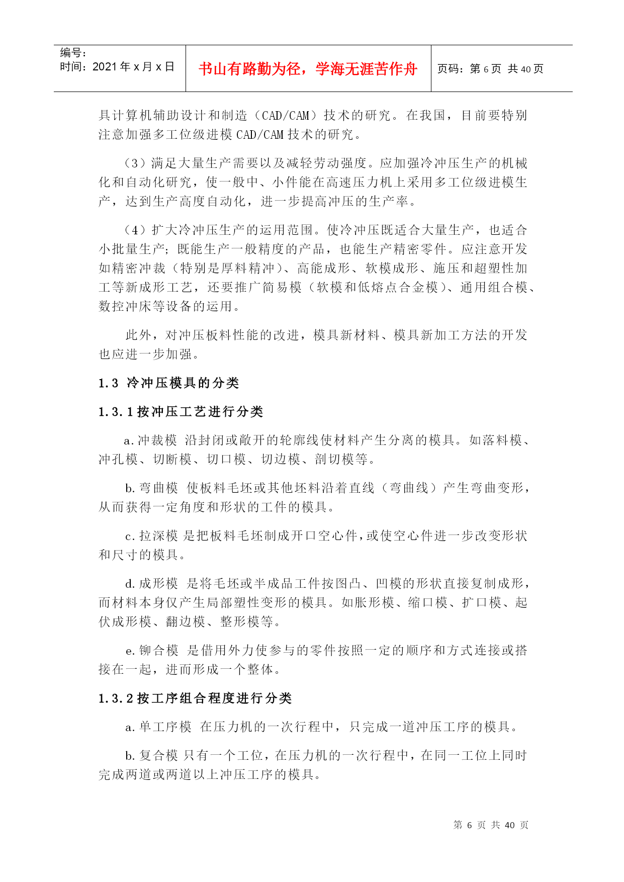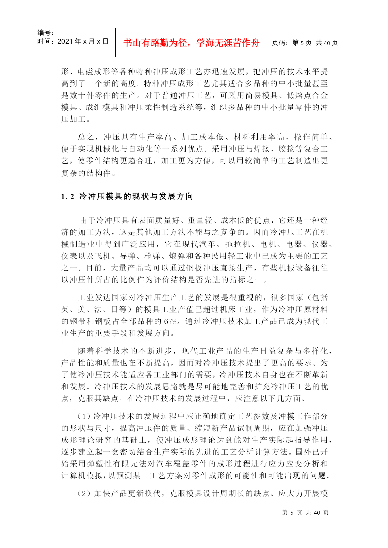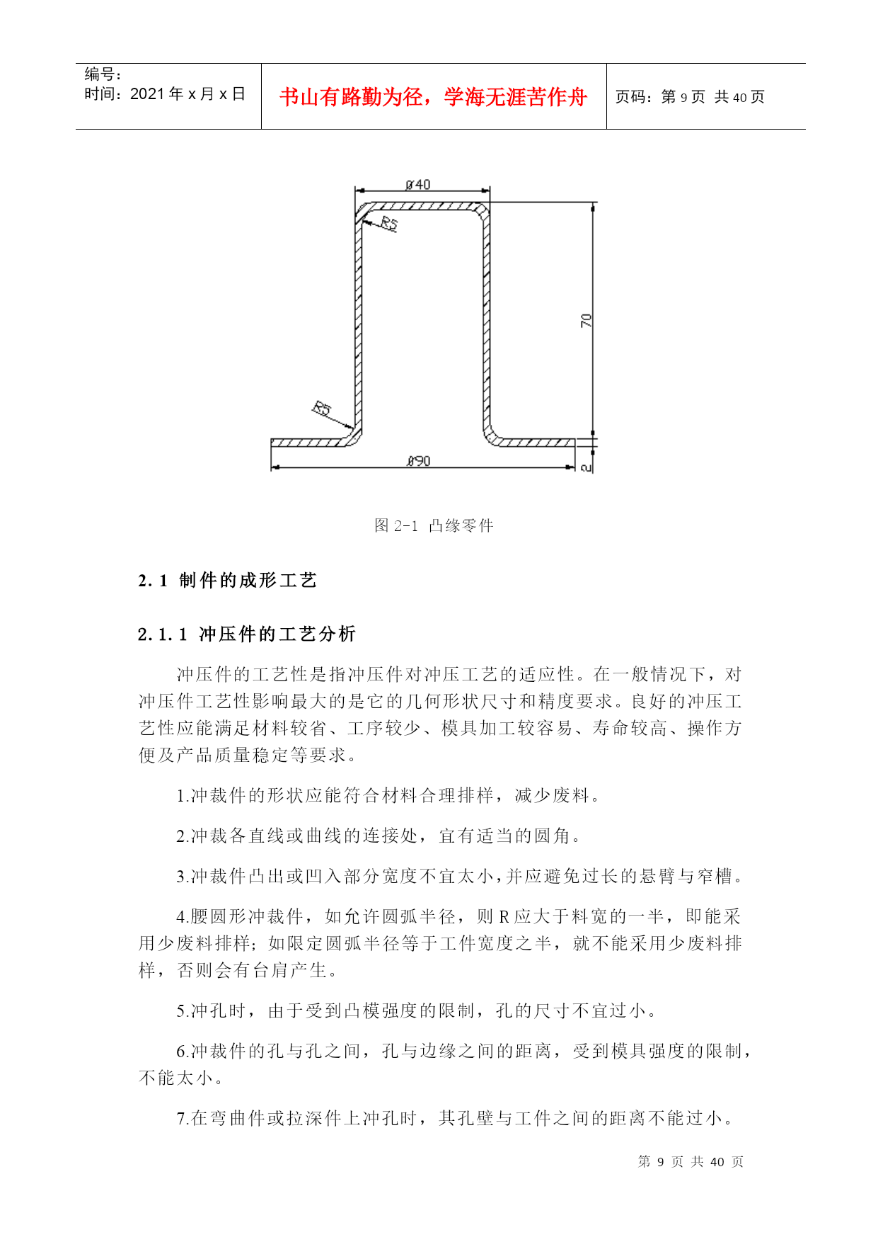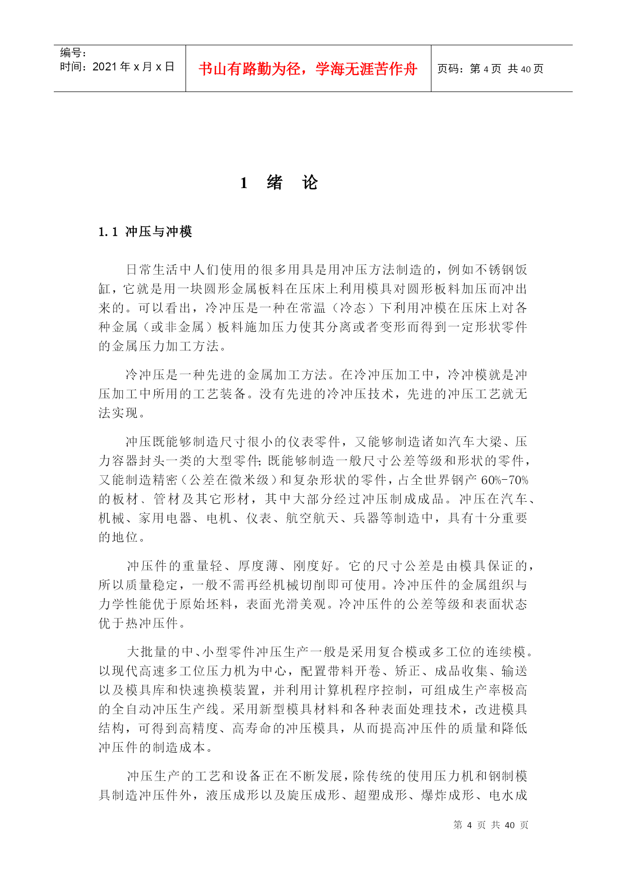 编号:时间:2021年x月x日书山有路勤为径,学海无涯苦作舟页码:第PAGE40页共NUMPAGES40页第PAGE\*MERGEFORMAT40页共NUMPAGES\*MERGEFORMAT40页****************学校毕业设计说明书毕业设计题目:落料拉深复合模具的设计系部:材料工程系专业:模具设计与制造班级:************学生姓名:**********学号:**********指导教师:**********2013年4月25日目录TOC\o"1-4"\h\uHYPERLINK\l_Toc185621绪论1HYPERLINK\l_Toc163771.1冲压与冲模1HYPERLINK\l_Toc99991.2冷冲压模具的现状与发展方向2HYPERLINK\l_Toc250351.3冷冲压模具的分类3HYPERLINK\l_Toc62231.3.1按冲压工艺进行分类3HYPERLINK\l_Toc236961.3.2按工序组合程度进行分类3HYPERLINK\l_Toc175571.3.3按上下模的导向方式分类4HYPERLINK\l_Toc270371.3.4按导料或定位形式分类4HYPERLINK\l_Toc125251.4冲压技术发展方向4HYPERLINK\l_Toc37612落料拉深复合模5HYPERLINK\l_Toc54952.1制件的成形工艺6HYPERLINK\l_Toc121312.1.1冲压件的工艺分析6HYPERLINK\l_Toc275422.1.2拉深件的工艺分析6HYPERLINK\l_Toc69182.1.3工艺方案的确定7HYPERLINK\l_Toc68602.2落料件的工艺计算8HYPERLINK\l_Toc6822.2.1排样计算9HYPERLINK\l_Toc84992.2.2搭边值的计算10HYPERLINK\l_Toc246082.2.3材料利用率的计算10HYPERLINK\l_Toc155982.2.4落料时压力中心的确定11HYPERLINK\l_Toc241122.2.5送料步距条料宽度和导料板间距离的计算12HYPERLINK\l_Toc15562.3拉深件的工艺计算12HYPERLINK\l_Toc49582.3.1确定修边余量12HYPERLINK\l_Toc94252.3.2初算毛坯直径13HYPERLINK\l_Toc112462.3.3确定能否一次拉深成形13HYPERLINK\l_Toc281312.3.4试制订首次拉深系数m113HYPERLINK\l_Toc176812.3.5重算毛坯直径14HYPERLINK\l_Toc162762.3.6看h1/d1是否能够满足要求14HYPERLINK\l_Toc26462.3.7计算拉深次数和各次拉深直径14HYPERLINK\l_Toc30352.3.8调整各次拉深系数15HYPERLINK\l_Toc286372.3.9确定各工序圆角半径15HYPERLINK\l_Toc82782.3.10计算以后各次拉深高度15HYPERLINK\l_Toc304262.3.11画工序图16HYPERLINK\l_Toc8212.4确定工艺力及压力机17HYPERLINK\l_Toc59872.4.1落料力计算17HYPERLINK\l_Toc133872.4.2拉深力计算17HYPERLINK\l_Toc4292.4.3压边力的计算18HYPERLINK\l_Toc235232.4.4推件力、卸料力和顶件力的计算19HYPERLINK\l_Toc148762.4.5压力机的预选19HYPERLINK\l_Toc320152.5模具工作部分尺寸的计算21HYPERLINK\l_Toc283652.5.1落料模工作部分尺寸计算21HYPERLINK\l_Toc121612.5.1.1落料凸﹑凹模刃口尺寸和尺寸精度的计算21HYPERLINK\l_Toc67922.5.1.2凸凹模长度计算及强度、刚度的校核22HYPERLINK\l_Toc177222.5.1.3落料模的落料间隙23HYPERLINK\l_To