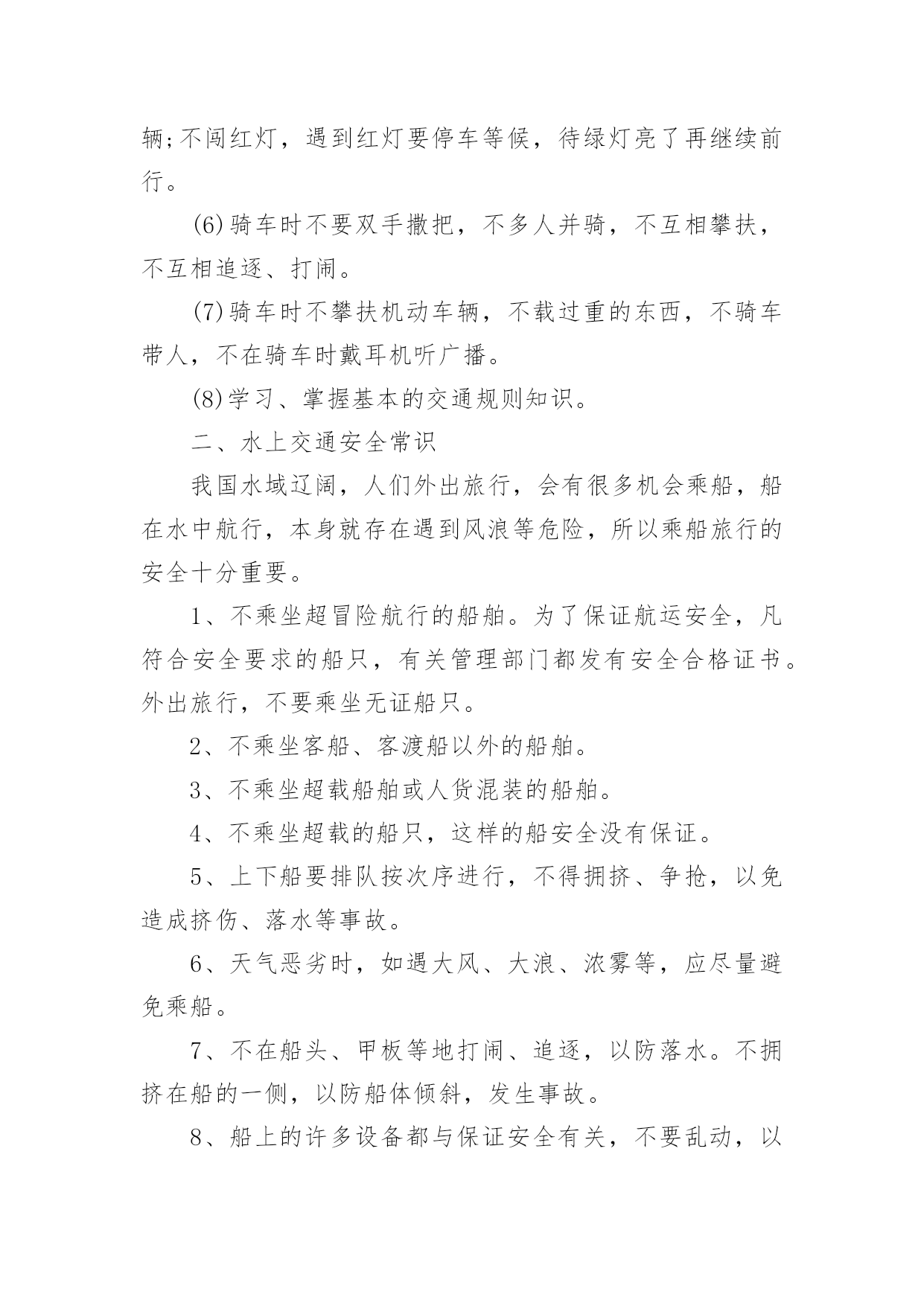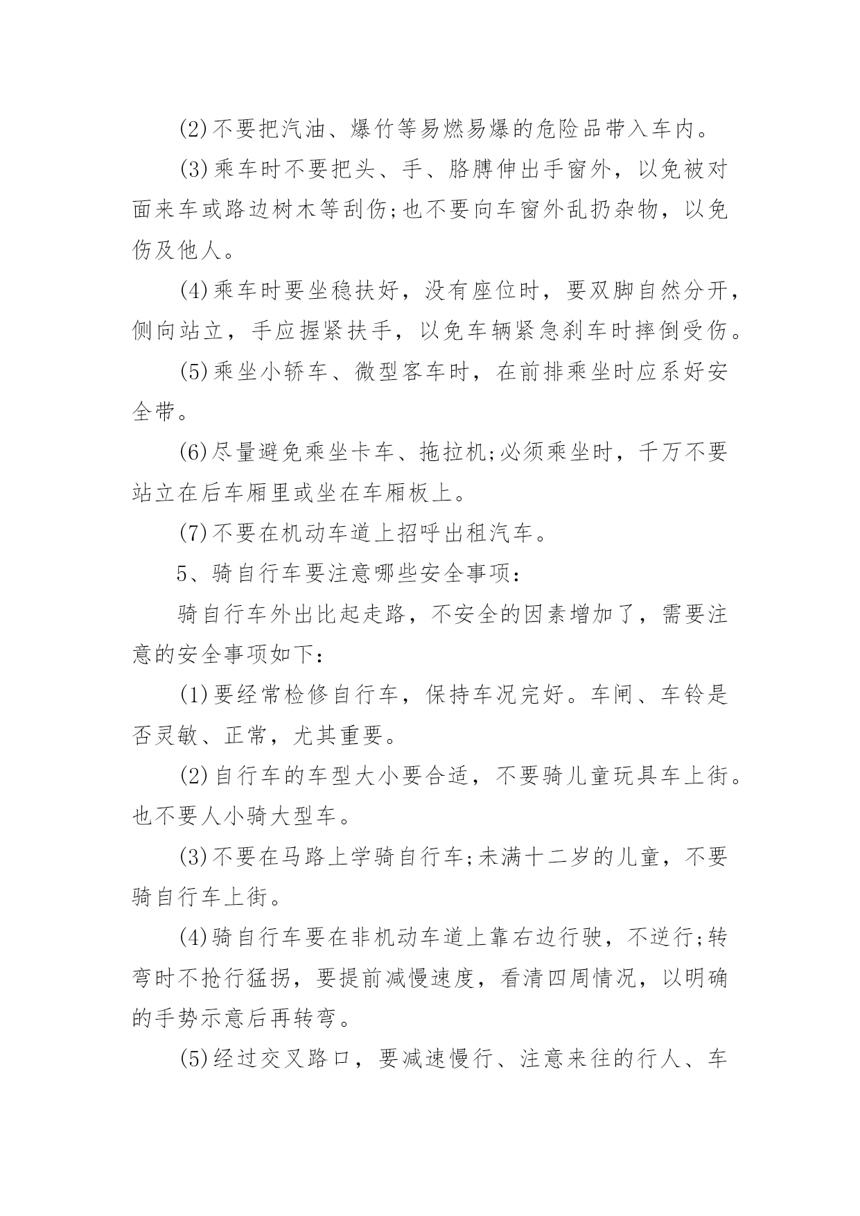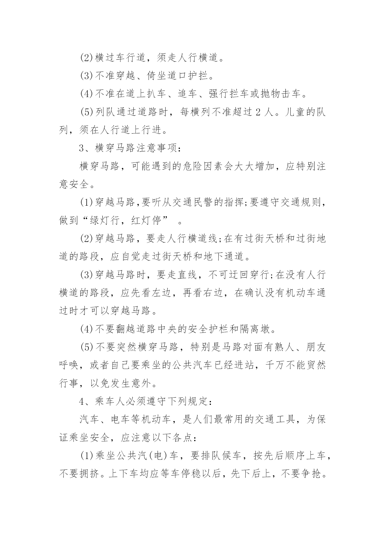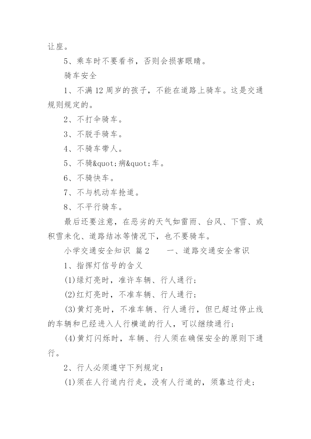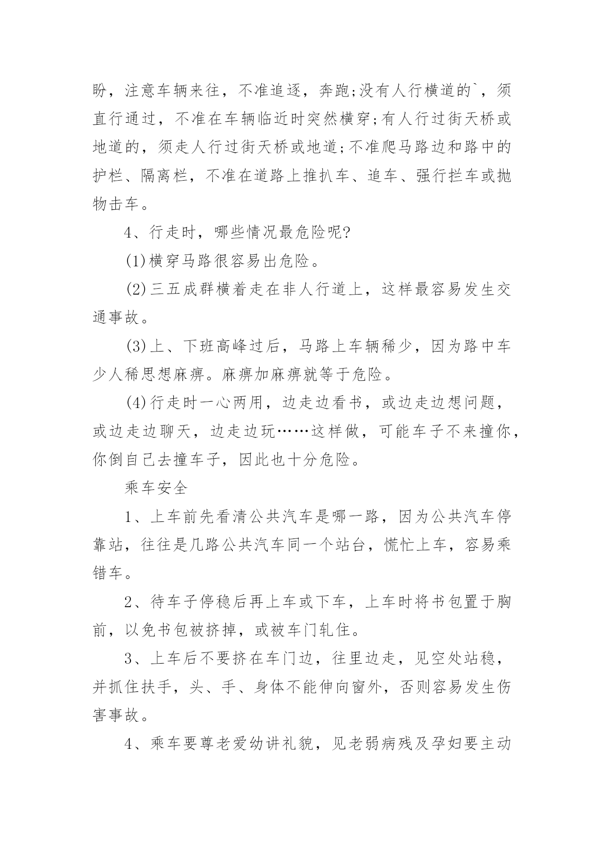小学交通安全知识小学交通安全知识我们知道人、车、路是构成道路交通的三个基本要素。作为我们小学生来说,无论你是在上学、放学途中,还是乘坐父母家长的接送车,或乘坐公交车,都等于直接参与了道路交通。因此我们都需要学习一些交通安全知识。下面是百分网小编为大家整理的关于小学交通安全知识,希望大家喜欢!小学交通安全知识篇1行走的安全常识每位同学必须牢记如下行走安全常识:1、指挥灯信号绿灯亮时,准许行人通行;黄灯亮时,不准行人通行,但已进入人行道的行人,可以继续通行;红灯亮时,不准行人通行;黄灯闪烁时,行人须在确保安全的原则下通行。2、人行横道信号灯绿灯亮时,准许行人通过人行横道;绿灯闪烁时,不准行人进入人行横道,但已进入人行横道的可以继续通行;红灯亮时,不准行人进入人行横道。3、行人必须遵守的规定行人须在人行道内行走,没有人行道靠右边行走;穿越马路须走人行横道;通过有交通信号控制的人行横道,须遵守信号的规定;通过没有交通信号控制的人行道,要左顾右盼,注意车辆来往,不准追逐,奔跑;没有人行横道的`,须直行通过,不准在车辆临近时突然横穿;有人行过街天桥或地道的,须走人行过街天桥或地道;不准爬马路边和路中的护栏、隔离栏,不准在道路上推扒车、追车、强行拦车或抛物击车。4、行走时,哪些情况最危险呢?(1)横穿马路很容易出危险。(2)三五成群横着走在非人行道上,这样最容易发生交通事故。(3)上、下班高峰过后,马路上车辆稀少,因为路中车少人稀思想麻痹。麻痹加麻痹就等于危险。(4)行走时一心两用,边走边看书,或边走边想问题,或边走边聊天,边走边玩……这样做,可能车子不来撞你,你倒自己去撞车子,因此也十分危险。乘车安全1、上车前先看清公共汽车是哪一路,因为公共汽车停靠站,往往是几路公共汽车同一个站台,慌忙上车,容易乘错车。2、待车子停稳后再上车或下车,上车时将书包置于胸前,以免书包被挤掉,或被车门轧住。3、上车后不要挤在车门边,往里边走,见空处站稳,并抓住扶手,头、手、身体不能伸向窗外,否则容易发生伤害事故。4、乘车要尊老爱幼讲礼貌,见老弱病残及孕妇要主动让座。5、乘车时不要看书,否则会损害眼睛。骑车安全1、不满12周岁的孩子,不能在道路上骑车。这是交通规则规定的。2、不打伞骑车。3、不脱手骑车。4、不骑车带人。5、不骑"病"车。6、不骑快车。7、不与机动车抢道。8、不平行骑车。最后还要注意,在恶劣的天气如雷雨、台风、下雪、或积雪未化、道路结冰等情况下,也不要骑车。小学交通安全知识篇2一、道路交通安全常识1、指挥灯信号的含义(1)绿灯亮时,准许车辆、行人通行;(2)红灯亮时,不准车辆、行人通行;(3)黄灯亮时,不准车辆、行人通行,但已超过停止线的车辆和已经进入人行横道的行人,可以继续通行;(4)黄灯闪烁时,车辆、行人须在确保安全的原则下通行。2、行人必须遵守下列规定:(1)须在人行道内行走,没有人行道的,须靠边行走;(2)横过车行道,须走人行横道。(3)不准穿越、倚坐道口护拦。(4)不准在道上扒车、追车、强行拦车或抛物击车。(5)列队通过道路时,每横列不准超过2人。儿童的队列,须在人行道上行进。3、横穿马路注意事项:横穿马路,可能遇到的危险因素会大大增加,应特别注意安全。(1)穿越马路,要听从交通民警的指挥;要遵守交通规则,做到“绿灯行,红灯停”。(2)穿越马路,要走人行横道线;在有过街天桥和过街地道的路段,应自觉走过街天桥和地下通道。(3)穿越马路时,要走直线,不可迂回穿行;在没有人行横道的路段,应先看左边,再看右边,在确认没有机动车通过时才可以穿越马路。(4)不要翻越道路中央的安全护栏和隔离墩。(5)不要突然横穿马路,特别是马路对面有熟人、朋友呼唤,或者自己要乘坐的公共汽车已经进站,千万不能贸然行事,以免发生意外。4、乘车人必须遵守下列规定:汽车、电车等机动车,是人们最常用的交通工具,为保证乘坐安全,应注意以下各点:(1)乘坐公共汽(电)车,要排队候车,按先后顺序上车,不要拥挤。上下车均应等车停稳以后,先下后上,不要争抢。(2)不要把汽油、爆竹等易燃易爆的危险品带入车内。(3)乘车时不要把头、手、胳膊伸出手窗外,以免被对面来车或路边树木等刮伤;也不要向车窗外乱扔杂物,以免伤及他人。(4)乘车时要坐稳扶好,没有座位时,要双脚自然分开,侧向站立,手应握紧扶手,以免车辆紧急刹车时摔倒受伤。(5)乘坐小轿车、微型客车时,在前排乘坐时应系好安全带。(6)尽量避免乘坐卡车、拖拉机;必须乘坐时,千万不要站立在后车厢里或坐在车厢板上。(7)不要在机动车道上招呼出租汽车。5、骑自行车要注意哪些安全事项:骑自行车外出比起走路,不安全的因素增加了,需要注意的安全事项如下:(1)要经常检修自行车,保持车况完好。车闸、车铃是否灵敏、正常,尤其重要。(2)