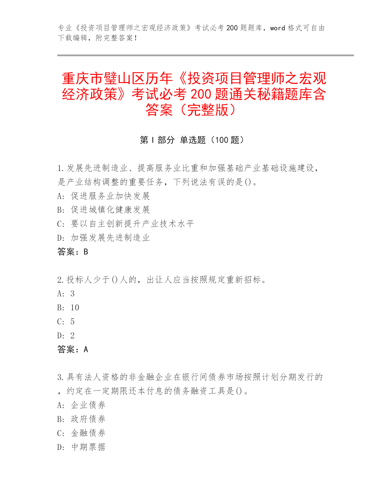 重庆市璧山区历年《投资项目管理师之宏观经济政策》考试必考200题通关秘籍题库含答案(完整版)