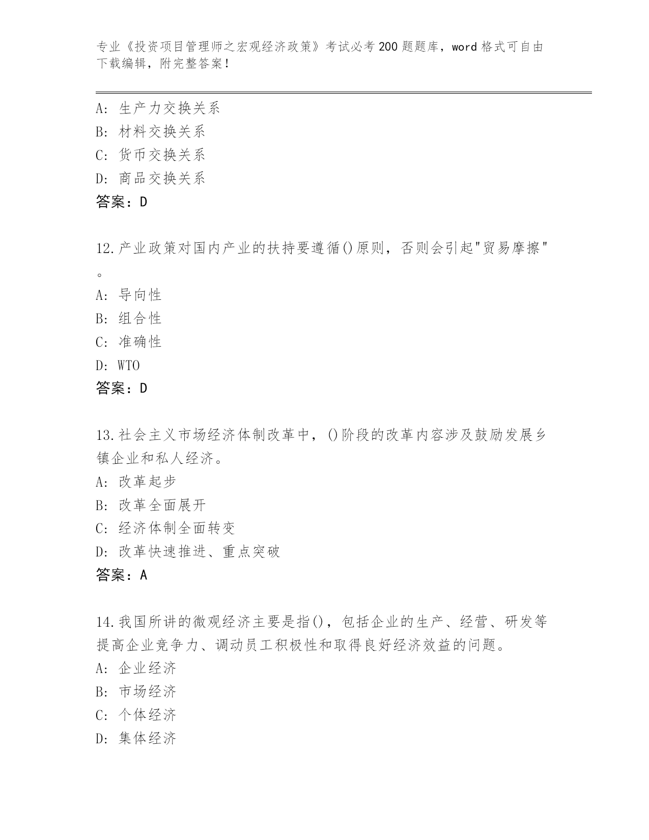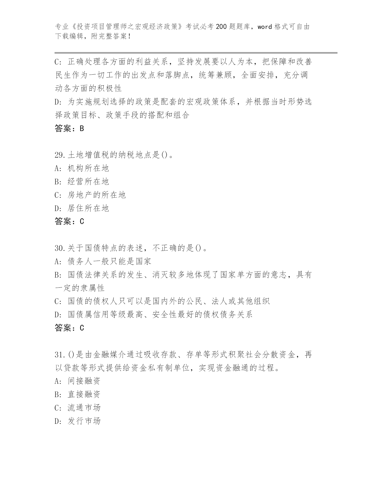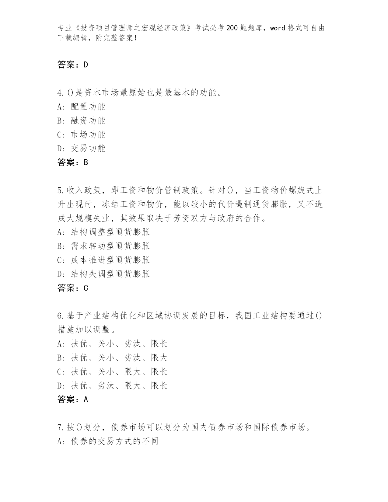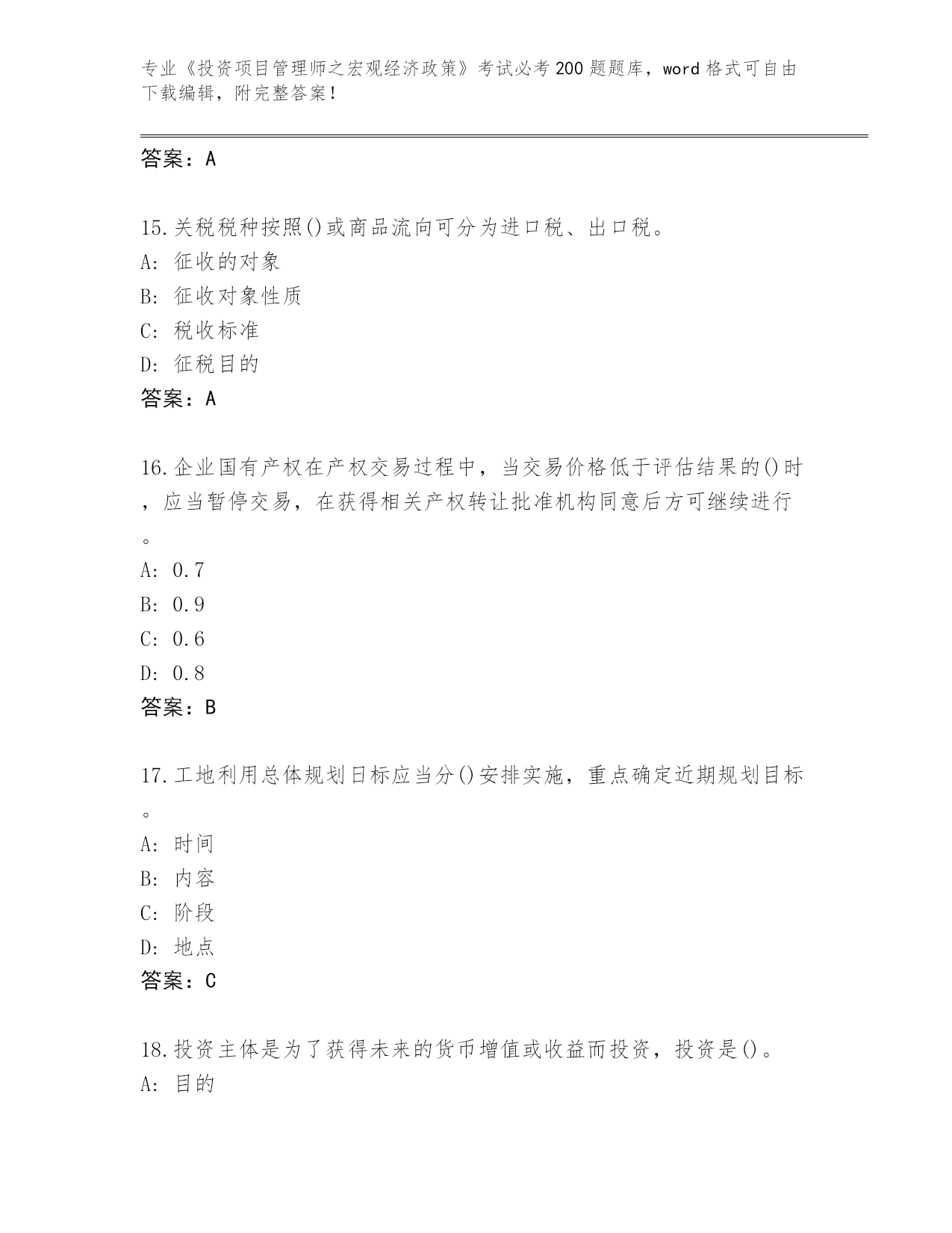 重庆市璧山区完整版《投资项目管理师之宏观经济政策》考试必考200题题库大全(研优卷)