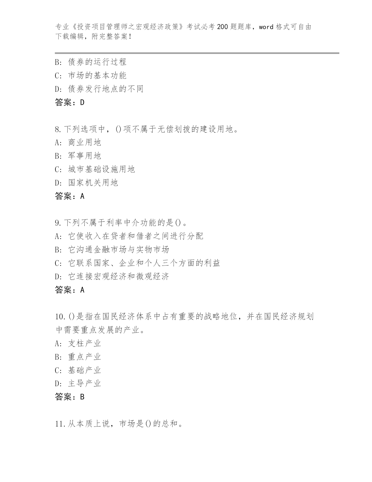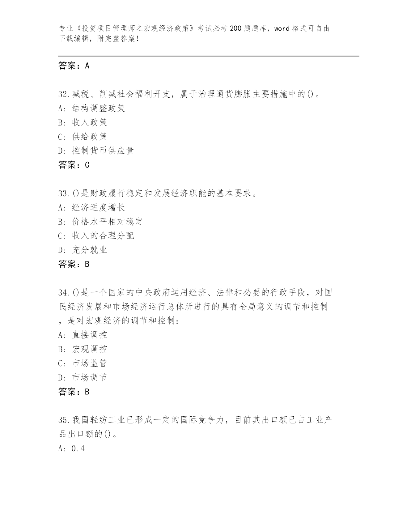 历年浙江省龙泉市《投资项目管理师之宏观经济政策》考试必考200题通关秘籍题库【】