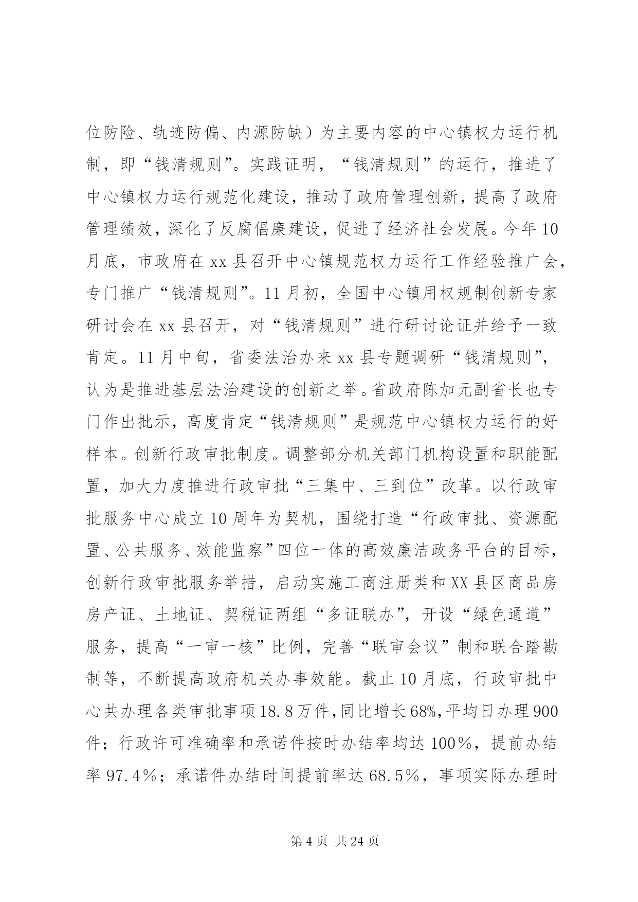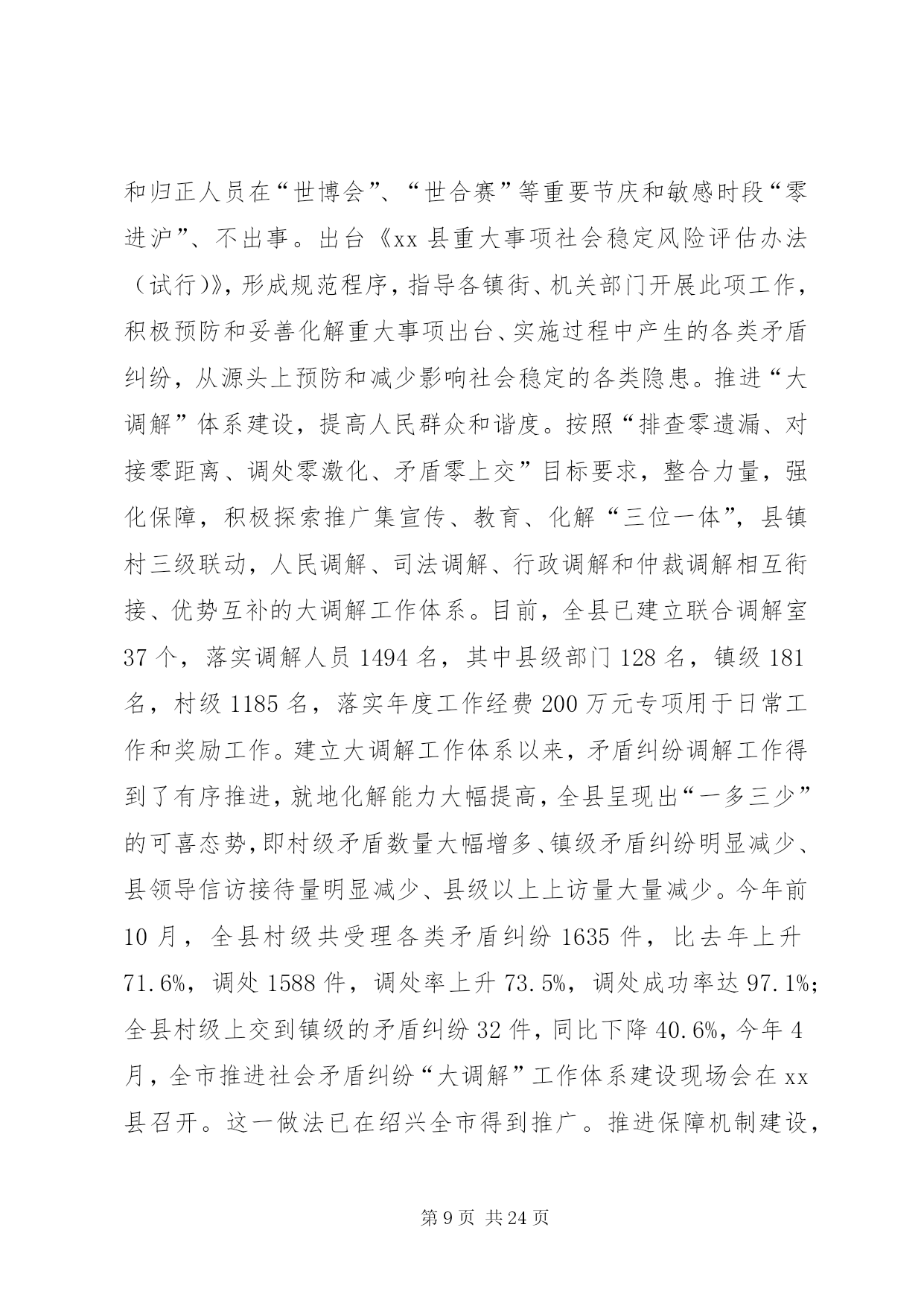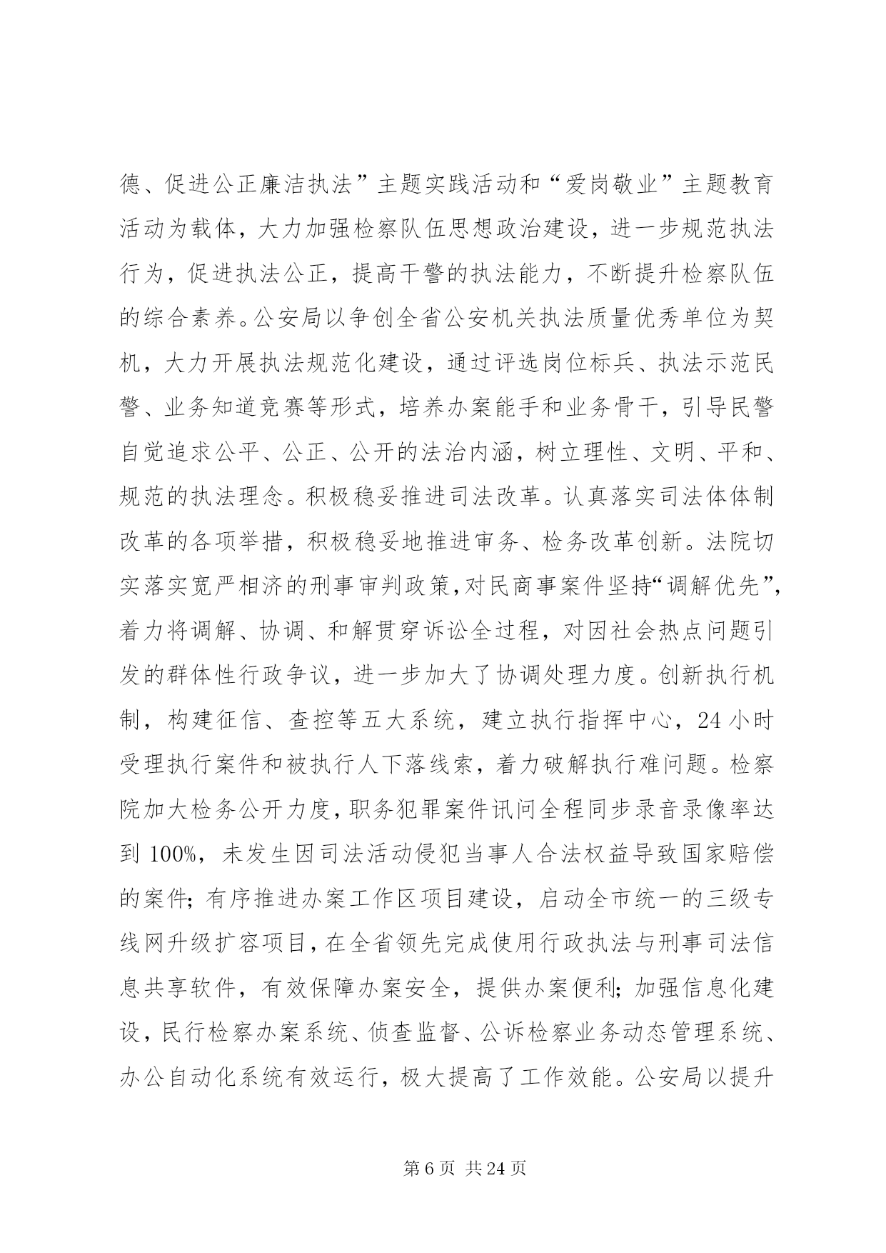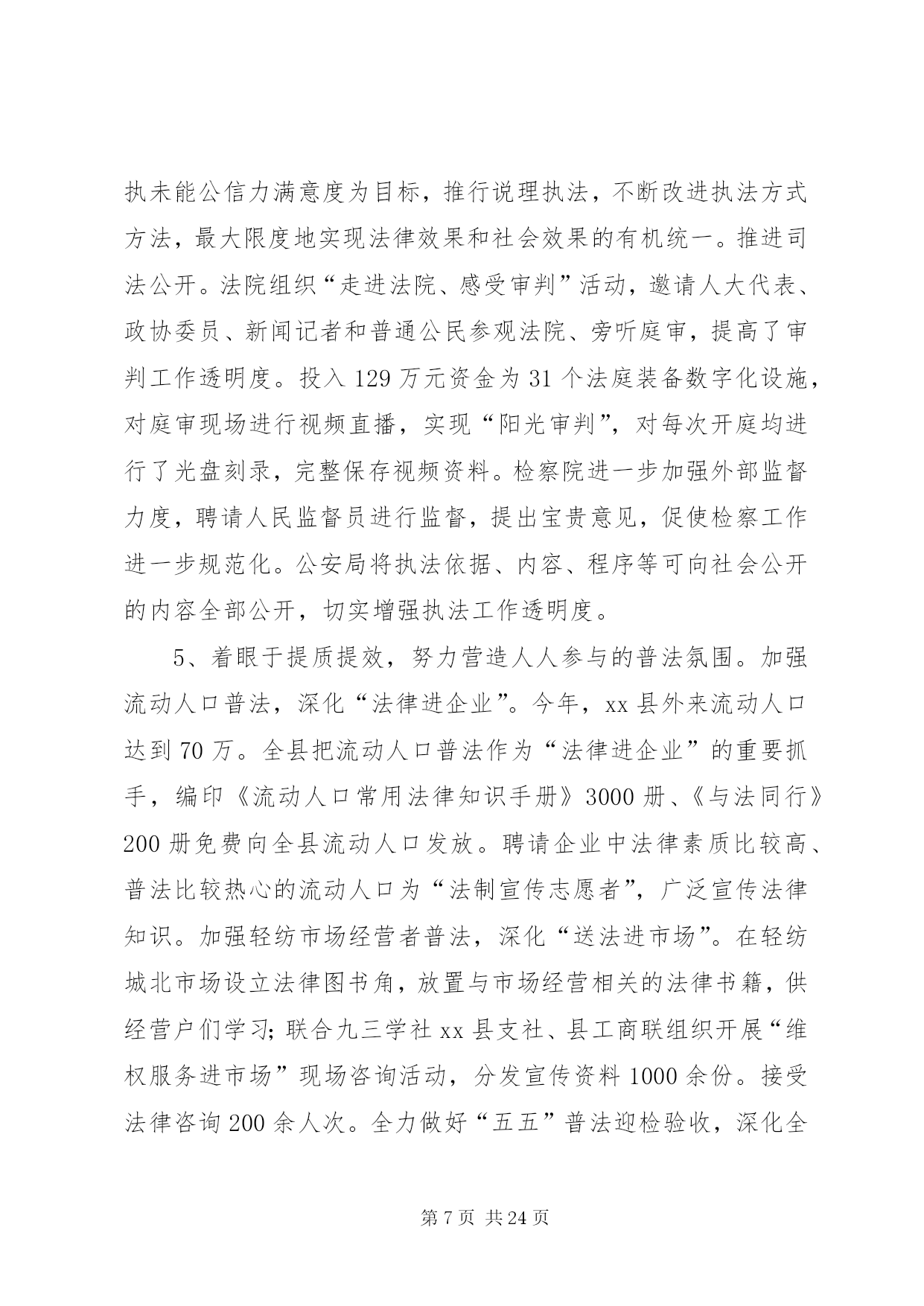 第PAGE\*Arabic\*MERGEFORMAT24页共NUMPAGES\*MERGEFORMAT24页县司法局年度法治建设工作总结一年来,xx县法治建设工作认真落实省、市建设“法治浙江”、“法治绍兴”的总体要求和有关会议精神,紧紧围绕“制度建设更加规范、人民群众更为满意”的法治县建设目标,以争创“法治县工作示范单位”为载体,把服务大局作为重要使命,把依法治县作为核心内容,把执法为民作为本质要求,把公平正义作为价值取向,进一步规范权力、加强监管,健全法制、扩大民主,全县政治、经济、文化和社会生活的法治化水平又有新的提高,人民群众更加深切地感受到推进法治建设带来的各项权益保障和种种民生实惠,“十一五”期间既定的各项法治建设任务基本完成,法治县建设正沿着“十一五”规划的宏伟蓝图向“十二五”目标大踏步迈进。令人鼓舞的是,2010年8月,在全省推进法治建设工作交流电视电话会议上,xx县连续第二轮被省委省政府评为创建“法治县工作先进单位”,市委常委、县委书记何加顺同志在会上作了典型发言,介绍了xx县的一些做法和经验,受到大会的充分肯定;11月,xx县作为全市唯一一个县级单位,被全国普法办评为首批“全国法治县(市、区)创建工作先进单位”。这些成绩的取得,又给全县进一步推进法治建设工作增添了无穷的动力和必胜的信心。这一年,xx县主要抓了以下七方面工作:1、着眼于共建共管,牢牢构建分工负责的工作格局。主要是突出了二方面:突出党委统一领导。充分发挥县委在法治建设中总揽全局、协调各方的领导核心作用。年初,县委在制定2010年度县对镇街、部门岗位目标责任制时,就把法治建设作为一项重要内容与平安建设一起列入,一同部署,一并考核。上半年,县委常委会召开常委扩大会议,听取县委推进法治建设工作领导小组汇报,研究部署全年法治建设工作的新要求、新任务。8月初召开的县委十二届九次全体(扩大)会议作出“突出转型升级、致力科学发展”的战略部署的同时,特别强调了要把加强民主法治建设作为新时期加快社会转型的重要内容,从机制和制度上为经济转型发展提供坚实的保障。8月17日,全省“法治浙江”工作交流电视电话会议后,县委迅速召开会议对会议精神进行学习、传达和贯彻,进一步明确了各级各单位下半年的工作任务和要求。11月初,县委推进法治建设工作领导小组专门组织成员单位深入机关、企业、社区、农村,对法治建设工作情况进行调研,并形成了一些高质量的调研报告,为县委谋划明年法治建设工作思路打下了很好的基础。突出各级分工负责。明确各级各部门的职责任务,制定《2010年推进法治建设工作要点》,将法治建设各项工作任务分解落实到相关部门,各相关部门按照分解的责任各司其职,各负其责,并且都落实了分管领导和联络员,具体抓这一项工作。县委推进法治建设领导小组不定期地对各成员单位的工作进展情况进行检查,对没有完成分解任务的督促他们严格按照各自的职责任务抓紧完成。经过几年的法治建设实践,全县已基本建立起统一领导、分工负责,相互配合、上下联动的法治建设工作格局。2、着眼于建制健制,不断完善依法执政的体制机制。县委进一步健全常委会议事规则、工作例会制度等议事决策机制,坚持民主集中制,认真落实常委分工负责制,健全干部人事酝酿、主要领导每周工作交流安排等制度。完善“一个党委(县委及其常委会)、三个党组(人大、政府、政协党组)、几大口子(经济建设、纪检监察、组织干部、意识形态、政法工作、统一战线、武装工作等)”的县委工作运行体制。县人大通过执法检查、重点工作督查、规范性文件报备等形式,依法开展工作监督,县政协围绕“团结、民主”两大主题,利用参政、议政、调研、视察、督查等途径,对执政情况进行民主监督,共同营造依法、科学、民主的执政环境。3、着眼于履职履权,加快建设依法行政的法治政府。探索建立中心镇权力运行机制——“钱清规则”。自2006年下半年开始,xx县先后启动了对钱清、杨汛、兰亭、孙端、夏履等7个中心镇的扩权强镇改革,分步扩大中心镇的行政权力,现在中心镇经授权直接行使的管理职权达到了74项。为规范中心镇权力运行,今年上半年,xx县在钱清镇探索建立了以“三定三防”(三定,即定权力内容、定权力规程、定权力责任;三防,即岗位防险、轨迹防偏、内源防缺)为主要内容的中心镇权力运行机制,即“钱清规则”。实践证明,“钱清规则”的运行,推进了中心镇权力运行规范化建设,推动了政府管理创新,提高了政府管理绩效,深化了反腐倡廉建设,促进了经济社会发展。今年10月底,市政府在xx县召开中心镇规范权力运行工作经验推广会,专门推广“钱清规则”。11月初,全国中心镇用权规制创新专家研讨会在xx县召开,对“钱清规则”进行研讨论证并给予一致肯定。11月中旬,省委法治办来xx县专题调研“钱清规则”,认为是推进基层法治建设