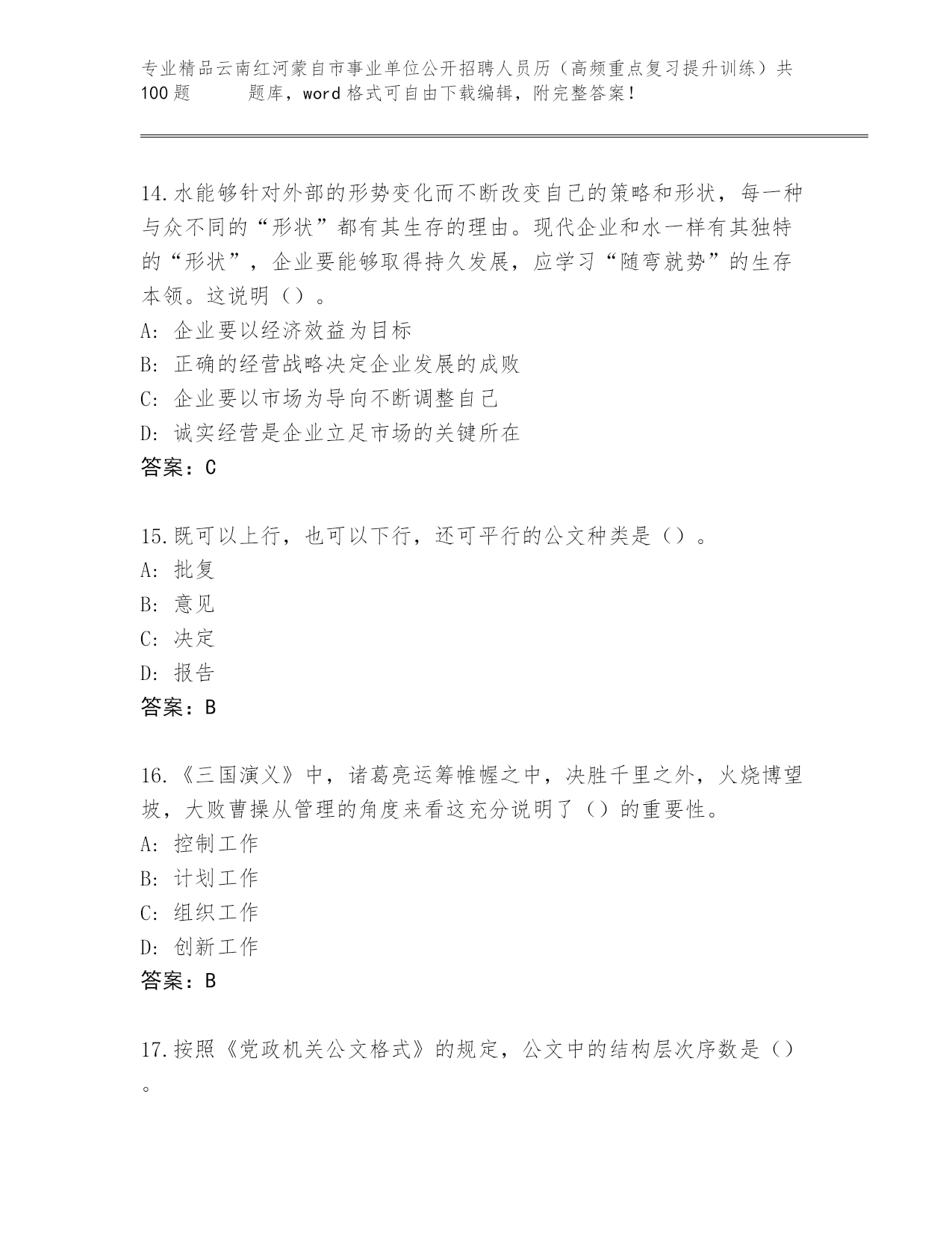 精心整理云南红河蒙自市事业单位公开招聘人员历(高频重点复习提升训练)共100题 内部题库附答案(培优B卷)