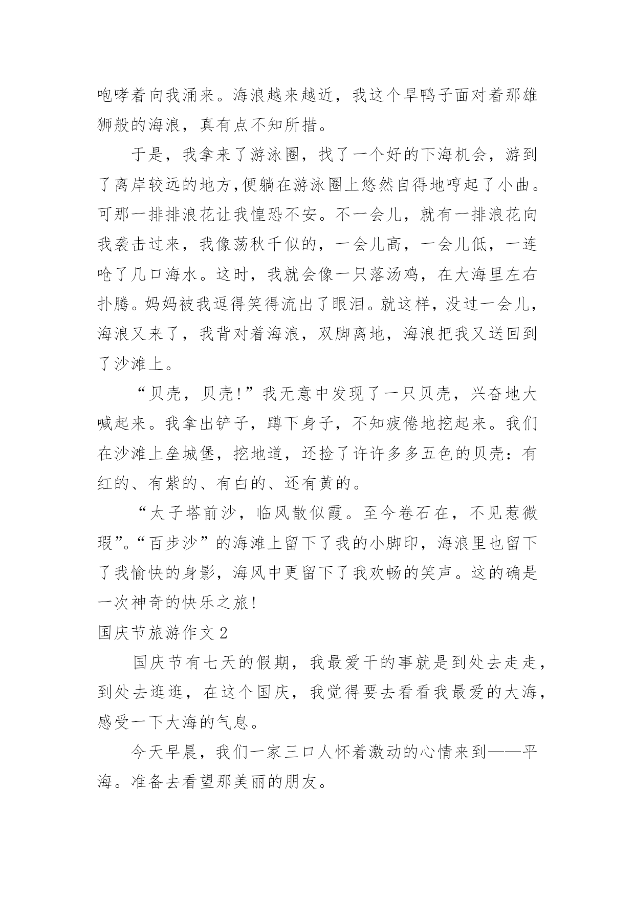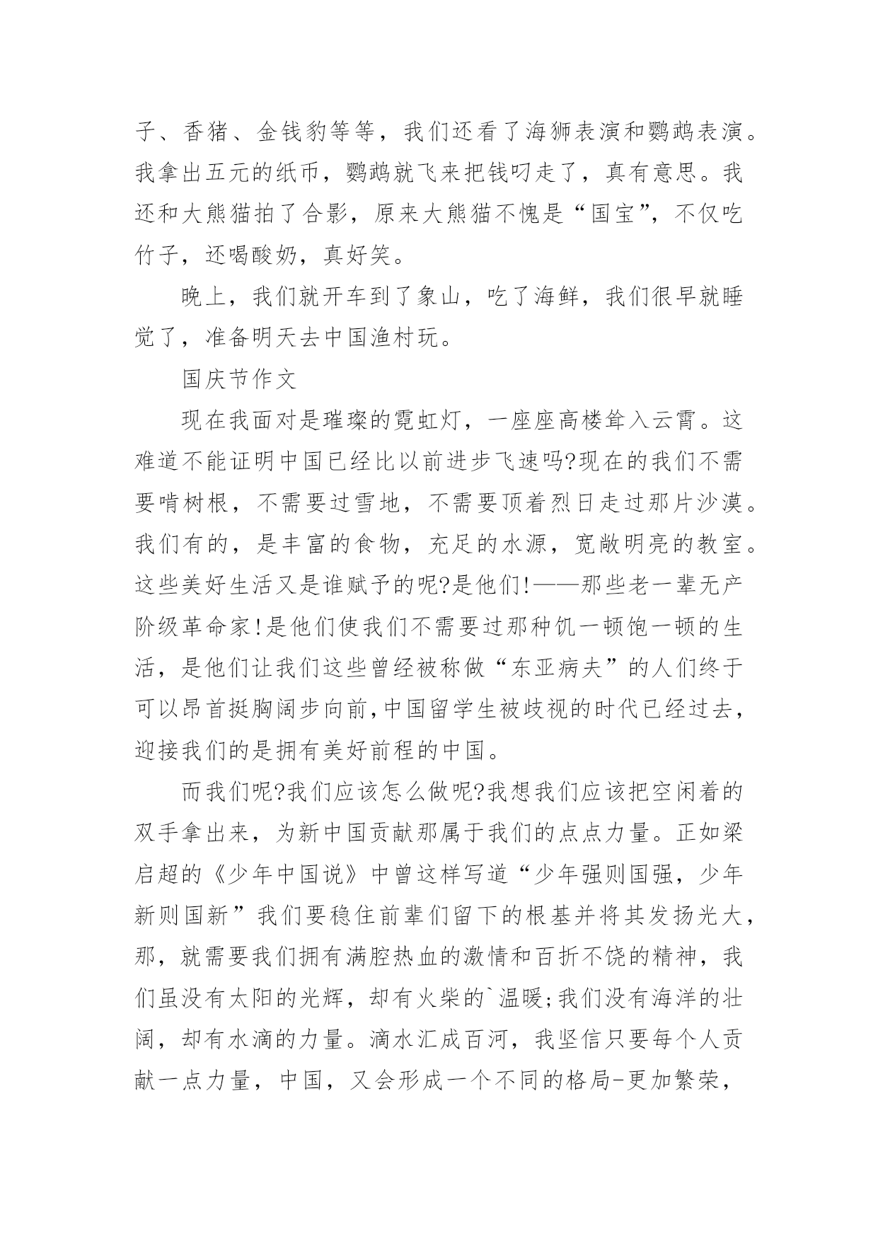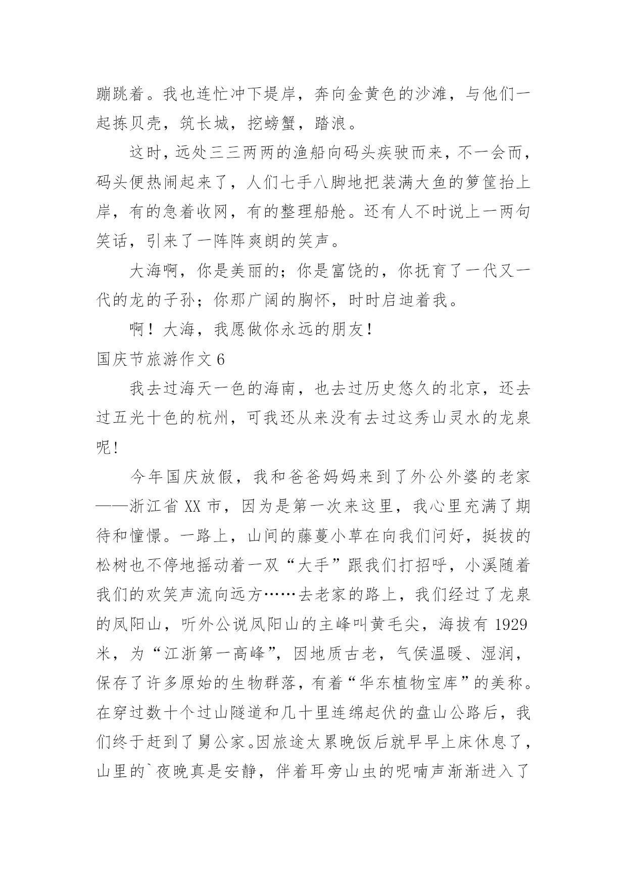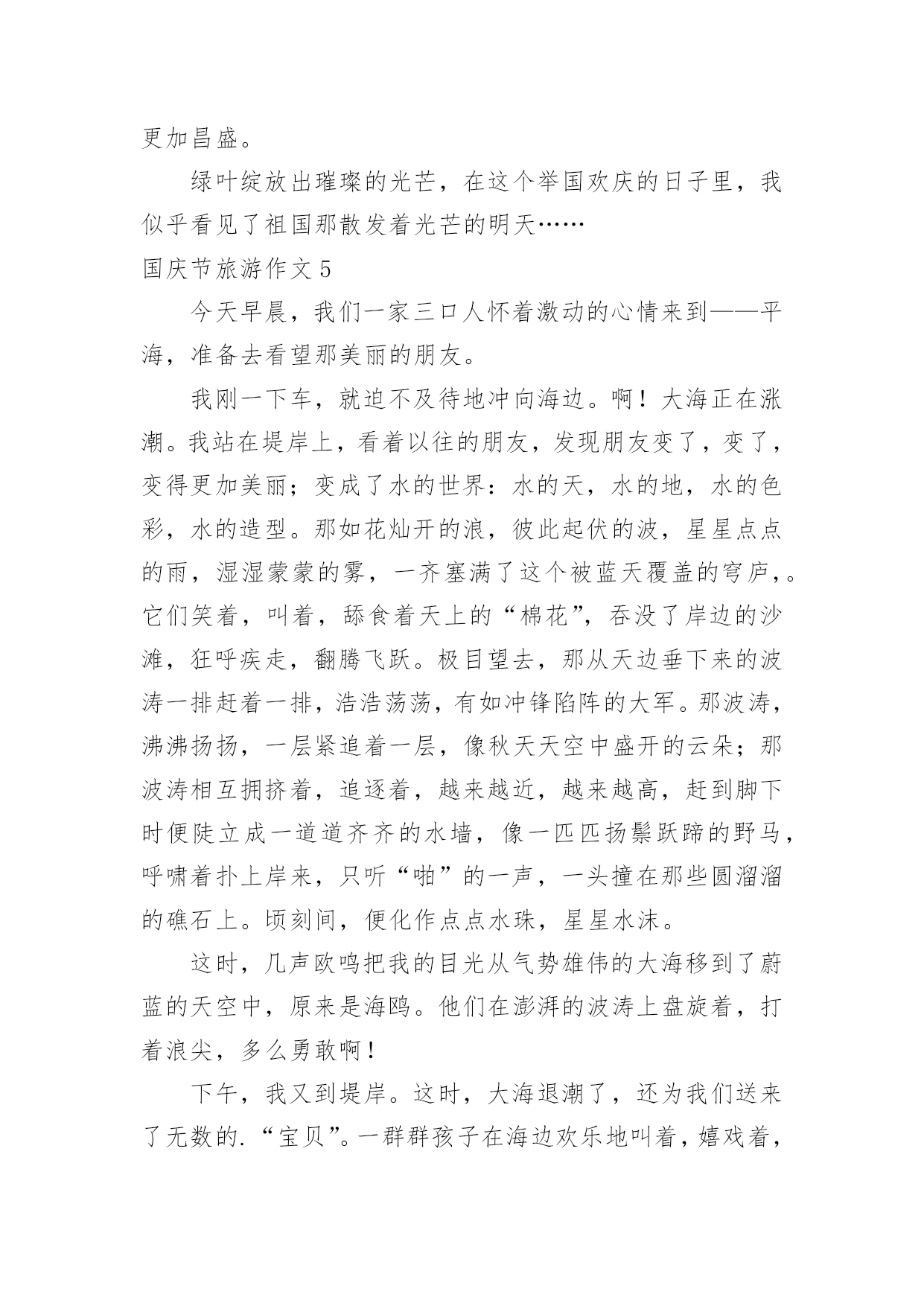 国庆节旅游作文国庆节旅游作文【精选】在学习、工作、生活中,大家都写过作文,肯定对各类作文都很熟悉吧,写作文可以锻炼我们的独处习惯,让自己的心静下来,思考自己未来的方向。你知道作文怎样才能写的好吗?下面是小编收集整理的国庆节旅游作文,欢迎大家分享。国庆节旅游作文1我曾流连于风光旖旎的西子湖畔,也仰望过天下称奇的鼎湖峰顶,而使我最难以忘怀的还是普陀的“百步沙”,它让我第一次真正感受到了大海的神奇和无穷的欢乐。一看到书桌上的五色贝壳,我就想起国庆节那激动人心的'一幕。“到了,到了!”一阵阵欢呼声惊醒了我。我朝舱外一看,原来已经到了普陀山。没等船停稳,我便迫不及待地跳下船,奔向码头。我们离开宾馆,就马上奔赴第一个目的地--“百步沙。”一到“百步沙”,我们就站在宽阔平缓的金色沙滩上久久张望。只见蓝天映着碧海,金沙衬着白浪。眼前是一望无际的蔚蓝如洗的大海,雪白的浪花翻滚着扑向沙滩。任凭海浪亲吻着我的小脚,感觉是如此惬意。我光着脚丫,踏上了细净而柔软的沙滩,扑向了大海的怀抱。这时,又一波海浪咆哮着向我涌来。海浪越来越近,我这个旱鸭子面对着那雄狮般的海浪,真有点不知所措。于是,我拿来了游泳圈,找了一个好的下海机会,游到了离岸较远的地方,便躺在游泳圈上悠然自得地哼起了小曲。可那一排排浪花让我惶恐不安。不一会儿,就有一排浪花向我袭击过来,我像荡秋千似的,一会儿高,一会儿低,一连呛了几口海水。这时,我就会像一只落汤鸡,在大海里左右扑腾。妈妈被我逗得笑得流出了眼泪。就这样,没过一会儿,海浪又来了,我背对着海浪,双脚离地,海浪把我又送回到了沙滩上。“贝壳,贝壳!”我无意中发现了一只贝壳,兴奋地大喊起来。我拿出铲子,蹲下身子,不知疲倦地挖起来。我们在沙滩上垒城堡,挖地道,还捡了许许多多五色的贝壳:有红的、有紫的、有白的、还有黄的。“太子塔前沙,临风散似霞。至今卷石在,不见惹微瑕”。“百步沙”的海滩上留下了我的小脚印,海浪里也留下了我愉快的身影,海风中更留下了我欢畅的笑声。这的确是一次神奇的快乐之旅!国庆节旅游作文2国庆节有七天的假期,我最爱干的事就是到处去走走,到处去逛逛,在这个国庆,我觉得要去看看我最爱的大海,感受一下大海的气息。今天早晨,我们一家三口人怀着激动的心情来到——平海。准备去看望那美丽的朋友。我刚一下车,就迫不及待地冲向海边。啊!大海正在涨潮。我站在堤岸上,看着以往的朋友,发现朋友变了,变了,变得更加美丽;变成了水的世界:水的天,水的地,水的色彩,水的造型。那如花灿开的浪,彼此起伏的波,星星点点的雨,湿湿蒙蒙的雾,一齐塞满了这个被蓝天覆盖的穹庐。它们笑着,叫着,舔食着天上的“棉花”,吞没了岸边的沙滩,狂呼疾走,翻腾飞跃。极目望去,那从天边垂下来的波涛一排赶着一排,浩浩荡荡,有如冲锋陷阵的大军。那波涛,沸沸扬扬,一层紧追着一层,像秋天天空中盛开的云朵;那波涛相互拥挤着,追逐着,越来越近,越来越高,赶到脚下时便陡立成一道道齐齐的水墙,像一匹匹扬鬃跃蹄的'野马,呼啸着扑上岸来,只听“啪”的一声,一头撞在那些圆溜溜的礁石上。顷刻间,便化作点点水珠,星星水沫。这时,几声欧鸣把我的目光从气势雄伟的大海移到了蔚蓝的天空中,原来是海鸥。他们在澎湃的波涛上盘旋着,打着浪尖,多么勇敢啊!下午,我又到堤岸。这时,大海退潮了,还为我们送来了无数的“宝贝”。一群群孩子在海边欢乐地叫着,嬉戏着,蹦跳着。我也连忙冲下堤岸,奔向金黄色的沙滩,与他们一起拣贝壳,筑长城,挖螃蟹,踏浪……这时,远处三三两两的渔船向码头疾驶而来,不一会而,码头便热闹起来了,人们七手八脚地把装满大鱼的箩筐抬上岸,有的急着收网,有的整理船舱……还有人不时说上一两句笑话,引来了一阵阵爽朗的笑声……大海啊,你是美丽的;你是富饶的,你抚育了一代又一代的龙的子孙;你那广阔的胸怀,时时启迪着我……啊!大海,我愿做你永远的朋友!国庆节旅游作文3今天,跟妈妈一起去游览水泊梁山,能近距离感受水浒一百零八位将士的忠肝义胆,让我兴奋不已!阅读《水浒传》时,我脑海经常浮现梁山好汉手握兵器的英勇形象,那他们生活的地方是什么样子呢?四面环水,层林叠翠,还是道路蜿蜒崎岖呢?带着激动又好奇的心情,我们出发了。驱车很快到达梁山脚下。那是一座不算高的山,山前有一方清澈湖泊,湖边的芦苇在随风摇摆,像是在欢迎我的到来。湖泊的前面立着几位好汉的石像,底座石碑上刻着“梁山泊”。眼前的景象比我想象中更加丰满,让我忍不住快速前行。上山的路是用石板石块砌成的,山上郁郁葱葱,真是个藏身的好地方。我兴致勃勃地走在最前面,一边观看路边的简介牌一边当解说员,给妈妈讲述梁山好汉的事迹:呼保义宋江、行者武松、小李广花荣……不知不觉我们到达了“断金亭”,这可是当年林冲一刀捅死王伦的地方。站在亭子下面,冷飕飕的轻风吹过耳边,我不禁打了一个寒颤,英勇煞爽的林冲