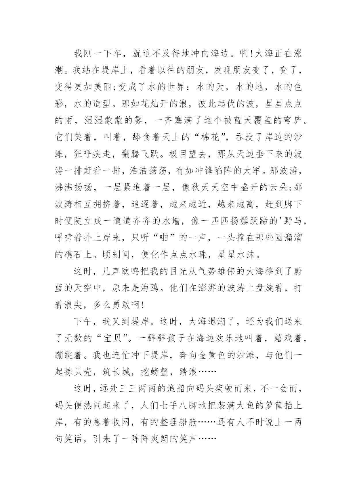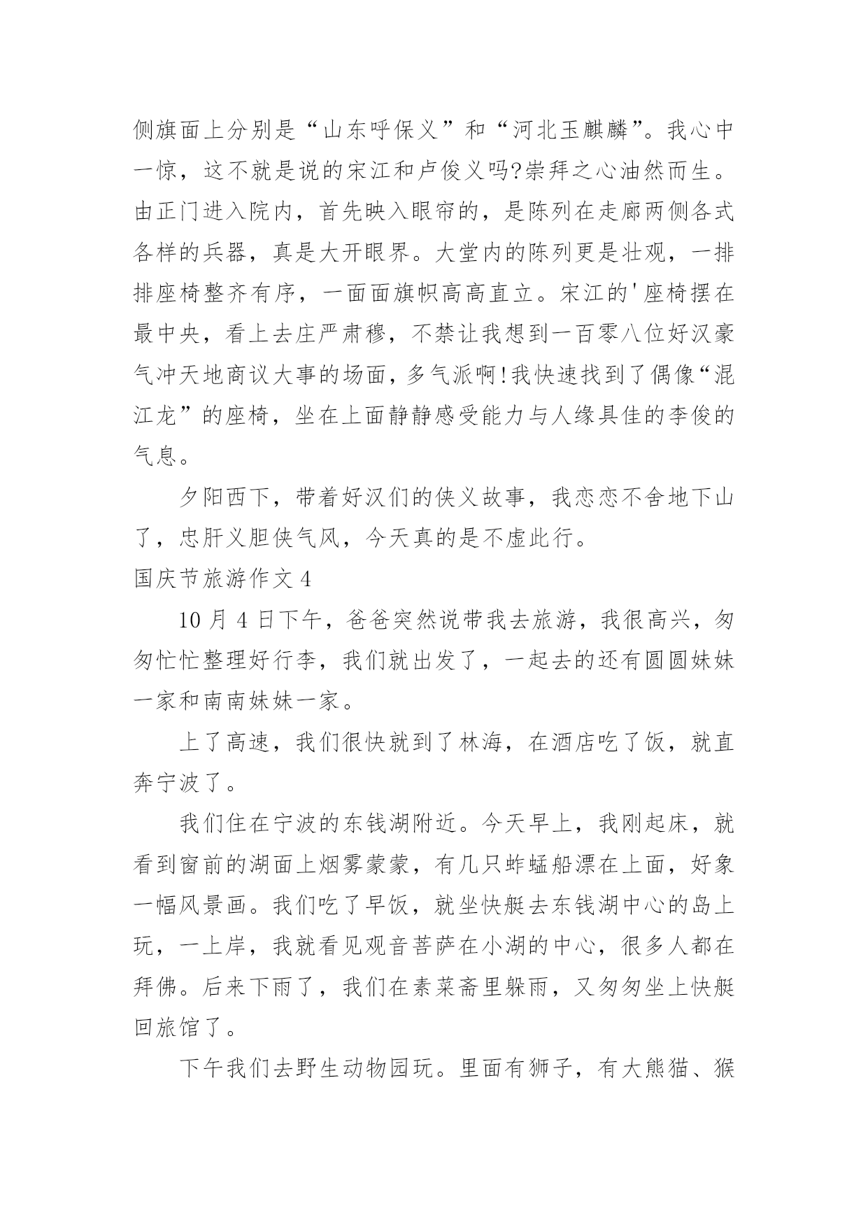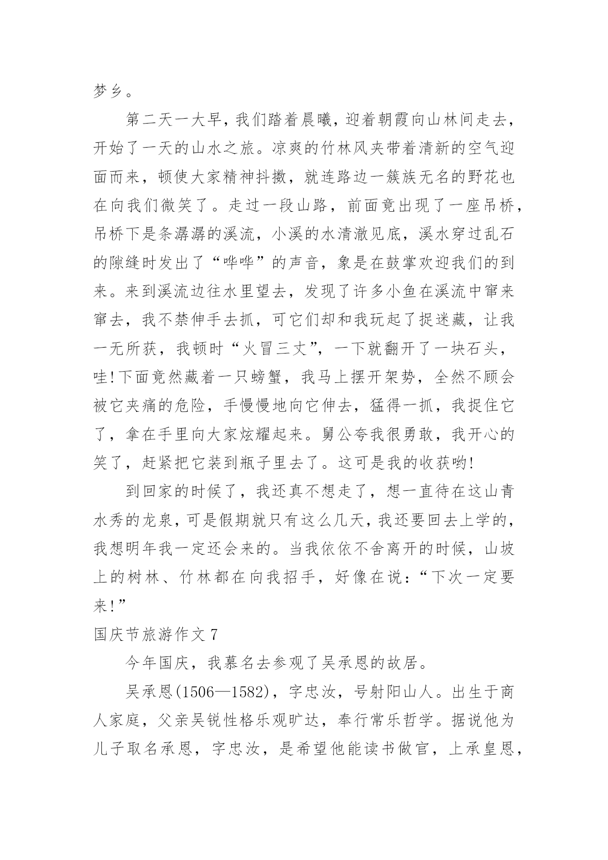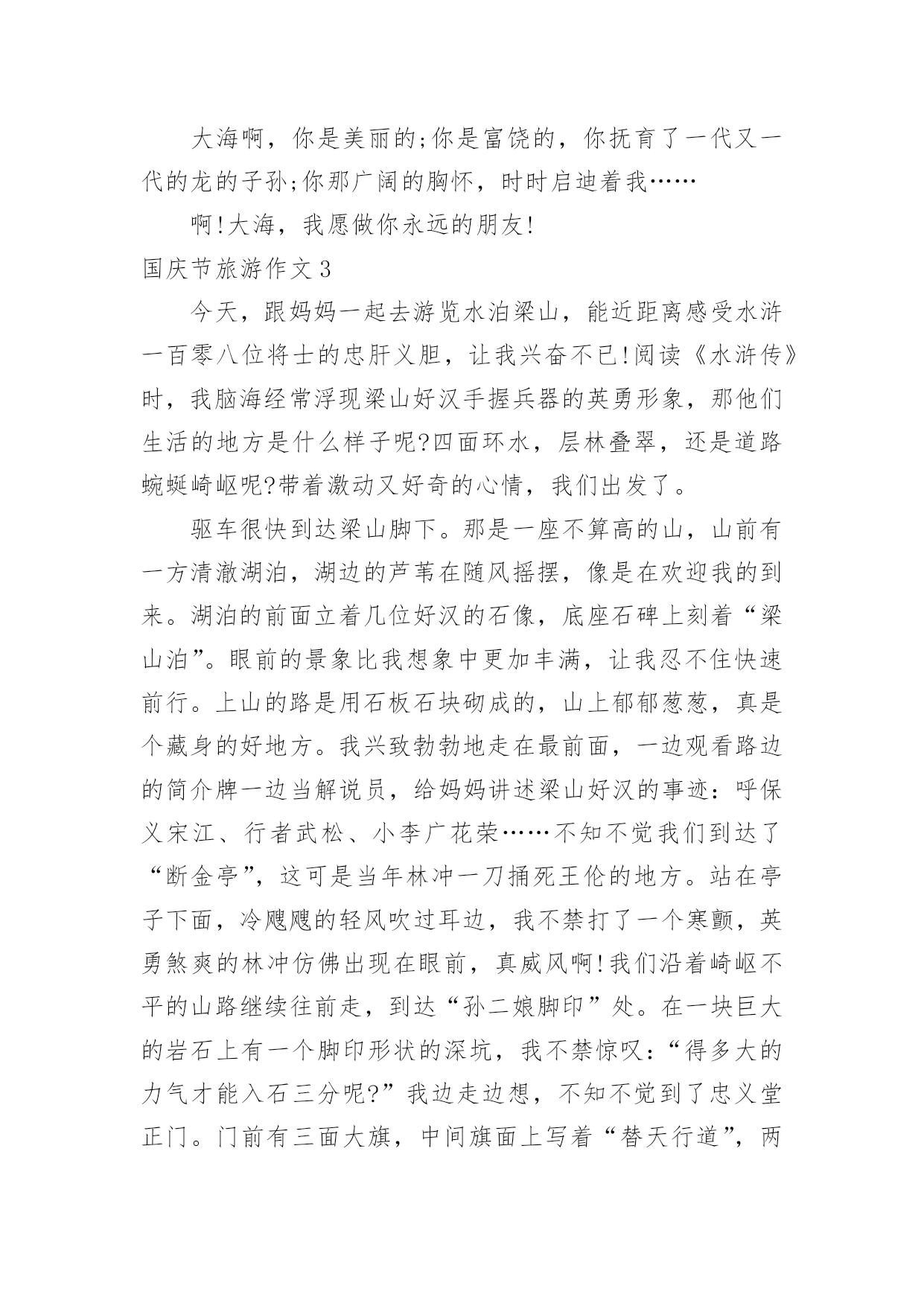 国庆节旅游作文国庆节旅游作文【精选】在学习、工作、生活中,大家都写过作文,肯定对各类作文都很熟悉吧,写作文可以锻炼我们的独处习惯,让自己的心静下来,思考自己未来的方向。你知道作文怎样才能写的好吗?下面是小编收集整理的国庆节旅游作文,欢迎大家分享。国庆节旅游作文1我曾流连于风光旖旎的西子湖畔,也仰望过天下称奇的鼎湖峰顶,而使我最难以忘怀的还是普陀的“百步沙”,它让我第一次真正感受到了大海的神奇和无穷的欢乐。一看到书桌上的五色贝壳,我就想起国庆节那激动人心的'一幕。“到了,到了!”一阵阵欢呼声惊醒了我。我朝舱外一看,原来已经到了普陀山。没等船停稳,我便迫不及待地跳下船,奔向码头。我们离开宾馆,就马上奔赴第一个目的地--“百步沙。”一到“百步沙”,我们就站在宽阔平缓的金色沙滩上久久张望。只见蓝天映着碧海,金沙衬着白浪。眼前是一望无际的蔚蓝如洗的大海,雪白的浪花翻滚着扑向沙滩。任凭海浪亲吻着我的小脚,感觉是如此惬意。我光着脚丫,踏上了细净而柔软的沙滩,扑向了大海的怀抱。这时,又一波海浪咆哮着向我涌来。海浪越来越近,我这个旱鸭子面对着那雄狮般的海浪,真有点不知所措。于是,我拿来了游泳圈,找了一个好的下海机会,游到了离岸较远的地方,便躺在游泳圈上悠然自得地哼起了小曲。可那一排排浪花让我惶恐不安。不一会儿,就有一排浪花向我袭击过来,我像荡秋千似的,一会儿高,一会儿低,一连呛了几口海水。这时,我就会像一只落汤鸡,在大海里左右扑腾。妈妈被我逗得笑得流出了眼泪。就这样,没过一会儿,海浪又来了,我背对着海浪,双脚离地,海浪把我又送回到了沙滩上。“贝壳,贝壳!”我无意中发现了一只贝壳,兴奋地大喊起来。我拿出铲子,蹲下身子,不知疲倦地挖起来。我们在沙滩上垒城堡,挖地道,还捡了许许多多五色的贝壳:有红的、有紫的、有白的、还有黄的。“太子塔前沙,临风散似霞。至今卷石在,不见惹微瑕”。“百步沙”的海滩上留下了我的小脚印,海浪里也留下了我愉快的身影,海风中更留下了我欢畅的笑声。这的确是一次神奇的快乐之旅!国庆节旅游作文2国庆节有七天的假期,我最爱干的事就是到处去走走,到处去逛逛,在这个国庆,我觉得要去看看我最爱的大海,感受一下大海的气息。今天早晨,我们一家三口人怀着激动的心情来到——平海。准备去看望那美丽的朋友。我刚一下车,就迫不及待地冲向海边。啊!大海正在涨潮。我站在堤岸上,看着以往的朋友,发现朋友变了,变了,变得更加美丽;变成了水的世界:水的天,水的地,水的色彩,水的造型。那如花灿开的浪,彼此起伏的波,星星点点的雨,湿湿蒙蒙的雾,一齐塞满了这个被蓝天覆盖的穹庐。它们笑着,叫着,舔食着天上的“棉花”,吞没了岸边的沙滩,狂呼疾走,翻腾飞跃。极目望去,那从天边垂下来的波涛一排赶着一排,浩浩荡荡,有如冲锋陷阵的大军。那波涛,沸沸扬扬,一层紧追着一层,像秋天天空中盛开的云朵;那波涛相互拥挤着,追逐着,越来越近,越来越高,赶到脚下时便陡立成一道道齐齐的水墙,像一匹匹扬鬃跃蹄的'野马,呼啸着扑上岸来,只听“啪”的一声,一头撞在那些圆溜溜的礁石上。顷刻间,便化作点点水珠,星星水沫。这时,几声欧鸣把我的目光从气势雄伟的大海移到了蔚蓝的天空中,原来是海鸥。他们在澎湃的波涛上盘旋着,打着浪尖,多么勇敢啊!下午,我又到堤岸。这时,大海退潮了,还为我们送来了无数的“宝贝”。一群群孩子在海边欢乐地叫着,嬉戏着,蹦跳着。我也连忙冲下堤岸,奔向金黄色的沙滩,与他们一起拣贝壳,筑长城,挖螃蟹,踏浪……这时,远处三三两两的渔船向码头疾驶而来,不一会而,码头便热闹起来了,人们七手八脚地把装满大鱼的箩筐抬上岸,有的急着收网,有的整理船舱……还有人不时说上一两句笑话,引来了一阵阵爽朗的笑声……大海啊,你是美丽的;你是富饶的,你抚育了一代又一代的龙的子孙;你那广阔的胸怀,时时启迪着我……啊!大海,我愿做你永远的朋友!国庆节旅游作文3今天,跟妈妈一起去游览水泊梁山,能近距离感受水浒一百零八位将士的忠肝义胆,让我兴奋不已!阅读《水浒传》时,我脑海经常浮现梁山好汉手握兵器的英勇形象,那他们生活的地方是什么样子呢?四面环水,层林叠翠,还是道路蜿蜒崎岖呢?带着激动又好奇的心情,我们出发了。驱车很快到达梁山脚下。那是一座不算高的山,山前有一方清澈湖泊,湖边的芦苇在随风摇摆,像是在欢迎我的到来。湖泊的前面立着几位好汉的石像,底座石碑上刻着“梁山泊”。眼前的景象比我想象中更加丰满,让我忍不住快速前行。上山的路是用石板石块砌成的,山上郁郁葱葱,真是个藏身的好地方。我兴致勃勃地走在最前面,一边观看路边的简介牌一边当解说员,给妈妈讲述梁山好汉的事迹:呼保义宋江、行者武松、小李广花荣……不知不觉我们到达了“断金亭”,这可是当年林冲一刀捅死王伦的地方。站在亭子下面,冷飕飕的轻风吹过耳边,我不禁打了一个寒颤,英勇煞爽的林冲