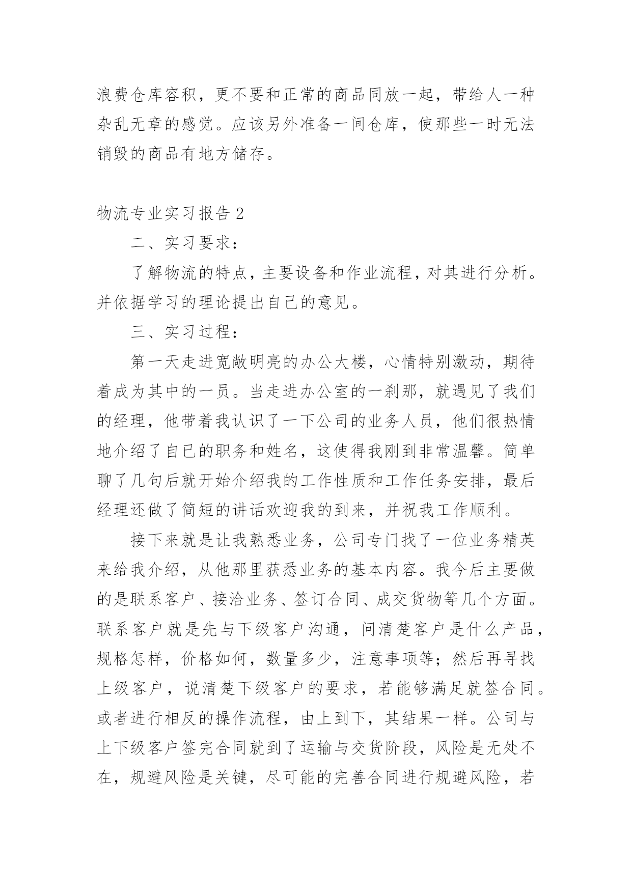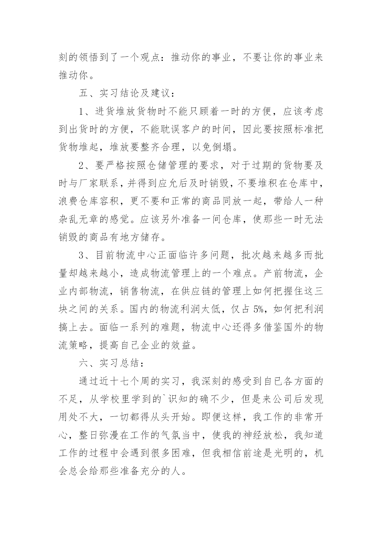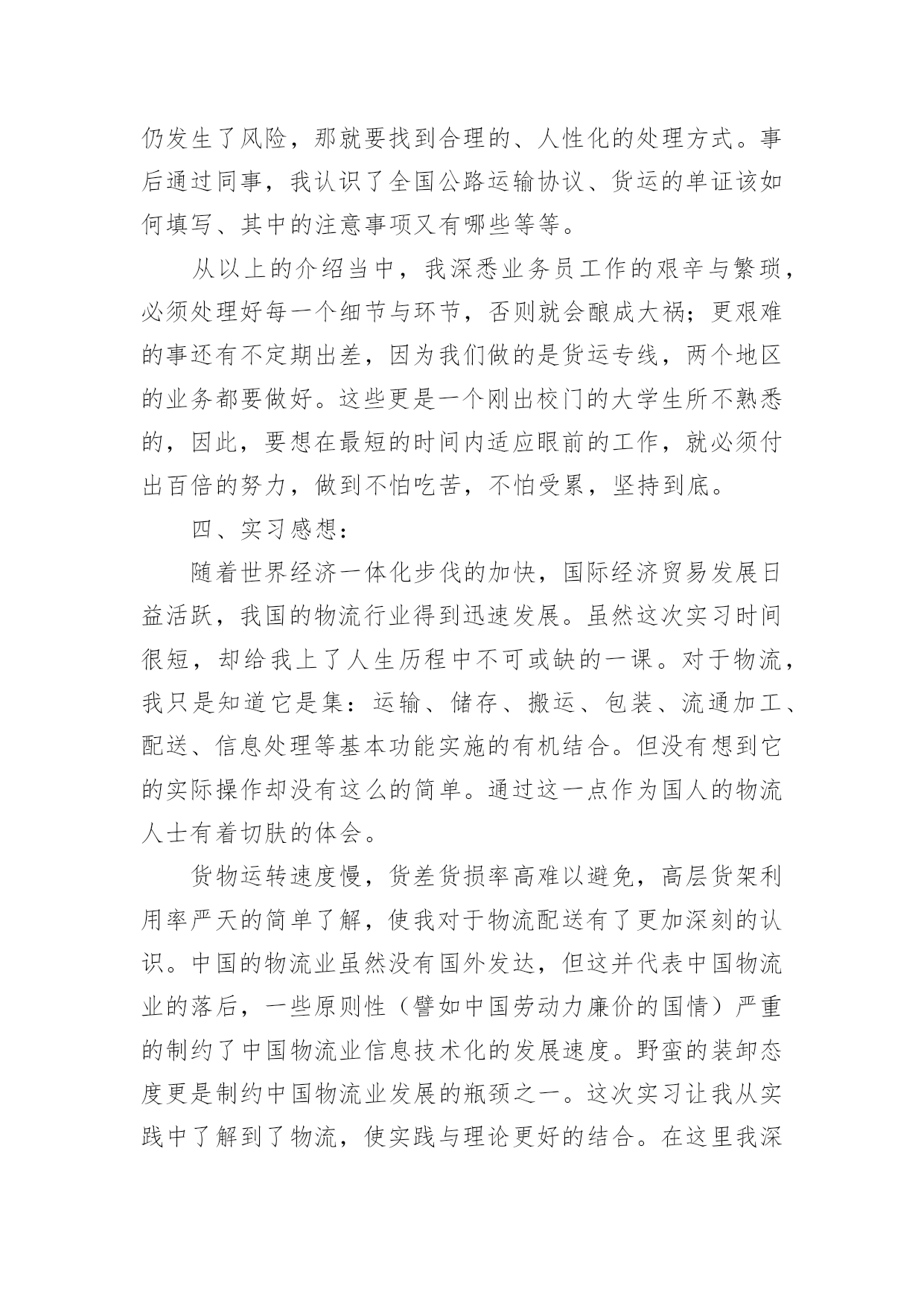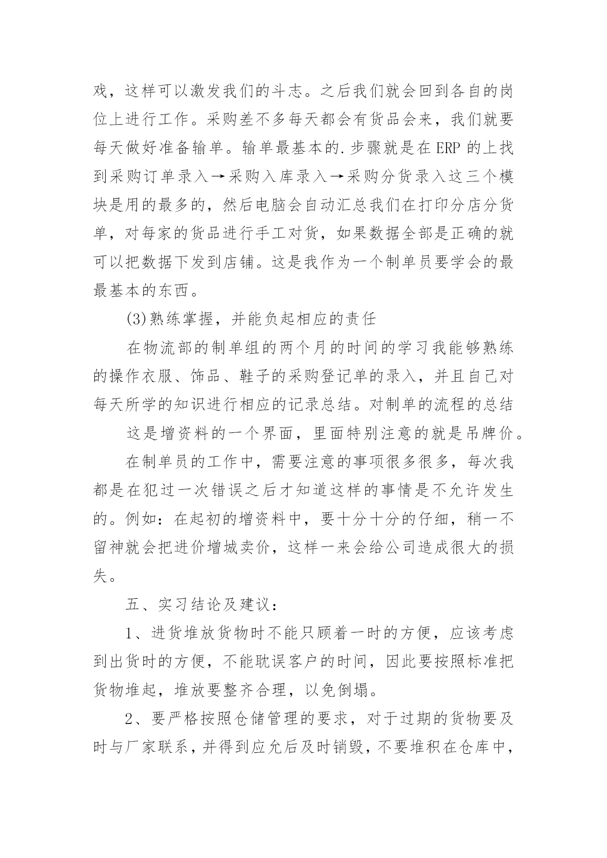 物流专业实习报告我们眼下的社会,越来越多的事务都会使用到报告,报告中涉及到专业性术语要解释清楚。为了让您不再为写报告头疼,下面是小编为大家整理的物流专业实习报告,欢迎大家分享。物流专业实习报告1一、实习的目的:经过两年系统的物流理论知识的学习,对物流定义、基本功能、各个作业流程有了一定的理论知识的了解,通过实习希望能够使理论和实践进行相结合,在实践中提高运用知识的能力。二、公司的概况xx百货是一家初具规模的百货连锁企业,主要经营服装、饰品、鞋子等生活用品。主要针对15到35岁的中低消费客户群体。本着让人漂亮起来的经营理念,经营宗旨是尽我们的努力帮助顾客获得最有价值的商品和享受快乐的服务。在将近十余年的时间里连锁店已经覆盖xx省全部城市。三、实习环境实习期间,我是在xx百货的物流部的制单组担任制单员一职,主要从事的工作就是负责把采购部门采购过来的货品归类之后以最快的速度发往店铺。在物流部分为三个组:制单组、仓库组、理货组,总共有40余人。四、实习过程(1)了解过程起初,刚刚来到这里的时候,这里的一切对我来说都是陌生的。这里的工作环境也不是非常的好,呈现在我眼前的一切都是那么的茫然。第一天的时间里制单组长给我安排了办公位置和一些日常工作中需要的用品等等。把一些工作中的注意事项和最基本的流程用A4纸打印出来,先自己熟悉一下。然后把公司的软件ERP每个模块让我熟悉一下。实习的第一天,我熟悉了我的岗位的大概,体验到社会上工作的感觉,在工作地同时慢慢的熟悉整个部门熟悉整个公司的文化。作为初次到社会上去工作的学生来说,对于社会的了解以及工作单位各方面的情况的了解都是极其陌生的。一开始我对公司的各种规章制度和制单员的基本流程都不了解,于是我就慢慢的翻阅公司的考勤制度等等,想制单组的同事们请教了解工作中的相关事项,通过他们的帮助,我对自己的工作很快就能顺利的操作了。不过就是在操作的过程中会时不时的出现错误,给同事们造成不必要的麻烦,心里很是过意不去,但我相信我一定可以突破自己,能够在工作中取得优异的成绩的。(2)摸索过程对物流部环境有所了解和熟悉后,开始有些紧张的心开始平静下来,工作期间,每天按时上班,上班工作之前公司的所有成员要集合到一块开会,讲讲小故事大道理,玩玩游戏,这样可以激发我们的斗志。之后我们就会回到各自的岗位上进行工作。采购差不多每天都会有货品会来,我们就要每天做好准备输单。输单最基本的.步骤就是在ERP的上找到采购订单录入→采购入库录入→采购分货录入这三个模块是用的最多的,然后电脑会自动汇总我们在打印分店分货单,对每家的货品进行手工对货,如果数据全部是正确的就可以把数据下发到店铺。这是我作为一个制单员要学会的最最基本的东西。(3)熟练掌握,并能负起相应的责任在物流部的制单组的两个月的时间的学习我能够熟练的操作衣服、饰品、鞋子的采购登记单的录入,并且自己对每天所学的知识进行相应的记录总结。对制单的流程的总结这是增资料的一个界面,里面特别注意的就是吊牌价。在制单员的工作中,需要注意的事项很多很多,每次我都是在犯过一次错误之后才知道这样的事情是不允许发生的。例如:在起初的增资料中,要十分十分的仔细,稍一不留神就会把进价增城卖价,这样一来会给公司造成很大的损失。五、实习结论及建议:1、进货堆放货物时不能只顾着一时的方便,应该考虑到出货时的方便,不能耽误客户的时间,因此要按照标准把货物堆起,堆放要整齐合理,以免倒塌。2、要严格按照仓储管理的要求,对于过期的货物要及时与厂家联系,并得到应允后及时销毁,不要堆积在仓库中,浪费仓库容积,更不要和正常的商品同放一起,带给人一种杂乱无章的感觉。应该另外准备一间仓库,使那些一时无法销毁的商品有地方储存。物流专业实习报告2二、实习要求:了解物流的特点,主要设备和作业流程,对其进行分析。并依据学习的理论提出自己的意见。三、实习过程:第一天走进宽敞明亮的办公大楼,心情特别激动,期待着成为其中的一员。当走进办公室的一刹那,就遇见了我们的经理,他带着我认识了一下公司的业务人员,他们很热情地介绍了自已的职务和姓名,这使得我刚到非常温馨。简单聊了几句后就开始介绍我的工作性质和工作任务安排,最后经理还做了简短的讲话欢迎我的到来,并祝我工作顺利。接下来就是让我熟悉业务,公司专门找了一位业务精英来给我介绍,从他那里获悉业务的基本内容。我今后主要做的是联系客户、接洽业务、签订合同、成交货物等几个方面。联系客户就是先与下级客户沟通,问清楚客户是什么产品,规格怎样,价格如何,数量多少,注意事项等;然后再寻找上级客户,说清楚下级客户的要求,若能够满足就签合同。或者进行相反的操作流程,由上到下,其结果一样。公司与上下级客户签完合同就到了运输与交货阶段,风险是无处不在,规避风险是关键,尽可能的完善合同进行规避风险,若仍发生了风险