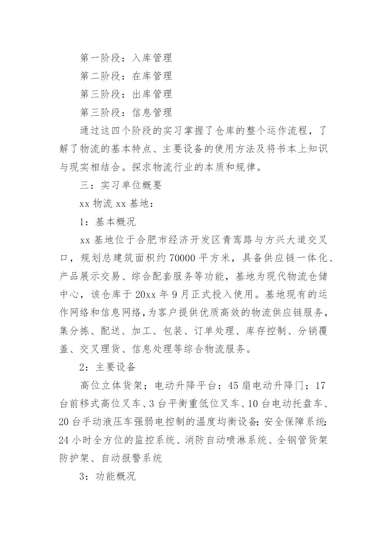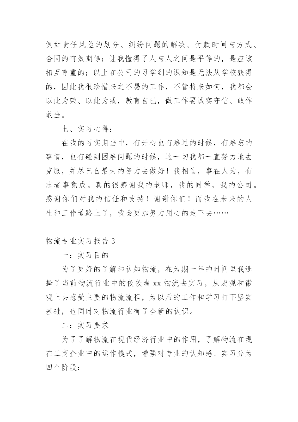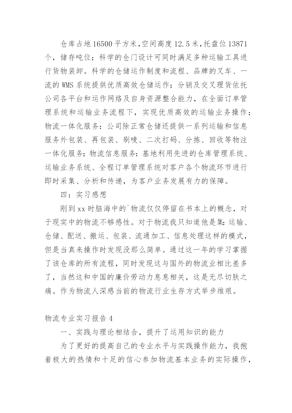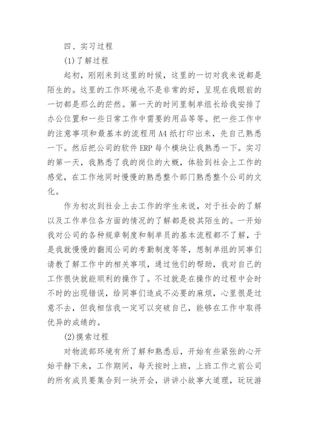 物流专业实习报告我们眼下的社会,越来越多的事务都会使用到报告,报告中涉及到专业性术语要解释清楚。为了让您不再为写报告头疼,下面是小编为大家整理的物流专业实习报告,欢迎大家分享。物流专业实习报告1一、实习的目的:经过两年系统的物流理论知识的学习,对物流定义、基本功能、各个作业流程有了一定的理论知识的了解,通过实习希望能够使理论和实践进行相结合,在实践中提高运用知识的能力。二、公司的概况xx百货是一家初具规模的百货连锁企业,主要经营服装、饰品、鞋子等生活用品。主要针对15到35岁的中低消费客户群体。本着让人漂亮起来的经营理念,经营宗旨是尽我们的努力帮助顾客获得最有价值的商品和享受快乐的服务。在将近十余年的时间里连锁店已经覆盖xx省全部城市。三、实习环境实习期间,我是在xx百货的物流部的制单组担任制单员一职,主要从事的工作就是负责把采购部门采购过来的货品归类之后以最快的速度发往店铺。在物流部分为三个组:制单组、仓库组、理货组,总共有40余人。四、实习过程(1)了解过程起初,刚刚来到这里的时候,这里的一切对我来说都是陌生的。这里的工作环境也不是非常的好,呈现在我眼前的一切都是那么的茫然。第一天的时间里制单组长给我安排了办公位置和一些日常工作中需要的用品等等。把一些工作中的注意事项和最基本的流程用A4纸打印出来,先自己熟悉一下。然后把公司的软件ERP每个模块让我熟悉一下。实习的第一天,我熟悉了我的岗位的大概,体验到社会上工作的感觉,在工作地同时慢慢的熟悉整个部门熟悉整个公司的文化。作为初次到社会上去工作的学生来说,对于社会的了解以及工作单位各方面的情况的了解都是极其陌生的。一开始我对公司的各种规章制度和制单员的基本流程都不了解,于是我就慢慢的翻阅公司的考勤制度等等,想制单组的同事们请教了解工作中的相关事项,通过他们的帮助,我对自己的工作很快就能顺利的操作了。不过就是在操作的过程中会时不时的出现错误,给同事们造成不必要的麻烦,心里很是过意不去,但我相信我一定可以突破自己,能够在工作中取得优异的成绩的。(2)摸索过程对物流部环境有所了解和熟悉后,开始有些紧张的心开始平静下来,工作期间,每天按时上班,上班工作之前公司的所有成员要集合到一块开会,讲讲小故事大道理,玩玩游戏,这样可以激发我们的斗志。之后我们就会回到各自的岗位上进行工作。采购差不多每天都会有货品会来,我们就要每天做好准备输单。输单最基本的.步骤就是在ERP的上找到采购订单录入→采购入库录入→采购分货录入这三个模块是用的最多的,然后电脑会自动汇总我们在打印分店分货单,对每家的货品进行手工对货,如果数据全部是正确的就可以把数据下发到店铺。这是我作为一个制单员要学会的最最基本的东西。(3)熟练掌握,并能负起相应的责任在物流部的制单组的两个月的时间的学习我能够熟练的操作衣服、饰品、鞋子的采购登记单的录入,并且自己对每天所学的知识进行相应的记录总结。对制单的流程的总结这是增资料的一个界面,里面特别注意的就是吊牌价。在制单员的工作中,需要注意的事项很多很多,每次我都是在犯过一次错误之后才知道这样的事情是不允许发生的。例如:在起初的增资料中,要十分十分的仔细,稍一不留神就会把进价增城卖价,这样一来会给公司造成很大的损失。五、实习结论及建议:1、进货堆放货物时不能只顾着一时的方便,应该考虑到出货时的方便,不能耽误客户的时间,因此要按照标准把货物堆起,堆放要整齐合理,以免倒塌。2、要严格按照仓储管理的要求,对于过期的货物要及时与厂家联系,并得到应允后及时销毁,不要堆积在仓库中,浪费仓库容积,更不要和正常的商品同放一起,带给人一种杂乱无章的感觉。应该另外准备一间仓库,使那些一时无法销毁的商品有地方储存。物流专业实习报告2二、实习要求:了解物流的特点,主要设备和作业流程,对其进行分析。并依据学习的理论提出自己的意见。三、实习过程:第一天走进宽敞明亮的办公大楼,心情特别激动,期待着成为其中的一员。当走进办公室的一刹那,就遇见了我们的经理,他带着我认识了一下公司的业务人员,他们很热情地介绍了自已的职务和姓名,这使得我刚到非常温馨。简单聊了几句后就开始介绍我的工作性质和工作任务安排,最后经理还做了简短的讲话欢迎我的到来,并祝我工作顺利。接下来就是让我熟悉业务,公司专门找了一位业务精英来给我介绍,从他那里获悉业务的基本内容。我今后主要做的是联系客户、接洽业务、签订合同、成交货物等几个方面。联系客户就是先与下级客户沟通,问清楚客户是什么产品,规格怎样,价格如何,数量多少,注意事项等;然后再寻找上级客户,说清楚下级客户的要求,若能够满足就签合同。或者进行相反的操作流程,由上到下,其结果一样。公司与上下级客户签完合同就到了运输与交货阶段,风险是无处不在,规避风险是关键,尽可能的完善合同进行规避风险,若仍发生了风险