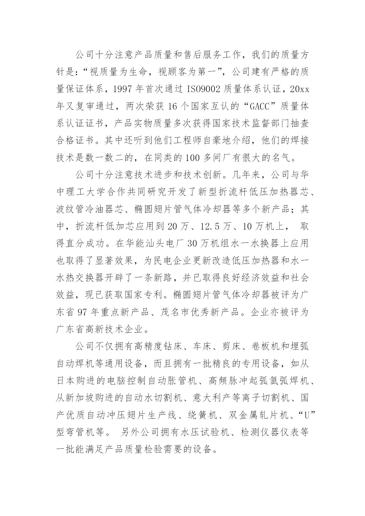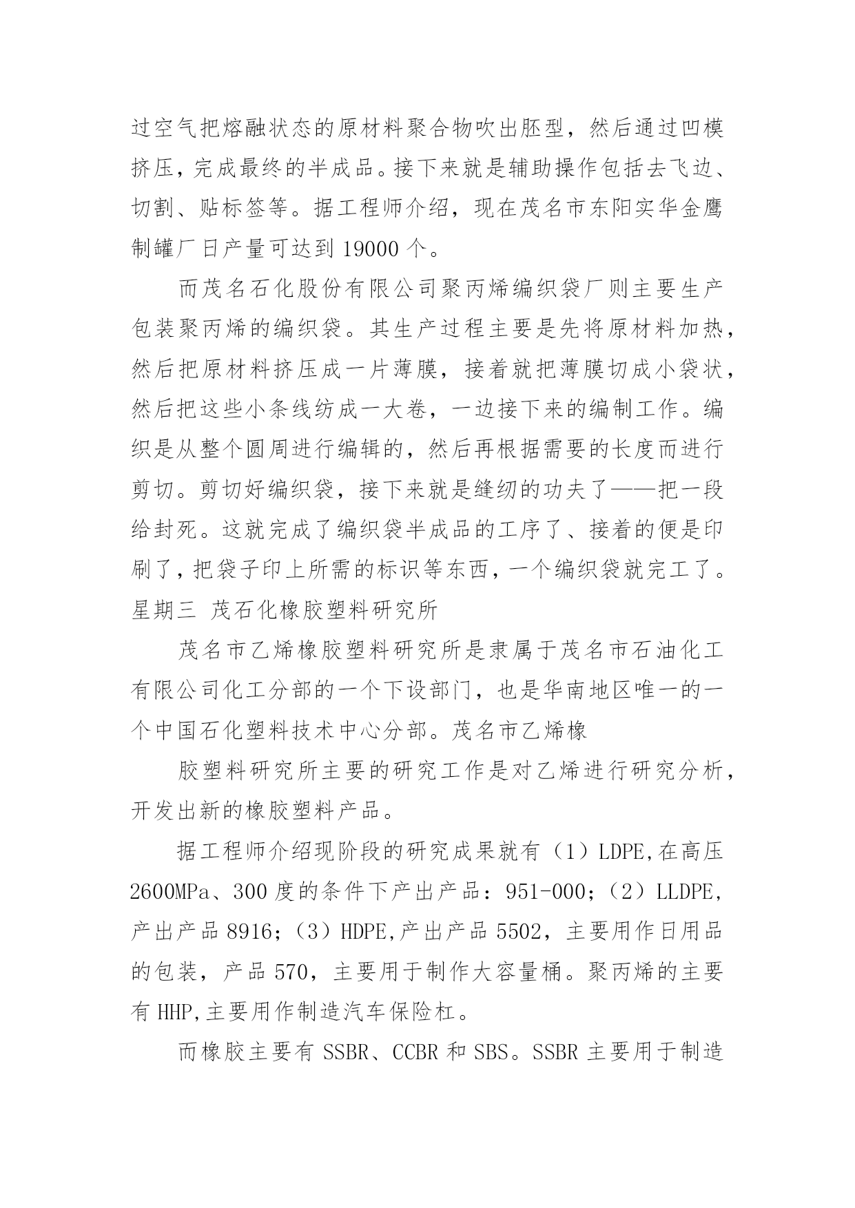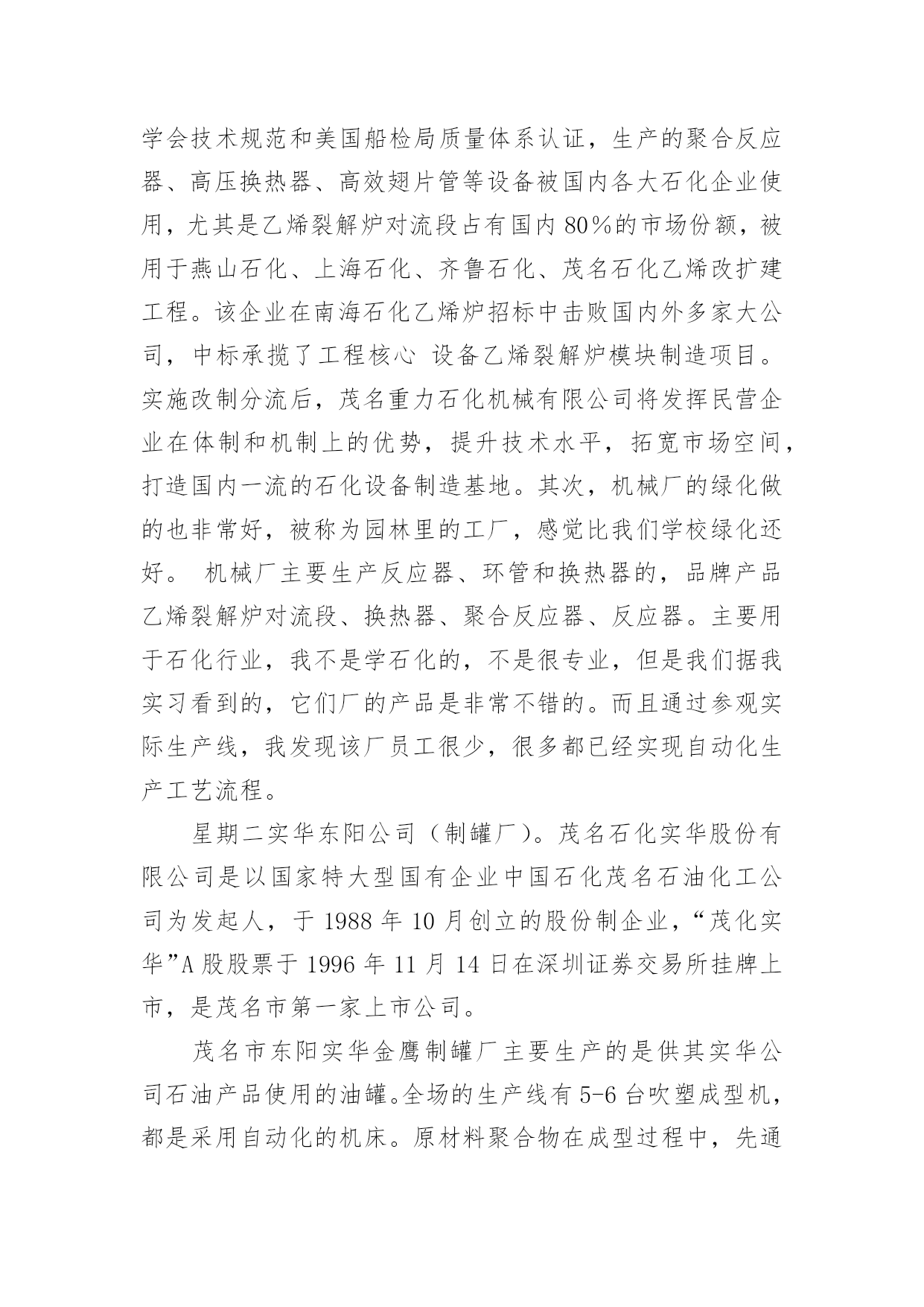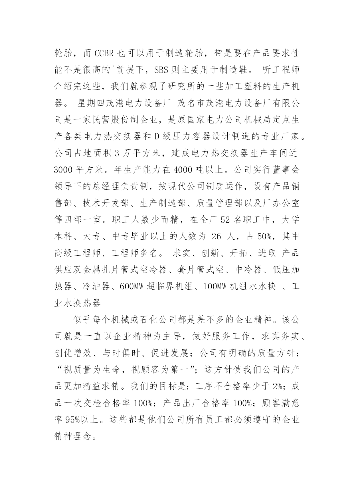 机械专业实习报告1机械专业实习报告随着人们自身素质提升,报告的适用范围越来越广泛,报告中涉及到专业性术语要解释清楚。其实写报告并没有想象中那么难,下面是小编为大家整理的机械专业实习报告,仅供参考,欢迎大家阅读。机械专业实习报告1时间如梭,大二的第二个学期就到第九周了,在这一周,我们将迎来一周的认识实习。作为一名机械设计与制造专业的学生,我心里很激动,“真正的接触”(去看,去了解,不仅仅是纸上谈兵)我们专业的东西。在那些工程师的带领下,走在正在生产的车间里,我们从感性上了解也专业有关的生产工业流程及各生产设备的特点,不仅受益匪浅,而且为今后的课程学习打下坚实的基础,真可谓受益良多。在这一周的时间,我们参观了茂名市的四个单位。分别是:茂石化机械厂重力机械厂、茂名石化实华股份有限公司、茂名市橡胶塑料研究所、星期一是茂石化机械厂重力机械厂。该厂成立于1958年的茂名石化机械厂伴随着茂名石化工业的发展不断壮大,尤其是近年来依靠技术进步和新产品开发,实现了由单一承担企业内部机修和配件生产任务的生产厂向以开发制造石化新型重大设备为主的装备基地跨越,拥有翅片管、裂解炉、换热器、环管反应器等多条专业生产线,取得了美国工程师学会技术规范和美国船检局质量体系认证,生产的聚合反应器、高压换热器、高效翅片管等设备被国内各大石化企业使用,尤其是乙烯裂解炉对流段占有国内80%的市场份额,被用于燕山石化、上海石化、齐鲁石化、茂名石化乙烯改扩建工程。该企业在南海石化乙烯炉招标中击败国内外多家大公司,中标承揽了工程核心设备乙烯裂解炉模块制造项目。实施改制分流后,茂名重力石化机械有限公司将发挥民营企业在体制和机制上的优势,提升技术水平,拓宽市场空间,打造国内一流的石化设备制造基地。其次,机械厂的绿化做的也非常好,被称为园林里的工厂,感觉比我们学校绿化还好。机械厂主要生产反应器、环管和换热器的,品牌产品乙烯裂解炉对流段、换热器、聚合反应器、反应器。主要用于石化行业,我不是学石化的,不是很专业,但是我们据我实习看到的,它们厂的产品是非常不错的。而且通过参观实际生产线,我发现该厂员工很少,很多都已经实现自动化生产工艺流程。星期二实华东阳公司(制罐厂)。茂名石化实华股份有限公司是以国家特大型国有企业中国石化茂名石油化工公司为发起人,于1988年10月创立的股份制企业,“茂化实华”A股股票于1996年11月14日在深圳证劵交易所挂牌上市,是茂名市第一家上市公司。茂名市东阳实华金鹰制罐厂主要生产的是供其实华公司石油产品使用的油罐。全场的生产线有5-6台吹塑成型机,都是采用自动化的机床。原材料聚合物在成型过程中,先通过空气把熔融状态的原材料聚合物吹出胚型,然后通过凹模挤压,完成最终的半成品。接下来就是辅助操作包括去飞边、切割、贴标签等。据工程师介绍,现在茂名市东阳实华金鹰制罐厂日产量可达到19000个。而茂名石化股份有限公司聚丙烯编织袋厂则主要生产包装聚丙烯的编织袋。其生产过程主要是先将原材料加热,然后把原材料挤压成一片薄膜,接着就把薄膜切成小袋状,然后把这些小条线纺成一大卷,一边接下来的编制工作。编织是从整个圆周进行编辑的,然后再根据需要的长度而进行剪切。剪切好编织袋,接下来就是缝纫的功夫了——把一段给封死。这就完成了编织袋半成品的工序了、接着的便是印刷了,把袋子印上所需的标识等东西,一个编织袋就完工了。星期三茂石化橡胶塑料研究所茂名市乙烯橡胶塑料研究所是隶属于茂名市石油化工有限公司化工分部的一个下设部门,也是华南地区唯一的一个中国石化塑料技术中心分部。茂名市乙烯橡胶塑料研究所主要的研究工作是对乙烯进行研究分析,开发出新的橡胶塑料产品。据工程师介绍现阶段的研究成果就有(1)LDPE,在高压2600MPa、300度的条件下产出产品:951-000;(2)LLDPE,产出产品8916;(3)HDPE,产出产品5502,主要用作日用品的包装,产品570,主要用于制作大容量桶。聚丙烯的主要有HHP,主要用作制造汽车保险杠。而橡胶主要有SSBR、CCBR和SBS。SSBR主要用于制造轮胎,而CCBR也可以用于制造轮胎,带是要在产品要求性能不是很高的'前提下,SBS则主要用于制造鞋。听工程师介绍完这些,我们就参观了研究所的一些加工塑料的生产机器。星期四茂港电力设备厂茂名市茂港电力设备厂有限公司是一家民营股份制企业,是原国家电力公司机械局定点生产各类电力热交换器和D级压力容器设计制造的专业厂家。公司占地面积3万平方米,建成电力热交换器生产车间近3000平方米。年生产能力在4000吨以上。公司实行董事会领导下的总经理负责制,按现代公司制度运作,设有产品销售部、技术开发部、生产制造部、质量管理部以及厂办公室等四部一室。职工人数少而精,在全厂52名职工中,大学本科、大专、中专毕业以上的人数为