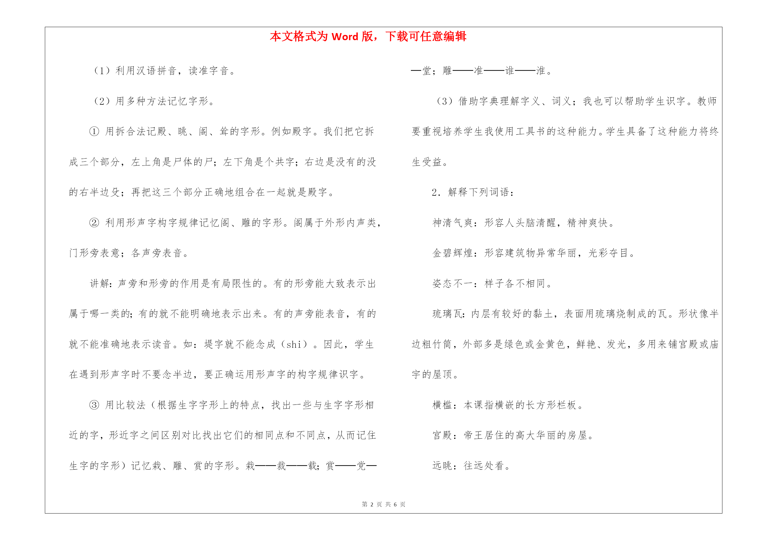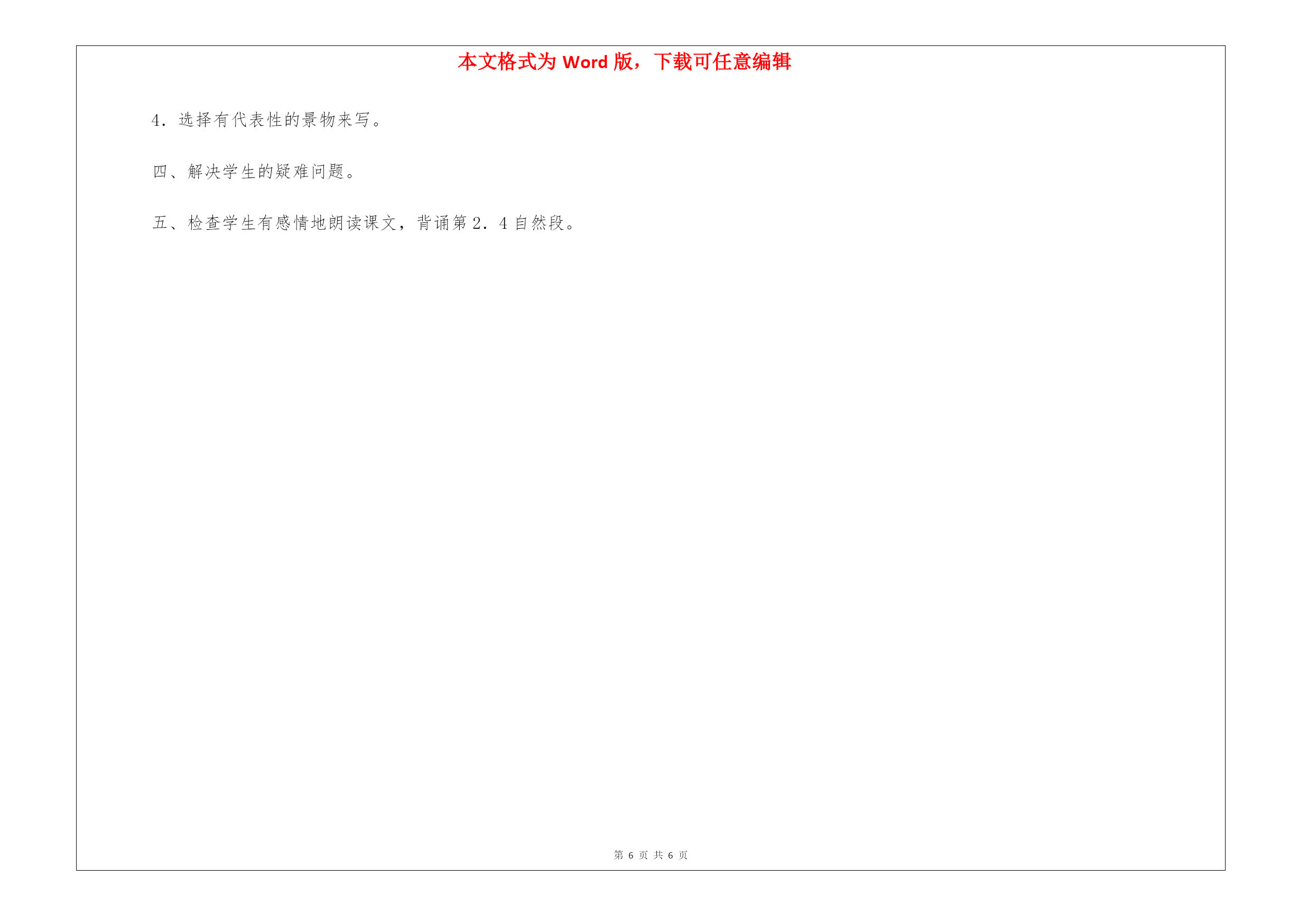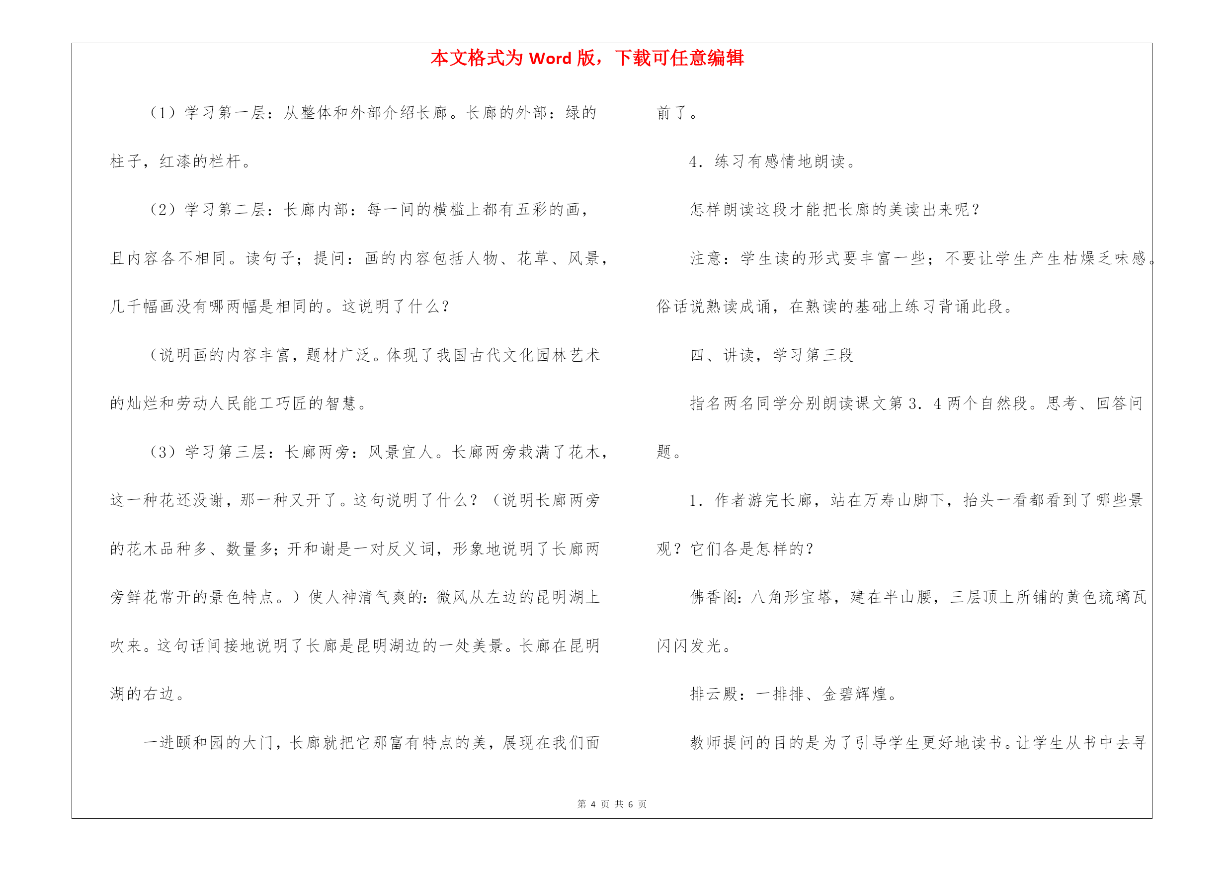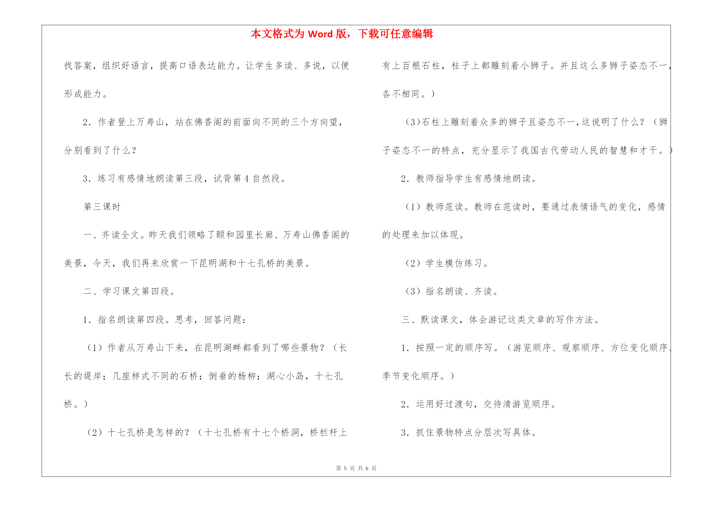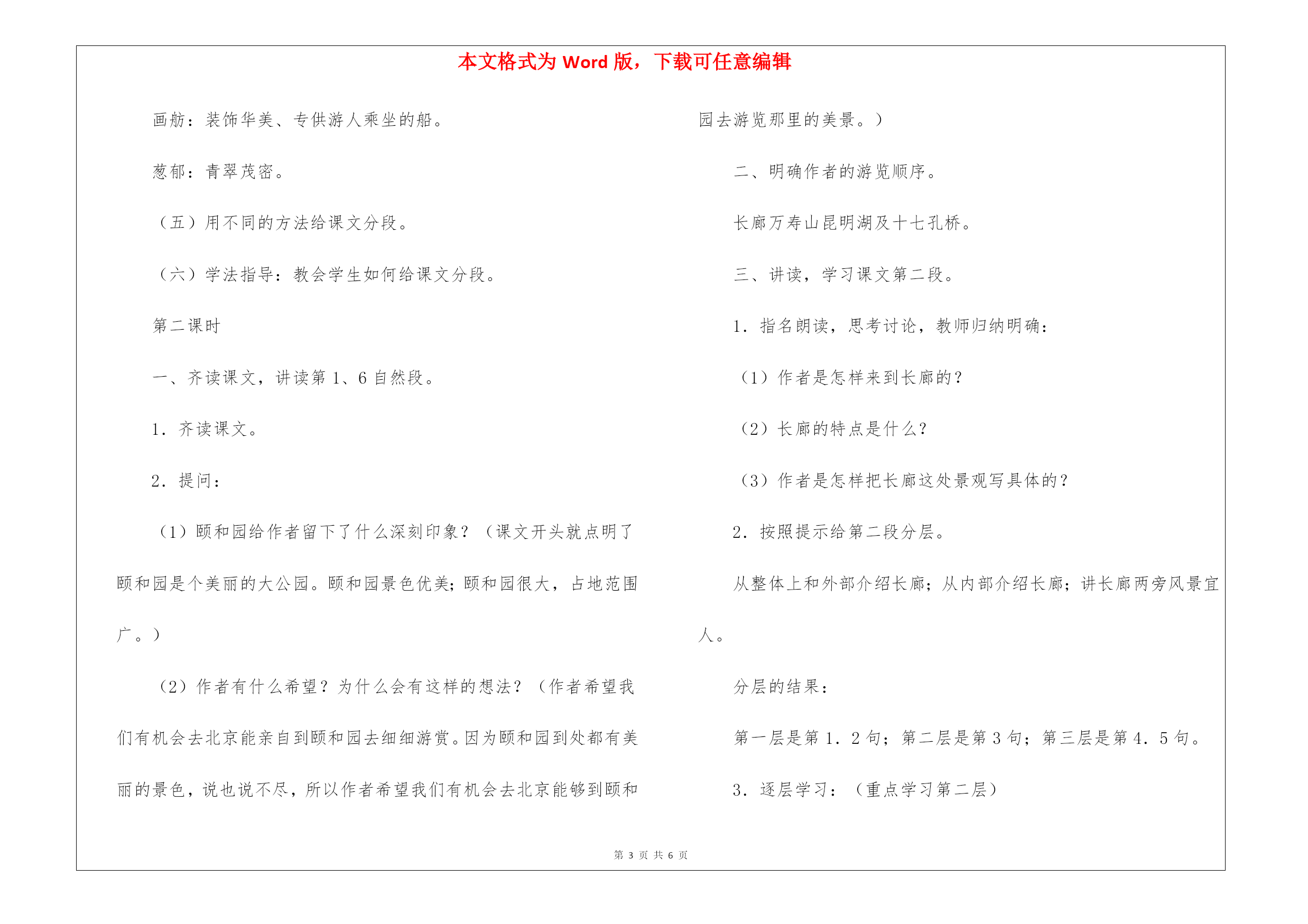 本文格式为Word版,下载可任意编辑第PAGE\*MERGEFORMAT6页共NUMPAGES\*MERGEFORMAT6页《颐和园》教学设计教学目标使学生了解颐和园的美丽景色,培养学生的爱美情趣,增强学生的民族自豪感。1.按照课文所记叙的游览顺序,练习给课文分段2.学会本课的7个生字。理解词句,会用耸立和隐隐约约2个词语造句。3.有感情地朗读课文。背诵第2.4自然段教学重点1.理解课文内容,按照游览顺序给课文分段。2.学难点借助课文,陶冶学生的爱美情趣,增强民族自豪感。教学时间3课时第一课时一、导入新课。导语:在我国的首都北京西郊,有一个世界著名的皇家园林。它就是颐和园,(教师板书课题)那里有著名的长廊、佛香阁、昆明湖、十七孔桥等人文景观。今天就让我们寻着作者的足迹,一同来饱览颐和园的美景。二、出示幻灯片,认识颐和园的几个著名景观,从直观入手,对颐和园的美景先有一个感性的认识。(有条件的可以给学生播放有关颐和园的风景教学录相片。或出示一组有关颐和园名胜风光图片。)三、学生轻声读课文,用笔标出课文有几个自然段;划出本课的生字和新词。四、学习生字和要求写的字。1.学习生字:识字教学的要求是读准字音、记清字形、了解字义。会给生字组词。(1)利用汉语拼音,读准字音。(2)用多种方法记忆字形。①用拆合法记殿、眺、阁、耸的字形。例如殿字。我们把它拆成三个部分,左上角是尸体的尸;左下角是个共字;右边是没有的没的右半边殳;再把这三个部分正确地组合在一起就是殿字。②利用形声字构字规律记忆阁、雕的字形。阁属于外形内声类,门形旁表意;各声旁表音。讲解:声旁和形旁的作用是有局限性的。有的形旁能大致表示出属于哪一类的;有的就不能明确地表示出来。有的声旁能表音,有的就不能准确地表示读音。如:堤字就不能念成(shi)。因此,学生在遇到形声字时不要念半边,要正确运用形声字的构字规律识字。③用比较法(根据生字字形上的特点,找出一些与生字字形相近的字,形近字之间区别对比找出它们的相同点和不同点,从而记住生字的字形)记忆栽、雕、赏的字形。栽──裁──载;赏──党──堂;雕──准──谁──淮。(3)借助字典理解字义、词义;我也可以帮助学生识字。教师要重视培养学生我使用工具书的这种能力。学生具备了这种能力将终生受益。2.解释下列词语:神清气爽:形容人头脑清醒,精神爽快。金碧辉煌:形容建筑物异常华丽,光彩夺目。姿态不一:样子各不相同。琉璃瓦:内层有较好的黏土,表面用琉璃烧制成的瓦。形状像半边粗竹筒,外部多是绿色或金黄色,鲜艳、发光,多用来铺宫殿或庙宇的屋顶。横槛:本课指横嵌的长方形栏板。宫殿:帝王居住的高大华丽的房屋。远眺:往远处看。画舫:装饰华美、专供游人乘坐的船。葱郁:青翠茂密。(五)用不同的方法给课文分段。(六)学法指导:教会学生如何给课文分段。第二课时一、齐读课文,讲读第1、6自然段。1.齐读课文。2.提问:(1)颐和园给作者留下了什么深刻印象?(课文开头就点明了颐和园是个美丽的大公园。颐和园景色优美;颐和园很大,占地范围广。)(2)作者有什么希望?为什么会有这样的想法?(作者希望我们有机会去北京能亲自到颐和园去细细游赏。因为颐和园到处都有美丽的景色,说也说不尽,所以作者希望我们有机会去北京能够到颐和园去游览那里的美景。)二、明确作者的游览顺序。长廊万寿山昆明湖及十七孔桥。三、讲读,学习课文第二段。1.指名朗读,思考讨论,教师归纳明确:(1)作者是怎样来到长廊的?(2)长廊的特点是什么?(3)作者是怎样把长廊这处景观写具体的?2.按照提示给第二段分层。从整体上和外部介绍长廊;从内部介绍长廊;讲长廊两旁风景宜人。分层的结果:第一层是第1.2句;第二层是第3句;第三层是第4.5句。3.逐层学习:(重点学习第二层)(1)学习第一层:从整体和外部介绍长廊。长廊的外部:绿的柱子,红漆的栏杆。(2)学习第二层:长廊内部:每一间的横槛上都有五彩的画,且内容各不相同。读句子;提问:画的内容包括人物、花草、风景,几千幅画没有哪两幅是相同的。这说明了什么?(说明画的内容丰富,题材广泛。体现了我国古代文化园林艺术的灿烂和劳动人民能工巧匠的智慧。(3)学习第三层:长廊两旁:风景宜人。长廊两旁栽满了花木,这一种花还没谢,那一种又开了。这句说明了什么?(说明长廊两旁的花木品种多、数量多;开和谢是一对反义词,形象地说明了长廊两旁鲜花常开的景色特点。)使人神清气爽的:微风从左边的昆明湖上吹来。这句话间接地说明了长廊是昆明湖边的一处美景。长廊在昆明湖的右边。一进颐和园的大门,长廊就把它那富有特点的美,展现在我们面前了。4.练习有感情地朗读。怎样朗读这段才能把长廊的美读出来呢?注意:学生读的形式要丰富一些;不要让学生产生枯燥乏味感。俗话说熟读成诵,在熟读的基础上练习背诵此段。