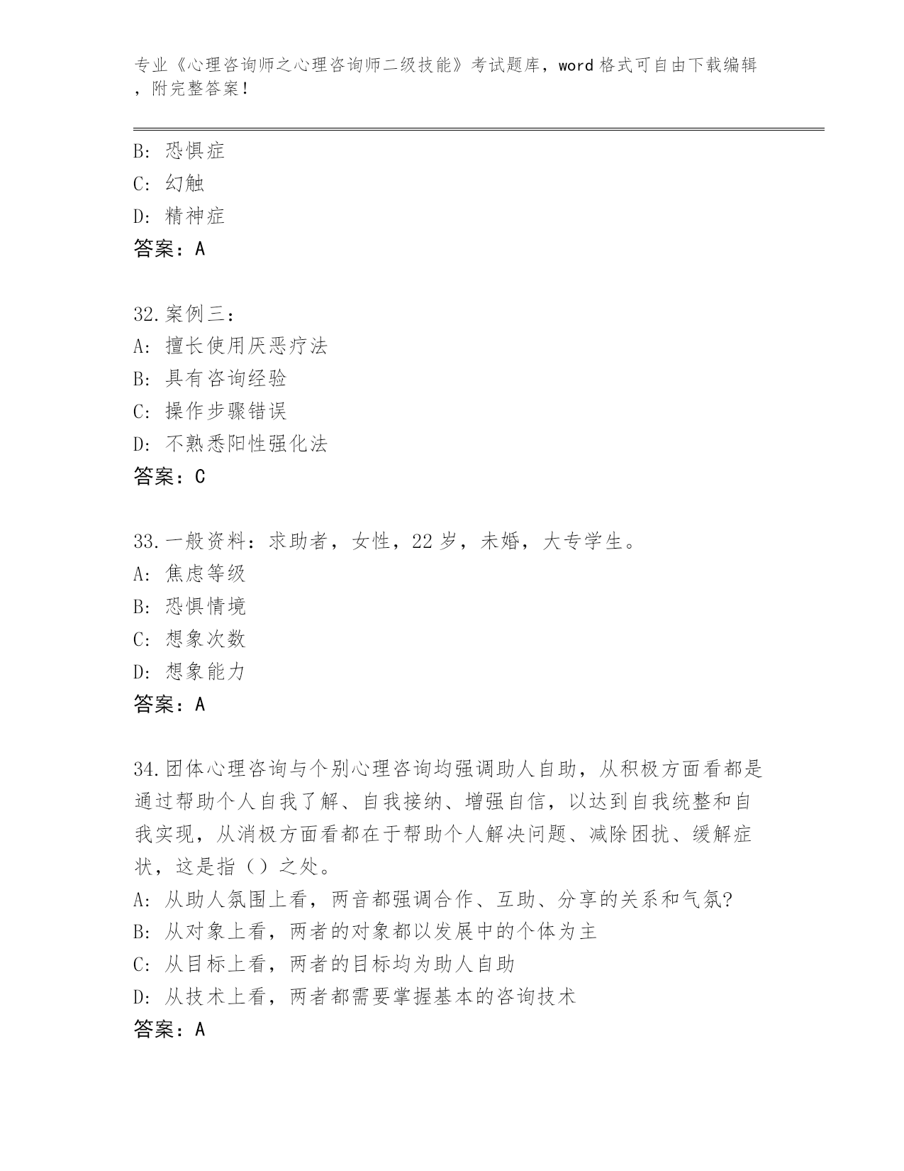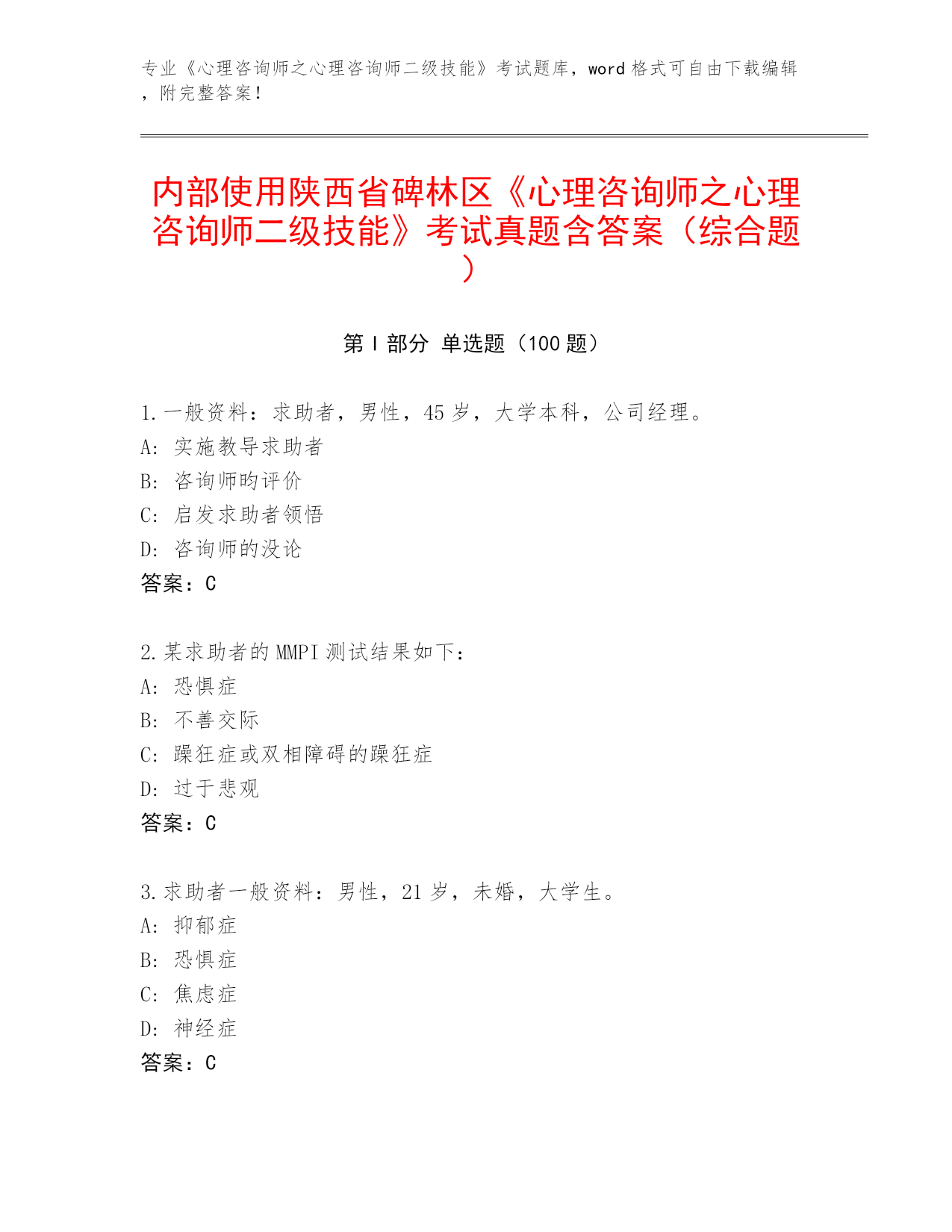陕西省碑林区内部使用《心理咨询师之心理咨询师二级技能》资格考试必刷200题大全加答案解析