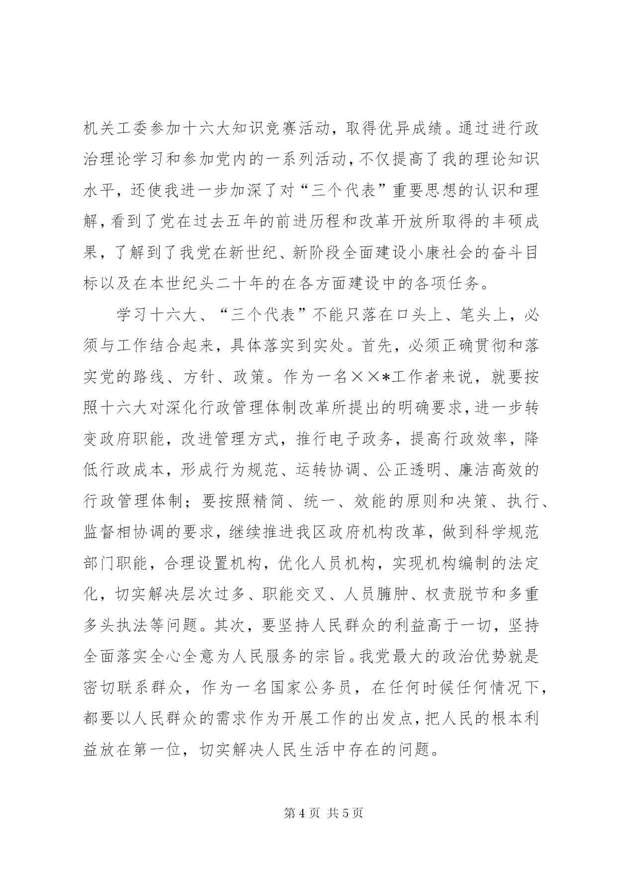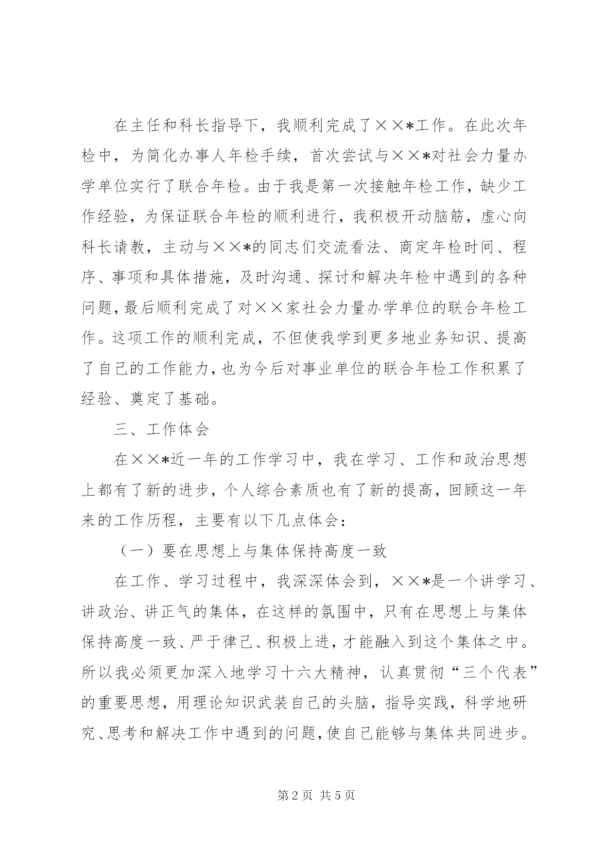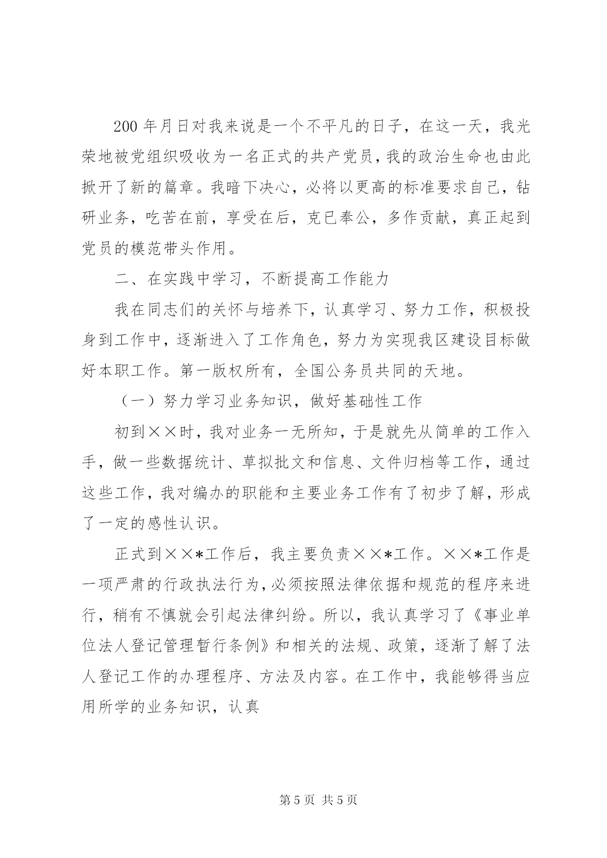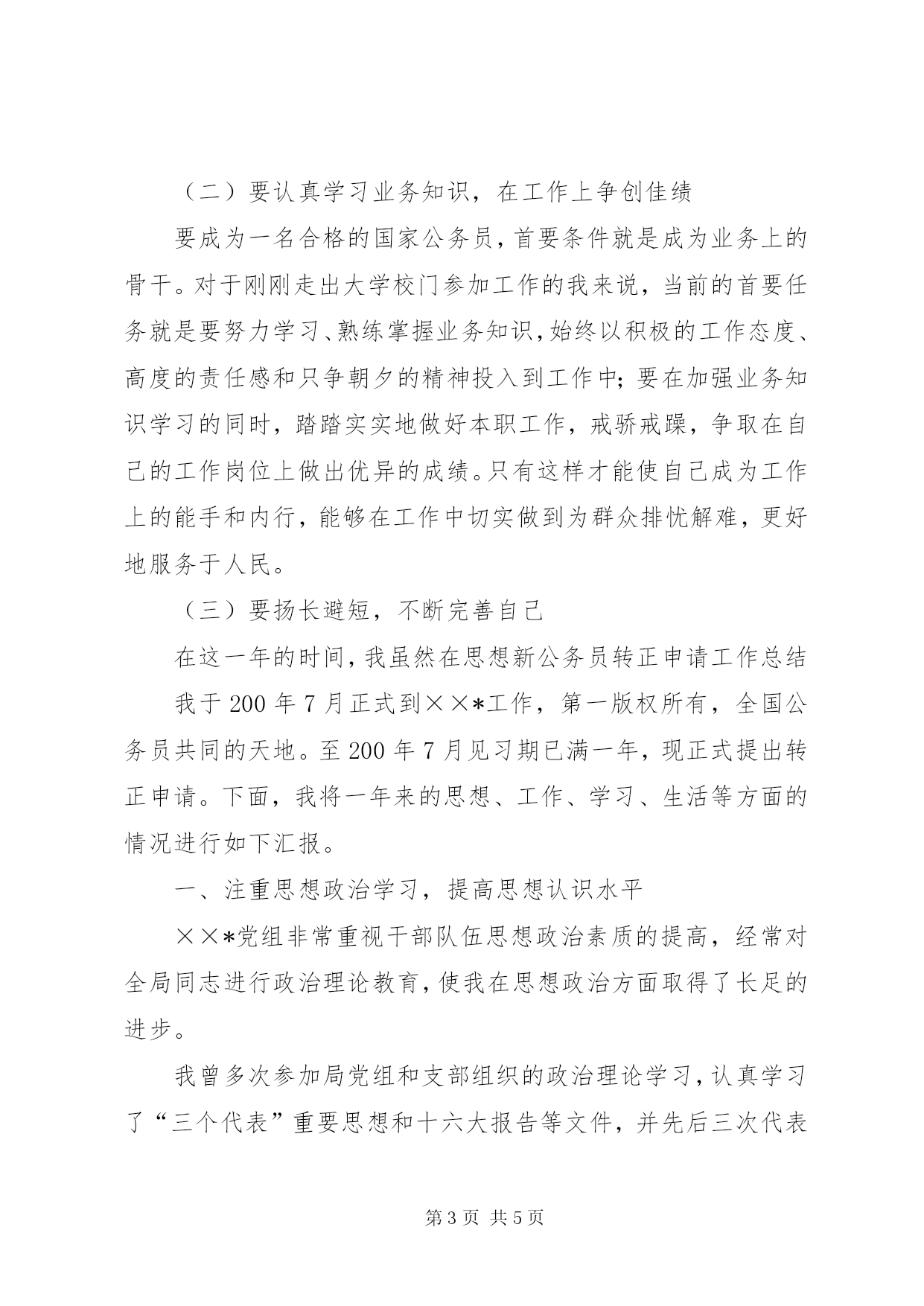第PAGE\*Arabic\*MERGEFORMAT5页共NUMPAGES\*MERGEFORMAT5页新公务员转正申请工作总结审查、受理每一份登记申请、打印《事业单位法人证书》、收费、发证、将每一份申请登记的材料整理归档、及时更新数据记录;在平时积极参与编办的各项工作,完成了xx年度全区党政群机关和事业单位的机构编制统计工作。随着所接触工作面的增长和工作量的不断加大,我对科室工作的认识也不断加深,这些基础性工作也为我今后进一步提高业务水平和工作能力打下了扎实的基础。(二)提高服务意识,改进工作作风邓小平同志曾说过,“管理就是服务”。而事业单位法人登记管理工作,从某种意义上说,就是为了更好地为社会主义市场经济服务,为事业单位服务。为做好事业单位登记管理工作,规范工作程序,让办事人清楚明了办事程序,我印制了《事业单位登记手册》,在申请人领取申请书的同时发放给他们,并告知其申请中的注意事项,同时在受理登记时开具《事业单位登记受理通知单》,在规范办事程序、方便办事人的同时,还实现了事业单位对登记管理机关的监督。另外,在日常工作中,我本着为人民服务的原则,热情、准确地解答来访、来电的事业单位或个人所提出的有关事业单位法人登记中的问题,为办事单位提供满意的服务。(三)提高工作能力,勇于创新在主任和科长指导下,我顺利完成了××*工作。在此次年检中,为简化办事人年检手续,首次尝试与××*对社会力量办学单位实行了联合年检。由于我是第一次接触年检工作,缺少工作经验,为保证联合年检的顺利进行,我积极开动脑筋,虚心向科长请教,主动与××*的同志们交流看法、商定年检时间、程序、事项和具体措施,及时沟通、探讨和解决年检中遇到的各种问题,最后顺利完成了对××家社会力量办学单位的联合年检工作。这项工作的顺利完成,不但使我学到更多地业务知识、提高了自己的工作能力,也为今后对事业单位的联合年检工作积累了经验、奠定了基础。三、工作体会在××*近一年的工作学习中,我在学习、工作和政治思想上都有了新的进步,个人综合素质也有了新的提高,回顾这一年来的工作历程,主要有以下几点体会:(一)要在思想上与集体保持高度一致在工作、学习过程中,我深深体会到,××*是一个讲学习、讲政治、讲正气的集体,在这样的氛围中,只有在思想上与集体保持高度一致、严于律己、积极上进,才能融入到这个集体之中。所以我必须更加深入地学习十六大精神,认真贯彻“三个代表”的重要思想,用理论知识武装自己的头脑,指导实践,科学地研究、思考和解决工作中遇到的问题,使自己能够与集体共同进步。(二)要认真学习业务知识,在工作上争创佳绩要成为一名合格的国家公务员,首要条件就是成为业务上的骨干。对于刚刚走出大学校门参加工作的我来说,当前的首要任务就是要努力学习、熟练掌握业务知识,始终以积极的工作态度、高度的责任感和只争朝夕的精神投入到工作中;要在加强业务知识学习的同时,踏踏实实地做好本职工作,戒骄戒躁,争取在自己的工作岗位上做出优异的成绩。只有这样才能使自己成为工作上的能手和内行,能够在工作中切实做到为群众排忧解难,更好地服务于人民。(三)要扬长避短,不断完善自己在这一年的时间,我虽然在思想新公务员转正申请工作总结我于200年7月正式到××*工作,第一版权所有,全国公务员共同的天地。至200年7月见习期已满一年,现正式提出转正申请。下面,我将一年来的思想、工作、学习、生活等方面的情况进行如下汇报。一、注重思想政治学习,提高思想认识水平××*党组非常重视干部队伍思想政治素质的提高,经常对全局同志进行政治理论教育,使我在思想政治方面取得了长足的进步。我曾多次参加局党组和支部组织的政治理论学习,认真学习了“三个代表”重要思想和十六大报告等文件,并先后三次代表机关工委参加十六大知识竞赛活动,取得优异成绩。通过进行政治理论学习和参加党内的一系列活动,不仅提高了我的理论知识水平,还使我进一步加深了对“三个代表”重要思想的认识和理解,看到了党在过去五年的前进历程和改革开放所取得的丰硕成果,了解到了我党在新世纪、新阶段全面建设小康社会的奋斗目标以及在本世纪头二十年的在各方面建设中的各项任务。学习十六大、“三个代表”不能只落在口头上、笔头上,必须与工作结合起来,具体落实到实处。首先,必须正确贯彻和落实党的路线、方针、政策。作为一名××*工作者来说,就要按照十六大对深化行政管理体制改革所提出的明确要求,进一步转变政府职能,改进管理方式,推行电子政务,提高行政效率,降低行政成本,形成行为规范、运转协调、公正透明、廉洁高效的行政管理体制;要按照精简、统一、效能的原则和决策、执行、监督相协调的要求,继续推进我区政府机构改革,做到科学规范部门职能,合理设置机构,优化人员机构,实现机构编制的法定化,切实解决层次过多、职能交叉