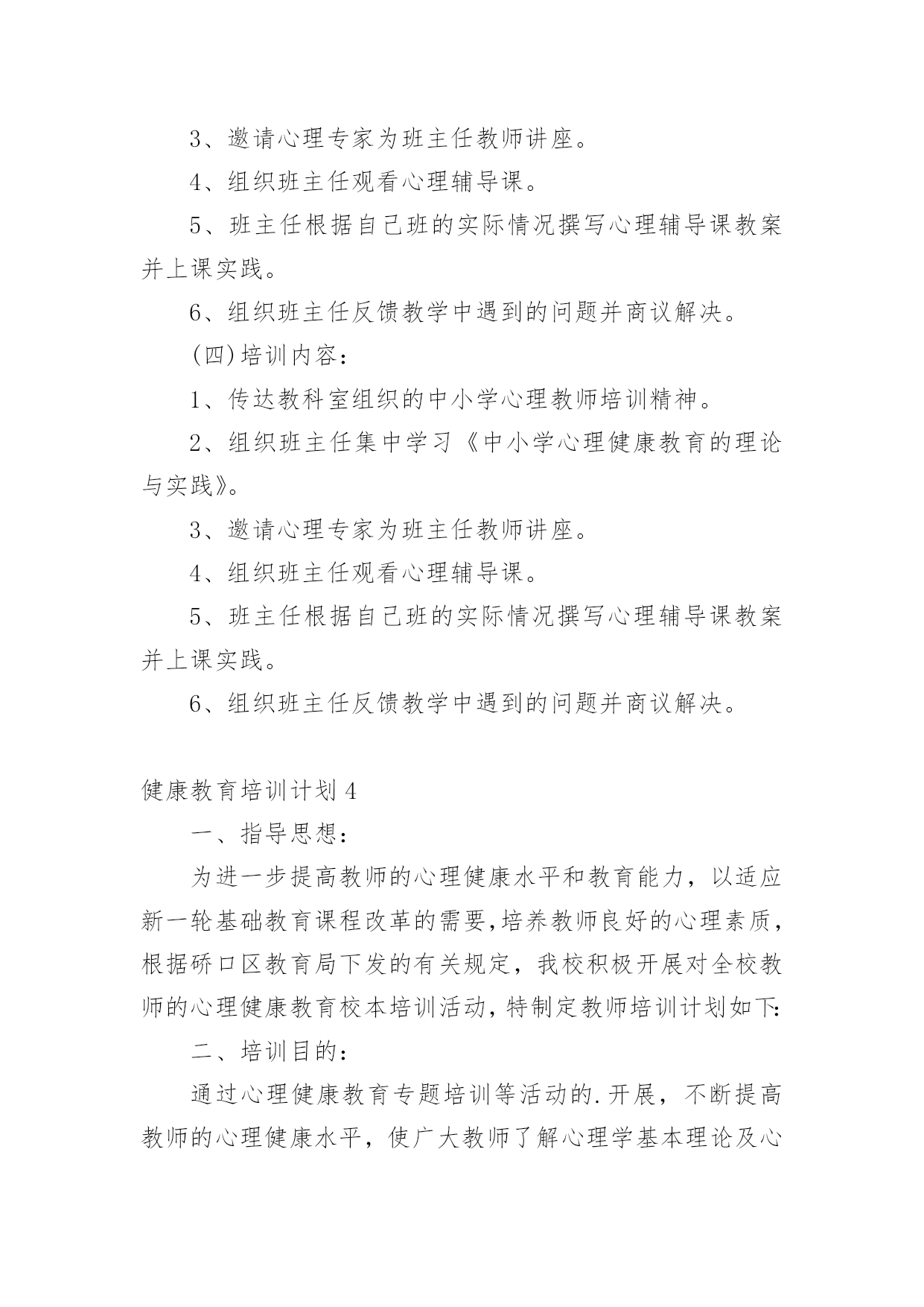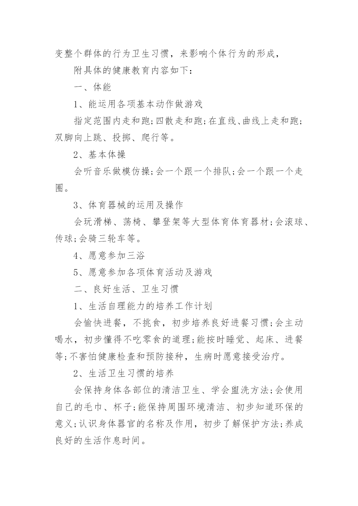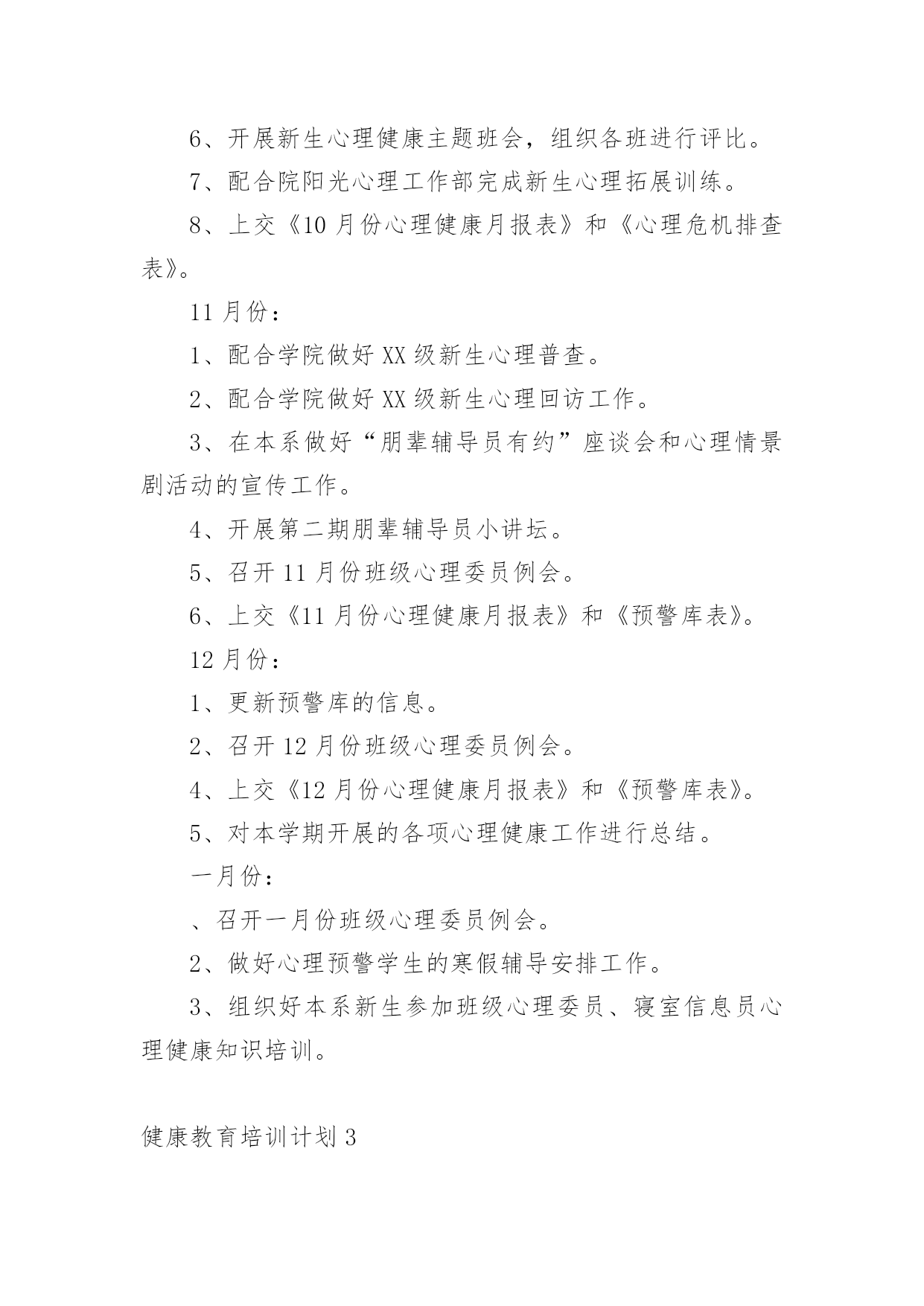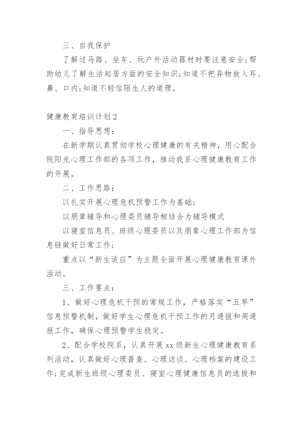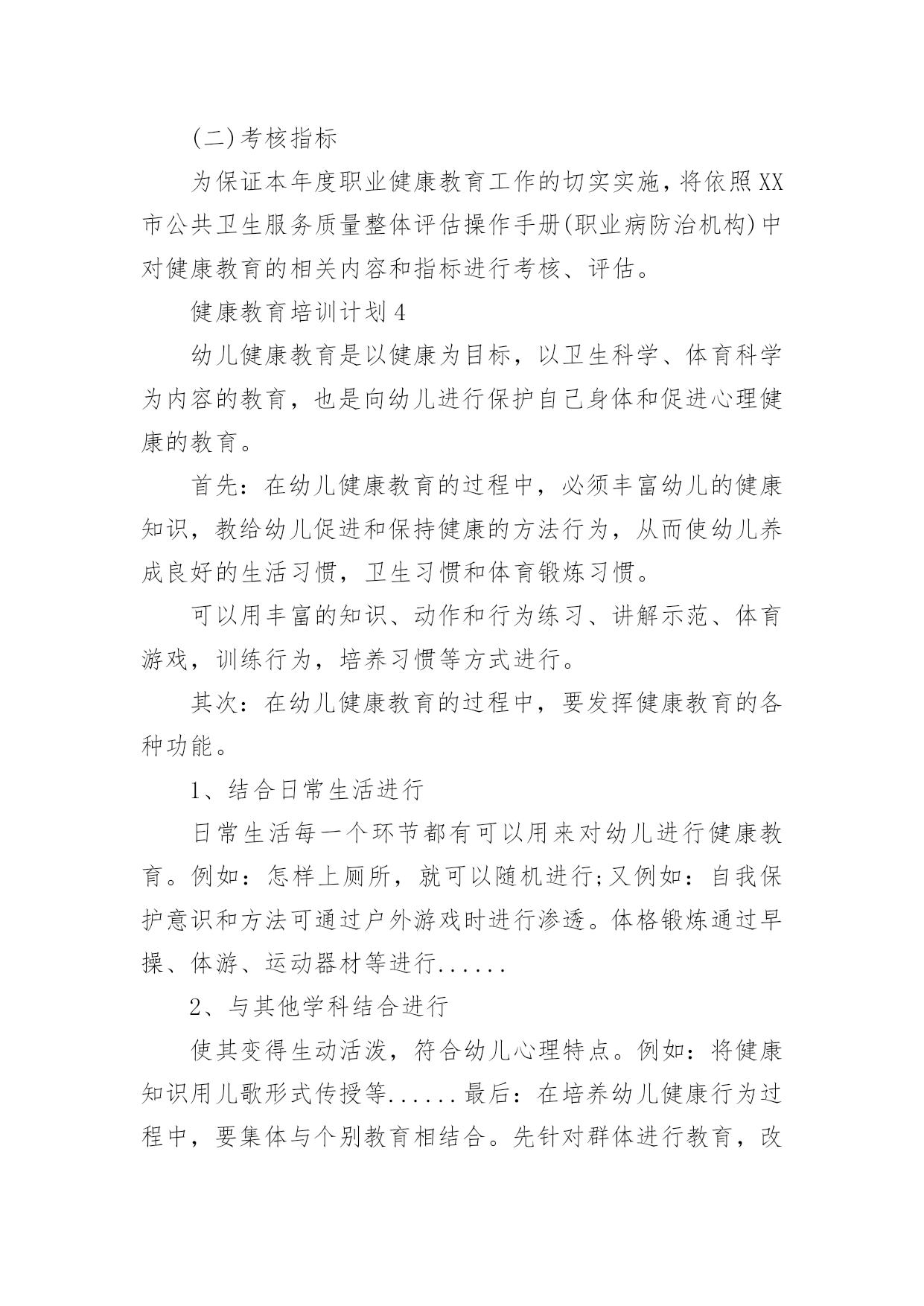 健康教育培训计划健康教育培训计划实用[15篇]时间过得太快,让人猝不及防,又将迎来新的工作,新的挑战,请一起努力,写一份计划吧。可是到底什么样的计划才是适合自己的呢?下面是小编帮大家整理的健康教育培训计划,欢迎大家借鉴与参考,希望对大家有所帮助。健康教育培训计划1职业健康教育工作是职业病防治工作的一个重要组成部分,为了贯彻执行一、概况项目名称:职业健康教育专项工作项目任务科室:办公室人事办项目负责人:项目承担人员:项目起止时间:年1月至年12月二、工作目标与任务(一)项目背景我公司共有驾驶员(二)目的⑴通过对相关人员进行培训,普及《中华人民共和国职业病防治法》认知度和提高其应用水平。⑵在培训过程中,开展互动教学,加强我中心对各单位的职业卫生状况的了解和掌握,便于更好地开展实际工作。⑶通过该培训工作,加强我中心与相关单位及其负责人的职业卫生方面的沟通。⑷通过该培训工作,增强我工作人员自身素质和提高实际工作能力。⑸通过被培训人员的工作,将其所获得知识普及给更广泛的劳动人群,促进我区职业卫生事业的发展。(三)项目内容⑴计划开展宣传活动≥2次。⑵印发宣传品≥3种。⑶宣传栏出刊数≥3次。⑷举办对企业管理人员或职工培训班≥2次。⑸采用科普稿件的形式通过报纸、网络等传播媒体宣传职业病防治知识,≥3篇。⑹工作过程中做好工作记录,工作结束要及时做好总结分析。(四)阶段计划及阶段目标⑴五一前后开展职业病防治法宣传周活动,通过固定宣传栏、工业区、社区设点宣传、宣传车流动宣传等多种方式多方面宣传职业病防治法。⑵大运会前结合全市大运会安全保障的总体部署,会同监督所对辖区重点职业病危害企业开展职业病防治宣传活动,加强职业病防治宣传和监管。⑶配合基本职业卫生服务工作,印制各种职业卫生宣传折页,小物品等,免费发放给接触职业危害的劳动者,提高他们防病治病的意识。⑷每季度以辖区常见职业病为内容做一期宣传栏,宣传内容应通俗易懂,图文并茂,以达到广泛宣传的目的。⑸充分利用报纸、网络媒体覆盖面广的特点,不定期的撰写职业病防治科普稿件,多渠道宣传职业病防治知识。⑹为配合基本职业卫生服务的开展,拟定于下半年对辖区内社康中心医务人员举办一期职业卫生培训会议。三、预期成果及考核指标(一)预期成果⑴通过职业病防治法宣传周多形式多层次的宣传,让更多的企业负责人和劳动者知法、懂法、守法,不断扩大我区职业卫生服务覆盖面,切实保障劳动者健康权益,构建和谐社会。⑵大运前对重点企业负责人和管理人员进行职业健康教育培训,可以使企业更加重视大运期间的职业病防治工作,减少职业卫生突发事件和职业病的发生,从而保证大运会更加安全、平稳的进行。⑶通过对社康中心医务人员的培训,增加医务人员的职业病防治知识,可以发现更多经由社康中心诊治的疑似职业病病人,减少误诊和漏诊率,及时救治职业病病人,提高医疗水平。⑷进入社区进行职业健康教育宣传,通过报纸、网络等各种渠道宣传职业病防治,让更多的.人了解职业卫生,将可增加我区职业病防治的社会支持度。(二)考核指标为保证本年度职业健康教育工作的切实实施,将依照XX市公共卫生服务质量整体评估操作手册(职业病防治机构)中对健康教育的相关内容和指标进行考核、评估。健康教育培训计划4幼儿健康教育是以健康为目标,以卫生科学、体育科学为内容的教育,也是向幼儿进行保护自己身体和促进心理健康的教育。首先:在幼儿健康教育的过程中,必须丰富幼儿的健康知识,教给幼儿促进和保持健康的方法行为,从而使幼儿养成良好的生活习惯,卫生习惯和体育锻炼习惯。可以用丰富的知识、动作和行为练习、讲解示范、体育游戏,训练行为,培养习惯等方式进行。其次:在幼儿健康教育的过程中,要发挥健康教育的各种功能。1、结合日常生活进行日常生活每一个环节都有可以用来对幼儿进行健康教育。例如:怎样上厕所,就可以随机进行;又例如:自我保护意识和方法可通过户外游戏时进行渗透。体格锻炼通过早操、体游、运动器材等进行......2、与其他学科结合进行使其变得生动活泼,符合幼儿心理特点。例如:将健康知识用儿歌形式传授等......最后:在培养幼儿健康行为过程中,要集体与个别教育相结合。先针对群体进行教育,改变整个群体的行为卫生习惯,来影响个体行为的形成,附具体的健康教育内容如下:一、体能1、能运用各项基本动作做游戏指定范围内走和跑;四散走和跑;在直线、曲线上走和跑;双脚向上跳、投掷、爬行等。2、基本体操会听音乐做模仿操;会一个跟一个排队;会一个跟一个走圈。3、体育器械的运用及操作会玩滑梯、荡椅、攀登架等大型体育体育器材;会滚球、传球;会骑三轮车等。4、愿意参加三浴5、愿意参加各项体育活动及游戏二、良好生活、卫生习惯1、生活自理能力的培养工作计划会愉快进餐,不挑食,初步培养良好进餐习惯;会主动喝水,初步懂得不吃零食的道理;能按时睡觉、起