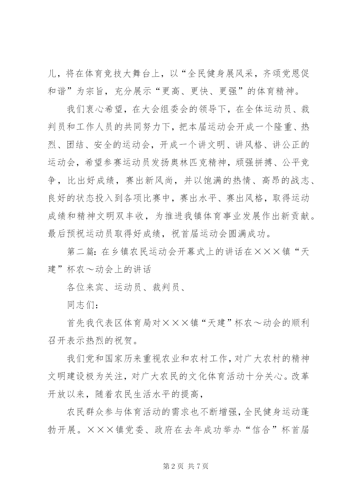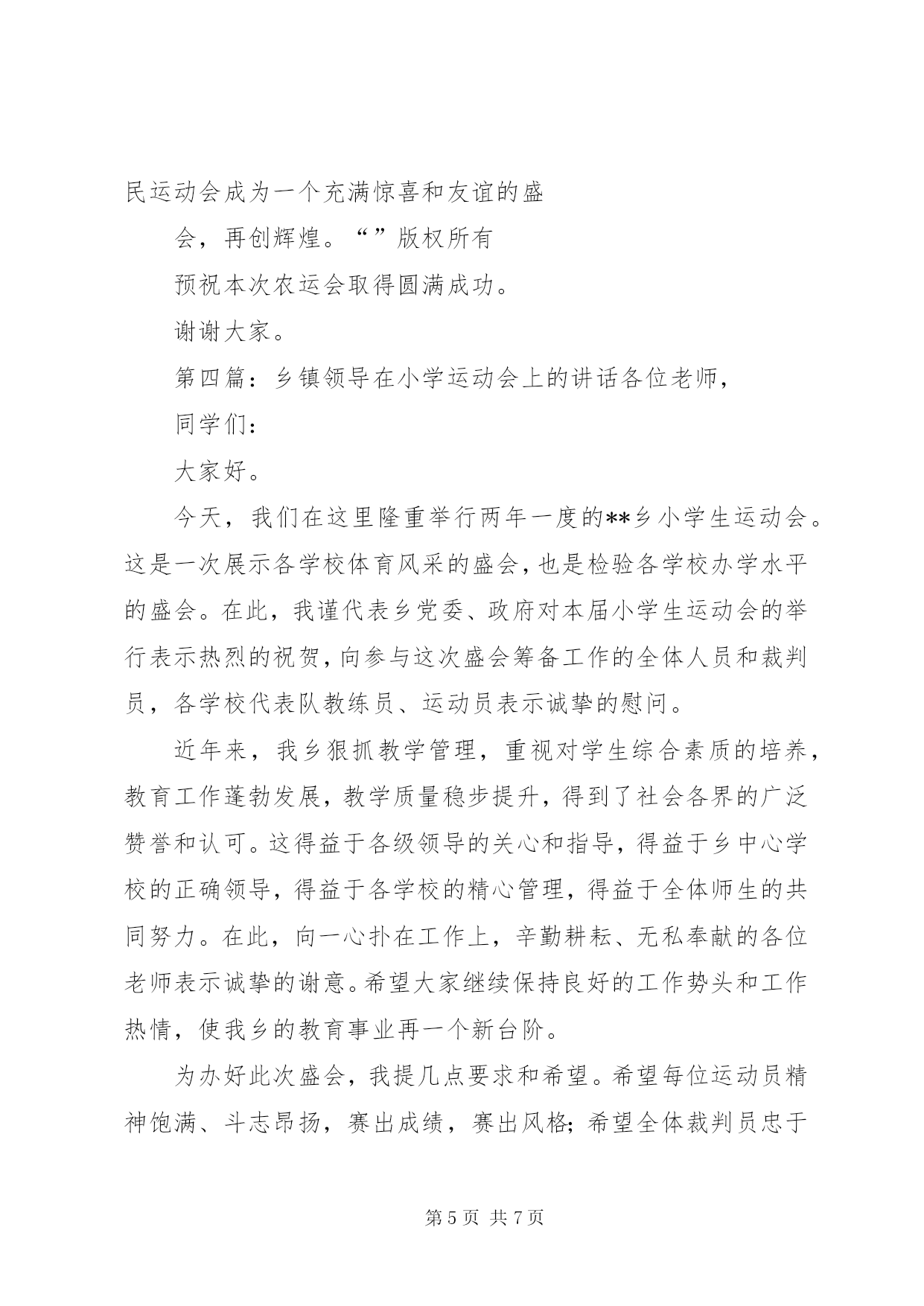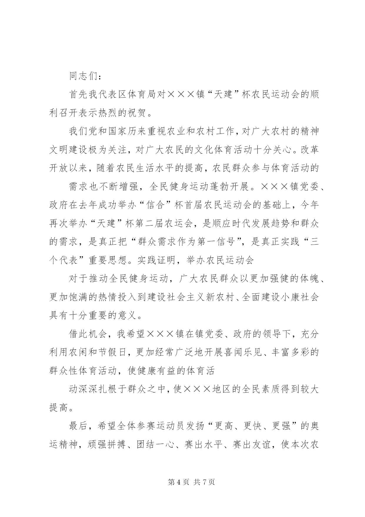 第PAGE\*Arabic\*MERGEFORMAT7页共NUMPAGES\*MERGEFORMAT7页在乡镇运动会上的讲话同志们:今天,我们迎来了镇首届运动会的隆重召开,这是**人民政治和文化生活中的一件大事。在此,我谨代表镇党委、政府,对运动会的召开表示最热烈的祝贺;向全体运动员、裁判员和工作人员致以亲切的问候。向所有到会的各有关单位和社会各界人士表示热烈的欢迎。在本次全民运动会的筹划过程中,我们得到了很多热心企业和人士的帮助:**公司、**公司、**公司等企业及一些热爱**体育事业的个人无偿赞助运动会,在此,也要向他们表示最衷心的感谢。**镇首届运动会是展示**新形象的大舞台。体育兴、事业兴,我们就是要通过举办运动会,推动全镇体育工作和全民健身运动的蓬勃发展,并以此为契机,振奋人心,凝聚力量,把“更高、更快、更强”的体育精神融入到提高效率、壮大实力中去,运用到经济发展和城镇建设中去,为实现现代化工业强镇目标,注入新的生机和活力。**人杰地灵,英才辈出。昨天,**人民在这块土地上创造出了骄人的成就;今天,勤劳勇敢的**人民一定能开拓进取,与时俱进。树立新形象,展现新风采,创造新业绩,实现新跨越,把我们**建设得更加美好。今天来自全镇各村、各行业的8个代表团,近200名体育健儿,将在体育竞技大舞台上,以“全民健身展风采,齐颂党恩促和谐”为宗旨,充分展示“更高、更快、更强”的体育精神。我们衷心希望,在大会组委会的领导下,在全体运动员、裁判员和工作人员的共同努力下,把本届运动会开成一个隆重、热烈、团结、安全的运动会,开成一个讲文明、讲风格、讲公正的运动会,希望参赛运动员发扬奥林匹克精神,顽强拼搏、公平竞争,比出好成绩,赛出新风尚,并以饱满的热情、高昂的战志、良好的状态投入到各项比赛中,赛出水平、赛出风格,取得运动成绩和精神文明双丰收,为推进我镇体育事业发展作出新贡献。最后预祝运动员取得好成绩,祝首届运动会圆满成功。第二篇:在乡镇农民运动会开幕式上的讲话在×××镇“天建”杯农~动会上的讲话各位来宾、运动员、裁判员、同志们:首先我代表区体育局对×××镇“天建”杯农~动会的顺利召开表示热烈的祝贺。我们党和国家历来重视农业和农村工作,对广大农村的精神文明建设极为关注,对广大农民的文化体育活动十分关心。改革开放以来,随着农民生活水平的提高,农民群众参与体育活动的需求也不断增强,全民健身运动蓬勃开展。×××镇党委、政府在去年成功举办“信合”杯首届农~动会的基础上,今年再次举办“天建”杯第二届农运会,是顺应时代发展趋势和群众的需求,是真正把“群众需求作为第一信号”,是真正实践“xxxx”重要思想。实践证明,举办农~动会对于推动全民健身运动,广大农民群众以更加强健的体魄、更加饱满的热情投入到建设社会主义新农村、全面建设小康社会具有十分重要的意义。借此机会,我希望×××镇在镇党委、政府的领导下,充分利用农闲和节假日,更加经常广泛地开展喜闻乐见、丰富多彩的群众性体育活动,使健康有益的体育活动深深扎根于群众之中,使×××地区的全民素质得到较大提高。最后,希望全体参赛运动员发扬“更高、更快、更强”的奥运精神,顽强拼搏、团结一心、赛出水平、赛出友谊,使本次农~动会成为一个充满惊喜和友谊的盛会,再创辉煌。预祝本次农运会取得~成功。谢谢大家。第三篇:在乡镇农民运动会开幕式上的讲话在乡镇农民运动会开幕式上的讲话各位来宾、运动员、裁判员、同志们:首先我代表区体育局对×××镇“天建”杯农民运动会的顺利召开表示热烈的祝贺。我们党和国家历来重视农业和农村工作,对广大农村的精神文明建设极为关注,对广大农民的文化体育活动十分关心。改革开放以来,随着农民生活水平的提高,农民群众参与体育活动的需求也不断增强,全民健身运动蓬勃开展。×××镇党委、政府在去年成功举办“信合”杯首届农民运动会的基础上,今年再次举办“天建”杯第二届农运会,是顺应时代发展趋势和群众的需求,是真正把“群众需求作为第一信号”,是真正实践“三个代表”重要思想。实践证明,举办农民运动会对于推动全民健身运动,广大农民群众以更加强健的体魄、更加饱满的热情投入到建设社会主义新农村、全面建设小康社会具有十分重要的意义。借此机会,我希望×××镇在镇党委、政府的领导下,充分利用农闲和节假日,更加经常广泛地开展喜闻乐见、丰富多彩的群众性体育活动,使健康有益的体育活动深深扎根于群众之中,使×××地区的全民素质得到较大提高。最后,希望全体参赛运动员发扬“更高、更快、更强”的奥运精神,顽强拼搏、团结一心、赛出水平、赛出友谊,使本次农民运动会成为一个充满惊喜和友谊的盛会,再创辉煌。“”版权所有预祝本次农运会取得圆满成功。谢谢大家。第四篇:乡镇领导在小学运动会上的讲话各位老师,同学们:大家好。今天,我们在这里