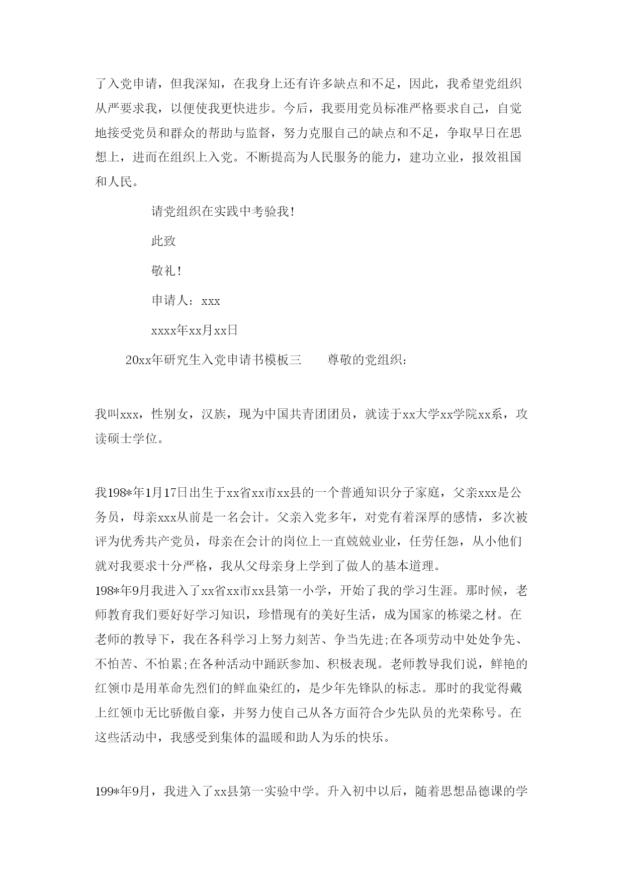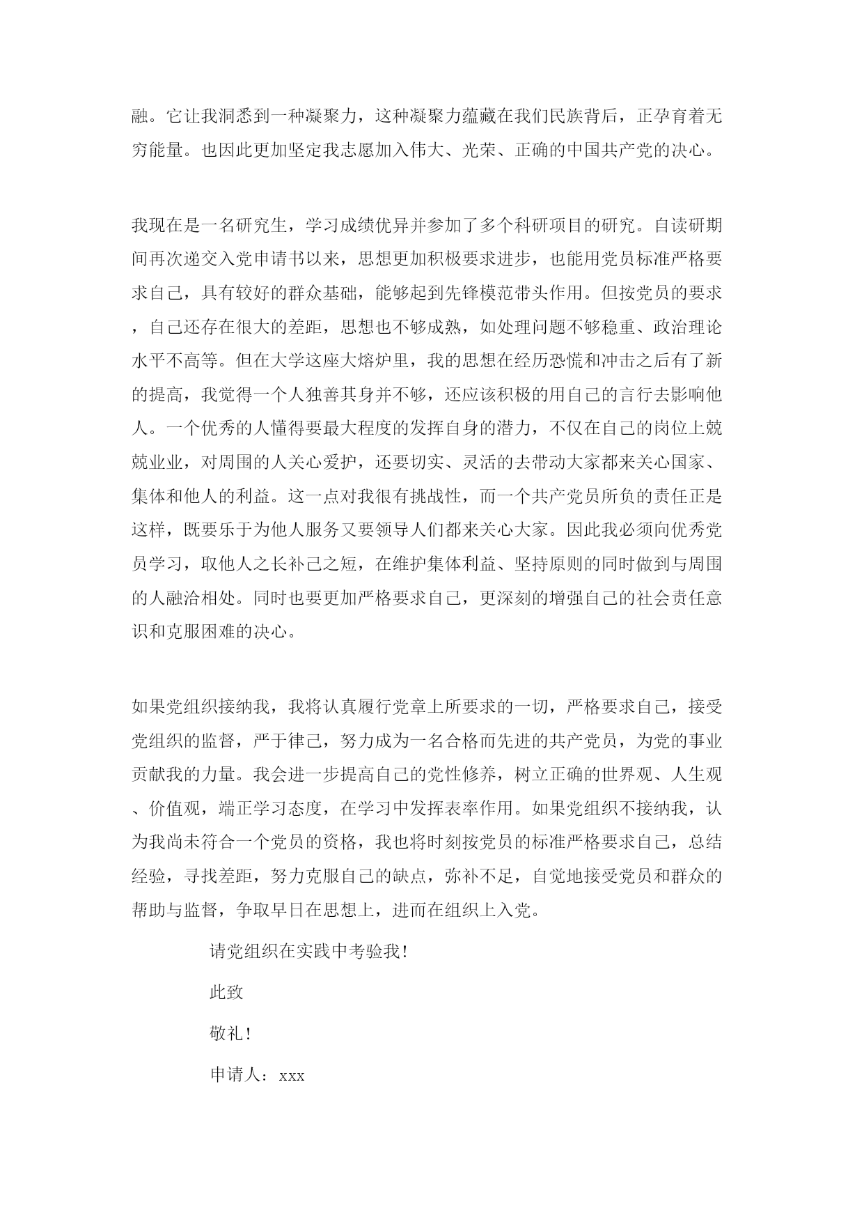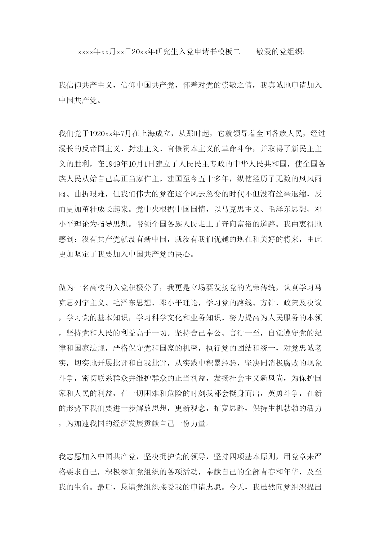 20XX年研究生入党申请书模板作为生在新中国,长在红旗下的青年人,应该如何写一份诚挚的入党申请书呢?下面是小编为大家收集整理的20xx年研究生入党申请书模板,欢迎大家阅读。20xx年研究生入党申请书模板一敬爱的党组织:我志愿加入中国共产党,拥护党的纲领,遵守党的章程,履行党员义务,执行党的决定,严守党的纪律,保守党的秘密,对党忠诚,积极工作,为共产主义奋斗终身,随时准备为党和人民牺牲一切,永不叛党。我之所以要加入中国共产党,是因为我深信共产主义事业的必然成功,深信只有社会主义才能救中国,只有社会主义才能发展中国。实践也充分证明,建设有中国特色社会主义,是实现中国经济繁荣和社会进步的康庄大道。我深信共产党员是彻底的唯物主义者,我将努力向这个方向发展。经过党组织的启发教育和帮助,使我对党有了更明确的认识。我深深懂得:中国共产党是中国工人阶级的先锋队,同时是中国人民和中华民族的先锋队,是中国特色社会主义事业的领导核心,代表中国先进生产力的发展要求,代表中国先进文化的前进方向,代表中国最广大人民的根本利益。党的最高理想和最终目标是实现共产主义,并且党也正以马克思列宁主义、毛泽东思想、邓小平理论和“三个代表”重要思想作为自己的行动指南朝着这个最终目标坚定不移的向前迈进。中国共产党自1920xx年建党以来,不仅其纲领始终代表和反映着广大劳动人民和各民族的利益,而且每一步行动都是为了人民利益而奋斗的历史。从建党初期,为了反对北洋军阀和国民党反动派的黑暗统治,中国共产党就高举革命大旗,同广大人民进行坚苦卓绝的斗争。在长期的国内革命战争和抗日战争中,中国共产党为求得人民的解放,前仆后继,转战南北,成千上万的共产党员为民捐躯,但为人民建立了不朽的功勋。建国以后,中国共产党领导着中国人民迅速医治了战争创伤,实现了新民主主义向社会主义的转变,完成了对生产资料私有制的社会主义改造。随后,又领导全国各民族人民转入全面大规模的社会主义建设。十一届三中全会以来,以邓小平同志为主要代表的中国共产党人,总结建国以来正反两方面的经验,解放思想,实事求是,实现全党工作中心向经济建设转移,实行改革开放,开辟社会主义事业发展的新时期,逐步形成建设有中国特色的社会主义的路线、方针、政策。以xx同志为核心的第三代中国领导人,在新世纪召开党的第十六次全国人民代表大会,提出了全面贯彻“三个代表”的重要思想,继往开来,与时俱进,全面建设小康社会,加强推进社会主义现代化,为开创中国特色社会主义新局面而奋斗。以xx为的中央领导集体,适应新的发展要求,提出了科学发展观,突出了“以人为本”的精神,它凝聚着几代中国共产党人对中国特色社会主义建设规律的艰辛探索,是我们党关于发展思想的智慧和结晶。从初次递交入党申请书到现在,我经历了很多,先是20xx年的南方雪灾,之后又是汶川大地震、西藏和新疆的打砸抢事件,还有20xx年的北方雪灾和20xx年的玉树大地震。这些灾难,不仅在考验着我们,给予我们警示和启迪,同时也考验着中国共产党的执政能力。在这面对生与死、安与危的关键时刻,党员的先锋模范作用得到了充分体现,为民族、为人民的存亡前仆后继、勇往直前的革命传统又一次得到了发扬。在这几场战役中,千千万万的普通党员挺身而出,汇成全民族抗击灾难的滔滔洪流,他们自觉实践着“三个代表”的重要思想,履行着作为一名党员的光荣责任,不退缩,不逃避,深入一线,冲锋在前,并时刻准备着付出一切。他们有着坚定的信念,把为人民服务的思想深扎在心中。通过这些,使我深深地感受到了中国共产党的伟大,再一次证明了党在面对突发事件时,英明果断,应急处理的能力。它更让我感觉到一种精神,这种精神与每一个华夏子民血脉相融。它让我洞悉到一种凝聚力,这种凝聚力蕴藏在我们民族背后,正孕育着无穷能量。也因此更加坚定我志愿加入伟大、光荣、正确的中国共产党的决心。我现在是一名研究生,学习成绩优异并参加了多个科研项目的研究。自读研期间再次递交入党申请书以来,思想更加积极要求进步,也能用党员标准严格要求自己,具有较好的群众基础,能够起到先锋模范带头作用。但按党员的要求,自己还存在很大的差距,思想也不够成熟,如处理问题不够稳重、政治理论水平不高等。但在大学这座大熔炉里,我的思想在经历恐慌和冲击之后有了新的提高,我觉得一个人独善其身并不够,还应该积极的用自己的言行去影响他人。一个优秀的人懂得要最大程度的发挥自身的潜力,不仅在自己的岗位上兢兢业业,对周围的人关心爱护,还要切实、灵活的去带动大家都来关心国家、集体和他人的利益。这一点对我很有挑战性,而一个共产党员所负的责任正是这样,既要乐于为他人服务又要领导人们都来关心大家。因此我必须向优秀党员学习,取他人之长补己之短,在维护集体利益、坚持原则的同时做到与周围的人融洽相处。同时也要更加严格要求自己,