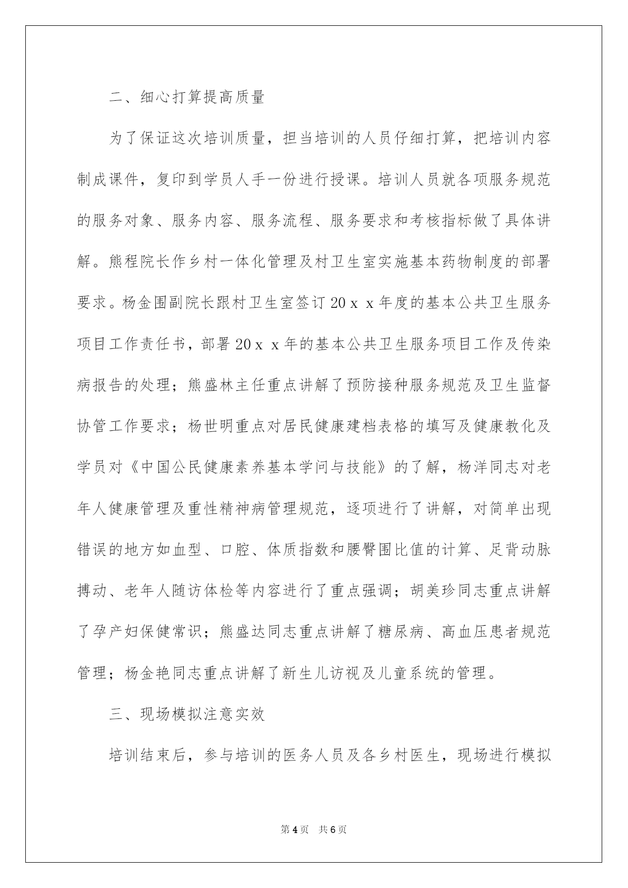 第PAGE\*Arabic\*MERGEFORMAT6页共NUMPAGES\*Arabic\*MERGEFORMAT6页第PAGE\*MERGEFORMAT6页共NUMPAGES\*MERGEFORMAT6页第PAGE\*MERGEFORMAT6页共NUMPAGES\*MERGEFORMAT6页第PAGE\*MERGEFORMAT6页共NUMPAGES\*MERGEFORMAT6页第PAGE\*MERGEFORMAT6页共NUMPAGES\*MERGEFORMAT6页第PAGE\*MERGEFORMAT6页共NUMPAGES\*MERGEFORMAT6页第PAGE\*MERGEFORMAT6页共NUMPAGES\*MERGEFORMAT6页第PAGE\*MERGEFORMAT6页共NUMPAGES\*MERGEFORMAT6页第PAGE\*MERGEFORMAT6页共NUMPAGES\*MERGEFORMAT6页第PAGE\*MERGEFORMAT6页共NUMPAGES\*MERGEFORMAT6页第PAGE\*MERGEFORMAT6页共NUMPAGES\*MERGEFORMAT6页2022基本公共卫生服务项目培训总结基本公共卫生服务项目培训总结总结是对某一阶段的工作、学习或思想中的阅历或状况进行分析探讨的书面材料,它可以提升我们发觉问题的实力,让我们好好写一份总结吧。总结你想好怎么写了吗?以下是我整理的基本公共卫生服务项目培训总结,希望能够帮助到大家。基本公共卫生服务项目培训总结1为了顺当实施国家基本公共卫生服务项目,完成我镇基本公共卫生服务项目居民建档管理信息系统的工作任务,提高服务实力和服务质量,我院于20xx年x月x日组织相关项目的有关医务人员及各卫生站负责人,就《国家基本公共卫生服务培训指导》、《国家基本公共卫生服务规范(20xx年版)》的内容进行了培训,现将培训状况总结如下:一、领导重视,全员培训为了保证这次培训效果,叶其兴院长召开班子专题会议,由温涛副院长负责组织实施,医院提前把培训日程及培训教材发放到负责相关项目的医务人员及各卫生站负责人,确保全部乡村医生都按时接受培训。二、细心打算,提高质量为了保证这次培训质量,担当培训的人员仔细打算,把培训内容制成课件,复印到学员人手一份进行授课。培训人员就各项服务规范的服务对象、服务内容、服务流程、服务要求和考核指标做了具体讲解。许冠文主任重点对居民健康建档表格的填写及老年人健康管理,逐项进行了讲解,对简单出现错误的地方如血型、口腔、体质指数和腰臀围比值的计算、足背动脉搏动、老年人随访体检等内容进行了重点强调;王荣主任重点讲解了健康教化及学员对《中国公民健康素养基本学问与技能》的了解;余日珍主任重点讲解了孕产妇保健常识;钟成祥主任重点讲解了糖尿病、高血压患者规范管理;黎法晓主任重点讲解了新生儿访视及儿童系统的管理和传染病报告的处理;罗荣展主任重点讲解了重性精神疾病患者管理服务规范。三、现场模拟注意实效培训结束后,参与培训的医院项目办医务人员及各乡村医生,现场进行模拟建档,相互为对方建一份合格健康档案。填表完成后,由授课人员逐人进行检查,对出现的问题进行针对性指导。通过这次培训,使全部乡村医生驾驭了国家基本公共卫生服务规范的内容,能够正确填写居民健康档案,为在我镇顺当实施基本公共卫生服务项目,更好地为广阔居民的健康供应服务奠定了良好的基础。基本公共卫生服务项目培训总结2为了顺当实施国家基本公共卫生服务项目和乡村一体化管理工作,按时按量完成我乡基本公共卫生服务项目及乡村一体化管理的工作任务,提高服务实力和服务质量及医改的各项实惠政策,让广阔人民群众的就医问题刚好得到解决。我院于20xx年4月9日至4月12日组织相关项目的有关医务人员及各卫生室工作人员,就《乡村一体化管理暨村卫生室实施基本药物制度材料汇编》、《国家基本公共卫生服务规范(20xx年版)》的内容进行了培训,现将培训状况总结如下:一、领导重视全员培训为了保证这次培训效果,熊程院长召开班子专题会议,由杨金围副院长负责组织实施,提前把培训日程及培训教材印制相关材料发放到负责相关项目的医务人员及各卫生室负责人,确保全部乡村医生都按时接受培训。二、细心打算提高质量为了保证这次培训质量,担当培训的人员仔细打算,把培训内容制成课件,复印到学员人手一份进行授课。培训人员就各项服务规范的服务对象、服务内容、服务流程、服务要求和考核指标做了具体讲解。熊程院长作乡村一体化管理及村卫生室实施基本药物制度的部署要求。杨金围副院长跟村卫生室签订20xx年度的基本公共卫生服务项目工作责任