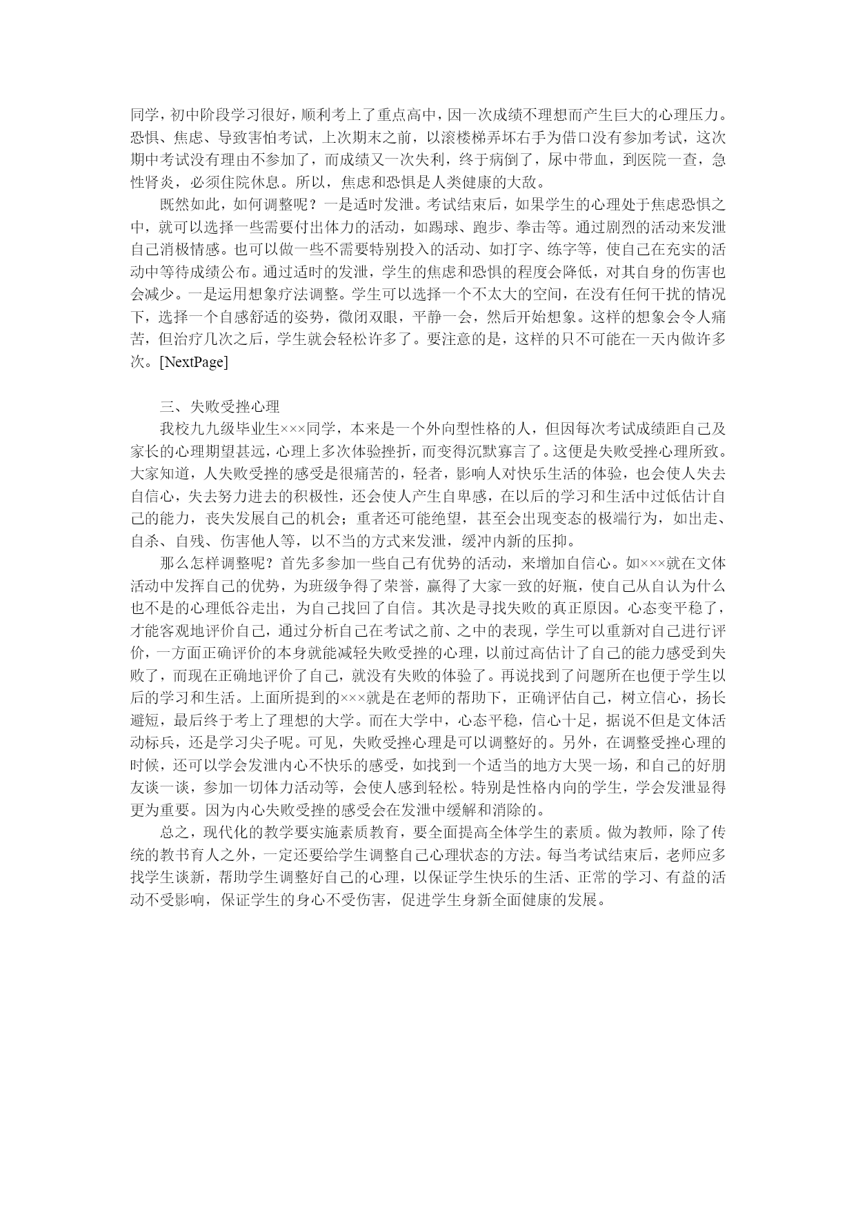 考试失利后的心理调整(转载)长宁中心英语组"考、考、考,老师的法宝;分、分、分,学生的命根。"直到全社会如此呼吁素质教育的今天,考试,还是学校生活的重头戏,而分数的高低则不可避免地决定了老师、学生、家长的喜怒哀乐。因此,参加了比较重大的考试尤其是期中考试之后,有相当一部分学生辉出现不良的心理反应,这些不良的心理反应不仅会使学生内心不安,影响他们正常的生活,还会影响他们的自信心,减少他们以后学习的动力;甚至还会使一些学生发生心理疾患,影响他们一生的正常发展。那么,及时地发现问题正确分析这些不良心理,并及时拿出调整措施,是对学生进行心理疏导和有合理性教育的必要前提。一、盲目乐观心理每次考试之后,总有一些学生自我感觉良好。不论谁询问他(她)考得如何,他(她)都会喜滋滋地告诉你"还行",我就经常遇到这样的学生。考试,我还真相信了他们的话。后来发现,远不是那么回事。而对于学生来说,如果他(她)认为自己考得很好,而真实的成绩公布之后,自己的成绩和别人相比显得较低,或低于自己原来的估计,此时学生的内心就会经历严重的心理挫折,原来乐观的心理就会被失败、痛苦、内疚所代替。这种痛苦的体验会使心理承受力低的学生失去自信心,产生自卑感,也会使学生心境处于消极的状态。仅我班的丛××同学为例,在期中考试前,应该说他比从前学习刻苦了,考试结束他对家长说:"超长常发挥,肯定比上学期期末成绩好",家长也满怀希望地等待着。结果成绩公布后,还是"外甥打灯笼--照舅(旧)",家长数落,同学白眼,自己沮丧,丛××思绪万千,"剪不断,理还乱",跑来眼泪婆娑,困惑的诉说;"为什么成绩和原来想象的相去甚远"???"今后怎么办"???,这种消极的作用越明显。既然盲目乐观心理的危害这样大,我们就得适时地帮助学生加以调整。一是客观地估计自己的成绩。切忌过高估计成绩,考试结束后,及时公布答案,和学生研究答案,询问研究学生的答题情况,让学生对自己的试卷认真的会议,然后作出客观的评价。二是参照上次成绩来估计。把自己估计的成绩与上次的车工机比较,一般情况下,不能过高或过低,因为成绩的提高不是一蹴而就的,需要有一个过程,正确认识自己的实力,从而对将面临的成绩有一个合理的期望。三是平时相近的同学比较。经验告诉我们,自己取得的成绩只有和与自己平时成绩相近的同学进行比较,才能真正知晓自己的成绩的意义,从而把自己的可能成绩放在恰当的位置。否则,就不会有一个客观的评价。二、焦虑恐惧心理许多老师都遇到过这中情况,刚考完试,老师们正在紧张地评卷,会不时地近来几个学生,羞怯地询问"卷子评完没有?""老师让我们先查查分数呗。"其实,有许多学生在参加了测试之后,急切地想知道自己的成绩,每日都在经受心理的折磨,每日都在紧张焦虑、苦苦等待中度过,这就是检测结束后的焦虑恐惧心理。焦虑恐惧心理的危害是非常大的。首先它对人的正常的心理活动有影响。因为处于焦虑恐惧中的学生,很难保持良好的学习状态,象我们期中考试后的学生上课注意力不集中、倦怠、消极,就属于这中情况。他(她)在异端时间内,可能会对什么事情都无兴趣,思维混乱,健忘等,如不及时加以疏导,会严重影响他们的学习和生活。其次是对人正常的胜利活动有危害。人处于焦虑恐惧状态时,某些生理技能会受到影响。如食欲减退、睡不着觉,身体健康受到影响,还会导致一切疾病的发生。如我们半的杨××同学,初中阶段学习很好,顺利考上了重点高中,因一次成绩不理想而产生巨大的心理压力。恐惧、焦虑、导致害怕考试,上次期末之前,以滚楼梯弄坏右手为借口没有参加考试,这次期中考试没有理由不参加了,而成绩又一次失利,终于病倒了,尿中带血,到医院一查,急性肾炎,必须住院休息。所以,焦虑和恐惧是人类健康的大敌。既然如此,如何调整呢?一是适时发泄。考试结束后,如果学生的心理处于焦虑恐惧之中,就可以选择一些需要付出体力的活动,如踢球、跑步、拳击等。通过剧烈的活动来发泄自己消极情感。也可以做一些不需要特别投入的活动、如打字、练字等,使自己在充实的活动中等待成绩公布。通过适时的发泄,学生的焦虑和恐惧的程度会降低,对其自身的伤害也会减少。一是运用想象疗法调整。学生可以选择一个不太大的空间,在没有任何干扰的情况下,选择一个自感舒适的姿势,微闭双眼,平静一会,然后开始想象。这样的想象会令人痛苦,但治疗几次之后,学生就会轻松许多了。要注意的是,这样的只不可能在一天内做许多次。[NextPage]三、失败受挫心理我校九九级毕业生×××同学,本来是一个外向型性格的人,但因每次考试成绩距自己及家长的心理期望甚远,心理上多次体验挫折,而变得沉默寡言了。这便是失败受挫心理所致。大家知道,人失败受挫的感受是很痛苦的,轻者,影响人对快乐生活的体验,也会使人失去自信心,失去努力进去的积极性,还会使人产生自卑感,在以后的学习和生活中过低估计