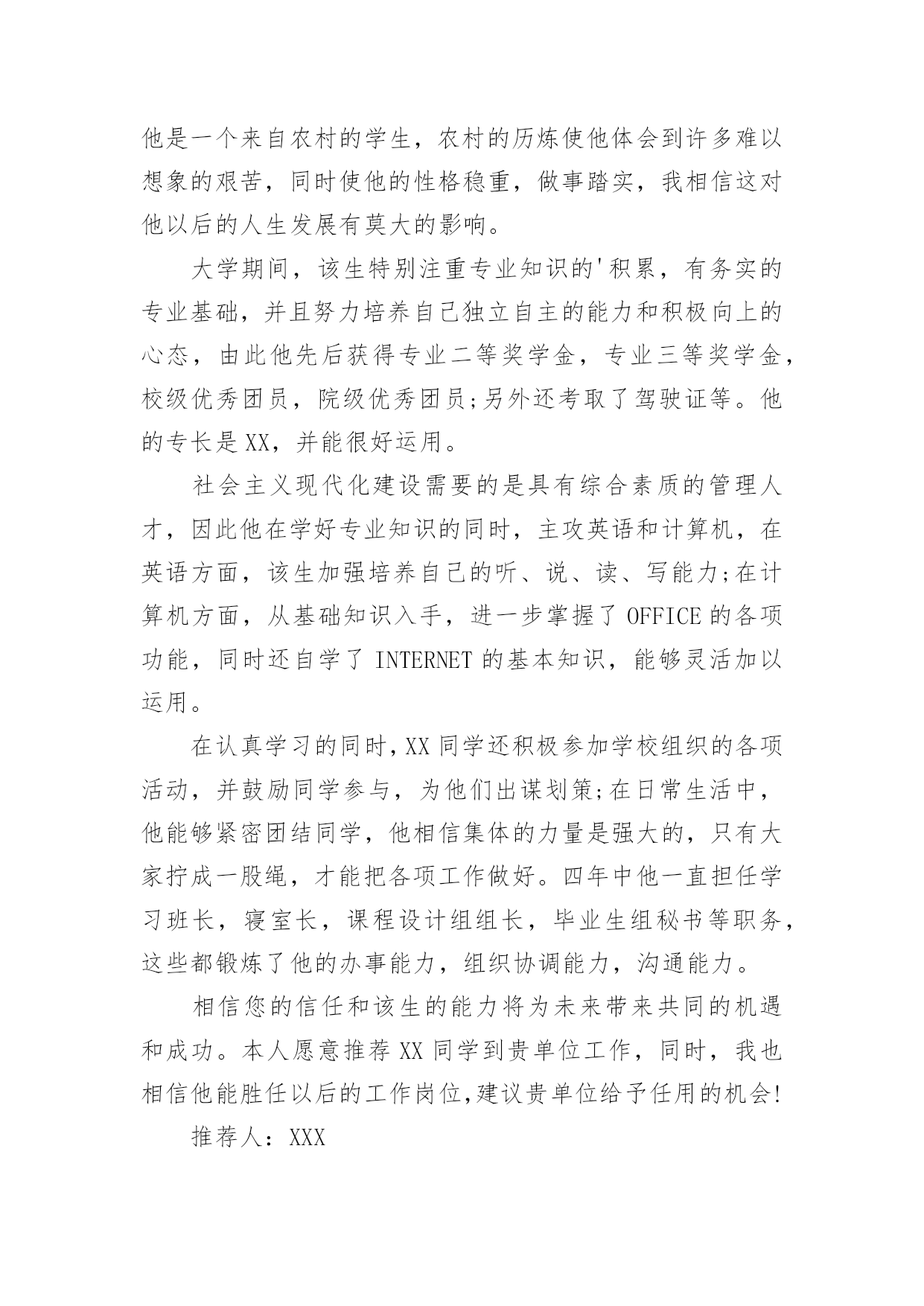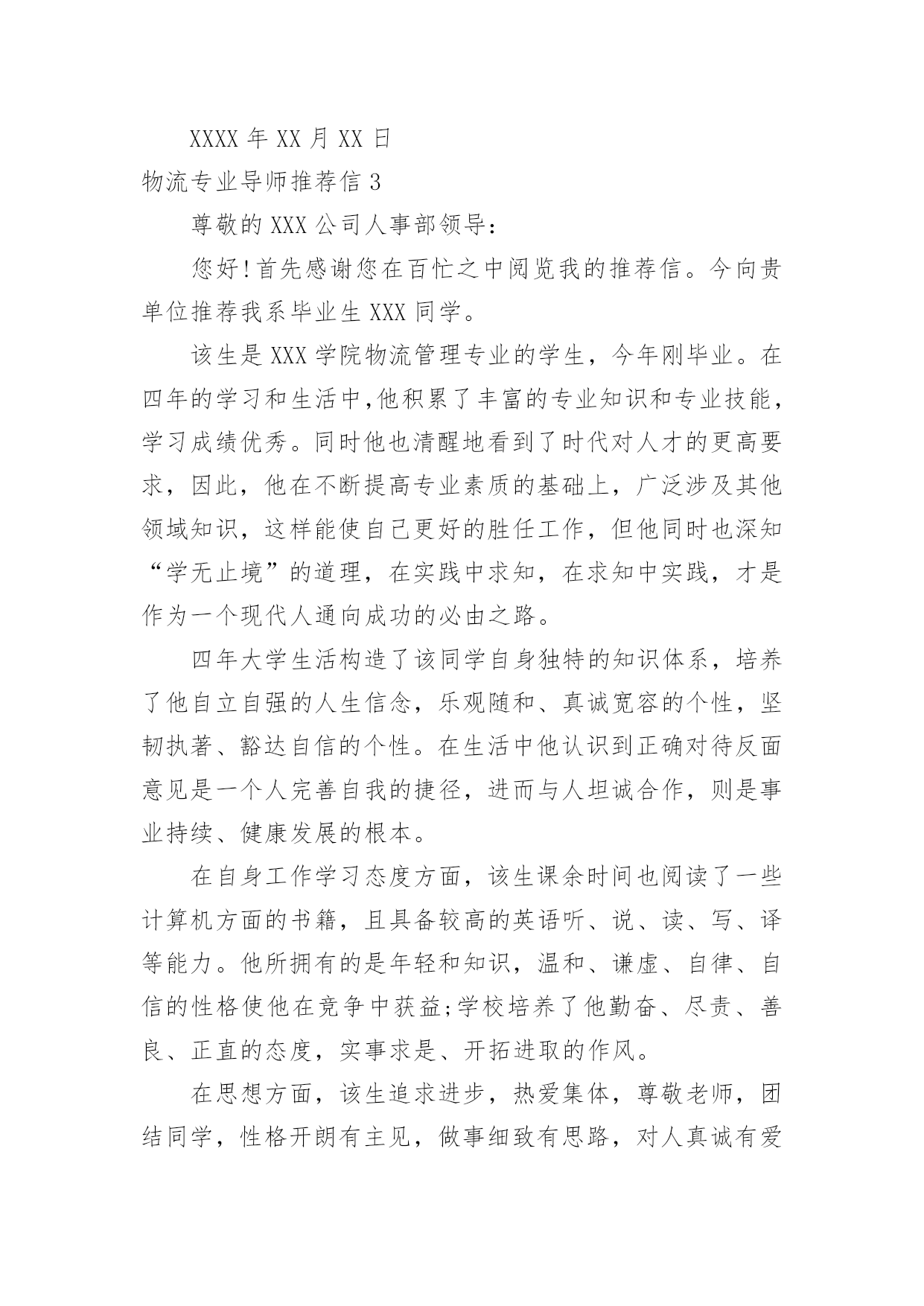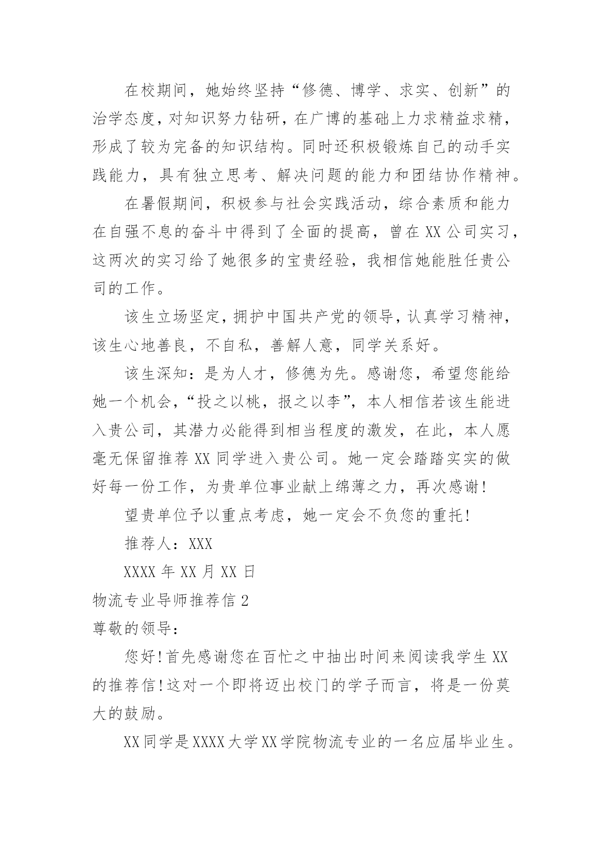 物流专业导师推荐信物流专业导师推荐信在我们平凡的日常里,推荐信对我们的作用越来越大,我们在写推荐信的时候需要使用一些基本的标准。写起推荐信来就毫无头绪?下面是小编整理的物流专业导师推荐信,仅供参考,大家一起来看看吧。物流专业导师推荐信1尊敬的领导:您好!今向贵单位推荐我系物流专业的毕业生XX同学。作为一名将结束学业步入社会的学生,该生有信心接受社会的考验和来自自身的挑战。从一踏入大学校门开始,她就注意加强综合素质的培养和综合能力的锻炼。在大学期间,抓住一切机会锻炼自己各方面的能力,使自己朝着现代社会所需要的具有创新精神的复合型人才发展。在专业上,几年来她努力学习专业知识,从各门课程的基础知识出发,努力掌握其基本技能技巧,深钻细研,寻求财务的重要性,并取得了良好的成绩,完整系统的掌握了基础知识理论。同时她还注重积极拓展知识面,辅修计算机专业,熟悉计算机操作,掌握了Photoshop等制图软件,以及WindowsOffice,等其他各种常用软件,熟练使用常见的财务软件。在校期间,她始终坚持“修德、博学、求实、创新”的治学态度,对知识努力钻研,在广博的基础上力求精益求精,形成了较为完备的知识结构。同时还积极锻炼自己的动手实践能力,具有独立思考、解决问题的能力和团结协作精神。在暑假期间,积极参与社会实践活动,综合素质和能力在自强不息的奋斗中得到了全面的提高,曾在XX公司实习,这两次的实习给了她很多的宝贵经验,我相信她能胜任贵公司的工作。该生立场坚定,拥护中国共产党的领导,认真学习精神,该生心地善良,不自私,善解人意,同学关系好。该生深知:是为人才,修德为先。感谢您,希望您能给她一个机会,“投之以桃,报之以李”,本人相信若该生能进入贵公司,其潜力必能得到相当程度的激发,在此,本人愿毫无保留推荐XX同学进入贵公司。她一定会踏踏实实的做好每一份工作,为贵单位事业献上绵薄之力,再次感谢!望贵单位予以重点考虑,她一定会不负您的重托!推荐人:XXXXXXX年XX月XX日物流专业导师推荐信2尊敬的领导:您好!首先感谢您在百忙之中抽出时间来阅读我学生XX的推荐信!这对一个即将迈出校门的学子而言,将是一份莫大的鼓励。XX同学是XXXX大学XX学院物流专业的一名应届毕业生。他是一个来自农村的学生,农村的历炼使他体会到许多难以想象的艰苦,同时使他的性格稳重,做事踏实,我相信这对他以后的人生发展有莫大的影响。大学期间,该生特别注重专业知识的'积累,有务实的专业基础,并且努力培养自己独立自主的能力和积极向上的心态,由此他先后获得专业二等奖学金,专业三等奖学金,校级优秀团员,院级优秀团员;另外还考取了驾驶证等。他的专长是XX,并能很好运用。社会主义现代化建设需要的是具有综合素质的管理人才,因此他在学好专业知识的同时,主攻英语和计算机,在英语方面,该生加强培养自己的听、说、读、写能力;在计算机方面,从基础知识入手,进一步掌握了OFFICE的各项功能,同时还自学了INTERNET的基本知识,能够灵活加以运用。在认真学习的同时,XX同学还积极参加学校组织的各项活动,并鼓励同学参与,为他们出谋划策;在日常生活中,他能够紧密团结同学,他相信集体的力量是强大的,只有大家拧成一股绳,才能把各项工作做好。四年中他一直担任学习班长,寝室长,课程设计组组长,毕业生组秘书等职务,这些都锻炼了他的办事能力,组织协调能力,沟通能力。相信您的信任和该生的能力将为未来带来共同的机遇和成功。本人愿意推荐XX同学到贵单位工作,同时,我也相信他能胜任以后的工作岗位,建议贵单位给予任用的机会!推荐人:XXXXXXX年XX月XX日物流专业导师推荐信3尊敬的XXX公司人事部领导:您好!首先感谢您在百忙之中阅览我的推荐信。今向贵单位推荐我系毕业生XXX同学。该生是XXX学院物流管理专业的学生,今年刚毕业。在四年的学习和生活中,他积累了丰富的专业知识和专业技能,学习成绩优秀。同时他也清醒地看到了时代对人才的更高要求,因此,他在不断提高专业素质的基础上,广泛涉及其他领域知识,这样能使自己更好的胜任工作,但他同时也深知“学无止境”的道理,在实践中求知,在求知中实践,才是作为一个现代人通向成功的必由之路。四年大学生活构造了该同学自身独特的知识体系,培养了他自立自强的人生信念,乐观随和、真诚宽容的个性,坚韧执著、豁达自信的个性。在生活中他认识到正确对待反面意见是一个人完善自我的捷径,进而与人坦诚合作,则是事业持续、健康发展的根本。在自身工作学习态度方面,该生课余时间也阅读了一些计算机方面的书籍,且具备较高的英语听、说、读、写、译等能力。他所拥有的是年轻和知识,温和、谦虚、自律、自信的性格使他在竞争中获益;学校培养了他勤奋、尽责、善良、正直的态度,实事求是、开拓进取的作风。在思想方面,该生追求进步,热爱集体,尊敬