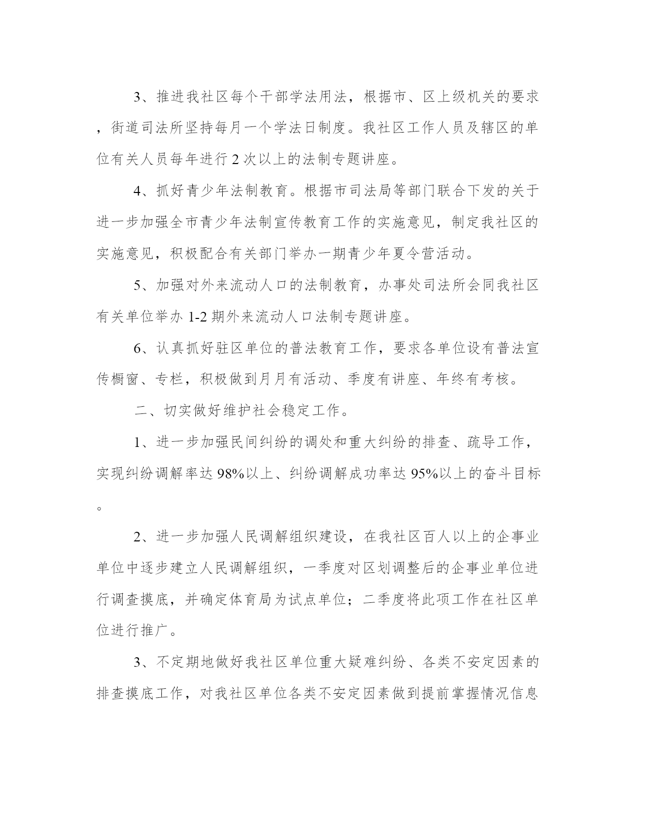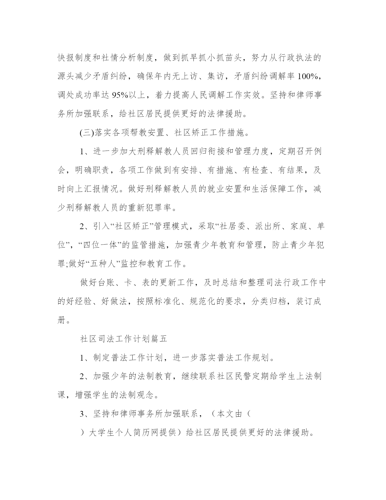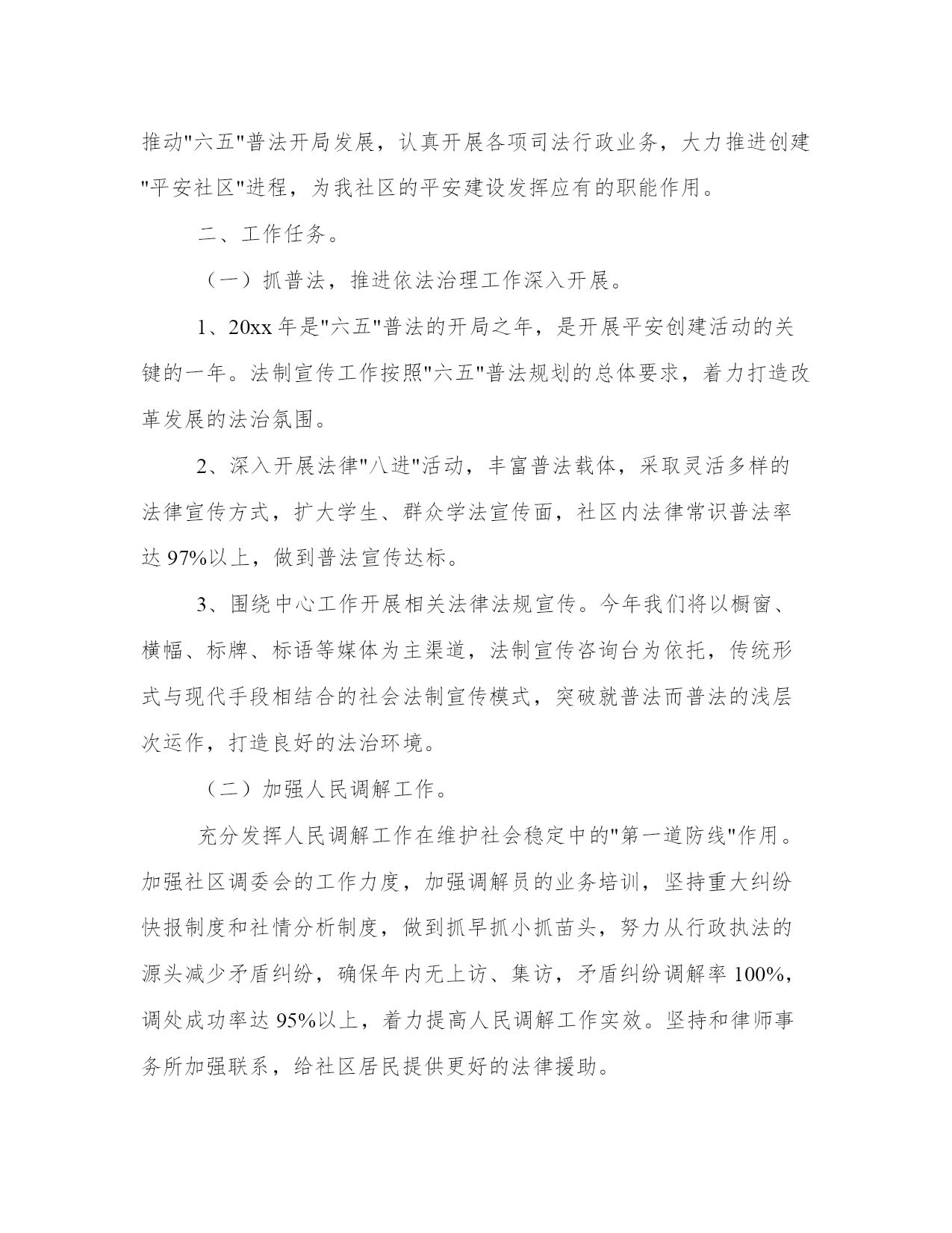 最新社区司法工作计划(优秀10篇)时间就如同白驹过隙般的流逝,我们的工作与生活又进入新的阶段,为了今后更好的发展,写一份计划,为接下来的学习做准备吧!那么我们该如何写一篇较为完美的计划呢?下面我帮大家找寻并整理了一些优秀的计划书范文,我们一起来了解一下吧。社区司法工作计划篇一使辖区内的居民群众法律、法制观念普遍加强,通过我一年的努力工作。知法、守法、用法的人更多了同时群众对居委会的工作变得理解、支持和信任,能有事就找组织和社区帮忙解决,不再意气用事了总而言之,辖区居民能安居乐业,邻里和睦相处,社区治安综合治理取得了阶段性的成果,这些成绩的取得,离不开大家的共同努力,特别是各级领导和正确指导和帮助以及群众的支持和配合。今后我有决心,有信心把辖区的社会稳定和法律宣传工作做得更好,决不辜负领导和群众的期望。继续联系社区民警定期给学生上法制课,2加强少年的法制教育。增强学生的法制观念。给社区居民提供更好的法律援助。3坚持和律师事务所加强联系。争取社会各界的支持和重视,4通过大力宣传安置帮教工作的重要性和紧迫性。使安置帮教工作落到实处,确保此项工作的顺利开展。文档为doc格式。社区司法工作计划篇二1、制定普法工作计划,进一步落实普法工作规划。2、加强少年的`法制教育,继续联系社区民警定期给学生上法制课,增强学生的法制观念。3、坚持和律师事务所加强联系,给社区居民提供更好的法律援助。4、通过大力宣传安置帮教工作的重要性和紧迫性,争取社会各界的支持和重视,使安置帮教工作落到实处,确保此项工作的顺利开展。5、加强民调工作能力,为搞好社区稳定工作继续努力。通过我们一年的努力工作,使辖区内的居民群众法律、法制观念普遍加强,知法、守法、用法的人更多了。同时群众对居委会的工作变得理解、支持和信任,能有事就找组织和社区帮忙解决,不再意气用事了。总而言之,我辖区居民能安居乐业,邻里和睦相处,社区治安综合治理取得了阶段性的成果,这些成绩的取得,离不开大家的共同努力,特别是各级领导和正确指导和帮助以及群众的支持和配合。今后我们有决心,有信心把辖区的社会稳定和法律宣传工作做得更好,决不辜负领导和群众的期望。社区司法工作计划篇三2、加强少年的法制教育,继续联系社区民警定期给学生上法制课,增强学生的法制观念。3、坚持和律师事务所加强联系,给社区居民提供更好的法律援助。4、通过大力宣传安置帮教工作的重要性和紧迫性,争取社会各界的支持和重视,使安置帮教工作落到实处,确保此项工作的顺利开展。5、加强民调工作能力,为搞好社区稳定工作继续努力。通过我们一年的努力工作,使辖区内的'居民群众法律、法制观念普遍加强,知法、守法、用法的人更多了。同时群众对居委会的工作变得理解、支持和信任,能有事就找组织和社区帮忙解决,不再意气用事了。总而言之,我辖区居民能安居乐业,邻里和睦相处,社区治安综合治理取得了阶段性的成果,这些成绩的取得,离不开大家的共同努力,特别是各级领导和正确指导和帮助以及群众的支持和配合。今后我们有决心,有信心把辖区的社会稳定和法律宣传工作做得更好,决不辜负领导和群众的期望。社区司法工作计划篇四为了做好20xx年社区司法行政工作,根据团结路片区管委会司法所的统一部署安排,制定本年度基层司法行政工作计划。以邓小平理论和“三个代表”重要思想为指导,认真落实党的十八大精神,以科学发展观为统领,大力加强基层依法治理,全面贯彻实施依法治国基本方略,紧紧围绕发展地方经济和维护社会稳定的主题,推动“六五”普法开局发展,认真开展各项司法行政业务,大力推进创建“平安社区”进程,为我社区的平安建设发挥应有的职能作用。(一)抓普法,推进依法治理工作深入开展。1、20xx年是“六五”普法的开局之年,是开展平安创建活动的关键的一年。法制宣传工作按照“六五”普法规划的总体要求,着力打造改革发展的法治氛围。2、深入开展法律“八进”活动,丰富普法载体,采取灵活多样的法律宣传方式,扩大学生、群众学法宣传面,社区内法律常识普法率达97%以上,做到普法宣传达标。3、围绕中心工作开展相关法律法规宣传。今年我们将以橱窗、横幅、标牌、标语等媒体为主渠道,法制宣传咨询台为依托,传统形式与现代手段相结合的社会法制宣传模式,突破就普法而普法的`浅层次运作,打造良好的法治环境。(二)加强人民调解工作。充分发挥人民调解工作在维护社会稳定中的“第一道防线”作用。加强社区调委会的工作力度,加强调解员的业务培训,坚持重大纠纷快报制度和社情分析制度,做到抓早抓小抓苗头,努力从行政执法的源头减少矛盾纠纷,确保年内无上访、集访,矛盾纠纷调解率100%,调处成功率达95%以上,着力提高人民调解工作实效。坚持和律师事务所加强联系,给社区居民提供更好的法律援助。(三)落