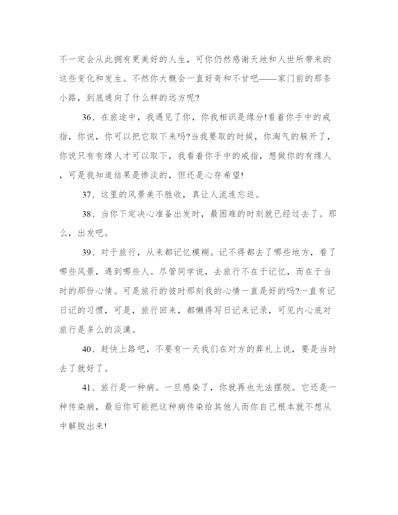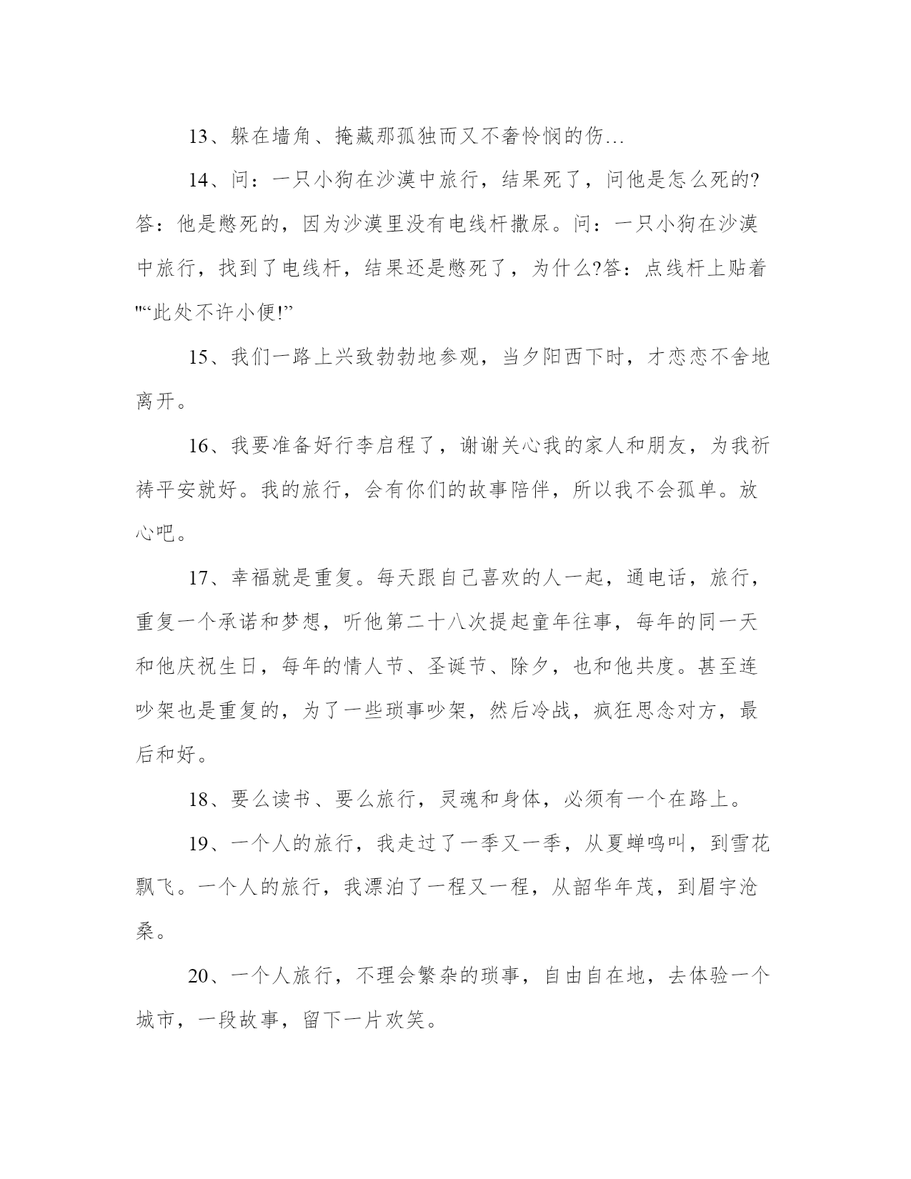 国庆旅游的唯美句子1、我们一直在旅行,一直在等待某个人可以成为我们旅途的伴侣,陪我们走过一段别人无法替代的记忆。在那里,有我们特有的记忆,亲情之忆、友谊之花、爱情之树、以及遗憾之泪!2、去了不同的地方,看了不同的风景,知道了不同的事,感悟了不同的人生。凌晨,随着滑轮接触地面,飞机一阵抖动,我终于说出了最后一句再见。3、梦想,并不奢侈,只要勇敢地迈出第一步。4、因为有梦,所以勇敢出发,选择出发,便只顾风雨兼程。5、旅游不在乎终点,而是在意途中的人和事还有那些美好的记忆和景色。6、如果你不出去走走,你就会以为这就是世界。7、生活是一段奇妙的旅行,就在那一去无返的火车上。与那些新人和旧人们共同经历吧!也许这就是一个人无法抗拒的命运,有你、有我、也有他。8、离开你的那一天开始,左心房渐渐停止跳动…9、当遗忘变成另一种开始,淡了回忆,痛最真实…10、放手后的微笑,只是用来掩盖疼痛的伤疤…11、什么天荒地老,什么至死不渝。都只是锦上添花的借口…12、怪天怪地,我都不会怪你,你有选择幸福的权利…13、躲在墙角、掩藏那孤独而又不奢怜悯的伤…14、问:一只小狗在沙漠中旅行,结果死了,问他是怎么死的?答:他是憋死的,因为沙漠里没有电线杆撒尿。问:一只小狗在沙漠中旅行,找到了电线杆,结果还是憋死了,为什么?答:点线杆上贴着"“此处不许小便!”15、我们一路上兴致勃勃地参观,当夕阳西下时,才恋恋不舍地离开。16、我要准备好行李启程了,谢谢关心我的家人和朋友,为我祈祷平安就好。我的旅行,会有你们的故事陪伴,所以我不会孤单。放心吧。17、幸福就是重复。每天跟自己喜欢的人一起,通电话,旅行,重复一个承诺和梦想,听他第二十八次提起童年往事,每年的同一天和他庆祝生日,每年的情人节、圣诞节、除夕,也和他共度。甚至连吵架也是重复的,为了一些琐事吵架,然后冷战,疯狂思念对方,最后和好。18、要么读书、要么旅行,灵魂和身体,必须有一个在路上。19、一个人的旅行,我走过了一季又一季,从夏蝉鸣叫,到雪花飘飞。一个人的旅行,我漂泊了一程又一程,从韶华年茂,到眉宇沧桑。20、一个人旅行,不理会繁杂的琐事,自由自在地,去体验一个城市,一段故事,留下一片欢笑。21、一个人行走,若是寂寞了,寻一座霓虹灯迷离闪烁,灯红酒绿的城市,登上楼顶,俯视万家灯火,在繁华中体会热闹;若是厌倦了喧嚣,寻一处宁静的幽谷,找寻隐藏在山间的纯净和那“鸟鸣山更幽”的飞鸟。22、一根弦若是绷得太紧,总有一天会断裂,一颗心若是禁锢得太久,总有一天会失去平衡,我们需要放飞心灵,让心翱翔在自由的天空。23、有时间,我们可以去爬山,去看日出,去散步,去欣赏大自然,去陌生的街角,去做一切我们曾经或现在也很想做的事情,可以有一个人陪着你,也可以你一个人,总之那一刻,你是自由的,不仅是身体上的自由,更重要的是心理上的完全自由和放松,你会发现,曾经以为很难做到的事情,其实只要你愿意,一切都可以变得很容易。24、再怎么风光明媚的自家山川,总有看腻的时候,不论何等荣华的身份,也会有想更换的念头。旅行,正好提供了这样一个机会,让我们从自身的禁锢中放心地飞出去,重新审视自己,找回自我,歇够了,再飞回来,继续面对自己的人生。我想,这就是旅行的真义吧。25、旅行,其实是需要具有一些流浪精神的,这种精神使人能在旅行中和大自然更加接近,悠然享受和大自然融合之乐。旅行,有一种苍凉,“浮云游子意,落日故人情”,孑然一身,隐入苍茫自然,自有一种孤独的意味;旅行,更有一种逍遥,浑然忘我,与大自然交融的境界令人心弛神往。26、旅行,只需要一颗安静的心和不停的脚步,不停地遇见,不停地思考,不停地流逝自己的思想,不停地更新自己的记忆。我是在旅行,孤独是自我,却思考着我的灵魂。27、旅行还在继续,这个过程是艰难而又孤单的。我提着行李,独自一人向远方走去,夕阳将我的身影拉得斜长,可我,仍在旅行的路上徘徊。等待着每一辆经过的车,让我走到更远的地方。28、偶尔为街头独特的风景驻足,偶尔因高山流水的美丽停留,偶尔被惊鸿一瞥的美丽吸引;或者走进一条深沉深沉的巷道,期待遇上一位撑着油纸伞,结着忧愁丁香一样的姑娘;或者在春暖花开时,看看花儿冲破北疆漫漫寒冬,妖娆绽放;或者在河边放下一盏写着心愿的河灯,祝愿一切安好。29、世俗的纷扰,生活的琐碎使人精疲力尽,黑夜下,撕开那张面具尽是怠倦的容颜,无神的瞳孔,我迫切想逃离这周遭被钢筋混凝土堆架的城市,停止每日在车水马龙的市井里忙碌的穿梭,可是,我却迈不开步伐,怎么也走不出那个圈……30、思念带着一种默默地忧伤,去追寻那飞翔的翅膀。落叶随风淡定了它漂泊的方向。勇气执著的背负起那厚重的行囊,奔向远方。从此便踏上征途,也许会孤独一程。不畏不惧,不言不弃,冲破风雨的阻隔,