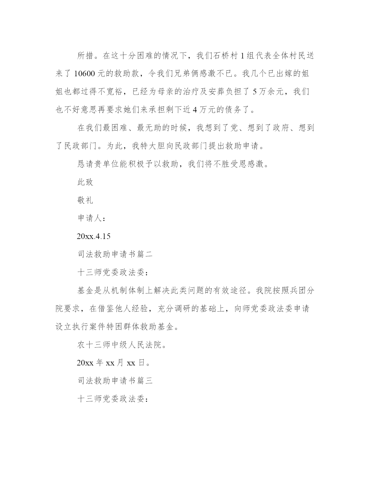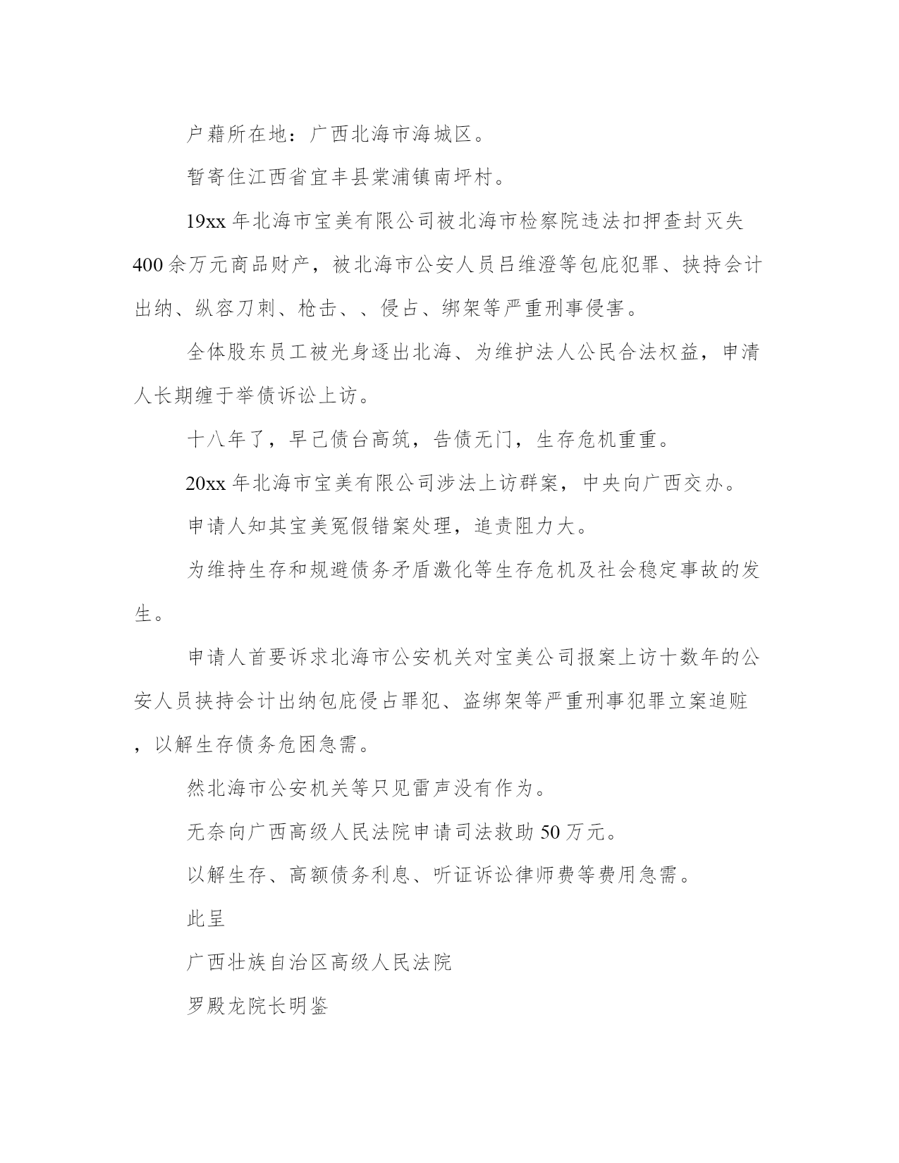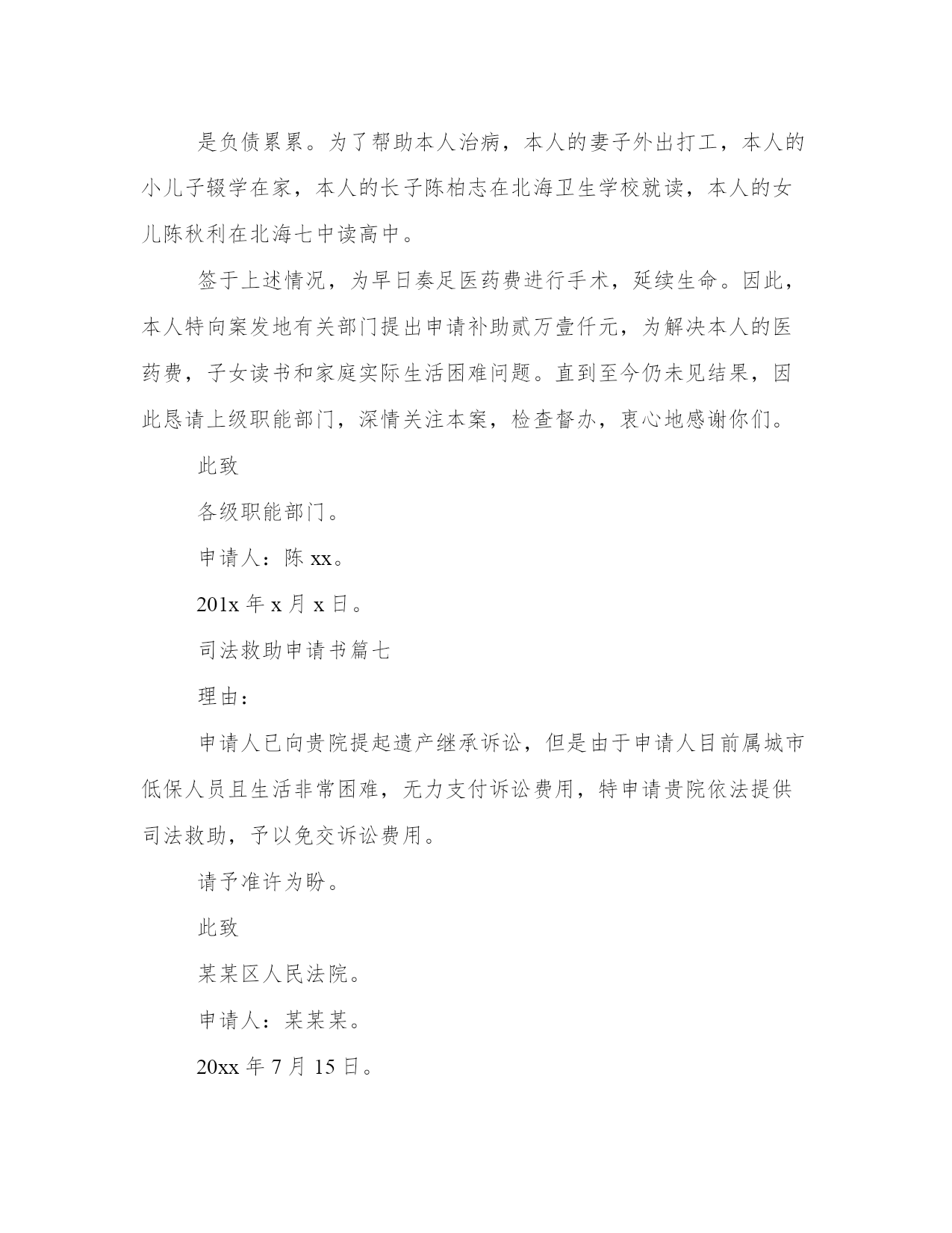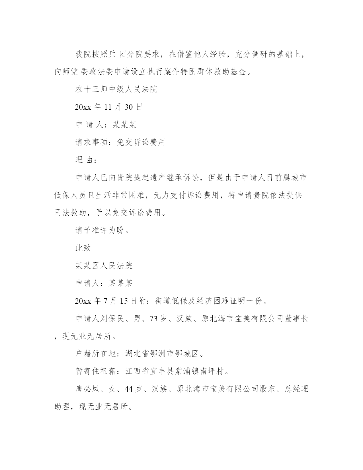 最新司法救助申请书(模板16篇)在日常的学习、工作、生活中,肯定对各类范文都很熟悉吧。范文怎么写才能发挥它最大的作用呢?下面是小编为大家收集的优秀范文,供大家参考借鉴,希望可以帮助到有需要的朋友。司法救助申请书篇一尊敬的民政相关部门领导:我叫xx,现年25岁,是咸宁市咸安区大幕乡石桥村村1组村民。我家原有3口人,母亲、我和弟弟。由于我和弟弟目前都没有成家,一直以来,我们家都是靠勤劳的母亲操持内外,我和弟弟陈超过早辍学、没有文化,只能常年在外靠打工勉强养活自己。20xx年3月21日,作为一家之主的'母亲在参加我们1组合作劳动时不慎摔倒,导致后脑勺摔碎。这对于本来拮据的家庭来说犹如晴天霹雳、雪上加霜。受伤后的母亲被紧急送往咸宁市人民医院救治,在医院立即进行了开颅手术,短短五天时间花费了8万余元,这对于原本拮据的家庭来说无疑是沉重的经济负担。20xx年3月25日终因病情严重,医治无效而返,于当天就依依不舍地抛开我们兄弟俩撒手人寰。在我几个已出嫁姐姐的大力支持下,我们又东拼西凑花了近3万元安葬了母亲。巨额的医疗费用、沉重的债务、加上母亲的离世,我们兄弟俩终日以泪洗面、不知所措。在这十分困难的情况下,我们石桥村1组代表全体村民送来了10600元的救助款,令我们兄弟俩感激不已。我几个已出嫁的姐姐也都过得不宽裕,已经为母亲的治疗及安葬负担了5万余元,我们也不好意思再要求她们来承担剩下近4万元的债务了。在我们最困难、最无助的时候,我想到了党、想到了政府、想到了民政部门。为此,我特大胆向民政部门提出救助申请。恳请贵单位能积极予以救助,我们将不胜受恩感激。此致敬礼申请人:20xx.4.15司法救助申请书篇二十三师党委政法委:基金是从机制体制上解决此类问题的有效途径。我院按照兵团分院要求,在借鉴他人经验,充分调研的基础上,向师党委政法委申请设立执行案件特困群体救助基金。农十三师中级人民法院。20xx年xx月xx日。司法救助申请书篇三十三师党委政法委:自20xx年以来,我师法院按照党委政法委和兵团分院的统一部署,先后两次积极开展清理执行积案活动,取得了显著成效,执行工作步入良性循环轨道。但是,执行难问题并未根本解决,仍有相当一部分案件因多种原因难以执行,特别是在执行标的较大的.刑事附带民事赔偿、交通事故损害赔偿、人身损害赔偿等案件中,遇到被执行人暂无财产或确无财产可供执行时,法院穷尽与案件相适应的执行措施后,只能中止或终结执行。申请人因其合法权益得不到实现对执行产生误解,迁怒于法院和社会,导致有的申请人四处上访、告状。影响了党在人民群众中的威信,损害了人民法院的形象,也牵制了人民法院执行机构大量的人力、物力,从而给社会带来了不安定因素。据统计我师两级三院现有确无财产可供执行案件45件,其中被执行人下落不明21件,被执行人无履行能力24件。为有效地缓解“执行难”所引发的矛盾,避免生活困难的申请人采取上访闹访等影响社会稳定的行为,体现我师党委亲民、利民的执政理念,彰显执政为民宗旨。根据有关文件精神和其他一些单位的经验,设立执行案件特困群体救助基金是从机制体制上解决此类问题的有效途径。我院按照兵团分院要求,在借鉴他人经验,充分调研的基础上,向师党委政法委申请设立执行案件特困群体救助基金。农十三师中级人民法院20xx年11月30日申请人:某某某请求事项:免交诉讼费用理由:申请人已向贵院提起遗产继承诉讼,但是由于申请人目前属城市低保人员且生活非常困难,无力支付诉讼费用,特申请贵院依法提供司法救助,予以免交诉讼费用。请予准许为盼。此致某某区人民法院申请人:某某某20xx年7月15日附:街道低保及经济困难证明一份。申请人刘保民、男、73岁、汉族、原北海市宝美有限公司董事长,现无业无居所。户藉所在地:湖北省鄂洲市鄂城区。暂寄住祖藉:江西省宜丰县棠浦镇南坪村。唐必凤、女、44岁、汉族、原北海市宝美有限公司股东、总经理助理,现无业无居所。户藉所在地:广西北海市海城区。暂寄住江西省宜丰县棠浦镇南坪村。19xx年北海市宝美有限公司被北海市检察院违法扣押查封灭失400余万元商品财产,被北海市公安人员吕维澄等包庇犯罪、挟持会计出纳、纵容刀刺、枪击、、侵占、绑架等严重刑事侵害。全体股东员工被光身逐出北海、为维护法人公民合法权益,申清人长期缠于举债诉讼上访。十八年了,早己债台高筑,告债无门,生存危机重重。20xx年北海市宝美有限公司涉法上访群案,中央向广西交办。申请人知其宝美冤假错案处理,追责阻力大。为维持生存和规避债务矛盾激化等生存危机及社会稳定事故的发生。申请人首要诉求北海市公安机关对宝美公司报案上访十数年的公安人员挟持会计出纳包庇侵占罪犯、盗绑架等严重刑事犯罪立案追赃,