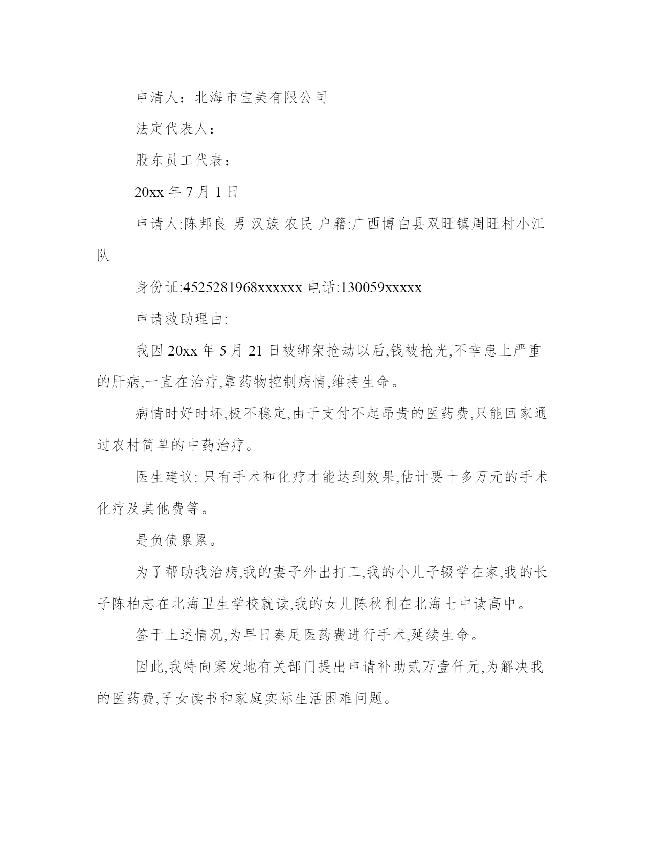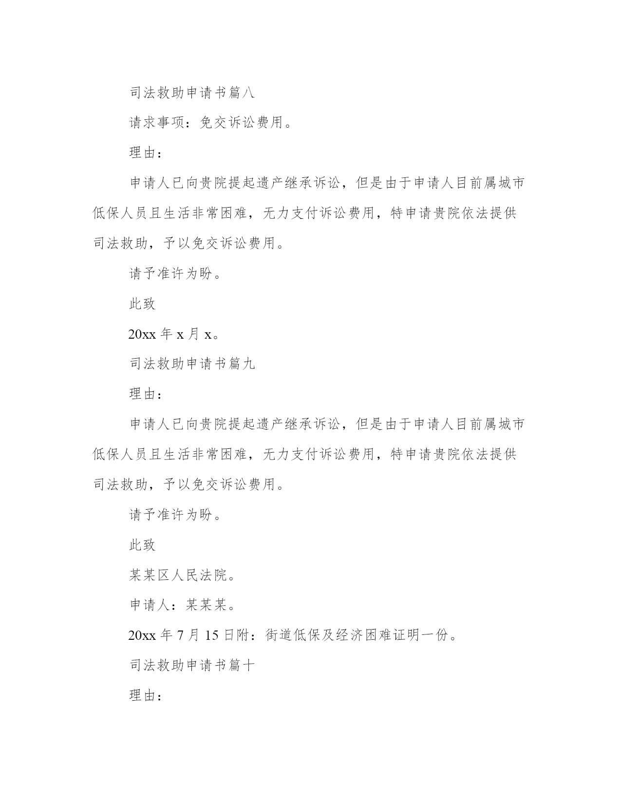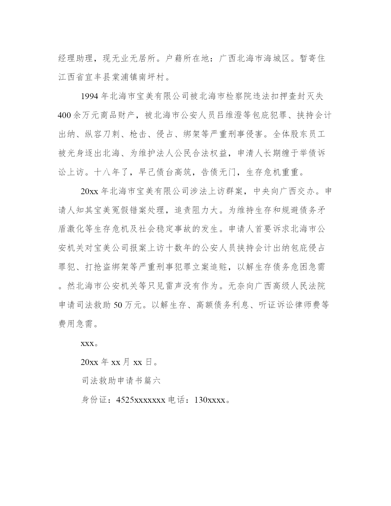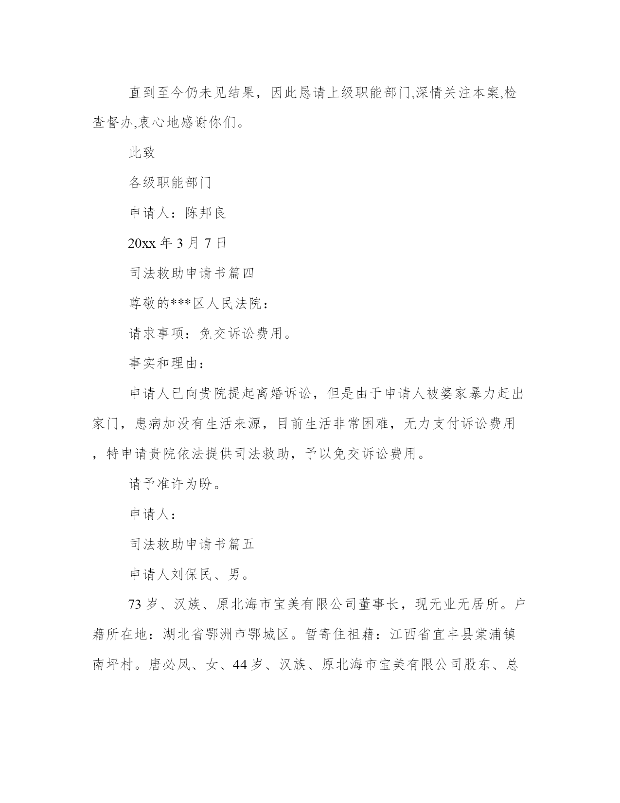 最新司法救助申请书(模板16篇)在日常的学习、工作、生活中,肯定对各类范文都很熟悉吧。范文怎么写才能发挥它最大的作用呢?下面是小编为大家收集的优秀范文,供大家参考借鉴,希望可以帮助到有需要的朋友。司法救助申请书篇一尊敬的民政相关部门领导:我叫xx,现年25岁,是咸宁市咸安区大幕乡石桥村村1组村民。我家原有3口人,母亲、我和弟弟。由于我和弟弟目前都没有成家,一直以来,我们家都是靠勤劳的母亲操持内外,我和弟弟陈超过早辍学、没有文化,只能常年在外靠打工勉强养活自己。20xx年3月21日,作为一家之主的'母亲在参加我们1组合作劳动时不慎摔倒,导致后脑勺摔碎。这对于本来拮据的家庭来说犹如晴天霹雳、雪上加霜。受伤后的母亲被紧急送往咸宁市人民医院救治,在医院立即进行了开颅手术,短短五天时间花费了8万余元,这对于原本拮据的家庭来说无疑是沉重的经济负担。20xx年3月25日终因病情严重,医治无效而返,于当天就依依不舍地抛开我们兄弟俩撒手人寰。在我几个已出嫁姐姐的大力支持下,我们又东拼西凑花了近3万元安葬了母亲。巨额的医疗费用、沉重的债务、加上母亲的离世,我们兄弟俩终日以泪洗面、不知所措。在这十分困难的情况下,我们石桥村1组代表全体村民送来了10600元的救助款,令我们兄弟俩感激不已。我几个已出嫁的姐姐也都过得不宽裕,已经为母亲的治疗及安葬负担了5万余元,我们也不好意思再要求她们来承担剩下近4万元的债务了。在我们最困难、最无助的时候,我想到了党、想到了政府、想到了民政部门。为此,我特大胆向民政部门提出救助申请。恳请贵单位能积极予以救助,我们将不胜受恩感激。此致敬礼申请人:20xx.4.15司法救助申请书篇二十三师党委政法委:基金是从机制体制上解决此类问题的有效途径。我院按照兵团分院要求,在借鉴他人经验,充分调研的基础上,向师党委政法委申请设立执行案件特困群体救助基金。农十三师中级人民法院。20xx年xx月xx日。司法救助申请书篇三十三师党委政法委:自20xx年以来,我师法院按照党委政法委和兵团分院的统一部署,先后两次积极开展清理执行积案活动,取得了显著成效,执行工作步入良性循环轨道。但是,执行难问题并未根本解决,仍有相当一部分案件因多种原因难以执行,特别是在执行标的较大的.刑事附带民事赔偿、交通事故损害赔偿、人身损害赔偿等案件中,遇到被执行人暂无财产或确无财产可供执行时,法院穷尽与案件相适应的执行措施后,只能中止或终结执行。申请人因其合法权益得不到实现对执行产生误解,迁怒于法院和社会,导致有的申请人四处上访、告状。影响了党在人民群众中的威信,损害了人民法院的形象,也牵制了人民法院执行机构大量的人力、物力,从而给社会带来了不安定因素。据统计我师两级三院现有确无财产可供执行案件45件,其中被执行人下落不明21件,被执行人无履行能力24件。为有效地缓解“执行难”所引发的矛盾,避免生活困难的申请人采取上访闹访等影响社会稳定的行为,体现我师党委亲民、利民的执政理念,彰显执政为民宗旨。根据有关文件精神和其他一些单位的经验,设立执行案件特困群体救助基金是从机制体制上解决此类问题的有效途径。我院按照兵团分院要求,在借鉴他人经验,充分调研的基础上,向师党委政法委申请设立执行案件特困群体救助基金。农十三师中级人民法院20xx年11月30日申请人:某某某请求事项:免交诉讼费用理由:申请人已向贵院提起遗产继承诉讼,但是由于申请人目前属城市低保人员且生活非常困难,无力支付诉讼费用,特申请贵院依法提供司法救助,予以免交诉讼费用。请予准许为盼。此致某某区人民法院申请人:某某某20xx年7月15日附:街道低保及经济困难证明一份。申请人刘保民、男、73岁、汉族、原北海市宝美有限公司董事长,现无业无居所。户藉所在地:湖北省鄂洲市鄂城区。暂寄住祖藉:江西省宜丰县棠浦镇南坪村。唐必凤、女、44岁、汉族、原北海市宝美有限公司股东、总经理助理,现无业无居所。户藉所在地:广西北海市海城区。暂寄住江西省宜丰县棠浦镇南坪村。19xx年北海市宝美有限公司被北海市检察院违法扣押查封灭失400余万元商品财产,被北海市公安人员吕维澄等包庇犯罪、挟持会计出纳、纵容刀刺、枪击、、侵占、绑架等严重刑事侵害。全体股东员工被光身逐出北海、为维护法人公民合法权益,申清人长期缠于举债诉讼上访。十八年了,早己债台高筑,告债无门,生存危机重重。20xx年北海市宝美有限公司涉法上访群案,中央向广西交办。申请人知其宝美冤假错案处理,追责阻力大。为维持生存和规避债务矛盾激化等生存危机及社会稳定事故的发生。申请人首要诉求北海市公安机关对宝美公司报案上访十数年的公安人员挟持会计出纳包庇侵占罪犯、盗绑架等严重刑事犯罪立案追赃,