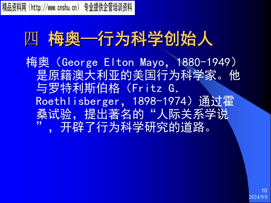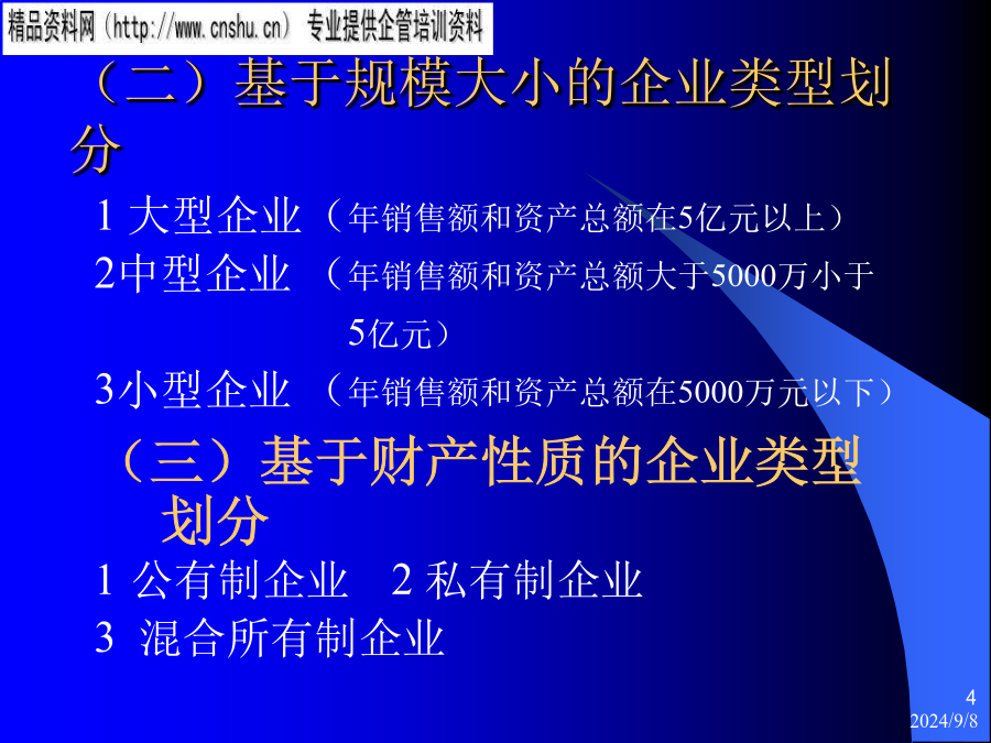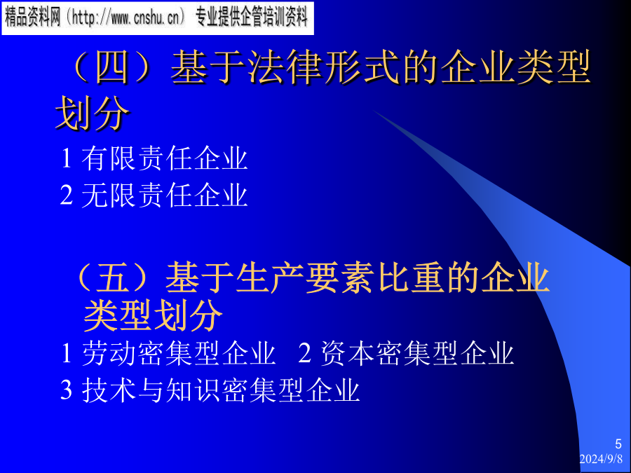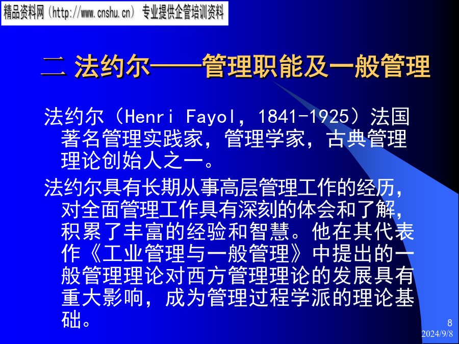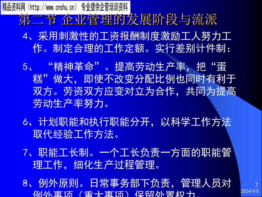 现代企业管理讲义第一章企业管理导论二企业类型的主要划分方法(二)基于规模大小的企业类型划分(四)基于法律形式的企业类型划分第二节企业管理的发展阶段与流派第二节企业管理的发展阶段与流派二法约尔——管理职能及一般管理三马克斯·韦伯—组织理论之父四梅奥—行为科学创始人五霍桑试验工人是社会人工厂的工人不是单纯追求金钱和物质收入的“经济人”,他们还有心理上和社会方面的感情需要,是“社会人”。他们有诸如友情、安全感、归属感等方面的需要。试验中比起照明程度的变化来,工人受重视的感觉更能调动工作的积极性。管理过程中要重视工人作为社会人的需要。企业中存在非正式组织由非正式的接触和感情纽带联结在一起,企业中存在非正式组织。非正式组织有自己的行为规范,很多时候与管理者的正式规定相冲突,影响劳动生产率。管理者要善于利用非正式组织的作用,不能只重视正式组织的作用。既要有科学管理、理性分析能力,也要通晓人性,重视人际关系协调。第三节企业环境管理在市场经济条件下,企业与环境最基本的关系是交换关系。企业与资本市场、劳动力市场、原材料和设备市场、商品销售市场的交换关系构成企业与环境关系的主要部分。此外,企业与政府之间本质上也是一种交换关系。是一种特殊的关系。竞争者是唯一不与企业发生交换关系,但又与企业行为有较强相关性的对象。因此,企业与环境的关系可概括为:1、总体上的交换关系;2、与政府的特殊交换关系;3、竞争者的竞争关系。二、目前情况下中国企业与环境的关系我国的企业有自己的特殊性,特别是在由传统的计划经济体制向市场经济体制过渡的背景下,市场环境变化频繁,难以把握,处理好企业与环境之间的关系具有更为重要的现实意义。第三节企业形态与现代企业制度3无限责任公司是指由两个以上负无限责任的股东出资组成的公司。其主要特点是股东以各自的出资比例参与利润分配,并对公司的债务负无限清偿和连带清偿责任。一旦公司资产不足以抵补债务时,全体股东或部分股东以个人财产清偿全部债务。4有限责任公司是指由两个以上股东共同出资每个股东以其所认缴的出资额对公司承担有限责任,公司以其全部资产对其债务承担责任的企业法人。5子公司是指受集团公司或母公司控制但在法律上独立的法人企业。子公司不是母公司本身的一个组成部分或分支机构;已有自己的公司名称和董事会,有独立的法人财产并以此承担有没责任,可以以自己的名义从事各种业务活动和民事诉讼活动。母公司通过股权对于公司的经营方向和主要负责负责人的任免进行控制。6分公司分公司是母公司的分支机构或附属机构,在法律上和经济上均无独立性,不是独立的法人企业。二私营企业的特点(6)企业经营的统一性,弹性及创造性。大企业发展到一定程度后,容易产生官僚化,经营上缺乏统一性,弹性和灵活性。中小企业由于上述个人支配,两权合一,个人中心等特点,个人作出反应快,决策快,执行迅速,弹性,创造性及灵活性强。(7)人际关系色彩浓。由于人员少,平时接触频繁,容易相互理解,增进感情,相互信任,相互配合,信息沟通快,人际关系好,有利于激发和调动员工工作积极性。(8)资本调剂能力低。根据上述中小企业特征可以看出中小企业适于活动的范畴。这就是易于发挥个人能力,经营的自主性强的领域;适合于适度规模经营的事业;适合于手工业和不适合于大批量生产的行业;需求量小且需求品种多种多样的产品;不需要太大资本投入的项目;易于发挥人的创造性的活动。三现代企业制度的特征第二章技术引进与技术创新(3)技术协助(4)工程承包(5)合作生产(6)国际合作经营与合资经营(39页)(7)特许经营(三)技术引进的程序1询价2报价3还价4接受5签约(第40—41页)(四)引进技术的选择1技术的先进性2技术的经济性3技术的适用性二技术引进项目的可行性研究()1投资机会研究和初步可行性研究2详细可行性研究3编制可行性研究报告4评价与决策三技术的价格与支付方式(一)技术价格的计价原则和方法1利润分成原则技术价格=LSLP(%)×受方利润2提成提成率=提成费/产品销售收入(二)技术价格的支付方式()1总付2提成支付3入门费加提成支付4支付货币与支付时间第二节工业产权的确立与保护(1)新颖性(2)创造性(3)实用性2专利的种类(1)发明专利(2)实用新型专利(3)外观设计专利(三)专利的申请和保护()1专利的申请2专利的保护三商标(一)商标的概念()(二)商标的种类和作用制造商标商业商标服务商标作用:1识别商品的标志2国家对产品质量管理的主要手段3提高商品竞争力的重要手段(三)商标的注册及其有效期1先使用原则2先注册原则3无异议原则有效期最长可达30年,最短的为五年,一般为10—15年不等四专有技术()1专有技