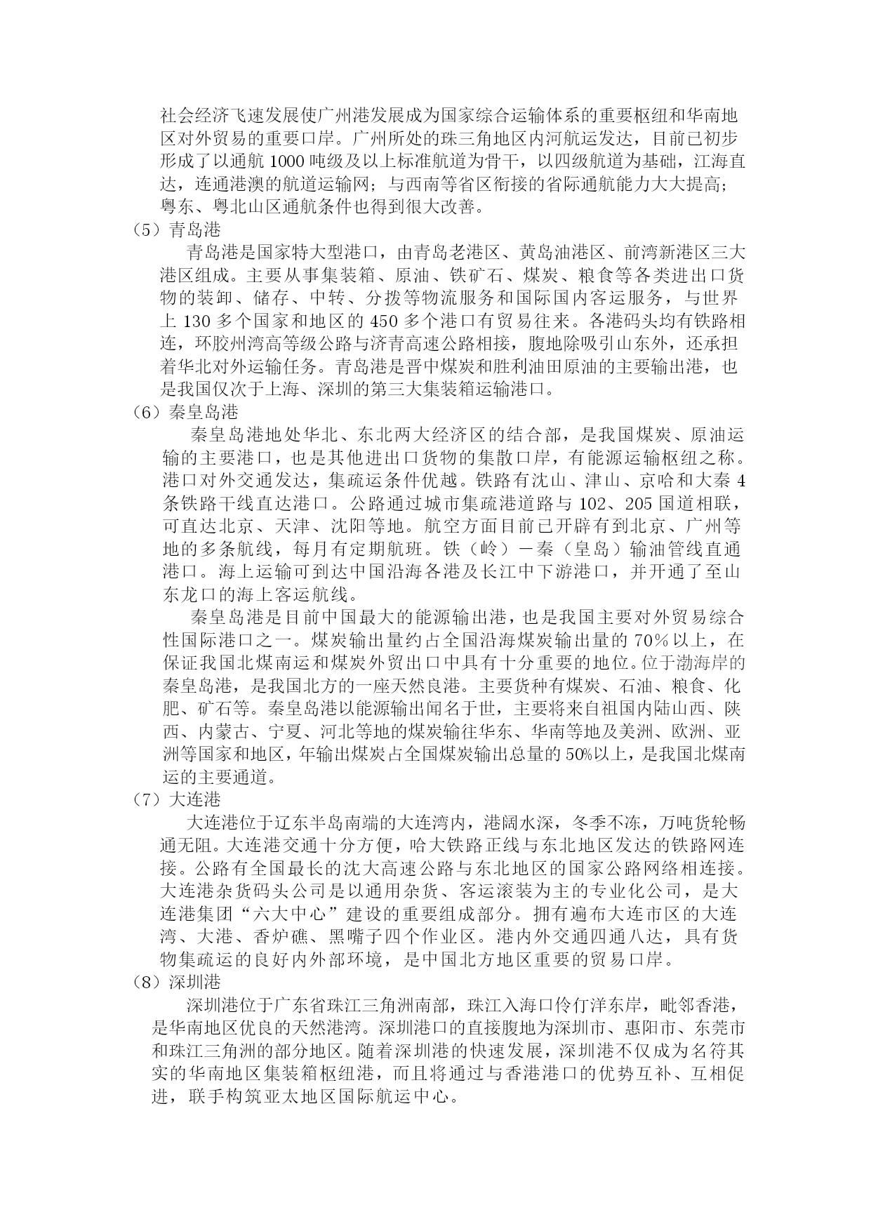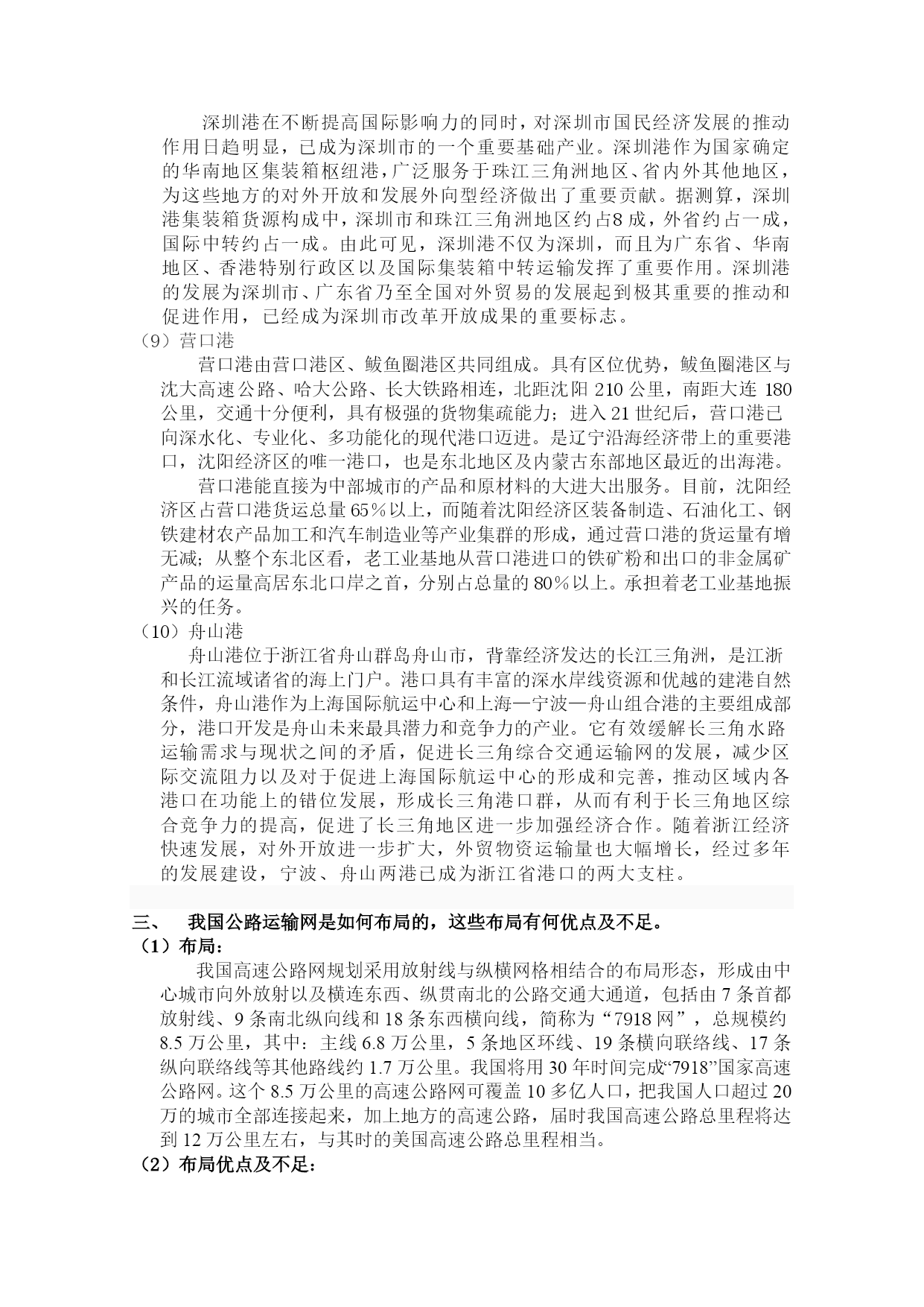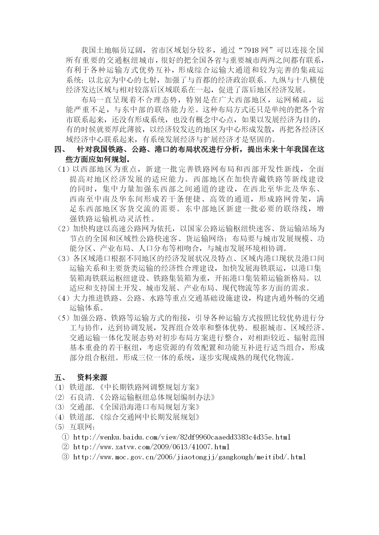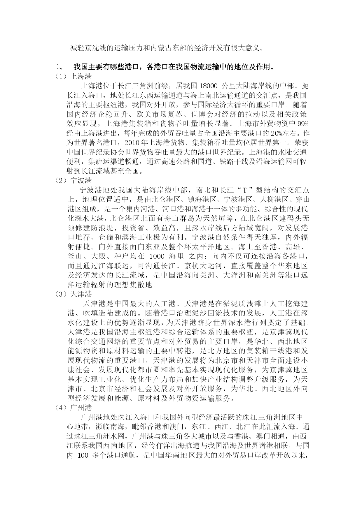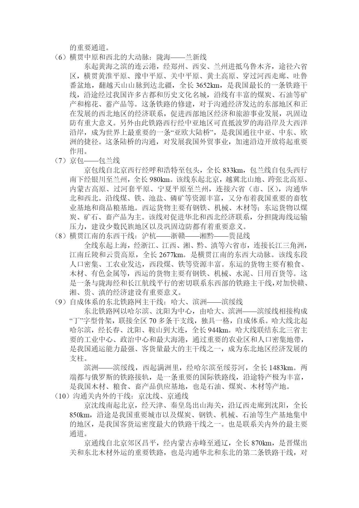 《现代物流技术与装备》作业我国有哪些主要铁路干线,简要概述这些主要铁路干线的主要特点及沿途经过的省市。我国现已形成一个以北京为中心的全国铁路网,根据其发挥作用和地理位置分布的不同,可大致分为能源运输干线、南北铁路干线、华东地区干线、西北地区干线、西南地区干线和东北地区干线。主要铁路干线情况如下:(1)南北交通的中枢:京广线从北京南下经石家庄、郑州、武汉、长沙直达祖国南大门广州。沿途纵贯六省市,跨越五大流域,途经华北平原、两湖平原、江南丘陵,穿越南岭山地,连接珠江三角洲,沿线人中稠密、物产富饶、经济发达、城镇密布、运输十分繁忙。南运货物主要有煤炭、钢铁、木材及出口物资,北运货物主要有稻米、有色金属及进口物资。沟通了华北、华中与华南,我国铁路网的中轴线,运量最大的南北大动脉。(2)东西沿海地区交通大动脉:京沪线京沪线始于北京,经天津、济南、徐州、南京直抵我国最大城市上海。贯穿京、津、沪三个直辖市和冀、鲁、苏、皖四省,跨越四大水系,连接华北平原、江淮平原和长江三角洲。京沪线北接京沈线,南接沪杭。京沪线沿线地势低平、人口稠密、城镇众多、煤炭资源丰富、经济发达,是我国重要的工农业生产基地。南运的货物主要是煤炭、钢铁、木材、棉花等;北运货物主要有机械、仪表、百货等。沟通了华北与华东,是东部沿海地区的交通大动脉。(3)纵贯南北的第二大交通中枢:北同蒲——太焦——焦柳全线北起山西大同、经太原、焦作、枝城达柳州。基本上与京广线平行。沿线经过五省(区),跨越三大流域,纵贯黄土高原、豫西山地、江汉平原、湘西山地和两广丘陵。全长2395km,沿线盛产粮、棉、油、烟叶等农副产品及煤、有色金属等矿产,该线对改善我国铁路布局,提高晋煤外运能力,分流京广运量,都具有重要作用。改善铁路布局,提高晋煤南运能力,分担京广线运量。(4)纵贯南北的第三大交通中枢:京九线京九线始于北京,以天津、河北、山东、河南、安徽、湖北、江西、广东直抵香港九龙。全长2538km,沿线跨越海河、黄河、淮河、长江、珠江五大水系,纵贯华北平原、鄱阳湖平原、大别山、井冈山、两广丘陵。沿线地区不仅是我国粮棉油等农副产品的重要产区,也是矿产资源、旅游资源非常丰富的地区。该线对促进沿线经济的发展,维持香港的长期稳定的繁荣,都是有重要作用。(5)纵贯西南地区的南北干线:宝成——成昆线北起宝鸡,翻越秦岭、大巴山,穿越川西平原、飞越岷江,横跨金沙江,到达昆明,全长1754km,沿途多崇山峻岭、急流险滩,有许多“地下铁路、空中车站”。成昆铁路桥、隧道总长度占线路总长度的40%,工程之艰巨为世界铁路建筑史上所罕见。该线在宝鸡与陇海线衔接,在成都与成渝线相接。沿线是我国特产丰富的多民族聚居地区,蕴藏着丰富的矿产资源和森林资源,铁路的建成促进了西南地区经济建设,加强了民族团结,也是连接西北地区的重要通道。(6)横贯中原和西北的大动脉:陇海——兰新线东起黄海之滨的连云港,经郑州、西安、兰州进抵乌鲁木齐,途径六省区,横贯黄淮平原、豫中平原、关中平原、黄土高原、穿过河西走廊、吐鲁番盆地,翻越天山山脉到达北疆,全长3652km,是我国最长的一条铁路干线,沿途经过我国许多古都和历史文化名城,沿线有丰富的煤炭、石油等矿产和棉花、蓄产品等。这条铁路的修建,对于沟通经济发达的东部地区和正在发展的西北地区的经济联系,促进西部地区经济和旅游事业发展,巩固边防有重大意义。另外由此铁路西行经中亚地区可直抵波罗的海沿岸及大西洋沿岸,成为世界上最重要的一条“亚欧大陆桥”,是我国通往中亚、中东、欧洲的捷径。这条陆桥的沟通,对发展我国外贸事业,加速沿边开放将起重要作用。(7)京包——包兰线京包线自北京西行经呼和浩特至包头,全长833km,包兰线自包头西行南下经银川至兰州,全长980km。该线东起北京,越冀北山地、跨张北高原、内蒙古高原、过河套平原、宁夏平原至兰州,连接六省(市、区),沟通华北和西北。沿线煤、铁、池盐、磷矿等资源丰富,又分布着我国重要的畜牧业基地和商品粮基地。西运货物主要有钢铁、机械、木材等;东运货物以煤炭、矿石、畜产品为主。该线对促进华北和西北经济联系,分担陇海线运输压力,建设少数民族地区以及巩固边防都有着重要意义。(8)横贯江南的东西干线:沪杭——浙赣——湘黔——贵昆线全线东起上海,经浙江、江西、湘、黔、滇等六省市,连接长江三角洲,江南丘陵和云贵高原,全长2677km。是横贯江南的东西大动脉。该线东段人口密集、工农业发达,西段煤、铁等资源丰富。东运的货物主要有粮食、木材、有色金属等,西运的货物主要有钢铁、机械、水泥、日用百货等。这是一条与陇海经和长江航线平行的密切联系东西部的铁路主干线,对加快赣、湘、贵、滇的经济建设有重要意义。(9)自成体系的东北铁路网主干线:哈大、滨洲——滨绥线东