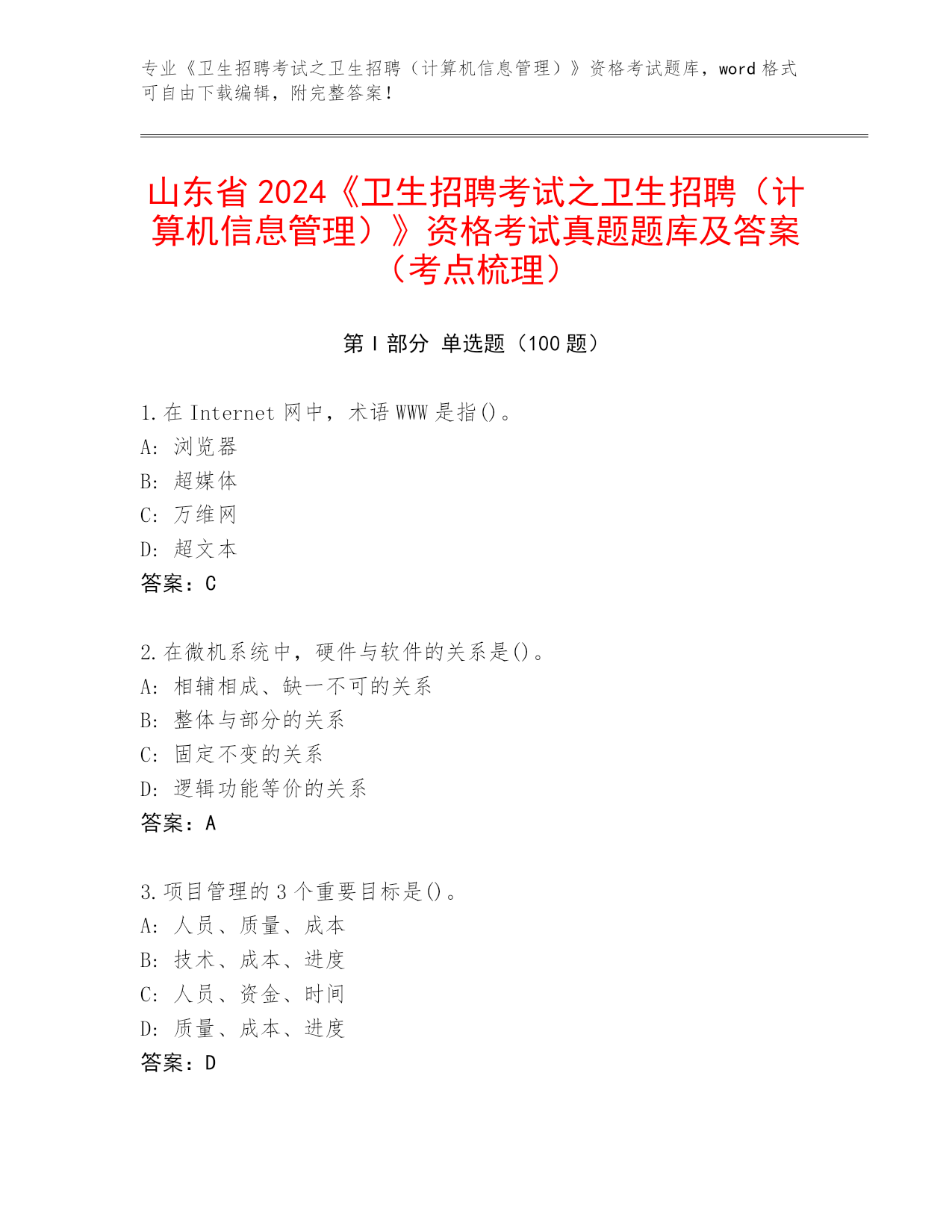 山东省2024《卫生招聘考试之卫生招聘(计算机信息管理)》资格考试真题题库及答案(考点梳理)