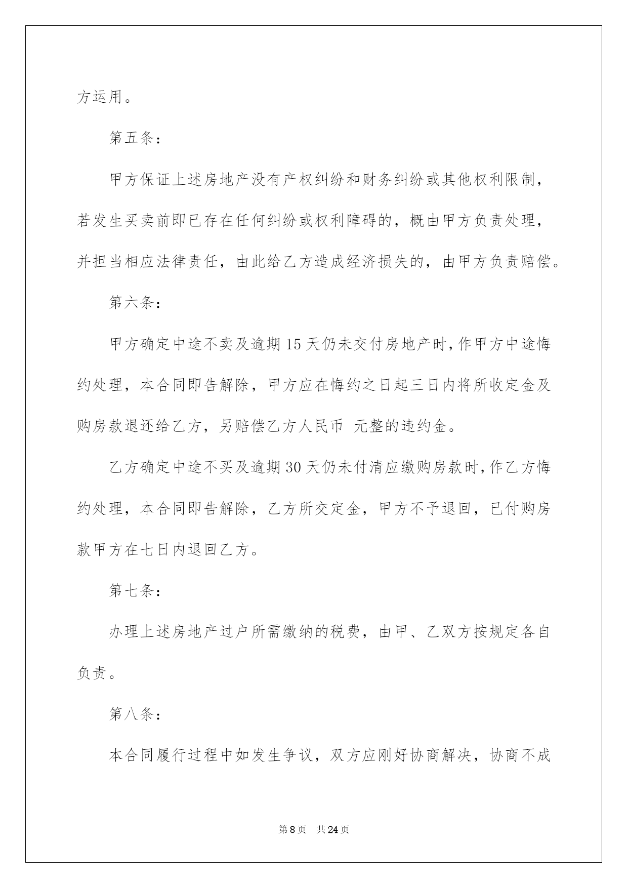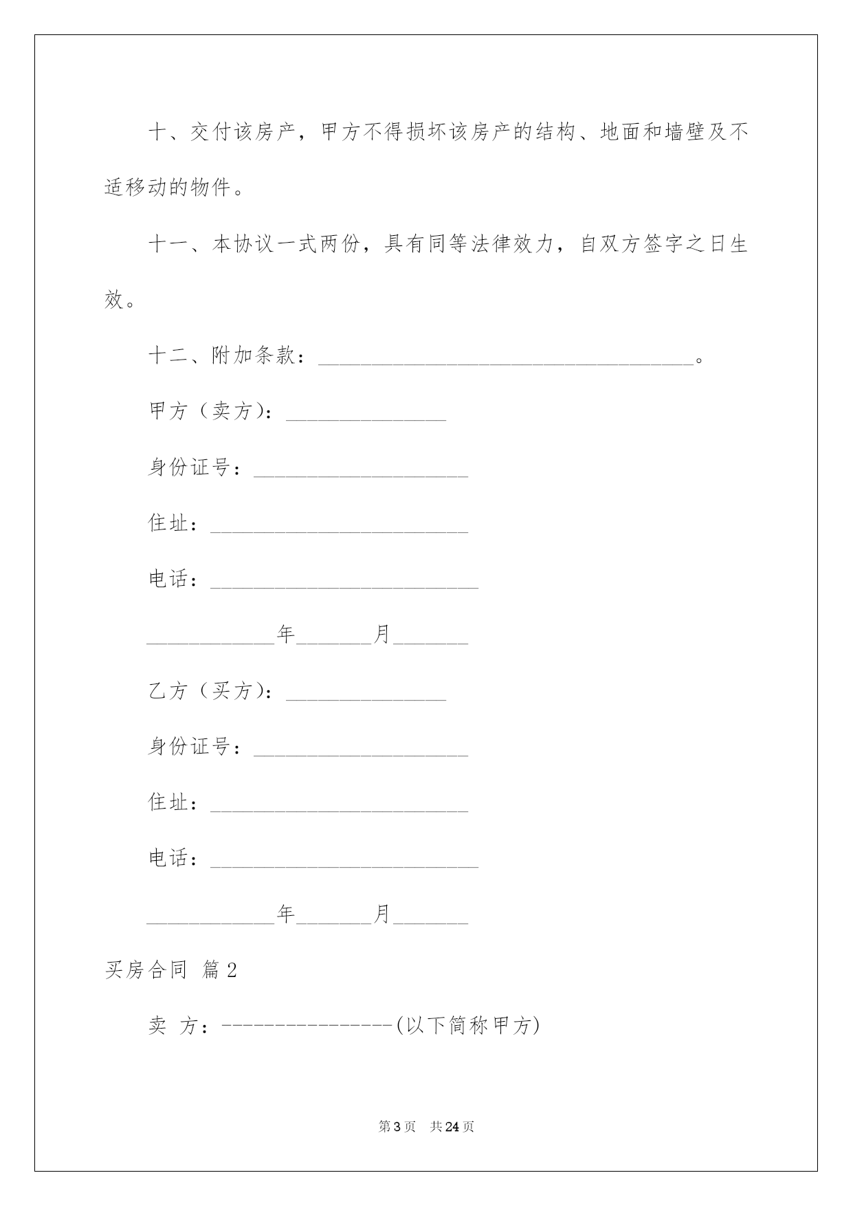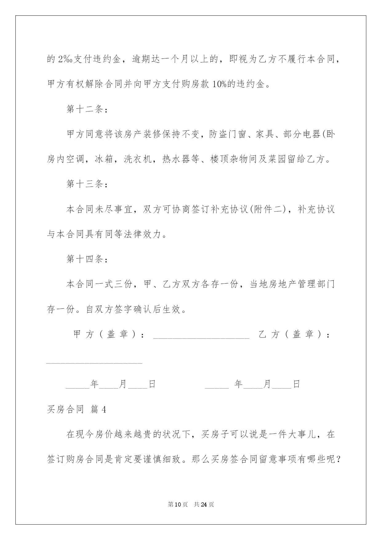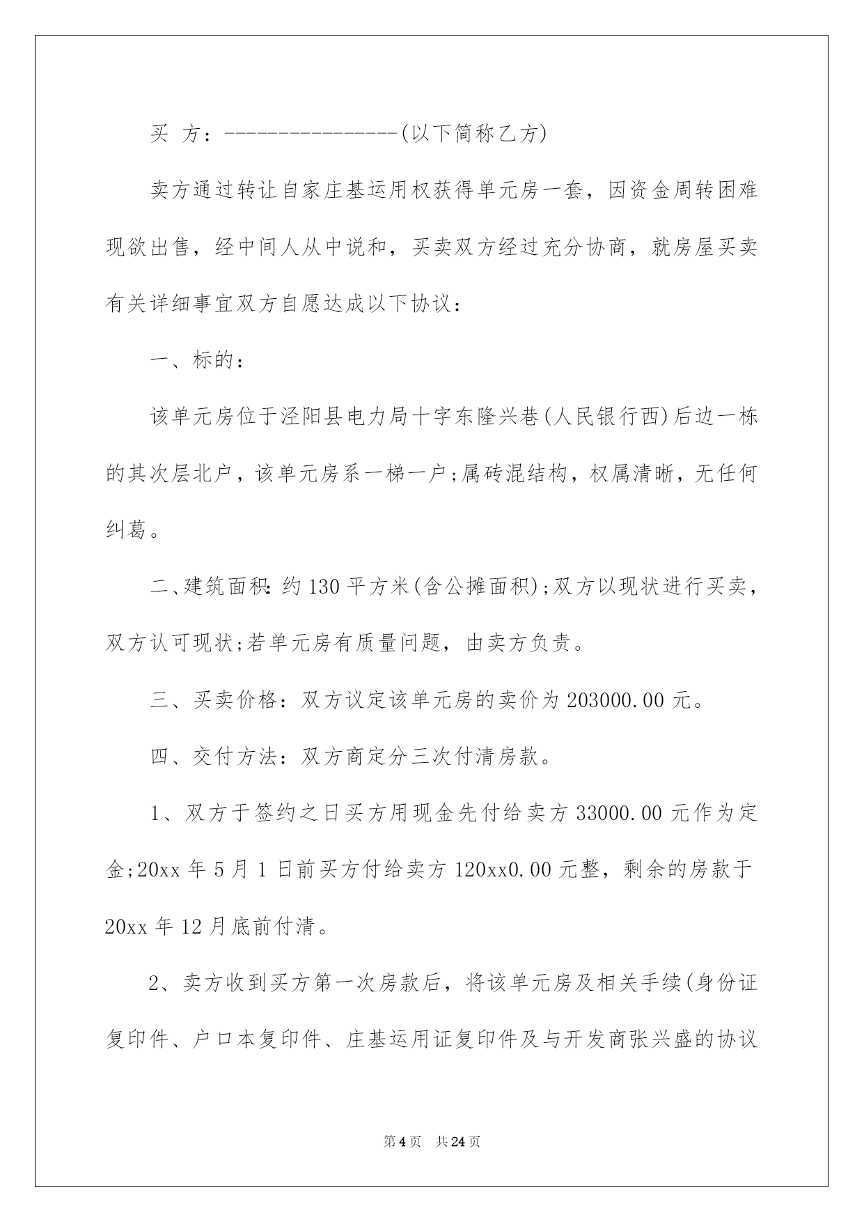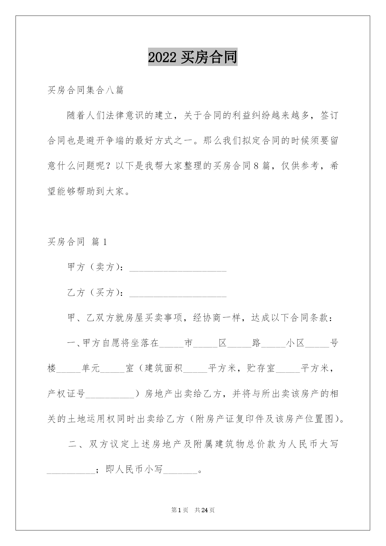 第PAGE\*Arabic\*MERGEFORMAT24页共NUMPAGES\*Arabic\*MERGEFORMAT24页第PAGE\*MERGEFORMAT24页共NUMPAGES\*MERGEFORMAT24页第PAGE\*MERGEFORMAT24页共NUMPAGES\*MERGEFORMAT24页第PAGE\*MERGEFORMAT24页共NUMPAGES\*MERGEFORMAT24页第PAGE\*MERGEFORMAT24页共NUMPAGES\*MERGEFORMAT24页第PAGE\*MERGEFORMAT24页共NUMPAGES\*MERGEFORMAT24页第PAGE\*MERGEFORMAT24页共NUMPAGES\*MERGEFORMAT24页第PAGE\*MERGEFORMAT24页共NUMPAGES\*MERGEFORMAT24页第PAGE\*MERGEFORMAT24页共NUMPAGES\*MERGEFORMAT24页第PAGE\*MERGEFORMAT24页共NUMPAGES\*MERGEFORMAT24页第PAGE\*MERGEFORMAT24页共NUMPAGES\*MERGEFORMAT24页2022买房合同买房合同集合八篇随着人们法律意识的建立,关于合同的利益纠纷越来越多,签订合同也是避开争端的最好方式之一。那么我们拟定合同的时候须要留意什么问题呢?以下是我帮大家整理的买房合同8篇,仅供参考,希望能够帮助到大家。买房合同篇1甲方(卖方):____________________乙方(买方):____________________甲、乙双方就房屋买卖事项,经协商一样,达成以下合同条款:一、甲方自愿将坐落在_____市_____区_____路_____小区_____号楼_____单元_____室(建筑面积_____平方米,贮存室_____平方米,产权证号__________)房地产出卖给乙方,并将与所出卖该房产的相关的土地运用权同时出卖给乙方(附房产证复印件及该房产位置图)。二、双方议定上述房地产及附属建筑物总价款为人民币大写__________;即人民币小写_______。三、乙方在签订本合同时,支付定金,即小写_______。四、乙方支付定金之日起_______个月内,向甲方支付首付款(定金从中扣除),首付款之外的款项通过银行住房按揭方式交付(有关期限和程序根据所在按揭银行规定办理)。五、甲方保证该房产合法、权属清晰、有合法的土地运用权(已交纳土地出让金)。六、办理房产证手续所产生的有关税费由_______方担当。七、乙方支付首付款后,甲方即主动协作乙方办理有关房产过户手续,待房产过户到乙方名下之时,乙方应向甲方付清全部房款余额。八、甲方应在前将该房产交付乙方;届时该房产应无任何担保、抵押、房产瑕疵,无人租住、运用;无欠账,如电话费、水电费、物业管理费、取暖费、入网费、有线电视费等。九、本合同签订后,如一方违反本合同条款,该方应向对方支付_______元的违约金;一方如不能按规定交付房产或按规定支付房款,每逾期一日,应向对方支付_______元罚金,逾期_______日视为毁约;如因政府及银行规定,本合同涉及房产手续客观上不能办理过户或银行不能办理按揭导致合同解除,不适用本条款。十、交付该房产,甲方不得损坏该房产的结构、地面和墙壁及不适移动的物件。十一、本协议一式两份,具有同等法律效力,自双方签字之日生效。十二、附加条款:___________________________________。甲方(卖方):_______________身份证号:____________________住址:________________________电话:_____________________________________年_______月_______乙方(买方):_______________身份证号:____________________住址:________________________电话:_____________________________________年_______月_______买房合同篇2卖方:----------------(以下简称甲方)买方:----------------(以下简称乙方)卖方通过转让自家庄基运用权获得单元房一套,因资金周转困难现欲出售,经中间人从中说和,买卖双方经过充分协商,就房屋买卖有关详细事宜双方自愿达成以下协议:一、标的:该单元房位于泾阳县电力局十字东隆兴巷(人民银行西)后边一