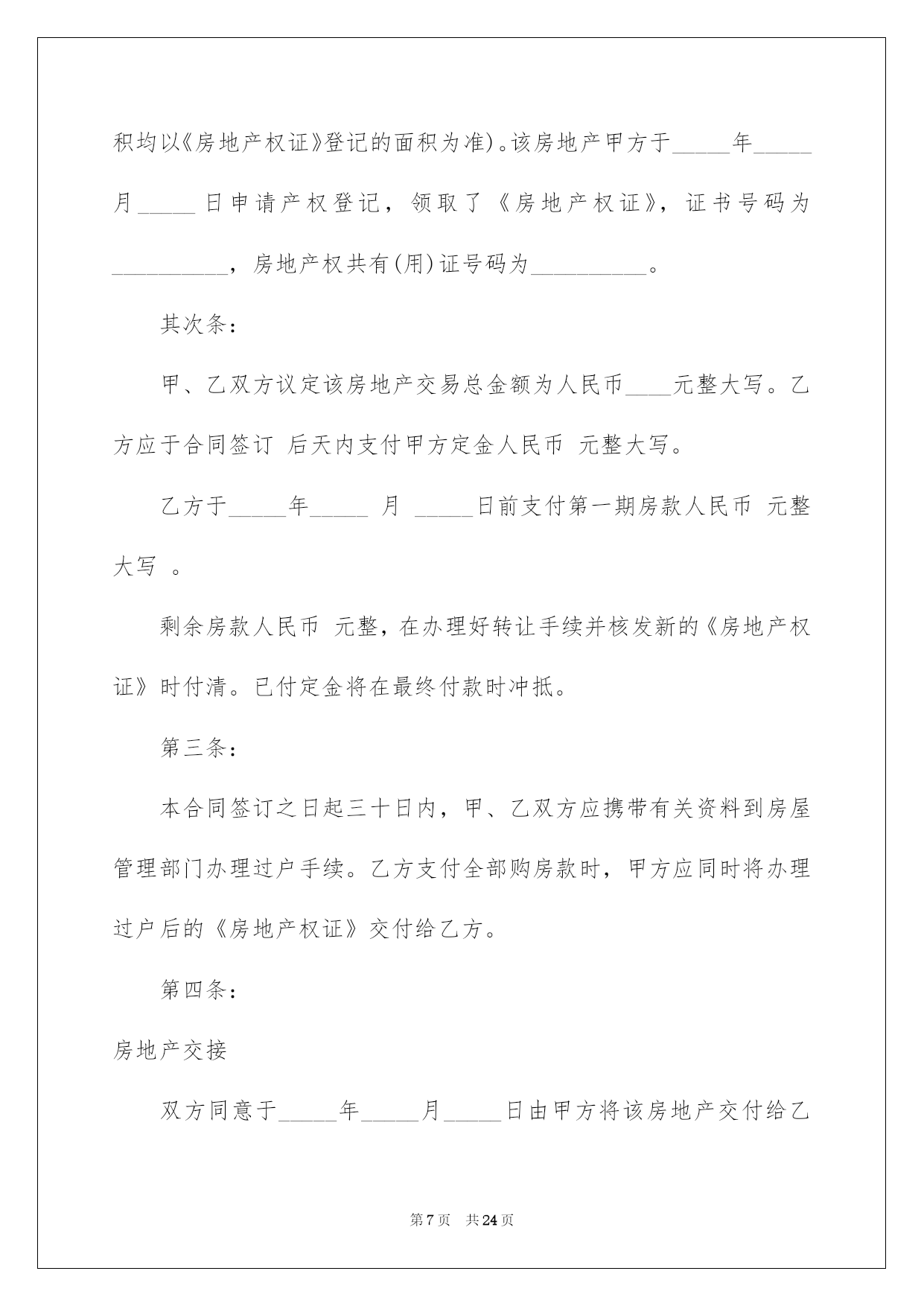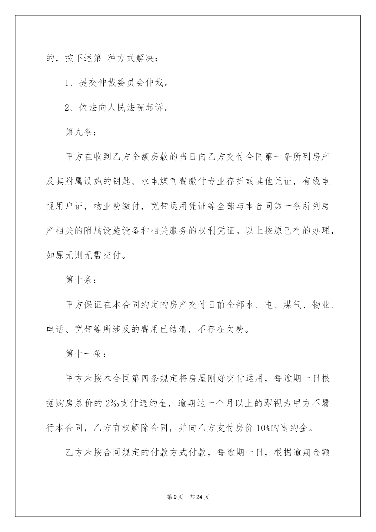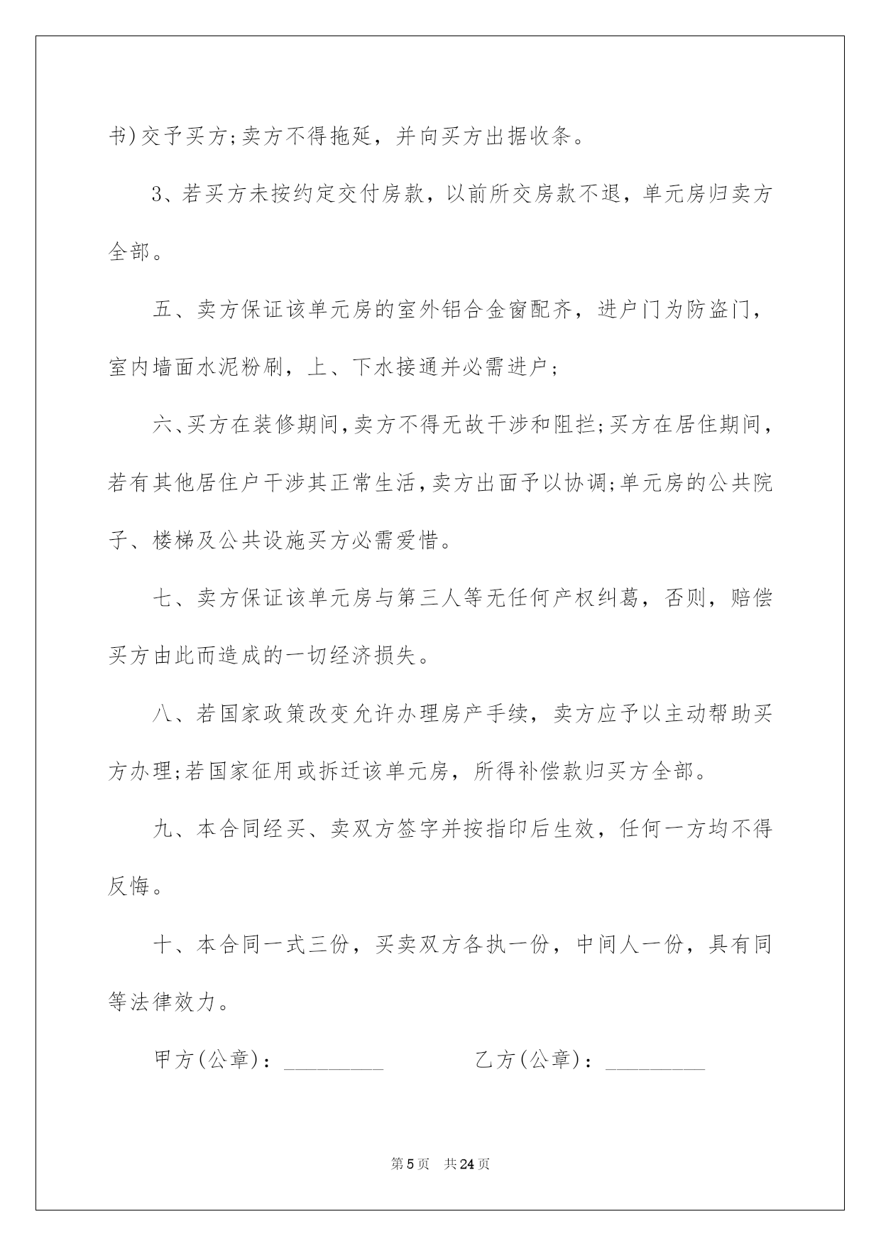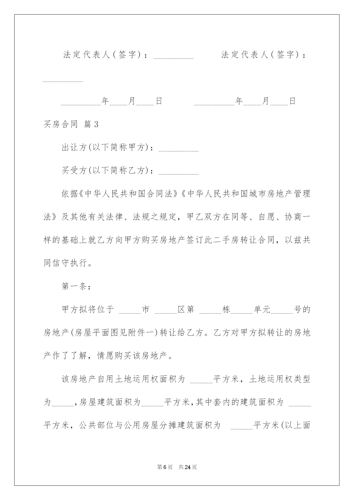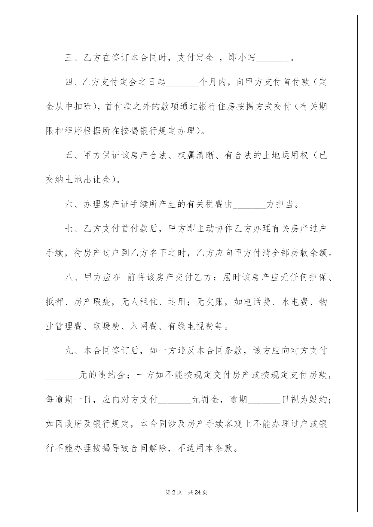 第PAGE\*Arabic\*MERGEFORMAT24页共NUMPAGES\*Arabic\*MERGEFORMAT24页第PAGE\*MERGEFORMAT24页共NUMPAGES\*MERGEFORMAT24页第PAGE\*MERGEFORMAT24页共NUMPAGES\*MERGEFORMAT24页第PAGE\*MERGEFORMAT24页共NUMPAGES\*MERGEFORMAT24页第PAGE\*MERGEFORMAT24页共NUMPAGES\*MERGEFORMAT24页第PAGE\*MERGEFORMAT24页共NUMPAGES\*MERGEFORMAT24页第PAGE\*MERGEFORMAT24页共NUMPAGES\*MERGEFORMAT24页第PAGE\*MERGEFORMAT24页共NUMPAGES\*MERGEFORMAT24页第PAGE\*MERGEFORMAT24页共NUMPAGES\*MERGEFORMAT24页第PAGE\*MERGEFORMAT24页共NUMPAGES\*MERGEFORMAT24页第PAGE\*MERGEFORMAT24页共NUMPAGES\*MERGEFORMAT24页2022买房合同买房合同集合八篇随着人们法律意识的建立,关于合同的利益纠纷越来越多,签订合同也是避开争端的最好方式之一。那么我们拟定合同的时候须要留意什么问题呢?以下是我帮大家整理的买房合同8篇,仅供参考,希望能够帮助到大家。买房合同篇1甲方(卖方):____________________乙方(买方):____________________甲、乙双方就房屋买卖事项,经协商一样,达成以下合同条款:一、甲方自愿将坐落在_____市_____区_____路_____小区_____号楼_____单元_____室(建筑面积_____平方米,贮存室_____平方米,产权证号__________)房地产出卖给乙方,并将与所出卖该房产的相关的土地运用权同时出卖给乙方(附房产证复印件及该房产位置图)。二、双方议定上述房地产及附属建筑物总价款为人民币大写__________;即人民币小写_______。三、乙方在签订本合同时,支付定金,即小写_______。四、乙方支付定金之日起_______个月内,向甲方支付首付款(定金从中扣除),首付款之外的款项通过银行住房按揭方式交付(有关期限和程序根据所在按揭银行规定办理)。五、甲方保证该房产合法、权属清晰、有合法的土地运用权(已交纳土地出让金)。六、办理房产证手续所产生的有关税费由_______方担当。七、乙方支付首付款后,甲方即主动协作乙方办理有关房产过户手续,待房产过户到乙方名下之时,乙方应向甲方付清全部房款余额。八、甲方应在前将该房产交付乙方;届时该房产应无任何担保、抵押、房产瑕疵,无人租住、运用;无欠账,如电话费、水电费、物业管理费、取暖费、入网费、有线电视费等。九、本合同签订后,如一方违反本合同条款,该方应向对方支付_______元的违约金;一方如不能按规定交付房产或按规定支付房款,每逾期一日,应向对方支付_______元罚金,逾期_______日视为毁约;如因政府及银行规定,本合同涉及房产手续客观上不能办理过户或银行不能办理按揭导致合同解除,不适用本条款。十、交付该房产,甲方不得损坏该房产的结构、地面和墙壁及不适移动的物件。十一、本协议一式两份,具有同等法律效力,自双方签字之日生效。十二、附加条款:___________________________________。甲方(卖方):_______________身份证号:____________________住址:________________________电话:_____________________________________年_______月_______乙方(买方):_______________身份证号:____________________住址:________________________电话:_____________________________________年_______月_______买房合同篇2卖方:----------------(以下简称甲方)买方:----------------(以下简称乙方)卖方通过转让自家庄基运用权获得单元房一套,因资金周转困难现欲出售,经中间人从中说和,买卖双方经过充分协商,就房屋买卖有关详细事宜双方自愿达成以下协议:一、标的:该单元房位于泾阳县电力局十字东隆兴巷(人民银行西)后边一