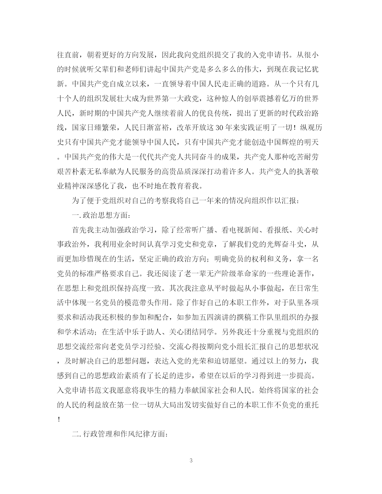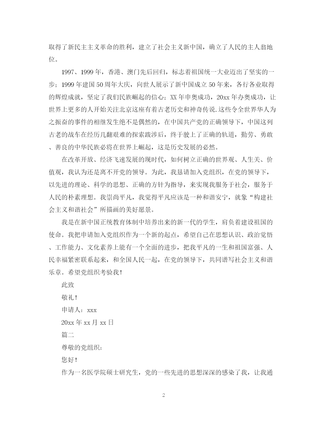 此资料由网络收集而来,如有侵权请告知上传者立即删除。资料共分享,我们负责传递知识。PAGEPAGE4在校研究生入党申请2020篇一尊敬的党组织:我要求加入中国共产党,愿意为共产主义而奋斗终生。作为一名研究生,考研复习期间我系统学习了马克思主义、毛泽东思想和邓小平理论,通过学习,我深刻领悟到社会的发展,社会意识形态的进步离不开先进思想的点拨和科学理论的引导。马克思主义传入中国在当时有着非常重要的意义。当时的中国是一个受封建统治两千多年的古老国家,封建愚昧根深蒂固,马克思主义象一阵清风,吹得死水起了微澜。它对物质意识关系的正确分析以及其科学的发展观、矛盾及普遍联系等观点如一剂醒脑药,将人们从封建愚昧中唤醒,指引人们用科学的世界观和方法论去重新认识这个世界。毛泽东思想是在长期反帝、反封建、反官僚资本主义的革命斗争中逐渐完善起来的科学理论,并最终指引中国取得革命的胜利。邓小平理论对中国经济的发展有着划时代的意义,社会主义本质论使人们摆脱了资/社争论的樊篱,最终认识到“归根到底,发展才是硬道理”这个真理。“三个有利于标准”的提出,更是为社会一切政治、经济的发展指明了方向。改革开放30年,使我们古老的国家焕发出了新的活力,在“建设有中国特色社会主义”科学思想的指引下,中国经济取得了令世界瞩目的长足进步。中国共产党提出“建设社会主义和谐社会”的思想,为全国人民描画出了一幅安定、祥和、富强、发展的美好愿景。“科学发展观”的提出预示着中国将走向更加人性化、理性化的发展道路。研究生在学期间我参加了业余党校的学习,使我对中国共产党有了更为全面的认识。我党自1921年建党至今,走过了近87年的艰辛历程,从建党之初的50多名党员,逐步发展到今天这个拥有六千万党员的执政党。在中国共产党的领导下,中国结束了半封建、半殖民地的历史,消灭了剥削制度和剥削阶级,并最终取得了新民主主义革命的胜利,建立了社会主义新中国,确立了人民的主人翁地位。1997、1999年,香港、澳门先后回归,标志着祖国统一大业迈出了坚实的一步;1999年建国50周年大庆,向世人展示了新中国成立50年来,各行各业取得的辉煌成就,坚定了我们民族崛起的信心;XX年申奥成功,20xx年办奥成功,让世界上更多的人开始关注北京这座有着古老历史和神奇传说.这些令全世界华人为之振奋的事件的相继发生绝不是偶然的,在中国共产党的正确领导下,中国这列古老的战车在经历几翻艰难的探索跋涉后,终于驶上了正确的轨道,勤劳、勇敢、善良的中华民族必将在世界上崛起,这是历史发展的必然。在改革开放、经济飞速发展的现时代,如何树立正确的世界观、人生关、价值观,我认为还是离不开党的领导。为此,我恳请加入党组织,在党的领导下,以先进的理论、科学的思想、正确的方针为指导,来实现我服务于社会,服务于人民的朴素理想。我崇尚平凡,我觉得平凡应该是一种和谐安宁,就象“构建社会主义和谐社会”所描画的美好愿景。我是在新中国正统教育体制中培养出来的新一代的学生,肩负着建设祖国的使命。我把申请加入党组织作为一个新的起点,希望自己在思想认识、政治觉悟、工作能力、文化素养上能有一个全面的进步,把我平凡的一生和祖国富强、人民幸福紧密联系起来,和全国人民一起,在党的领导下,共同谱写社会主义和谐乐章。希望党组织考验我!此致敬礼!申请人:xxx20xx年xx月xx日篇二尊敬的党组织:您好!作为一名医学院硕士研究生,党的一些先进的思想深深的感染了我,让我通往直前,朝着更好的方向发展,因此我向党组织提交了我的入党申请书。从很小的时候就听父辈们和老师们讲起中国共产党是多么多么的伟大,到现在我记忆犹新。中国共产党自成立以来,一直领导着中国人民走正确的道路。从一个只有几十个人的组织发展壮大成为世界第一大政党,这种惊人的创举震撼着亿万的世界人民,新时期的中国共产党人继续着前人的优良传统,提出了更新的时代政治路线,国家日臻繁荣,人民日渐富裕,改革开放这30年来实践证明了一切!纵观历史只有中国共产党才能领导中国人民,只有中国共产党才能创造中国辉煌的明天。中国共产党的伟大是一代代共产党人共同奋斗的成果,共产党人那种吃苦耐劳艰苦朴素无私奉献为人民服务的高贵品质深深打动着许多人。共产党人的执著敬业精神深深感化了我,也不时地在教育着我。为了便于党组织对自己的考察我将自己一年来的情况向组织作以汇报:一.政治思想方面:首先我主动加强政治学习,除了经常听广播、看电视新闻、看报纸、关心时事政治外,我利用业余时间认真学习党史和党章,了解我们党的光辉奋斗史,从而更加珍惜现在的生活,坚定正确的政治方向;明确党员的权利和义务,拿一名党员的标准严格要求自己。我还阅读了老一辈无产阶级革命家的一些理论著作,在思想上和党组织保持高度一致。其次我