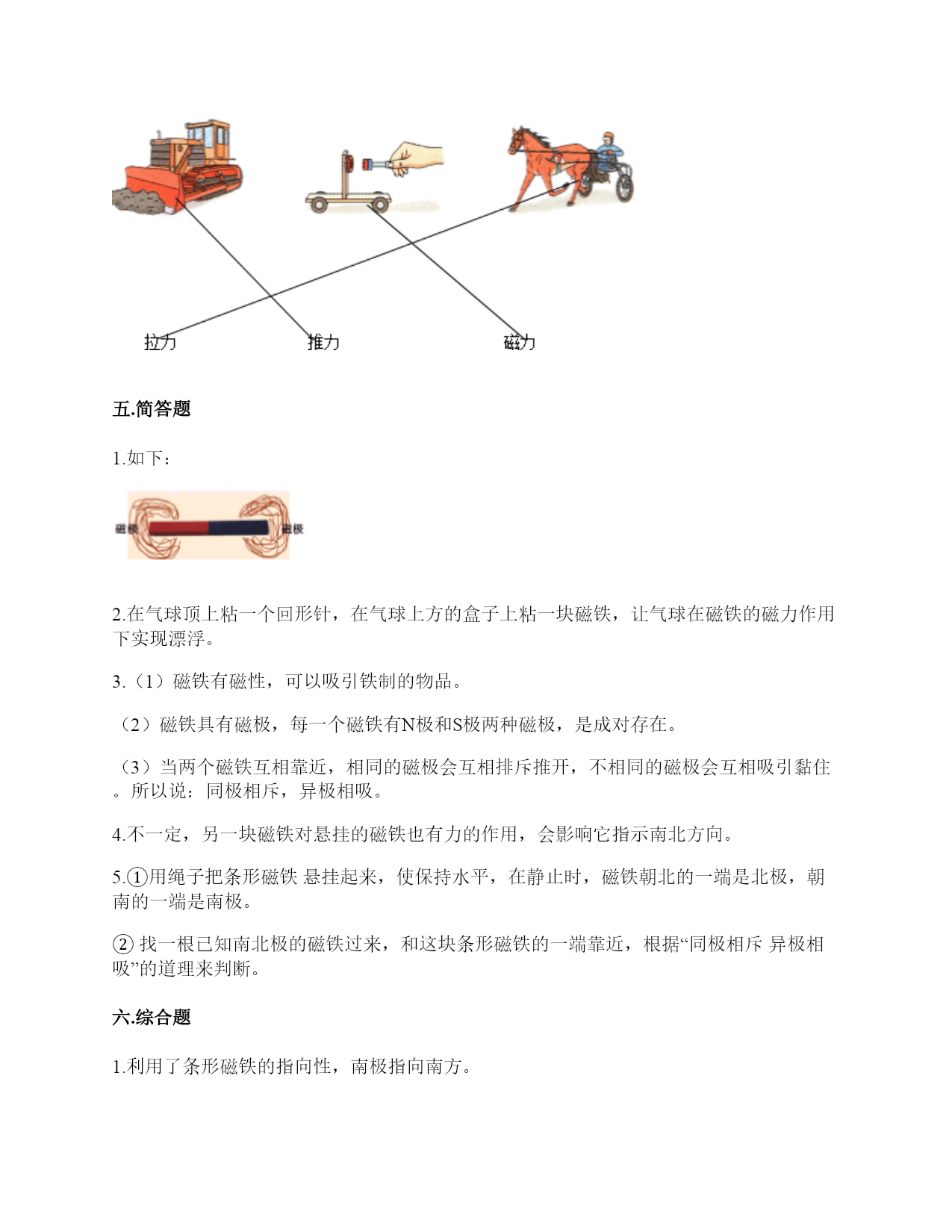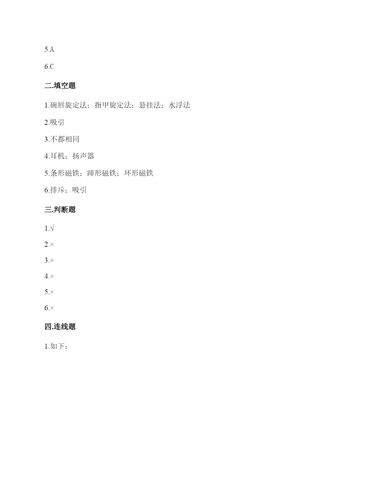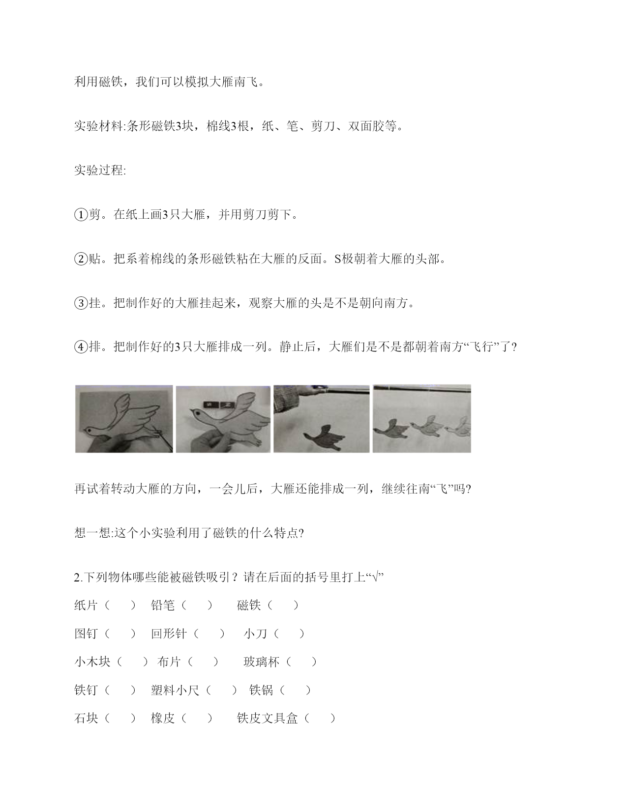 小学科学《磁铁》练习题一.选择题(共6题,共12分)1.下列事物中没有用到磁铁的是()。A.B.C.2.指南针是利用磁铁能够指示()方向的特点制成的。A.东西B.南北3.用磁化的小磁针靠近指南针,结果如图所示,说明针尖一端是()。A.S极B.北极C.N极4.制作指南针时,关键点之一是()。A.指南针的美观B.磁针的大小C.磁针能否自由转动5.使用指南针辨别方向时,附近有()对指南针没有影响。A.橡皮B.铁柜C.磁铁6.一个能够自由转动的磁铁,静止时,北极指向()方。A.东B.南C.北二.填空题(共6题,共26分)1.指南针的四种放置方法分别是()、()、()和()。2.磁铁可以隔着一张纸对铁钉产生()作用。3.磁铁的各个部位,磁力大小()(填“相同”或“不都相同")。4.()和()中也有磁铁,它们的作用是振动发声。5.磁铁有不同的外形,常见的有()、()、和()。6.磁铁的同极相互(),异极相互()。三.判断题(共6题,共12分)1.磁铁可以在不接触小车的情况下吸引小车,使小车运动。()2.磁铁每次指示的方向都是不同的。()3.只有条形磁铁能指示方向。()4.环形磁铁没有磁极。()5.磁铁除了磁极,其他部位没有磁性。()6.磁铁的同极相互吸引,异极相互排斥。两个磁极的作用是相互的。()四.连线题(共1题,共6分)1.连一连。五.简答题(共5题,共26分)1.铁粉在条形磁铁上是怎样分布的?画一画,并标出磁极。2.我们在游乐场会看到有卖向上漂浮的气球,这是因为里面装入了比空气轻的氢气或氦气,你能用磁铁的原理代替氢气做出漂浮气球的效果吗?(请想一想,画出你的设计想法)3.磁铁具有什么性质?4.在悬挂的条形磁铁旁边再放上一块条形磁铁,悬挂着的条形磁铁还会指示南北吗?为什么?5.怎样判断一块没有标明磁极的条形磁铁的南北极?六.综合题(共5题,共32分)1.深秋季节,你看到过大雁南飞的景象吗?原来,大雁南飞也与“磁”有关。在大雁的身体里,有一套天然的“地磁导航系统”。利用磁铁,我们可以模拟大雁南飞。实验材料:条形磁铁3块,棉线3根,纸、笔、剪刀、双面胶等。实验过程:①剪。在纸上画3只大雁,并用剪刀剪下。②贴。把系着棉线的条形磁铁粘在大雁的反面。S极朝着大雁的头部。③挂。把制作好的大雁挂起来,观察大雁的头是不是朝向南方。④排。把制作好的3只大雁排成一列。静止后,大雁们是不是都朝着南方“飞行”了?再试着转动大雁的方向,一会儿后,大雁还能排成一列,继续往南“飞”吗?想一想:这个小实验利用了磁铁的什么特点?2.下列物体哪些能被磁铁吸引?请在后面的括号里打上“√”纸片()铅笔()磁铁()图钉()回形针()小刀()小木块()布片()玻璃杯()铁钉()塑料小尺()铁锅()石块()橡皮()铁皮文具盒()瓷器()3.小明的爸爸是个户外运动爱好者,家里有很多户外运动装备,小明在爸爸的登山包的金属挂扣上发现了指南针。如下图所示,请你仔细观察图片,回答相关问题。使用这个指南针时,应该将挂扣()。A.平着放B.立着放C.倾斜放这种挂扣的材质不可能是()。A.铜B.塑料C.铁小明在指南针的方位盘上发现了N,这个方向是()。A.东B.北C.南4.小欣的爸爸给她买了一个指南针,请你教她如何使用指南针吧!1.观察上图这个指南针,它的刻度盘上有()个方位。A.2B.4C.82.指南针刻度盘上的南方用字母()表示A.NB.SC.W3.正确使用指南针时,磁针静止后,白色的一端指向()方。A.东B.南C.北4.如果指南针附近有铁制品,()影响指南针正常工作。A.会B.不会C.不一定5.请根据图中的情况,判断蹄形磁铁的磁极。参考答案一.选择题1.B2.B3.A4.C5.A6.C二.填空题1.碗唇旋定法;指甲旋定法;悬挂法;水浮法2.吸引3.不都相同4.耳机;扬声器5.条形磁铁;蹄形磁铁;环形磁铁6.排斥;吸引三.判断题1.√2.×3.×4.×5.×6.×四.连线题1.如下:五.简答题1.如下:2.在气球顶上粘一个回形针,在气球上方的盒子上粘一块磁铁,让气球在磁铁的磁力作用下实现漂浮。3.(1)磁铁有磁性,可以吸引铁制的物品。(2)磁铁具有磁极,每一个磁铁有N极和S极两种磁极,是成对存在。(3)当两个磁铁互相靠近,相同的磁极会互相排斥推开,不相同的磁极会互相吸引黏住。所以说:同极相斥,异极相吸。4.不一定,另一块磁铁对悬挂的磁铁也有力的作用,会影响它指示南北方向。5.①用绳子把条形磁铁悬挂起来,使保持水平,在静止时,磁铁朝北的一端是北极,朝南的一端是南极。②