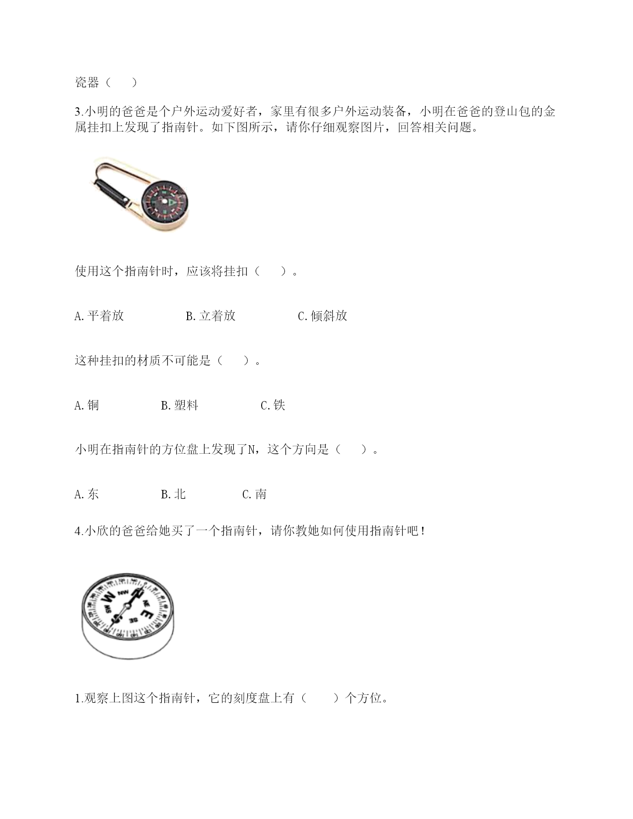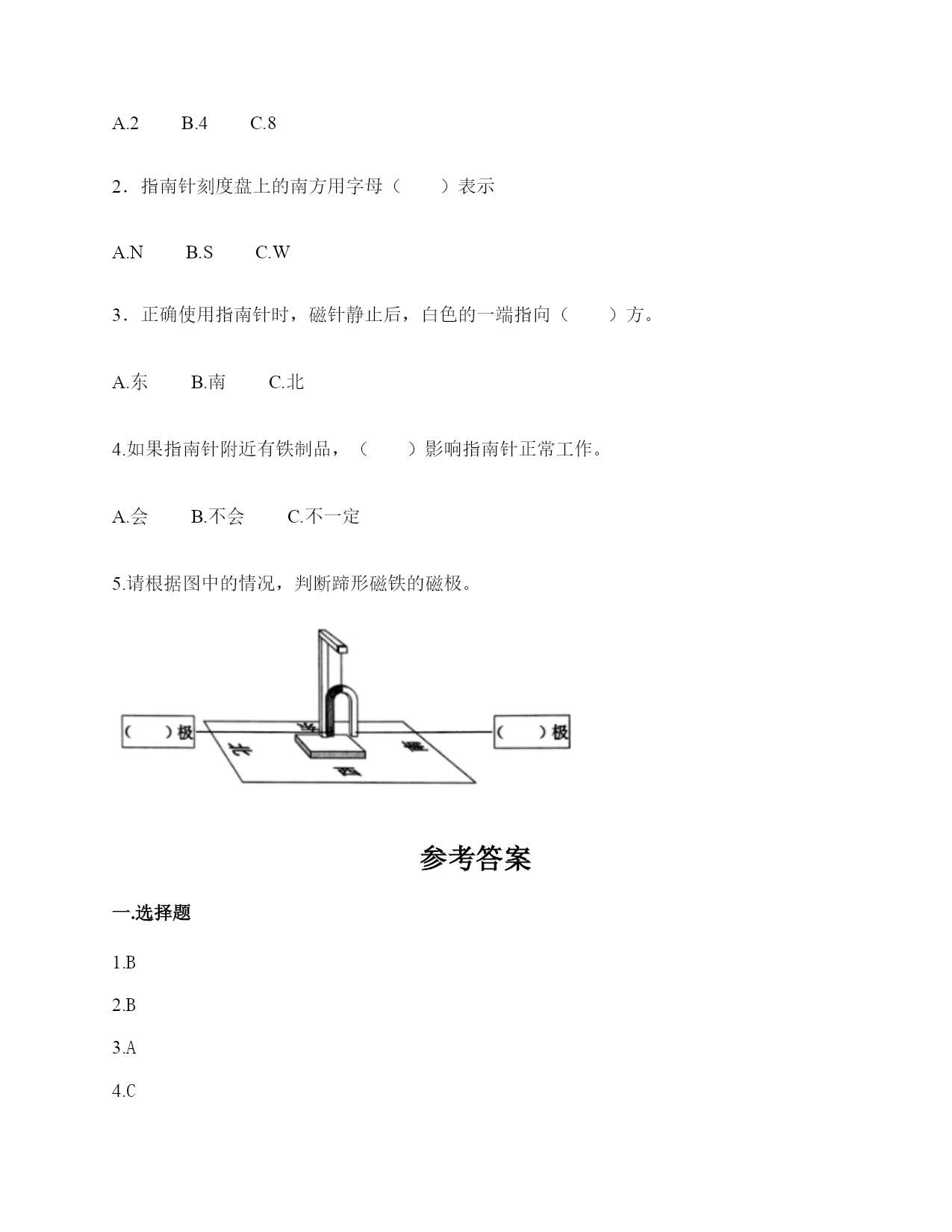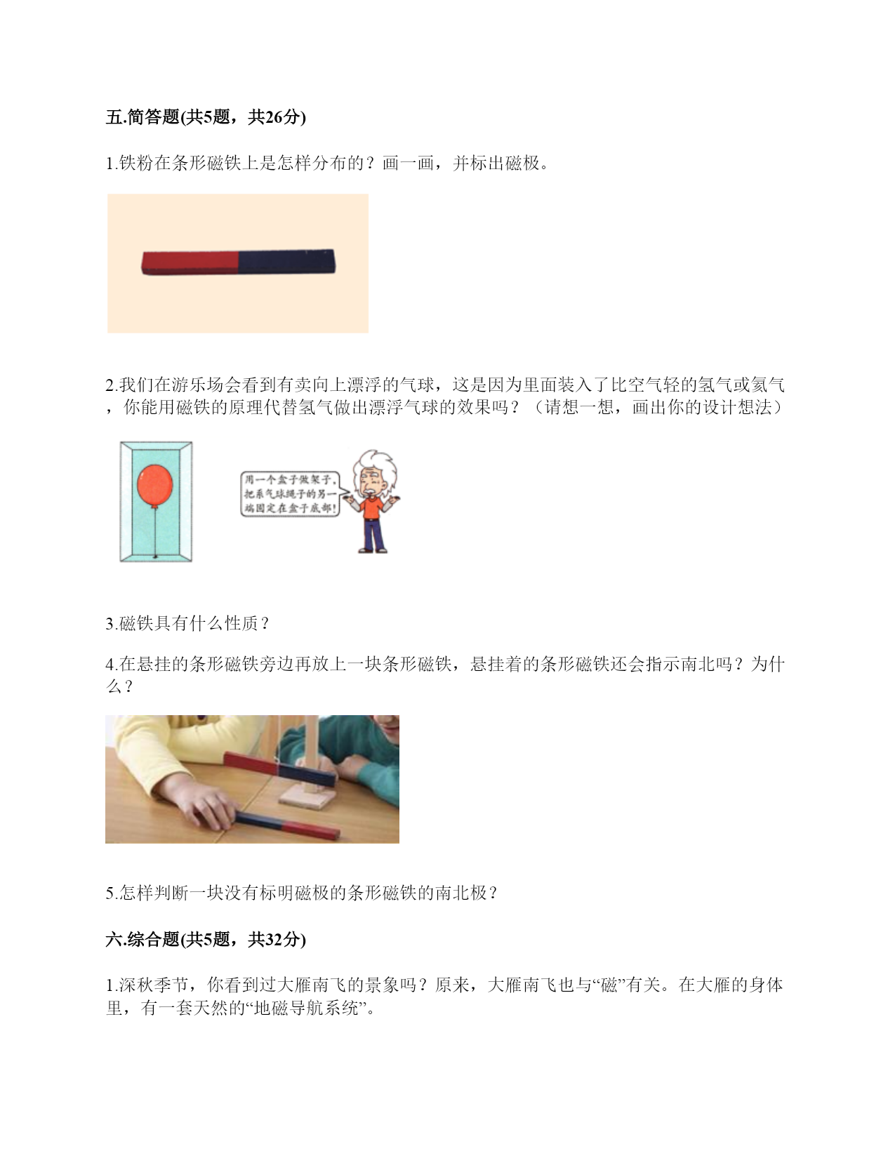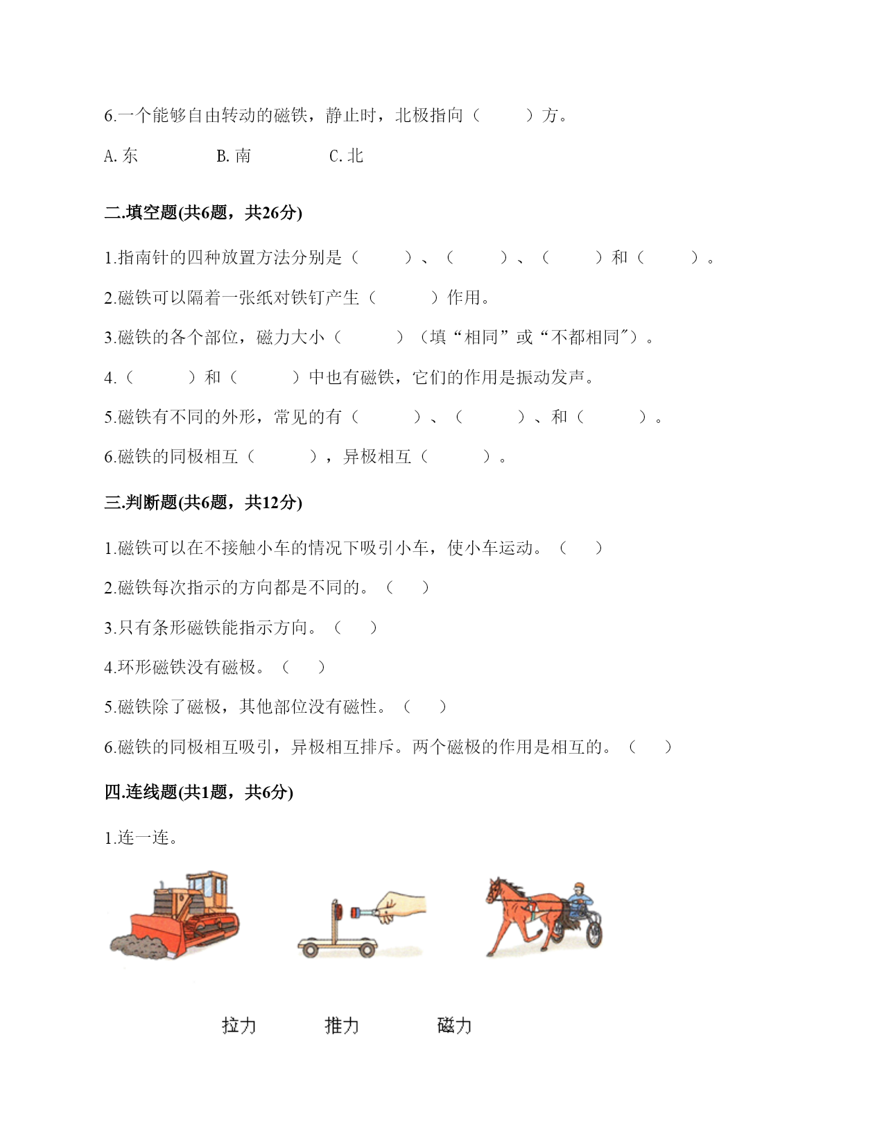 小学科学《磁铁》练习题一.选择题(共6题,共12分)1.下列事物中没有用到磁铁的是()。A.B.C.2.指南针是利用磁铁能够指示()方向的特点制成的。A.东西B.南北3.用磁化的小磁针靠近指南针,结果如图所示,说明针尖一端是()。A.S极B.北极C.N极4.制作指南针时,关键点之一是()。A.指南针的美观B.磁针的大小C.磁针能否自由转动5.使用指南针辨别方向时,附近有()对指南针没有影响。A.橡皮B.铁柜C.磁铁6.一个能够自由转动的磁铁,静止时,北极指向()方。A.东B.南C.北二.填空题(共6题,共26分)1.指南针的四种放置方法分别是()、()、()和()。2.磁铁可以隔着一张纸对铁钉产生()作用。3.磁铁的各个部位,磁力大小()(填“相同”或“不都相同")。4.()和()中也有磁铁,它们的作用是振动发声。5.磁铁有不同的外形,常见的有()、()、和()。6.磁铁的同极相互(),异极相互()。三.判断题(共6题,共12分)1.磁铁可以在不接触小车的情况下吸引小车,使小车运动。()2.磁铁每次指示的方向都是不同的。()3.只有条形磁铁能指示方向。()4.环形磁铁没有磁极。()5.磁铁除了磁极,其他部位没有磁性。()6.磁铁的同极相互吸引,异极相互排斥。两个磁极的作用是相互的。()四.连线题(共1题,共6分)1.连一连。五.简答题(共5题,共26分)1.铁粉在条形磁铁上是怎样分布的?画一画,并标出磁极。2.我们在游乐场会看到有卖向上漂浮的气球,这是因为里面装入了比空气轻的氢气或氦气,你能用磁铁的原理代替氢气做出漂浮气球的效果吗?(请想一想,画出你的设计想法)3.磁铁具有什么性质?4.在悬挂的条形磁铁旁边再放上一块条形磁铁,悬挂着的条形磁铁还会指示南北吗?为什么?5.怎样判断一块没有标明磁极的条形磁铁的南北极?六.综合题(共5题,共32分)1.深秋季节,你看到过大雁南飞的景象吗?原来,大雁南飞也与“磁”有关。在大雁的身体里,有一套天然的“地磁导航系统”。利用磁铁,我们可以模拟大雁南飞。实验材料:条形磁铁3块,棉线3根,纸、笔、剪刀、双面胶等。实验过程:①剪。在纸上画3只大雁,并用剪刀剪下。②贴。把系着棉线的条形磁铁粘在大雁的反面。S极朝着大雁的头部。③挂。把制作好的大雁挂起来,观察大雁的头是不是朝向南方。④排。把制作好的3只大雁排成一列。静止后,大雁们是不是都朝着南方“飞行”了?再试着转动大雁的方向,一会儿后,大雁还能排成一列,继续往南“飞”吗?想一想:这个小实验利用了磁铁的什么特点?2.下列物体哪些能被磁铁吸引?请在后面的括号里打上“√”纸片()铅笔()磁铁()图钉()回形针()小刀()小木块()布片()玻璃杯()铁钉()塑料小尺()铁锅()石块()橡皮()铁皮文具盒()瓷器()3.小明的爸爸是个户外运动爱好者,家里有很多户外运动装备,小明在爸爸的登山包的金属挂扣上发现了指南针。如下图所示,请你仔细观察图片,回答相关问题。使用这个指南针时,应该将挂扣()。A.平着放B.立着放C.倾斜放这种挂扣的材质不可能是()。A.铜B.塑料C.铁小明在指南针的方位盘上发现了N,这个方向是()。A.东B.北C.南4.小欣的爸爸给她买了一个指南针,请你教她如何使用指南针吧!1.观察上图这个指南针,它的刻度盘上有()个方位。A.2B.4C.82.指南针刻度盘上的南方用字母()表示A.NB.SC.W3.正确使用指南针时,磁针静止后,白色的一端指向()方。A.东B.南C.北4.如果指南针附近有铁制品,()影响指南针正常工作。A.会B.不会C.不一定5.请根据图中的情况,判断蹄形磁铁的磁极。参考答案一.选择题1.B2.B3.A4.C5.A6.C二.填空题1.碗唇旋定法;指甲旋定法;悬挂法;水浮法2.吸引3.不都相同4.耳机;扬声器5.条形磁铁;蹄形磁铁;环形磁铁6.排斥;吸引三.判断题1.√2.×3.×4.×5.×6.×四.连线题1.如下:五.简答题1.如下:2.在气球顶上粘一个回形针,在气球上方的盒子上粘一块磁铁,让气球在磁铁的磁力作用下实现漂浮。3.(1)磁铁有磁性,可以吸引铁制的物品。(2)磁铁具有磁极,每一个磁铁有N极和S极两种磁极,是成对存在。(3)当两个磁铁互相靠近,相同的磁极会互相排斥推开,不相同的磁极会互相吸引黏住。所以说:同极相斥,异极相吸。4.不一定,另一块磁铁对悬挂的磁铁也有力的作用,会影响它指示南北方向。5.①用绳子把条形磁铁悬挂起来,使保持水平,在静止时,磁铁朝北的一端是北极,朝南的一端是南极。②