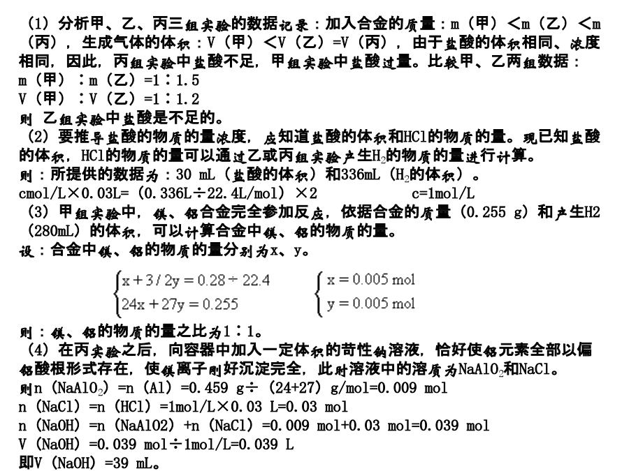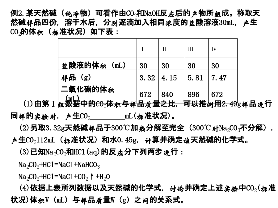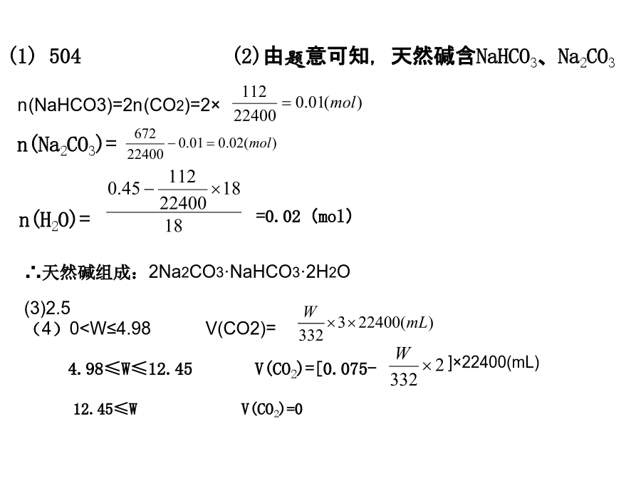 例1在标准状况下进行甲、乙、丙三组实验:各取30mL同浓度的盐酸溶液,加入不同质量的同一种镁铝合金粉末,产生气体,有关数据记录如下:(1)分析甲、乙、丙三组实验的数据记录:加入合金的质量:m(甲)<m(乙)<m(丙),生成气体的体积:V(甲)<V(乙)=V(丙),由于盐酸的体积相同、浓度相同,因此,丙组实验中盐酸不足,甲组实验中盐酸过量。比较甲、乙两组数据:m(甲)∶m(乙)=1∶1.5V(甲)∶V(乙)=1∶1.2则乙组实验中盐酸是不足的。(2)要推导盐酸的物质的量浓度,应知道盐酸的体积和HCl的物质的量。现已知盐酸的体积,HCl的物质的量可以通过乙或丙组实验产生H2的物质的量进行计算。则:所提供的数据为:30mL(盐酸的体积)和336mL(H2的体积)。cmol/L×0.03L=(0.336L÷22.4L/mol)×2c=1mol/L(3)甲组实验中,镁、铝合金完全参加反应,依据合金的质量(0.255g)和产生H2(280mL)的体积,可以计算合金中镁、铝的物质的量。设:合金中镁、铝的物质的量分别为x、y。例2.某天然碱(纯净物)可看作由CO2和NaOH反应后的产物所组成。称取天然碱样品四份,溶于水后,分别逐滴加入相同浓度的盐酸溶液30mL,产生CO2的体积(标准状况)如下表:(1)504(2)由题意可知,天然碱含NaHCO3、Na2CO3