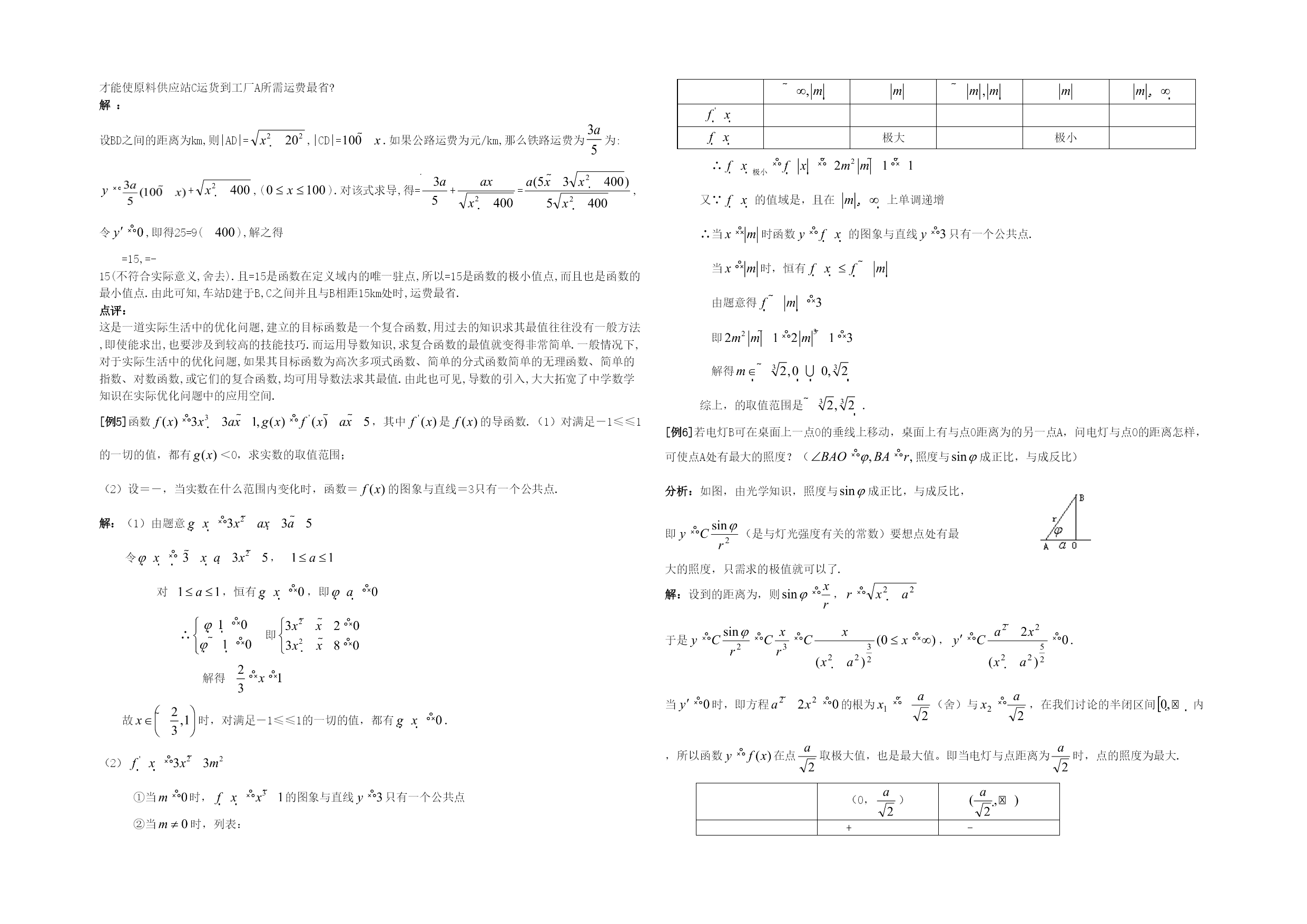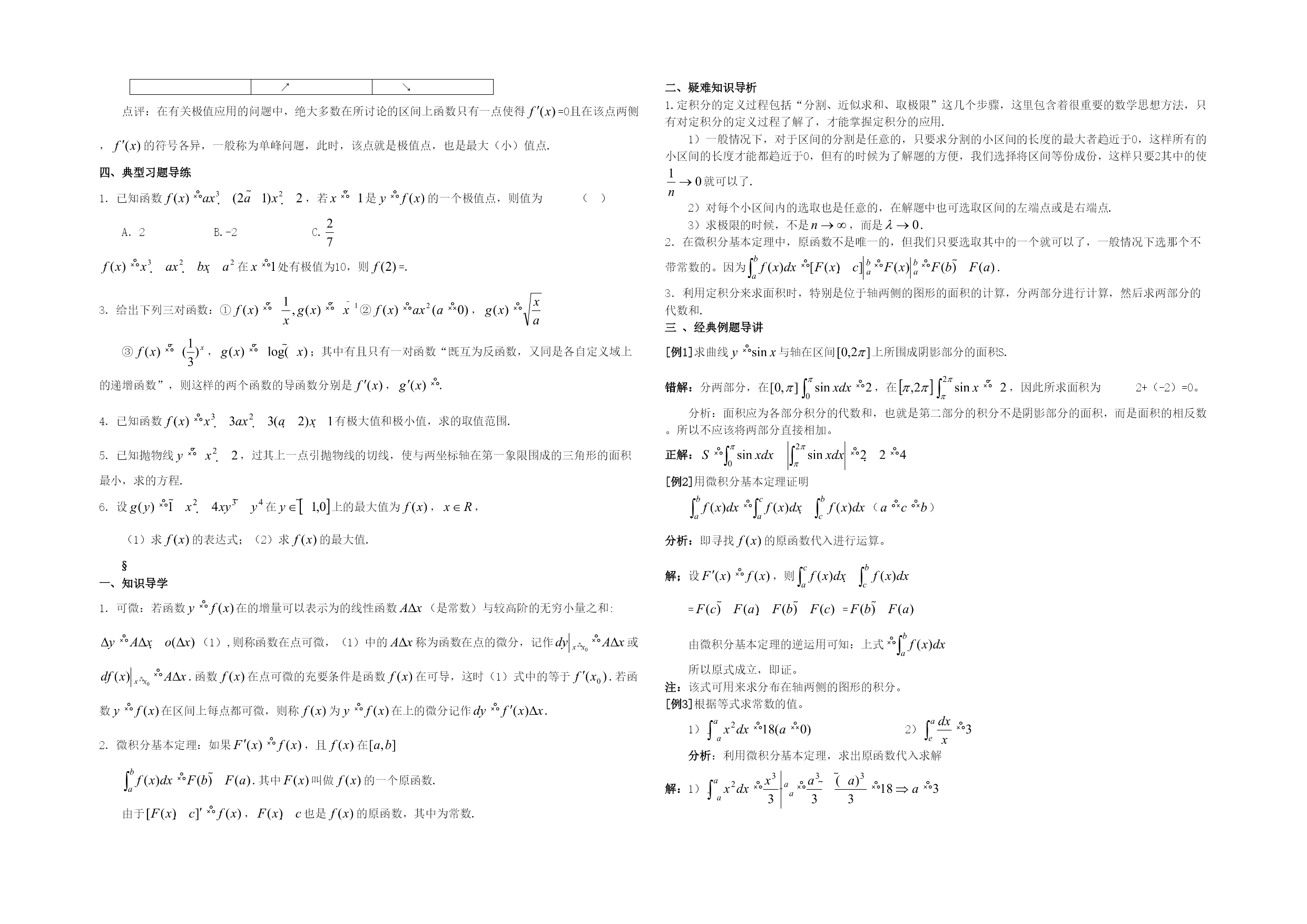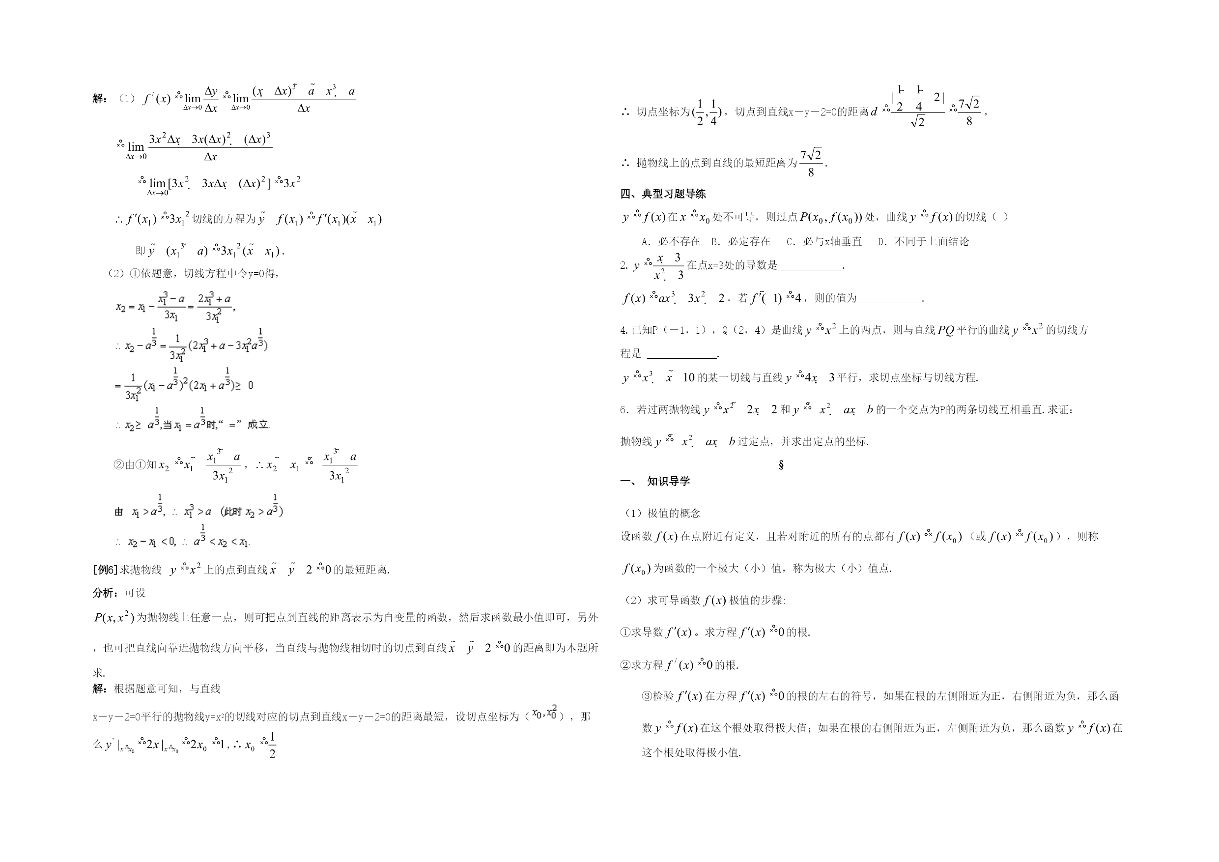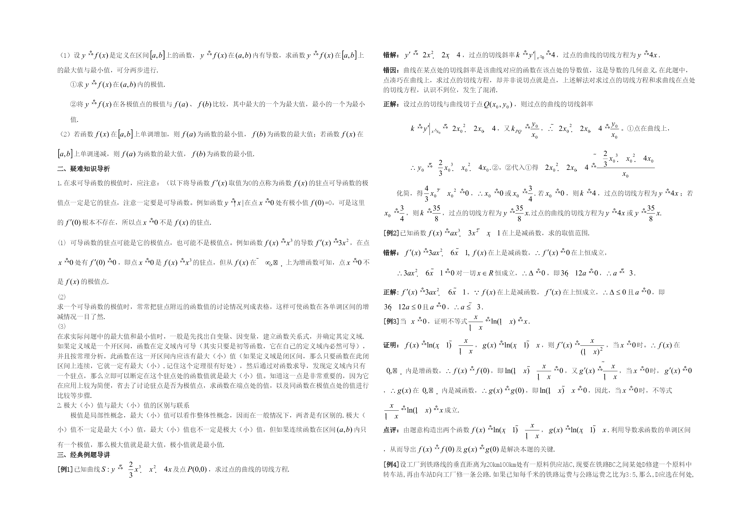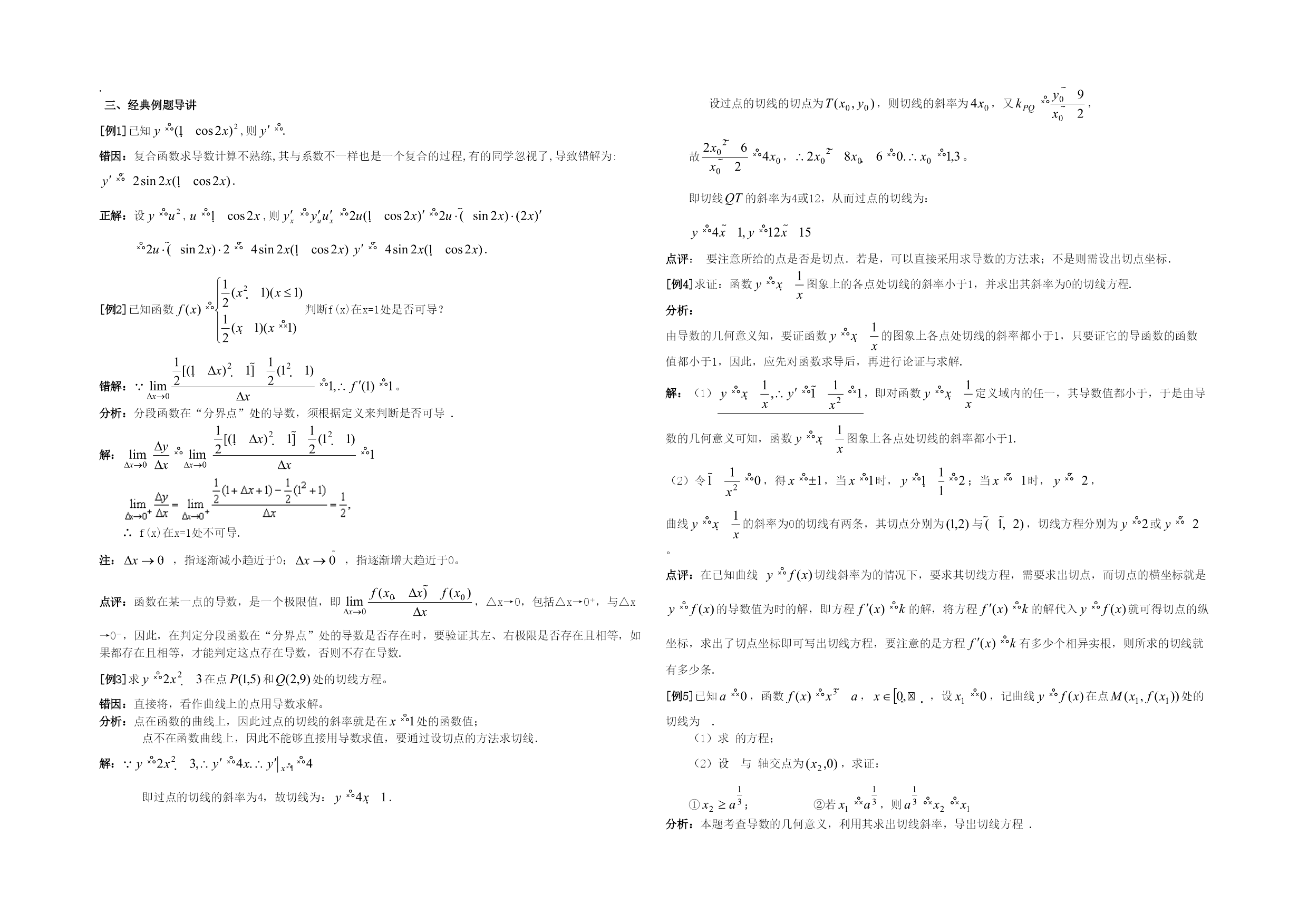 §HYPERLINK"http://www.zxxk.com"一、知识导学HYPERLINK"http://www.zxxk.com"1.瞬时变化率:设函数在附近有定义,当自变量在附近改变量为时,函数值相应地改变,如果当趋近于0时,平均变化率趋近于一个常数c(也就是说平均变化率与某个常数c的差的绝对值越来越小,可以小于任意小的正数),那么常数c称为函数在点的瞬时变化率。HYPERLINK"http://www.zxxk.com"2.导数:当趋近于零时,趋近于常数c。可用符号“”记作:当时,或记作,符号“”读作“趋近于”。函数在的瞬时变化率,通常称作在处的导数,并记作。HYPERLINK"http://www.zxxk.com"3.导函数:如果在开区间内每一点都是可导的,则称在区间可导。这样,对开区间内每个值,都对应一个确定的导数。于是,在区间内,构成一个新的函数,我们把这个函数称为函数的导函数。记为或(或)。HYPERLINK"http://www.zxxk.com"4.导数的四则运算法则:1)函数和(或差)的求导法则:设,是可导的,则即,两个函数的和(或差)的导数,等于这两个函数的导数的和(或差)。HYPERLINK"http://www.zxxk.com"2)函数积的求导法则:设,是可导的,则即,两个函数的积的导数,等于第一个函数的导数乘上第二个函数,加上第一个函数乘第二个函数的导数。HYPERLINK"http://www.zxxk.com"3)函数的商的求导法则:设,是可导的,,则HYPERLINK"http://www.zxxk.com"HYPERLINK"http://www.zxxk.com"5.复合函数的导数:设函数在点处有导数,函数在点的对应点处有导数,则复合函数在点处有导数,且.HYPERLINK"http://www.zxxk.com"6.几种常见函数的导数:HYPERLINK"http://www.zxxk.com"(1)(2)HYPERLINK"http://www.zxxk.com"(3)(4)HYPERLINK"http://www.zxxk.com"(5)(6)HYPERLINK"http://www.zxxk.com"(7)(8)HYPERLINK"http://www.zxxk.com"二、疑难知识导析HYPERLINK"http://www.zxxk.com"HYPERLINK"http://www.zxxk.com",应注意以下几点HYPERLINK"http://www.zxxk.com"(1)利用复合函数求导法则求导后,要把中间变量换成自变量的函数,层层求导.HYPERLINK"http://www.zxxk.com"(2)要分清每一步的求导是哪个变量对哪个变量求导,不能混淆,一直计算到最后,常出现如下错误,如实际上应是。HYPERLINK"http://www.zxxk.com"(3)求复合函数的导数,关键在于分清楚函数的复合关系,选好中间变量,如选成,计算起来就复杂了。HYPERLINK"http://www.zxxk.com"HYPERLINK"http://www.zxxk.com"导数的几何意义,通常指曲线的切线斜率.导数的物理意义,通常是指物体运动的瞬时速度。对导数的几何意义与物理意义的理解,有助于对抽象的导数定义的认识,应给予足够的重视。HYPERLINK"http://www.zxxk.com"4.HYPERLINK"http://www.zxxk.com"表示处的导数,即是函数在某一点的导数;表示函数在某给定区间内的导函数,此时是在上的函数,即是在内任一点的导数。HYPERLINK"http://www.zxxk.com"HYPERLINK"http://www.zxxk.com"若函数在处可导,则此函数在点处连续,但逆命题不成立,即函数HYPERLINK"http://www.zxxk.com"在点处连续,未必在点可导,也就是说,连续性是函数具有可导性的必要条件,而不是充分条件。HYPERLINK"http://www.zxxk.com"HYPERLINK"http://www.zxxk.com"由于函数在处的导数,表示曲线在点处切线的斜率,因HYPERLINK"http://www.zxxk.com"此,曲线在点处的切线方程可如下求得:HYPERLINK"http://www.zxxk.com"(1)求出函数在点处的导