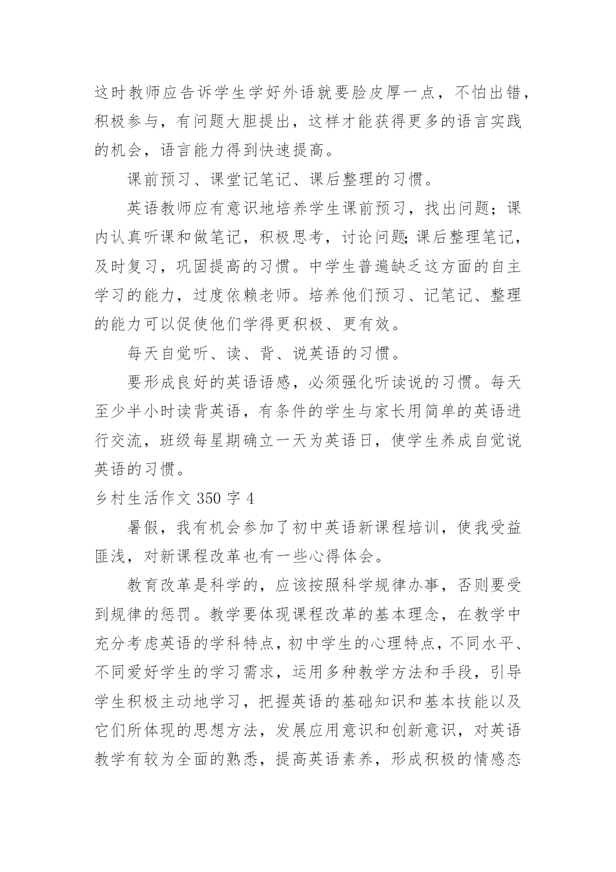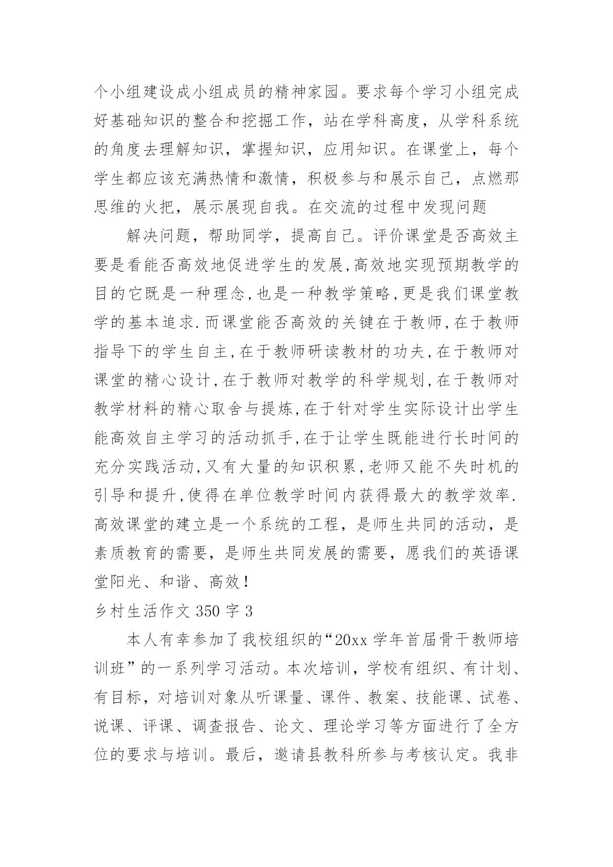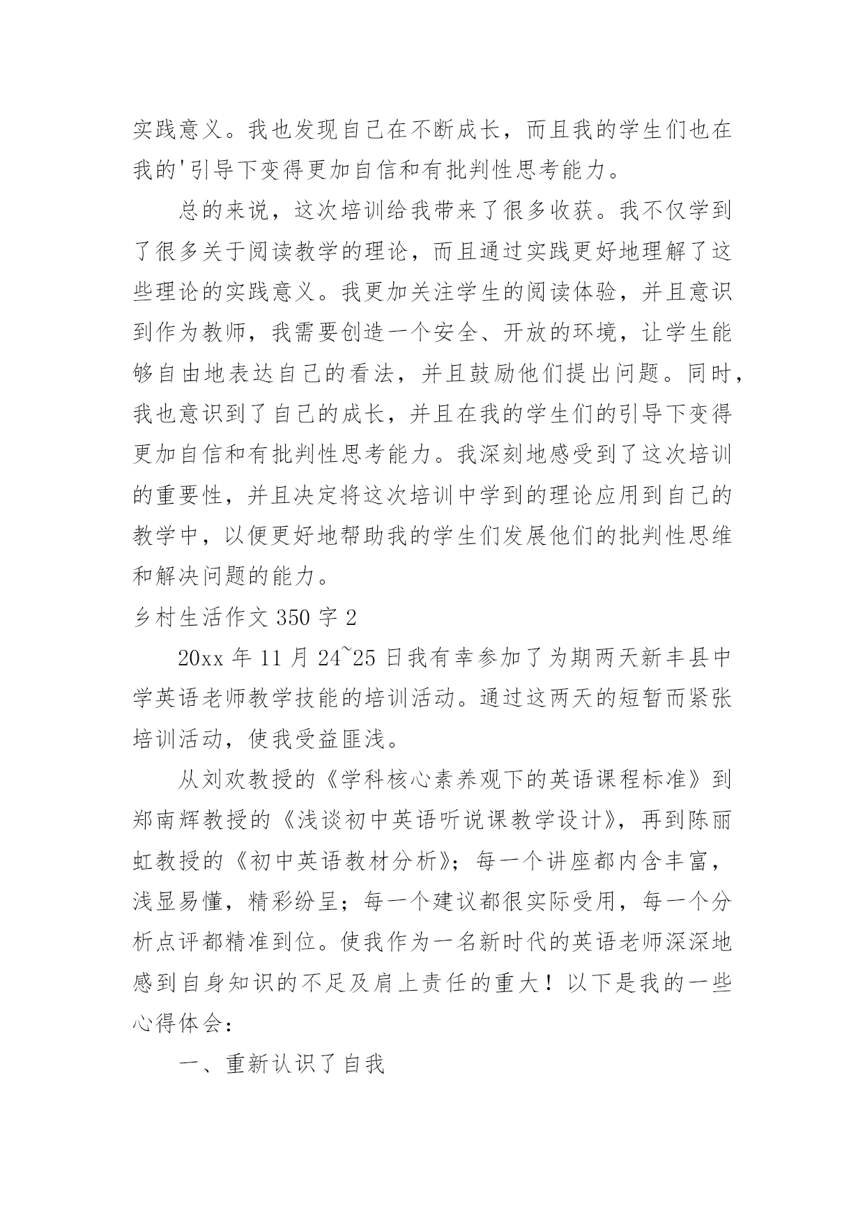 乡村生活作文350字乡村生活作文350字在平凡的学习、工作、生活中,大家都不可避免地会接触到作文吧,通过作文可以把我们那些零零散散的思想,聚集在一块。还是对作文一筹莫展吗?以下是小编收集整理的乡村生活作文350字,欢迎阅读,希望大家能够喜欢。乡村生活作文350字1这次培训给我留下了深刻的印象。我不仅学到了很多关于阅读教学的理论,而且通过实践,我更好地理解了这些理论的实践意义。在培训过程中,我们进行了一系列的教学实践。我们首先阅读了一篇短篇小说,然后按照不同的教学策略进行了分析。我深深地感受到了不同教学方法的效果,也认识到了自己的不足。在反思自己的教学方法时,我意识到我需要更多地关注学生的阅读体验,并且需要更好地引导他们理解文本。通过这次培训,我对阅读教学的理解更加深入了。我明白了阅读不仅仅是获取信息,更是引导学生发展批判性思维和解决问题的能力。我意识到,作为教师,我需要创造一个安全、开放的环境,让学生能够自由地表达自己的看法,并且鼓励他们提出问题。同时,我也意识到了自己的成长。在培训过程中,我学到了很多新的教学方法,并且通过实践更好地理解了它们的实践意义。我也发现自己在不断成长,而且我的学生们也在我的'引导下变得更加自信和有批判性思考能力。总的来说,这次培训给我带来了很多收获。我不仅学到了很多关于阅读教学的理论,而且通过实践更好地理解了这些理论的实践意义。我更加关注学生的阅读体验,并且意识到作为教师,我需要创造一个安全、开放的环境,让学生能够自由地表达自己的看法,并且鼓励他们提出问题。同时,我也意识到了自己的成长,并且在我的学生们的引导下变得更加自信和有批判性思考能力。我深刻地感受到了这次培训的重要性,并且决定将这次培训中学到的理论应用到自己的教学中,以便更好地帮助我的学生们发展他们的批判性思维和解决问题的能力。乡村生活作文350字220xx年11月24~25日我有幸参加了为期两天新丰县中学英语老师教学技能的培训活动。通过这两天的短暂而紧张培训活动,使我受益匪浅。从刘欢教授的《学科核心素养观下的英语课程标准》到郑南辉教授的《浅谈初中英语听说课教学设计》,再到陈丽虹教授的《初中英语教材分析》;每一个讲座都内含丰富,浅显易懂,精彩纷呈;每一个建议都很实际受用,每一个分析点评都精准到位。使我作为一名新时代的英语老师深深地感到自身知识的不足及肩上责任的重大!以下是我的一些心得体会:一、重新认识了自我通过这两天的学习使我的思想有了一个新的转变,让我给我自己的身份重新有了一个定位,英语老师不仅仅只是教英语的老师,也不只是能用英语进行教学的老师,更应该是能用英语帮助学生学习英语,为学生全面成长打下基础的老师。因此,我将在以后的教学的过程中一定要不断学习,努力提高自己的专业知识。打破传统的教学模式,要以学生为主体,引导学生自主学习英语的主观能动性,并激发学生们强烈的学习英语的欲望,使学生积极参与教与学的活动中。在学习英语的道路上成为学生的良师益友。二、对英语课堂教学及板书设计有了新的认识通过郑南辉教授的英语听说课的教学设计及技能的讲解,使我认识到教学设计的重要性。要使学生能在课堂40分钟能集中精力投入到学习中,那么课堂设计对学生的视觉及听觉的冲击力是必不可少的。只有这样才能充分调动学生学习英语的兴趣,提高老师的课堂教学效果。课堂板书是教学过程中必不可少的一部分。合理地利用黑板,把课文以及单元思维导向图展示在黑板上,巧妙地突出教学课程的重点难点,增强学生对知识的记忆一定会起到意想不到的效果。合理的课堂设计及优美的板书这也是作为一名合格的英语教师应具备的基本素质。三、对英语课文的教学及学生写作技巧有了极大的帮助通过陈丽虹教授对初中英语教材的分析,使我更清晰的明白不但要让学生掌握语篇、短文中的重点或难点,还要让学生能揣摩作者的写作的`意图以及自己对文章中一些观点的看法,引发学生的思考和讨论。通过这样的教学方式,对学生的写作能力的提升带来极大的好处,当学生写作时就会知道应该要写什么(What),怎样写(How),为什么要写(Why),写谁或要写哪些人物(Who),事情发生的时间(When)以及写在哪里发生的事情(Where),最后写出自己对相应事件的情感表达。这样学生对写作文就不再迷茫或者束手无策,就会觉得有话可说,有事可写,有情可表。四、对教材的把握有了更进一步的认识作为一线教师,要想上好一堂课,使重难点突出且生动有趣,教学有效果,那么教师对教材的把握就显得尤为重要。不但要熟习教材内容,还要创造性地使用教材,围绕课标有选择性地取舍,并且还可以根据实际情况对教学的先后顺序进行调整。灵活的使用教材,使教材更好的为我们的教与学提供服务。绝对的权威,老师的主导地位不可动摇,老师的言语不容置疑,而孩子却是有问题不敢问,也不敢提,更加不用说上台去展示了,老