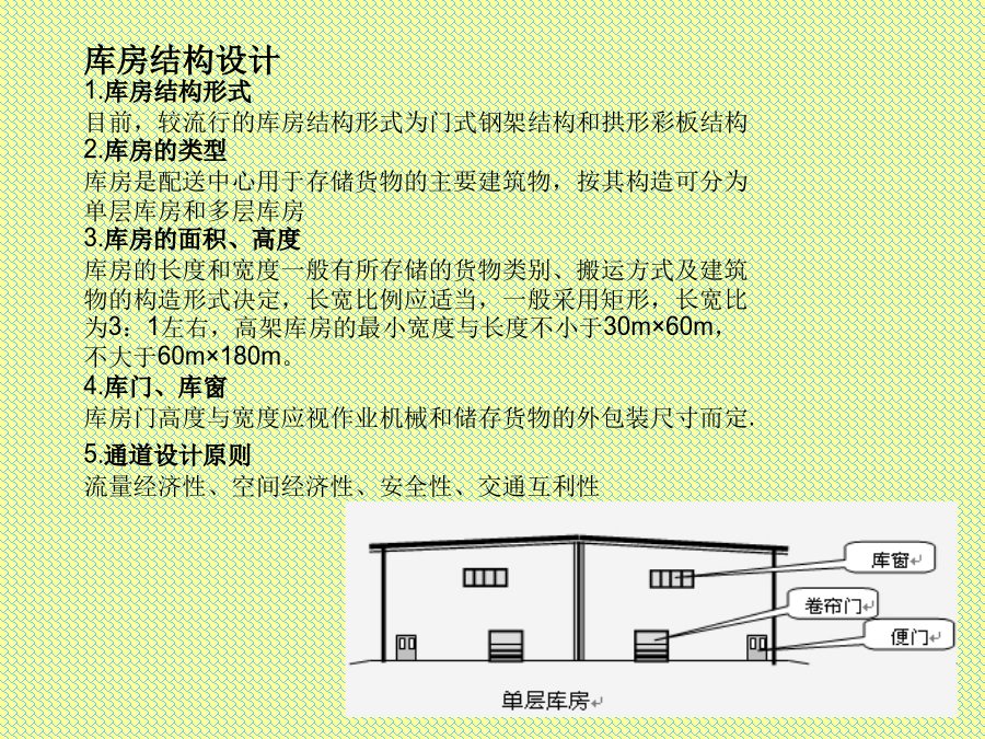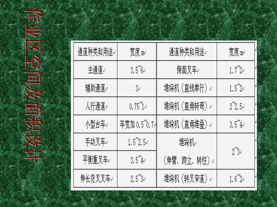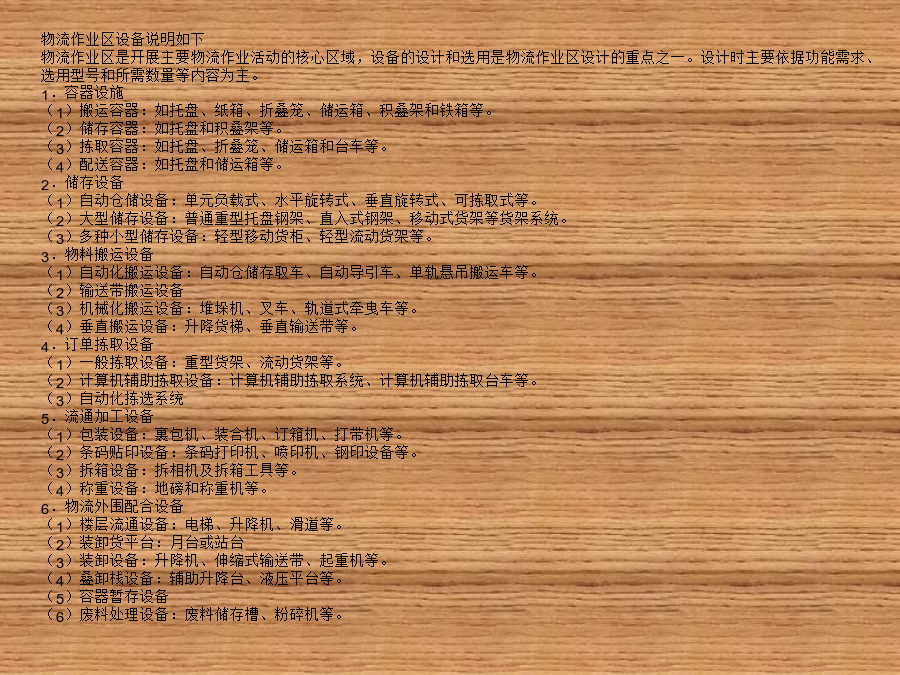 物流作业区设备说明如下物流作业区是开展主要物流作业活动的核心区域,设备的设计和选用是物流作业区设计的重点之一。设计时主要依据功能需求、选用型号和所需数量等内容为主。1.容器设施(1)搬运容器:如托盘、纸箱、折叠笼、储运箱、积叠架和铁箱等。(2)储存容器:如托盘和积叠架等。(3)拣取容器:如托盘、折叠笼、储运箱和台车等。(4)配送容器:如托盘和储运箱等。2.储存设备(1)自动仓储设备:单元负载式、水平旋转式、垂直旋转式、可拣取式等。(2)大型储存设备:普通重型托盘钢架、直入式钢架、移动式货架等货架系统。(3)多种小型储存设备:轻型移动货柜、轻型流动货架等。3.物料搬运设备(1)自动化搬运设备:自动仓储存取车、自动导引车、单轨悬吊搬运车等。(2)输送带搬运设备(3)机械化搬运设备:堆垛机、叉车、轨道式牵曳车等。(4)垂直搬运设备:升降货梯、垂直输送带等。4.订单拣取设备(1)一般拣取设备:重型货架、流动货架等。(2)计算机辅助拣取设备:计算机辅助拣取系统、计算机辅助拣取台车等。(3)自动化拣选系统5.流通加工设备(1)包装设备:裹包机、装合机、订箱机、打带机等。(2)条码贴印设备:条码打印机、喷印机、钢印设备等。(3)拆箱设备:拆相机及拆箱工具等。(4)称重设备:地磅和称重机等。6.物流外围配合设备(1)楼层流通设备:电梯、升降机、滑道等。(2)装卸货平台:月台或站台(3)装卸设备:升降机、伸缩式输送带、起重机等。(4)叠卸栈设备:辅助升降台、液压平台等。(5)容器暂存设备(6)废料处理设备:废料储存槽、粉碎机等。作业区空间及面积设计库房结构设计1.库房结构形式目前,较流行的库房结构形式为门式钢架结构和拱形彩板结构2.库房的类型库房是配送中心用于存储货物的主要建筑物,按其构造可分为单层库房和多层库房3.库房的面积、高度库房的长度和宽度一般有所存储的货物类别、搬运方式及建筑物的构造形式决定,长宽比例应适当,一般采用矩形,长宽比为3:1左右,高架库房的最小宽度与长度不小于30m×60m,不大于60m×180m。4.库门、库窗库房门高度与宽度应视作业机械和储存货物的外包装尺寸而定.