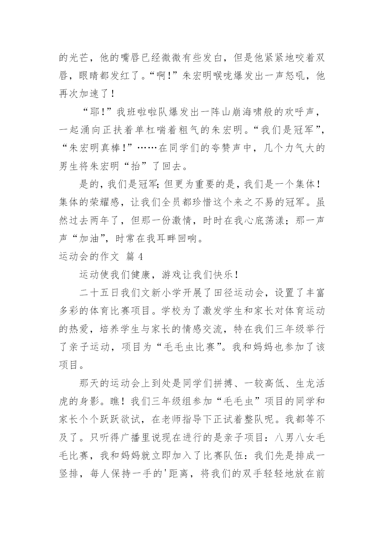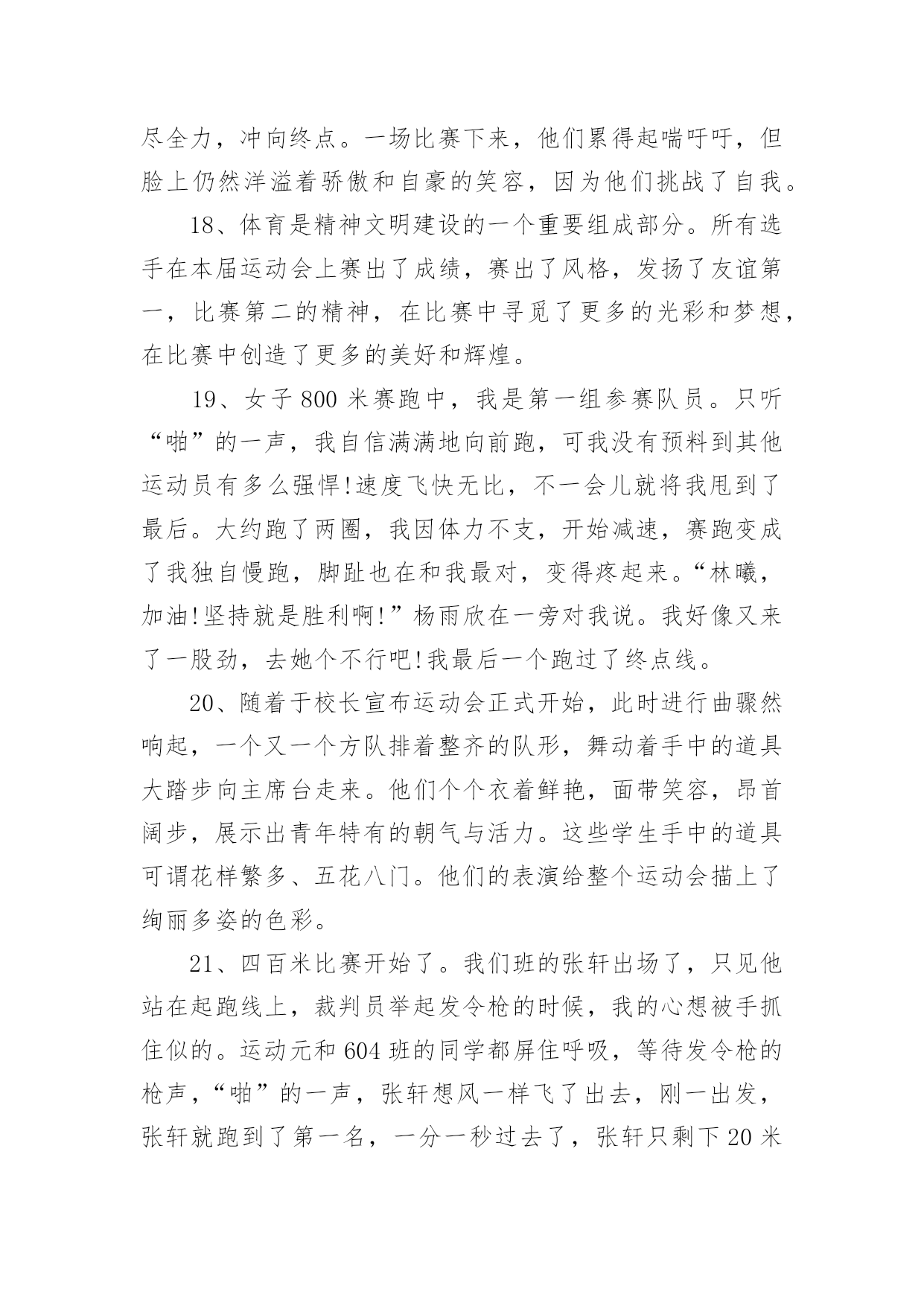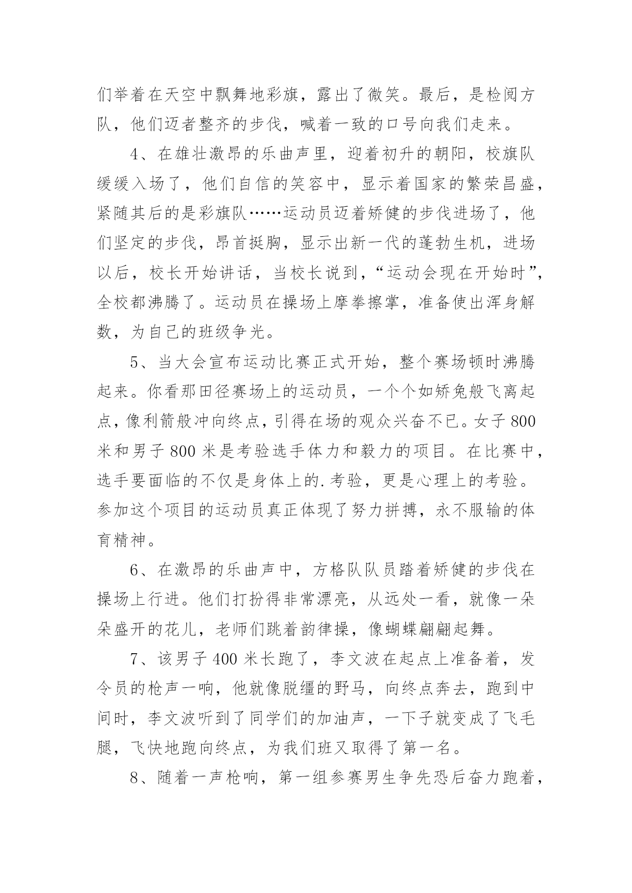 运动会的作文运动会的作文在日常学习、工作和生活中,大家对作文都再熟悉不过了吧,借助作文人们可以反映客观事物、表达思想感情、传递知识信息。相信许多人会觉得作文很难写吧,下面是小编精心整理的运动会的作文4篇,欢迎阅读与收藏。运动会的作文篇11、“砰”的一声枪响,各班的运动员就像离弦的箭一样冲了出去。我们班跑第一棒的同学一眨眼的功夫就逼近了第二棒,跑第二棒的同学飞一般的冲了出去,和别班拉开了一小段距离。2、这次比赛我们班虽然没有取得好的成绩,但是它增强了同学们之间的凝聚力,最重要的是锻炼我们的耐力,信心和顽强拼搏的精神。我们会总结经验和教训,在以后学校的其他活动中为我们班争得更多的荣誉。通过这次的比赛,我充分认识到了,要想得到好的成绩,就得平时多下苦功练习,还要具有坚忍不拔持之以恒的毅力和坚强的信心,我一定要把这种精神运用到我以后的学习和当中去。3、从远处走来的是四个抬旗的男生,他们昂首挺胸,迈着矫健的步伐走着,他们为这个任务感到光荣。然后,走来的是军鼓军号队,他们铿锵有力地敲着军鼓,豪迈大气地吹着军号,这一刻,我们很激动。接下来,是彩旗方队,他们举着在天空中飘舞地彩旗,露出了微笑。最后,是检阅方队,他们迈者整齐的步伐,喊着一致的口号向我们走来。4、在雄壮激昂的乐曲声里,迎着初升的朝阳,校旗队缓缓入场了,他们自信的笑容中,显示着国家的繁荣昌盛,紧随其后的是彩旗队……运动员迈着矫健的步伐进场了,他们坚定的步伐,昂首挺胸,显示出新一代的蓬勃生机,进场以后,校长开始讲话,当校长说到,“运动会现在开始时”,全校都沸腾了。运动员在操场上摩拳擦掌,准备使出浑身解数,为自己的班级争光。5、当大会宣布运动比赛正式开始,整个赛场顿时沸腾起来。你看那田径赛场上的运动员,一个个如矫兔般飞离起点,像利箭般冲向终点,引得在场的观众兴奋不已。女子800米和男子800米是考验选手体力和毅力的项目。在比赛中,选手要面临的不仅是身体上的.考验,更是心理上的考验。参加这个项目的运动员真正体现了努力拼搏,永不服输的体育精神。6、在激昂的乐曲声中,方格队队员踏着矫健的步伐在操场上行进。他们打扮得非常漂亮,从远处一看,就像一朵朵盛开的花儿,老师们跳着韵律操,像蝴蝶翩翩起舞。7、该男子400米长跑了,李文波在起点上准备着,发令员的枪声一响,他就像脱缰的野马,向终点奔去,跑到中间时,李文波听到了同学们的加油声,一下子就变成了飞毛腿,飞快地跑向终点,为我们班又取得了第一名。8、随着一声枪响,第一组参赛男生争先恐后奋力跑着,里面正好有我们班的运动健将杨浩。我们班的女生们站在最前头,举着五个大字:‘六七班加油’高喊:“杨浩,加油!杨浩,加油!……”杨浩终于从后面冲了上来,第一个跃过了终点线!“耶!”我们如此兴奋、如此激动,何不为这个好消息而感到高兴呢?第二组里的邓硕伟也不甘示弱,和着我们的喝彩声,努力拼搏,第四个冲破了终点线!不管他有没有得名次,但在我们心目中,他就是最棒的!9、再看那田径赛场上的运动员,也个个摩拳擦掌,毫不示弱。跳高跳远的运动员为了得到更好的成绩,拼尽全力,即使失败也毫不放弃。他们面对目标跨出坚定的步伐,跳了一次又一次。10、经过全班同学的共同努力,我们班还得了个“道德风尚”奖。其他的单项奖虽然什么也没得到,但我们也觉得没什么,因为,著名作家泰戈尔曾经写过“天空没有留下翅膀的痕迹,而我已飞过。”在最后决赛成绩里没有他们的名字,但是在绿茵场上洒下了自己的汗水和泪水。是呀,也许流星并不少见,但他燃烧的刹那才留给人们最美好的回忆。11、虽然这次春季运动会我们班没有取得理想的成绩,但我坚信通过努力锻炼,将来我们也会成为一名祖国的体育健将。玫瑰虽芬芳,但谁敢轻视芹菜。同学们个个都是祖国的好儿女,将来也会像刘翔一样,为祖国增光添彩!12、运动员们都要排队绕操场一圈,我们只有呆呆的看着他们。可真是无聊,但是,有聊的马上就到,一开始是小学组60米,因为我们以前都是中心小学嘛,所以也不管什么了,替小学的小孩加起了油。嘴里一边喊着,心里还一边乐呵呵的。13、开幕式上,伴随着悠扬的运动员进行曲,首先入场的是一年级的蓝色气球队,二年级的红色气球队……。我们五年级的是花环队。同学们个个都穿着整齐的校服,手里拿着花环,做着不同的动作和各种造型,还不时的变换着队形,为运动会增添了无限生机和光彩,博得了在坐的领导老师和同学们的阵阵掌声。14、运动会的开幕式是下午2点在学校大操场举行的,同学们都早早的按次序排好了队,个个脸上都笑容满面,有的手里拿着彩色气球,有的拿着小彩旗,欢声细语,那股兴奋劲就别提了…运动员们个个更是信心十足,精神抖擞。15、开幕式一结束,比赛正式开始。操场上顿时热闹起来。50米预决赛、跳高、跳远几个项目同时进行,操场上拉拉队的“加油”声此起彼伏。16、星期四上午,我们学校举行
