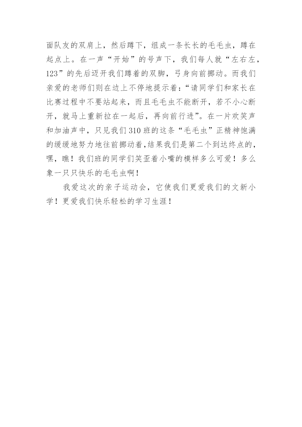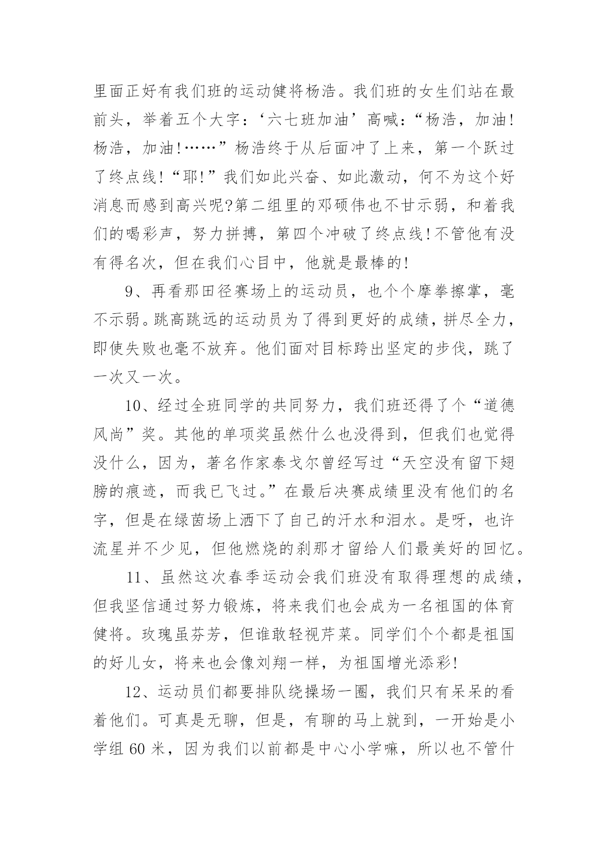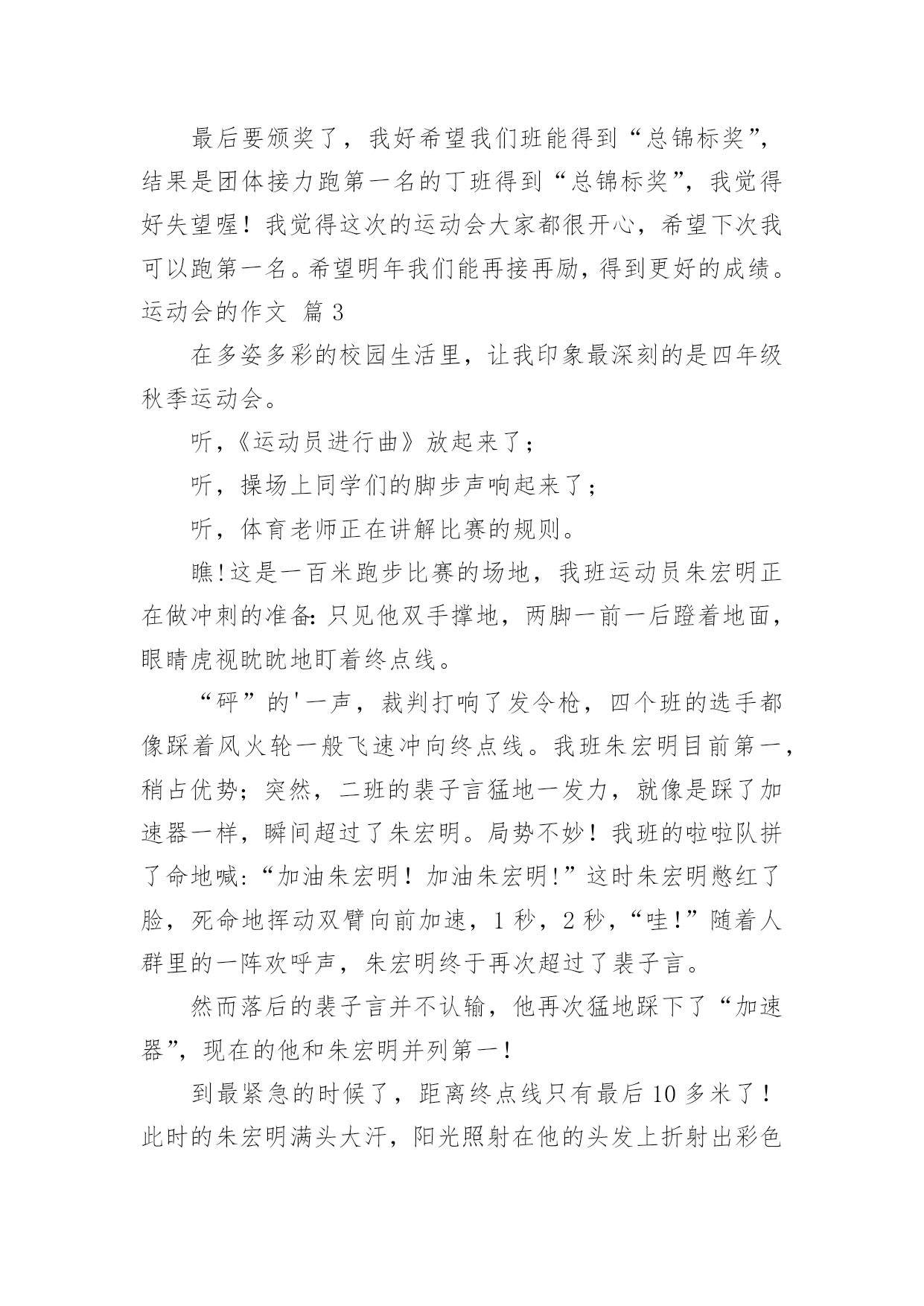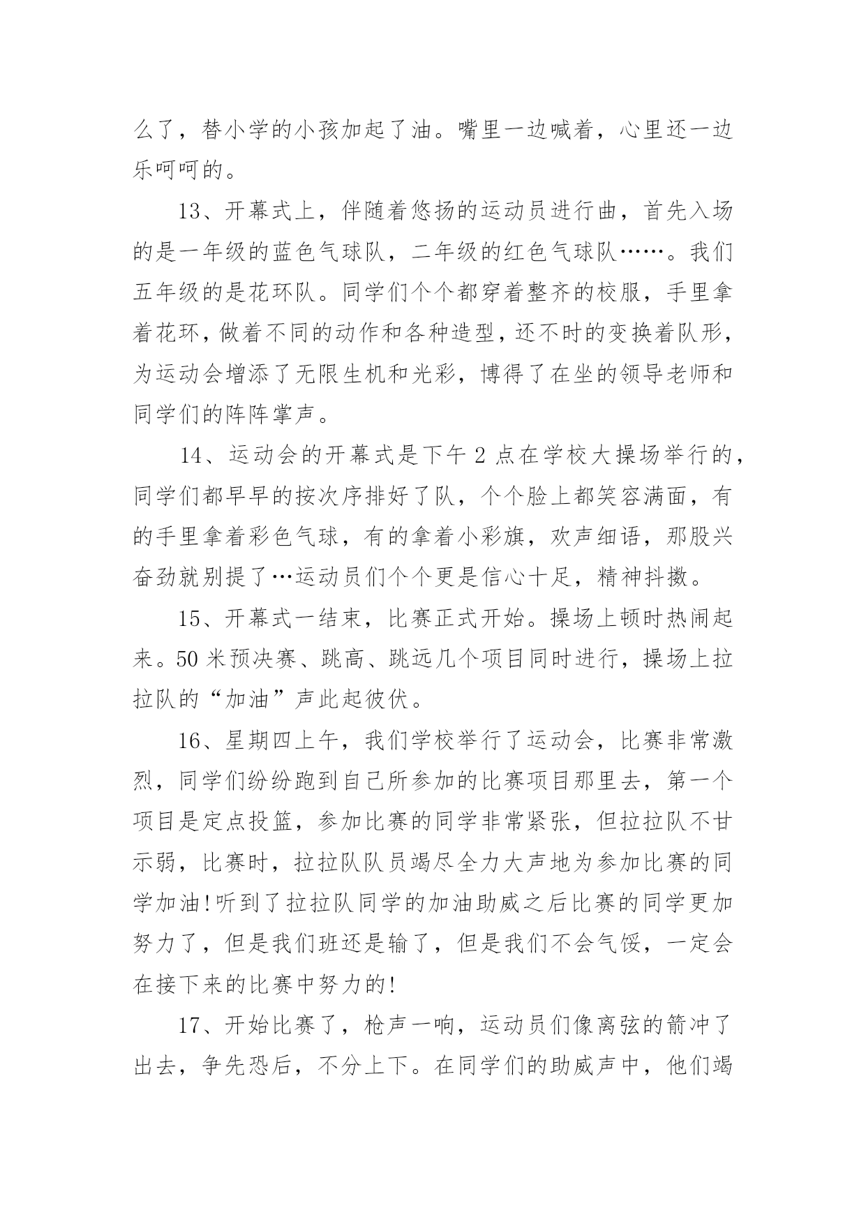 运动会的作文运动会的作文在日常学习、工作和生活中,大家对作文都再熟悉不过了吧,借助作文人们可以反映客观事物、表达思想感情、传递知识信息。相信许多人会觉得作文很难写吧,下面是小编精心整理的运动会的作文4篇,欢迎阅读与收藏。运动会的作文篇11、“砰”的一声枪响,各班的运动员就像离弦的箭一样冲了出去。我们班跑第一棒的同学一眨眼的功夫就逼近了第二棒,跑第二棒的同学飞一般的冲了出去,和别班拉开了一小段距离。2、这次比赛我们班虽然没有取得好的成绩,但是它增强了同学们之间的凝聚力,最重要的是锻炼我们的耐力,信心和顽强拼搏的精神。我们会总结经验和教训,在以后学校的其他活动中为我们班争得更多的荣誉。通过这次的比赛,我充分认识到了,要想得到好的成绩,就得平时多下苦功练习,还要具有坚忍不拔持之以恒的毅力和坚强的信心,我一定要把这种精神运用到我以后的学习和当中去。3、从远处走来的是四个抬旗的男生,他们昂首挺胸,迈着矫健的步伐走着,他们为这个任务感到光荣。然后,走来的是军鼓军号队,他们铿锵有力地敲着军鼓,豪迈大气地吹着军号,这一刻,我们很激动。接下来,是彩旗方队,他们举着在天空中飘舞地彩旗,露出了微笑。最后,是检阅方队,他们迈者整齐的步伐,喊着一致的口号向我们走来。4、在雄壮激昂的乐曲声里,迎着初升的朝阳,校旗队缓缓入场了,他们自信的笑容中,显示着国家的繁荣昌盛,紧随其后的是彩旗队……运动员迈着矫健的步伐进场了,他们坚定的步伐,昂首挺胸,显示出新一代的蓬勃生机,进场以后,校长开始讲话,当校长说到,“运动会现在开始时”,全校都沸腾了。运动员在操场上摩拳擦掌,准备使出浑身解数,为自己的班级争光。5、当大会宣布运动比赛正式开始,整个赛场顿时沸腾起来。你看那田径赛场上的运动员,一个个如矫兔般飞离起点,像利箭般冲向终点,引得在场的观众兴奋不已。女子800米和男子800米是考验选手体力和毅力的项目。在比赛中,选手要面临的不仅是身体上的.考验,更是心理上的考验。参加这个项目的运动员真正体现了努力拼搏,永不服输的体育精神。6、在激昂的乐曲声中,方格队队员踏着矫健的步伐在操场上行进。他们打扮得非常漂亮,从远处一看,就像一朵朵盛开的花儿,老师们跳着韵律操,像蝴蝶翩翩起舞。7、该男子400米长跑了,李文波在起点上准备着,发令员的枪声一响,他就像脱缰的野马,向终点奔去,跑到中间时,李文波听到了同学们的加油声,一下子就变成了飞毛腿,飞快地跑向终点,为我们班又取得了第一名。8、随着一声枪响,第一组参赛男生争先恐后奋力跑着,里面正好有我们班的运动健将杨浩。我们班的女生们站在最前头,举着五个大字:‘六七班加油’高喊:“杨浩,加油!杨浩,加油!……”杨浩终于从后面冲了上来,第一个跃过了终点线!“耶!”我们如此兴奋、如此激动,何不为这个好消息而感到高兴呢?第二组里的邓硕伟也不甘示弱,和着我们的喝彩声,努力拼搏,第四个冲破了终点线!不管他有没有得名次,但在我们心目中,他就是最棒的!9、再看那田径赛场上的运动员,也个个摩拳擦掌,毫不示弱。跳高跳远的运动员为了得到更好的成绩,拼尽全力,即使失败也毫不放弃。他们面对目标跨出坚定的步伐,跳了一次又一次。10、经过全班同学的共同努力,我们班还得了个“道德风尚”奖。其他的单项奖虽然什么也没得到,但我们也觉得没什么,因为,著名作家泰戈尔曾经写过“天空没有留下翅膀的痕迹,而我已飞过。”在最后决赛成绩里没有他们的名字,但是在绿茵场上洒下了自己的汗水和泪水。是呀,也许流星并不少见,但他燃烧的刹那才留给人们最美好的回忆。11、虽然这次春季运动会我们班没有取得理想的成绩,但我坚信通过努力锻炼,将来我们也会成为一名祖国的体育健将。玫瑰虽芬芳,但谁敢轻视芹菜。同学们个个都是祖国的好儿女,将来也会像刘翔一样,为祖国增光添彩!12、运动员们都要排队绕操场一圈,我们只有呆呆的看着他们。可真是无聊,但是,有聊的马上就到,一开始是小学组60米,因为我们以前都是中心小学嘛,所以也不管什么了,替小学的小孩加起了油。嘴里一边喊着,心里还一边乐呵呵的。13、开幕式上,伴随着悠扬的运动员进行曲,首先入场的是一年级的蓝色气球队,二年级的红色气球队……。我们五年级的是花环队。同学们个个都穿着整齐的校服,手里拿着花环,做着不同的动作和各种造型,还不时的变换着队形,为运动会增添了无限生机和光彩,博得了在坐的领导老师和同学们的阵阵掌声。14、运动会的开幕式是下午2点在学校大操场举行的,同学们都早早的按次序排好了队,个个脸上都笑容满面,有的手里拿着彩色气球,有的拿着小彩旗,欢声细语,那股兴奋劲就别提了…运动员们个个更是信心十足,精神抖擞。15、开幕式一结束,比赛正式开始。操场上顿时热闹起来。50米预决赛、跳高、跳远几个项目同时进行,操场上拉拉队的“加油”声此起彼伏。16、星期四上午,我们学校举行