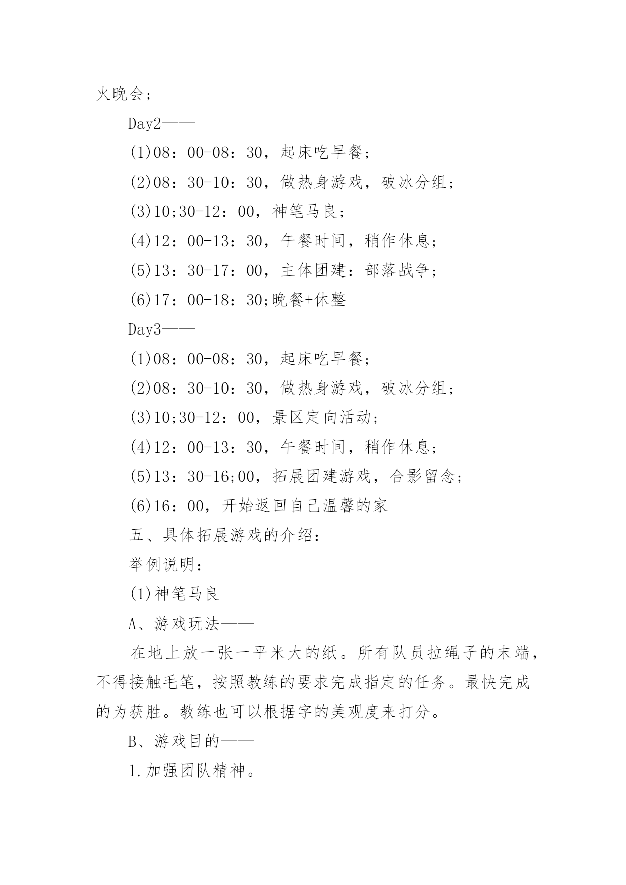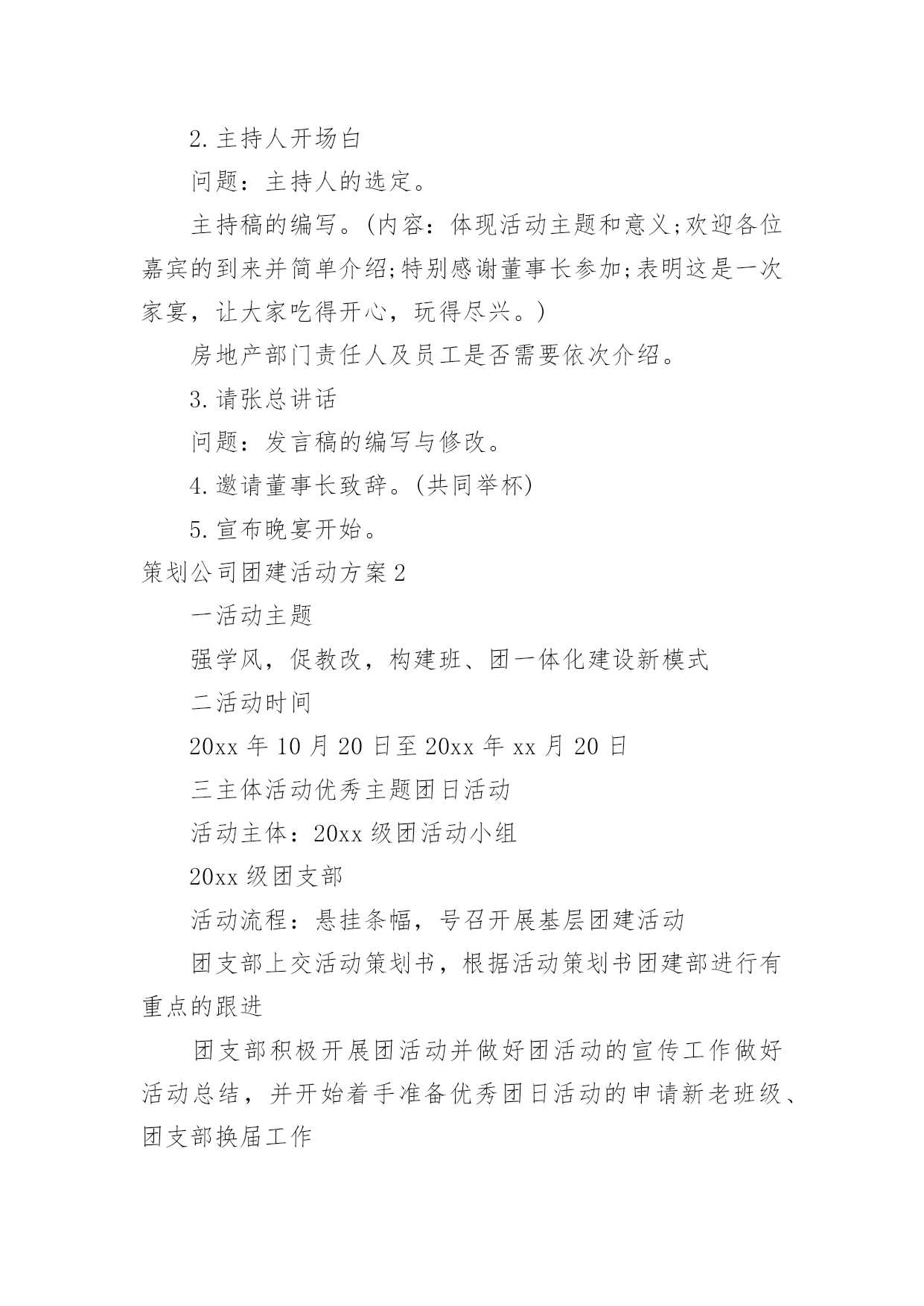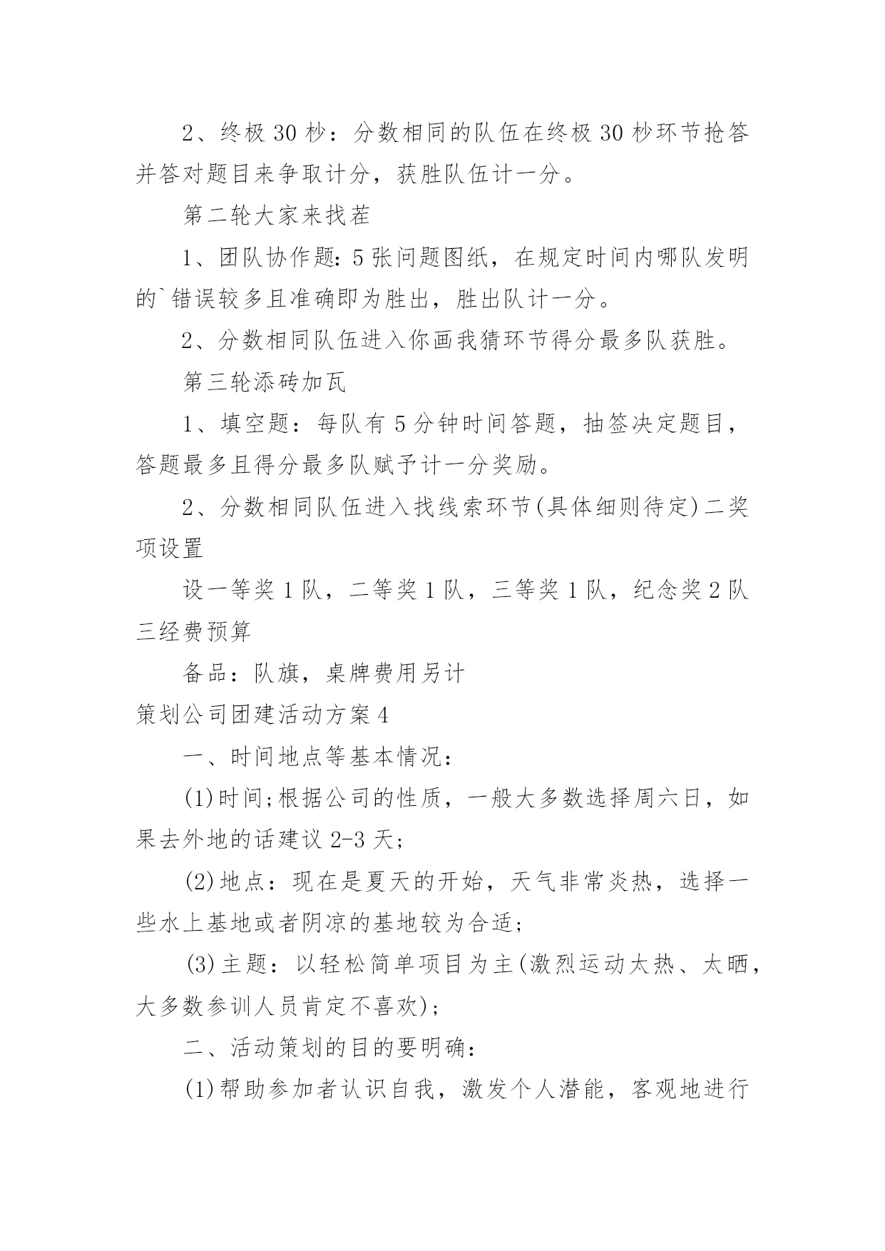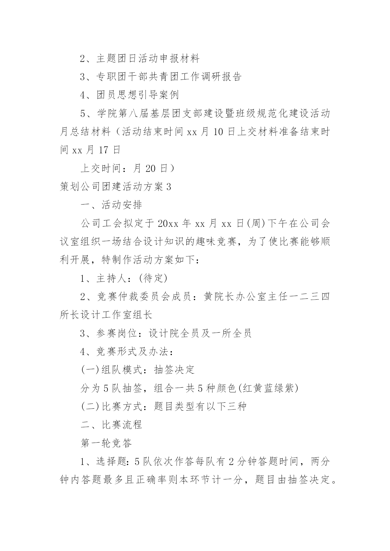 策划公司团建活动方案策划公司团建活动方案(热门)为了确保我们的努力取得实效,通常会被要求事先制定方案,方案是书面计划,具有内容条理清楚、步骤清晰的特点。方案的格式和要求是什么样的呢?下面是小编为大家整理的策划公司团建活动方案,仅供参考,欢迎大家阅读。策划公司团建活动方案1一、活动目的房地产项目发展目前已到关键阶段,为了进一步增进员工情感,加深员工了解,特举办本次聚餐活动,旨在促进员工交流,提高员工的团队意识,进而促进团队的'整体建设与发展,为实现项目工程的品牌塑造和顺利开展提供保障人力保障和智力支持。二、活动地点与时间1.活动地点:大酒店2.活动时间:20xx年xx月xx日晚7:00三、活动方式团队聚餐,席间穿插游戏和节目表演(即兴地表演)。四、活动流程1.欢迎仪式问题:以什么方式迎接董事长入场?嘉宾(各部办、公司领导)的预先邀请,及领导座次安排。2.主持人开场白问题:主持人的选定。主持稿的编写。(内容:体现活动主题和意义;欢迎各位嘉宾的到来并简单介绍;特别感谢董事长参加;表明这是一次家宴,让大家吃得开心,玩得尽兴。)房地产部门责任人及员工是否需要依次介绍。3.请张总讲话问题:发言稿的编写与修改。4.邀请董事长致辞。(共同举杯)5.宣布晚宴开始。策划公司团建活动方案2一活动主题强学风,促教改,构建班、团一体化建设新模式二活动时间20xx年10月20日至20xx年xx月20日三主体活动优秀主题团日活动活动主体:20xx级团活动小组20xx级团支部活动流程:悬挂条幅,号召开展基层团建活动团支部上交活动策划书,根据活动策划书团建部进行有重点的跟进团支部积极开展团活动并做好团活动的宣传工作做好活动总结,并开始着手准备优秀团日活动的申请新老班级、团支部换届工作活动主体:学生会团建部活动流程:收集大一至大四班级、团支部信息做好班团干部信息统计表并写好学院班级团支部换届工作报告上交校团委组织部及学生工作处科学规划团支部建设活动主体:20xx级团支部活动流程:根据“五有”优秀团支部和“四好”红旗团支部的标准各团支部制定团支部发展规划开展团支部交流会,由各团支部的团支书、组织委员、宣传委员进行交流探讨及时总结交流信息与宣传工作开展创先争优活动活动主体:学生会团建部活动流程:团建部联系各大二至大四的优秀团干部、优秀团员进行协商开展关于优秀团支部、优秀团干部、优秀团员的大学自身经历专题演讲,对大一新生进行创先争优的鼓励及指导扎实开展班团干部、团员的.培养教育工作(校团委、学生工作处联合对百名20xx级新生团支部书记、班长进行培训)开展专职团干部“走进基层青年——团干部恳谈日活动(结合我校实际撰写高质量调查报告)7开展好《青年思想引导大纲》转化工作(撰写《×××学院大学生思想引导案例》,案例要包括引导内容、引导目的、核心观点、引导路径、活动案例等内容)三、具体要求:(一)突出主题、形成合力:1、通过在活动中的紧密配合与协调工作,调动学生会成员的积极性,提高工作效率、加强团队意识。2、在活动中挖掘团员的潜力、引入竞争机制培养后备力量,提高团支部的整体能力,使团支部具有更好的创新性和延续性3、各团支部负责人要积极参与并配合好此项工作。(二)加强宣传、营造氛围:1、团建部配合宣传部以各种方式进行宣传,扩大影响力。2、各团支部根据自己拟订的活动方案进行自我宣传,由宣传部配合。体现活动主题,显出我院特色,营造良好活动氛围。3、将各项活动情况及时上传到我校网站,进行宣传,扩大我院的影响力四总结活动做好活动总结,找出出彩点及不足,做好记录并及时准备好各类上报材料并上交五上交材料1、活动月自评表2、主题团日活动申报材料3、专职团干部共青团工作调研报告4、团员思想引导案例5、学院第八届基层团支部建设暨班级规范化建设活动月总结材料(活动结束时间xx月10日上交材料准备结束时间xx月17日上交时间:月20日)策划公司团建活动方案3一、活动安排公司工会拟定于20xx年xx月xx日(周)下午在公司会议室组织一场结合设计知识的趣味竞赛,为了使比赛能够顺利开展,特制作活动方案如下:1、主持人:(待定)2、竞赛仲裁委员会成员:黄院长办公室主任一二三四所长设计工作室组长3、参赛岗位:设计院全员及一所全员4、竞赛形式及办法:(一)组队模式:抽签决定分为5队抽签,组合一共5种颜色(红黄蓝绿紫)(二)比赛方式:题目类型有以下三种二、比赛流程第一轮竞答1、选择题:5队依次作答每队有2分钟答题时间,两分钟内答题最多且正确率则本环节计一分,题目由抽签决定。2、终极30杪:分数相同的队伍在终极30杪环节抢答并答对题目来争取计分,获胜队伍计一分。第二轮大家来找茬1、团队协作题:5张问题图纸,在规定时间内哪队发明的`错误较多且准确即为胜出,胜出队计一分。2、分数相同队伍进入你画我猜环节得分最多队获