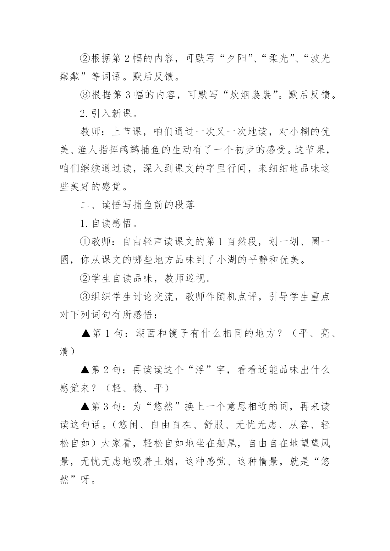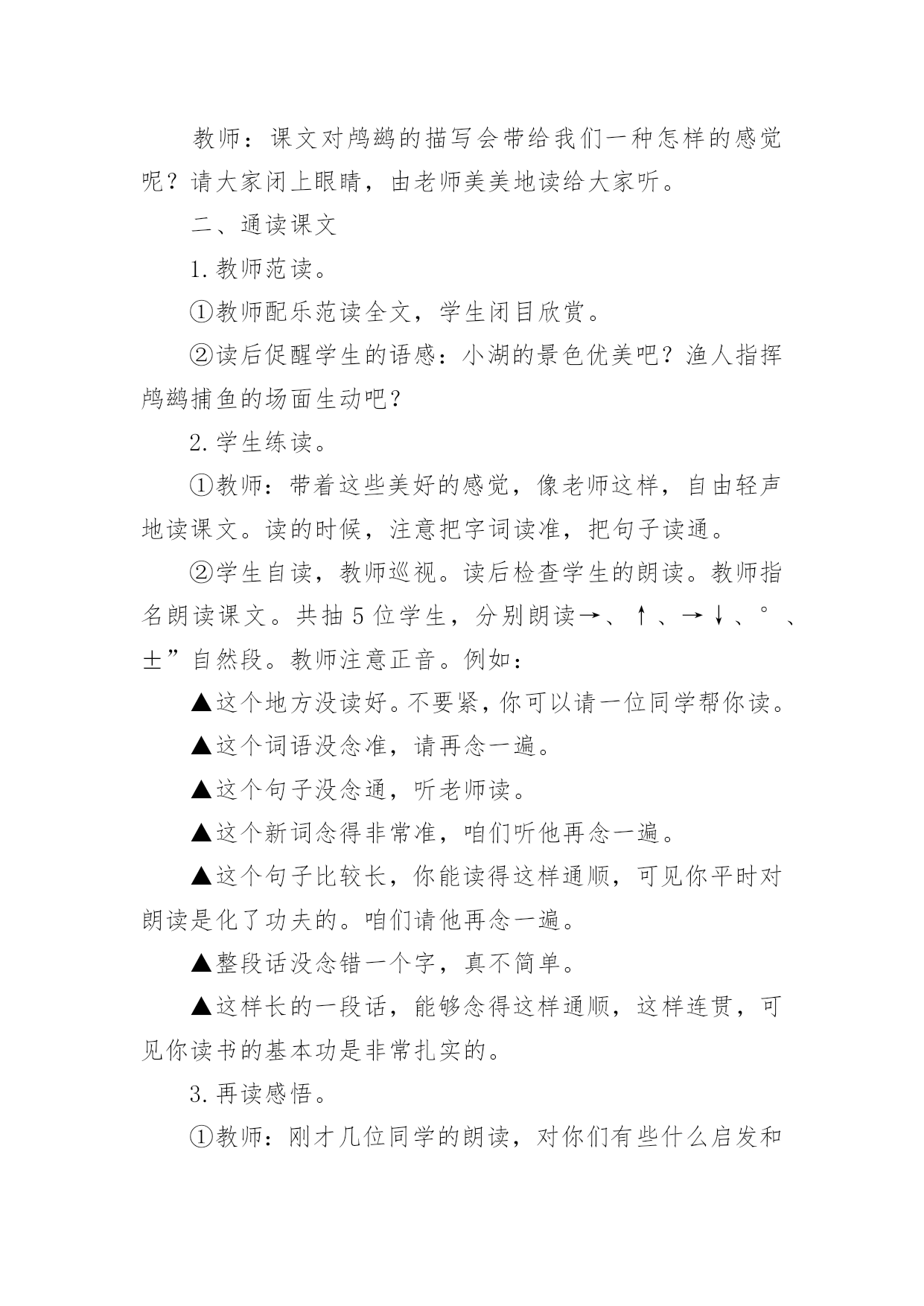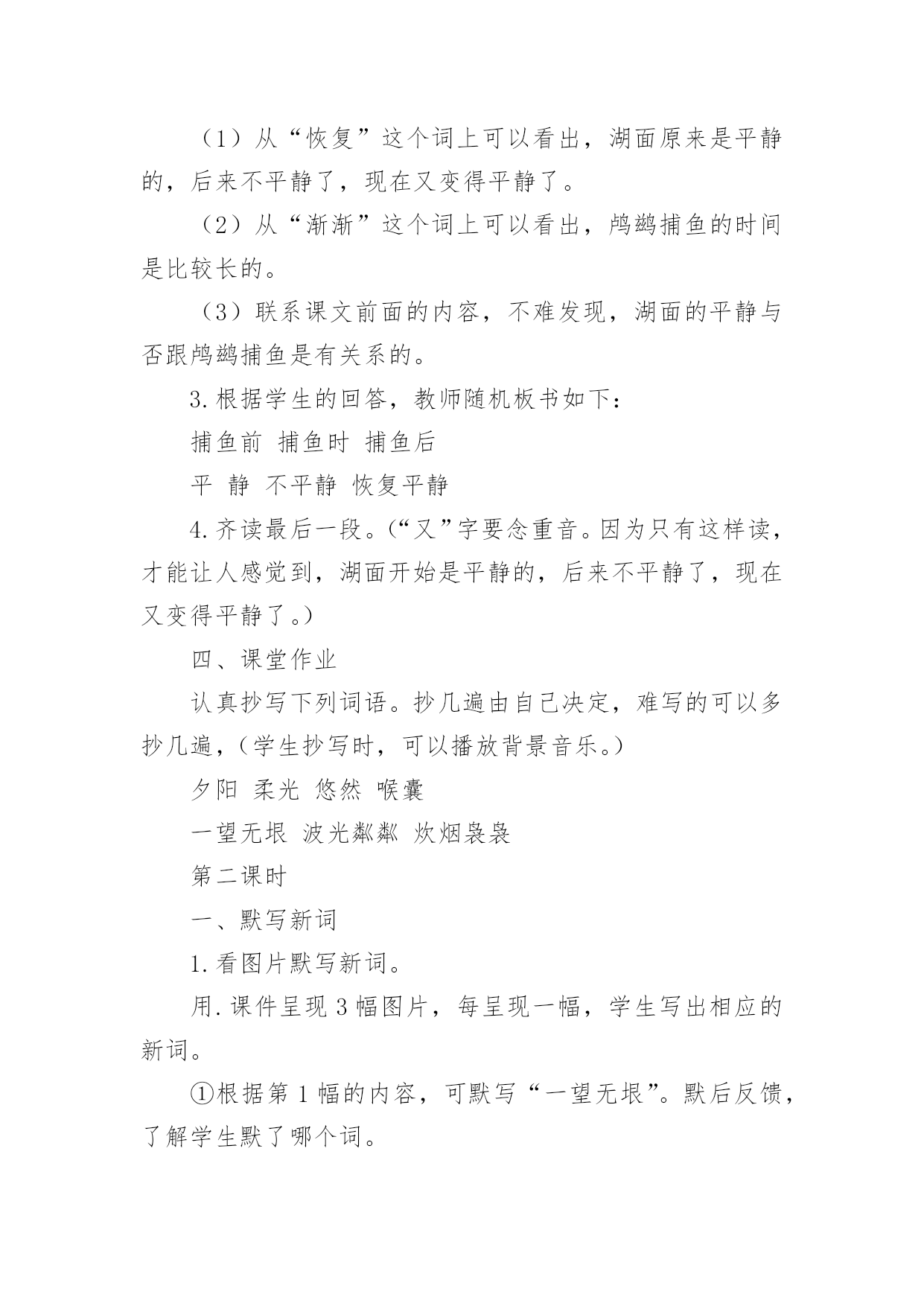 鸬鹚的语文教案设计鸬鹚的语文教案设计鸬鹚的语文教案设计第一课时一、题揭导入1.读好课题。①.课件呈现课题。②教师:今天,咱们一起来学习一篇写得非常优美、非常生动的课文,谁来读读课题?③指多名学生朗读课题,再齐读课题。注意!“鹚”是第二声,不翘舌。2.简介鸬鹚。①教师:鸬鹚是一种不鸟。它们爱吃鱼,也爱捕鱼,而且捕鱼的本领特别高。大家看!这就是鸬鹚。②.课件呈现多幅鸬鹚的照片。③教师:鸬鹚捕到鱼后,就会把鱼吞进自己的喉囊。要是让它继续吞,那鱼就吞到肚子里去了。所以,鸬鹚捕鱼前,渔人得用绳子扎住它的喉囊。捕完鱼后,再把绳子解开。大家看,这就是鸬鹚的喉囊。④.课件呈现出鸬鹚喉囊的位置。⑤教师范写“喉囊”两字,边写边说明书写要领。⑥学生在书的插图旁找一个合适的地方练写“喉囊”。3.引入新课。教师:课文对鸬鹚的描写会带给我们一种怎样的感觉呢?请大家闭上眼睛,由老师美美地读给大家听。二、通读课文1.教师范读。①教师配乐范读全文,学生闭目欣赏。②读后促醒学生的语感:小湖的景色优美吧?渔人指挥鸬鹚捕鱼的场面生动吧?2.学生练读。①教师:带着这些美好的感觉,像老师这样,自由轻声地读课文。读的时候,注意把字词读准,把句子读通。②学生自读,教师巡视。读后检查学生的朗读。教师指名朗读课文。共抽5位学生,分别朗读→、↑、→↓、°、±”自然段。教师注意正音。例如:▲这个地方没读好。不要紧,你可以请一位同学帮你读。▲这个词语没念准,请再念一遍。▲这个句子没念通,听老师读。▲这个新词念得非常准,咱们听他再念一遍。▲这个句子比较长,你能读得这样通顺,可见你平时对朗读是化了功夫的。咱们请他再念一遍。▲整段话没念错一个字,真不简单。▲这样长的一段话,能够念得这样通顺,这样连贯,可见你读书的基本功是非常扎实的。3.再读感悟。①教师:刚才几位同学的朗读,对你们有些什么启发和帮助?(指名回答)②教师:懂得了这些道理,咱们再读读课文,边读边体会,你觉得课文的哪些地方带给你特别优美、特别生动的感觉。③学生自由读全文。④读后组织学生交流各自的感受。4.选段朗读。①教师:读了课文以后,同学们对课文的优美和生动有了更加深刻的感受。但是,同学们的感受又都是与众不同的。大家可以把自己感觉最优美、最生动的那段课文挑出来,美美地读给你的同桌听。听的同学要专心、要投入,边听边想,你最欣赏同桌在哪些地方的朗读。②同桌互读。③教师:哪些同学想情不自禁、真心诚意地夸夸自己的同桌?(抽几对同桌,一人读,一人夸)读后教师小结:能受到别人的夸奖,当然是一件快乐的事儿。但是,你们往往不太清楚,真诚地夸奖别人,其实更能让自己快乐。只要你留心体会,语文课上这样的快乐是很多的。三、揣摩思路1.教师朗读自己最喜欢的一段课文(最后一段)2.鼓励学生多元解读:请大家再读读这段课文,看看你能从这短短的17个字当中读出多少东西来。学生解读的结果可作如下推想:(1)从“恢复”这个词上可以看出,湖面原来是平静的,后来不平静了,现在又变得平静了。(2)从“渐渐”这个词上可以看出,鸬鹚捕鱼的时间是比较长的。(3)联系课文前面的内容,不难发现,湖面的平静与否跟鸬鹚捕鱼是有关系的。3.根据学生的回答,教师随机板书如下:捕鱼前捕鱼时捕鱼后平静不平静恢复平静4.齐读最后一段。(“又”字要念重音。因为只有这样读,才能让人感觉到,湖面开始是平静的,后来不平静了,现在又变得平静了。)四、课堂作业认真抄写下列词语。抄几遍由自己决定,难写的可以多抄几遍,(学生抄写时,可以播放背景音乐。)夕阳柔光悠然喉囊一望无垠波光粼粼炊烟袅袅第二课时一、默写新词1.看图片默写新词。用.课件呈现3幅图片,每呈现一幅,学生写出相应的新词。①根据第1幅的内容,可默写“一望无垠”。默后反馈,了解学生默了哪个词。②根据第2幅的内容,可默写“夕阳”、“柔光”、“波光粼粼”等词语。默后反馈。③根据第3幅的内容,可默写“炊烟袅袅”。默后反馈。2.引入新课。教师:上节课,咱们通过一次又一次地读,对小糊的优美、渔人指挥鸬鹚捕鱼的生动有了一个初步的感受。这节果,咱们继续通过读,深入到课文的字里行间,来细细地品味这些美好的感觉。二、读悟写捕鱼前的段落1.自读感悟。①教师:自由轻声读课文的第1自然段,划一划、圈一圈,你从课文的哪些地方品味到了小湖的平静和优美。②学生自读品味,教师巡视。③组织学生讨论交流,教师作随机点评,引导学生重点对下列词句有所感悟:▲第1句:湖面和镜子有什么相同的地方?(平、亮、清)▲第2句:再读读这个“浮”字,看看还能品味出什么感觉来?(轻、稳、平)▲第3句:为“悠然”换上一个意思相近的词,再来读读这句话。(悠闲、自由自在、舒服、无忧无虑、从容、轻松自如)大家看,轻松自如地坐在船尾,自由自在地望望风景,无忧无虑地吸着土烟,这种感觉、这种情景,就是“悠然”呀。④在