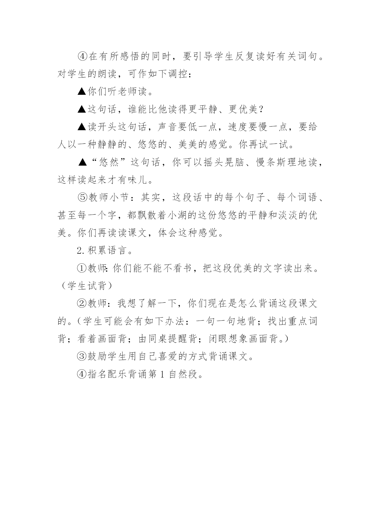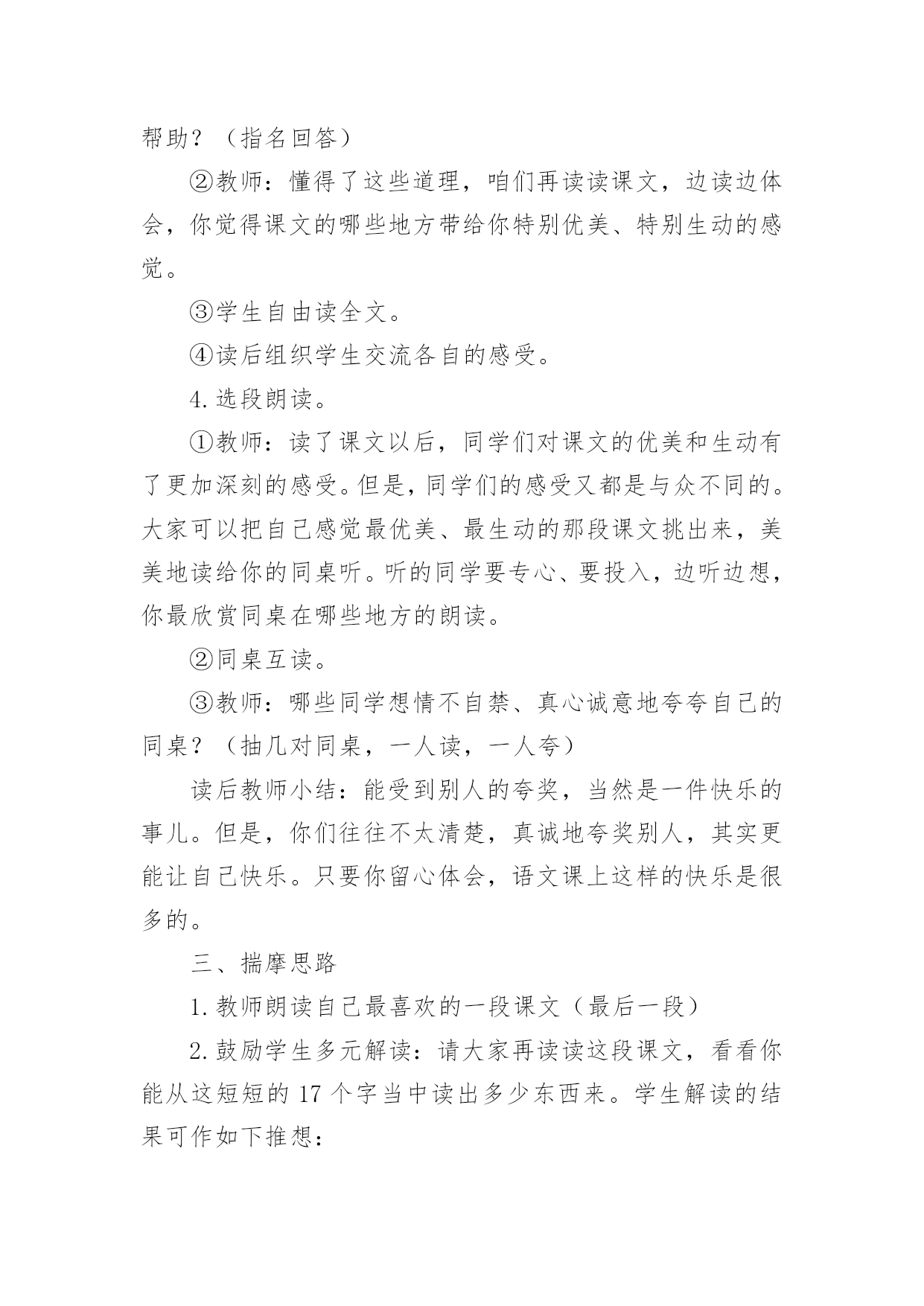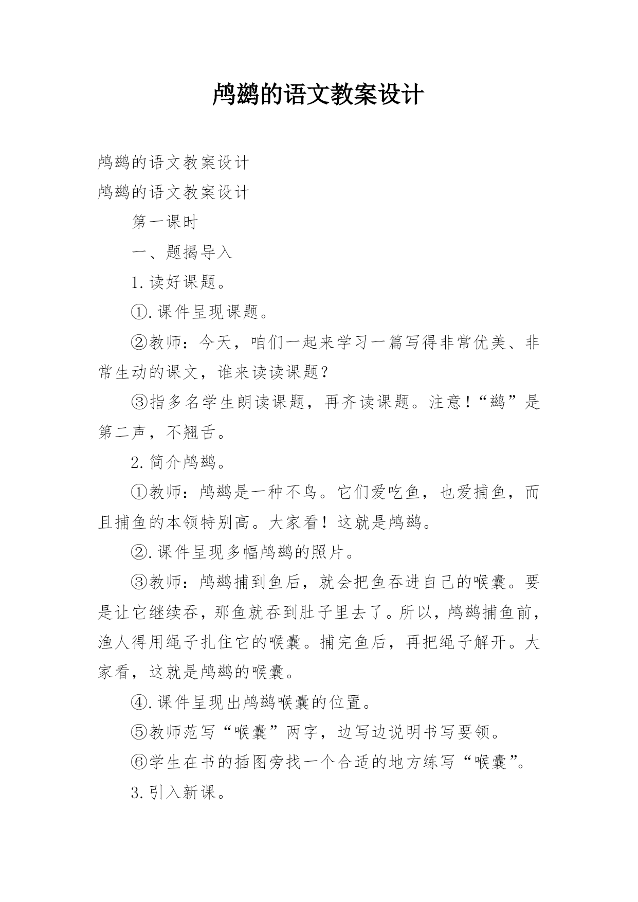 鸬鹚的语文教案设计鸬鹚的语文教案设计鸬鹚的语文教案设计第一课时一、题揭导入1.读好课题。①.课件呈现课题。②教师:今天,咱们一起来学习一篇写得非常优美、非常生动的课文,谁来读读课题?③指多名学生朗读课题,再齐读课题。注意!“鹚”是第二声,不翘舌。2.简介鸬鹚。①教师:鸬鹚是一种不鸟。它们爱吃鱼,也爱捕鱼,而且捕鱼的本领特别高。大家看!这就是鸬鹚。②.课件呈现多幅鸬鹚的照片。③教师:鸬鹚捕到鱼后,就会把鱼吞进自己的喉囊。要是让它继续吞,那鱼就吞到肚子里去了。所以,鸬鹚捕鱼前,渔人得用绳子扎住它的喉囊。捕完鱼后,再把绳子解开。大家看,这就是鸬鹚的喉囊。④.课件呈现出鸬鹚喉囊的位置。⑤教师范写“喉囊”两字,边写边说明书写要领。⑥学生在书的插图旁找一个合适的地方练写“喉囊”。3.引入新课。教师:课文对鸬鹚的描写会带给我们一种怎样的感觉呢?请大家闭上眼睛,由老师美美地读给大家听。二、通读课文1.教师范读。①教师配乐范读全文,学生闭目欣赏。②读后促醒学生的语感:小湖的景色优美吧?渔人指挥鸬鹚捕鱼的场面生动吧?2.学生练读。①教师:带着这些美好的感觉,像老师这样,自由轻声地读课文。读的时候,注意把字词读准,把句子读通。②学生自读,教师巡视。读后检查学生的朗读。教师指名朗读课文。共抽5位学生,分别朗读→、↑、→↓、°、±”自然段。教师注意正音。例如:▲这个地方没读好。不要紧,你可以请一位同学帮你读。▲这个词语没念准,请再念一遍。▲这个句子没念通,听老师读。▲这个新词念得非常准,咱们听他再念一遍。▲这个句子比较长,你能读得这样通顺,可见你平时对朗读是化了功夫的。咱们请他再念一遍。▲整段话没念错一个字,真不简单。▲这样长的一段话,能够念得这样通顺,这样连贯,可见你读书的基本功是非常扎实的。3.再读感悟。①教师:刚才几位同学的朗读,对你们有些什么启发和帮助?(指名回答)②教师:懂得了这些道理,咱们再读读课文,边读边体会,你觉得课文的哪些地方带给你特别优美、特别生动的感觉。③学生自由读全文。④读后组织学生交流各自的感受。4.选段朗读。①教师:读了课文以后,同学们对课文的优美和生动有了更加深刻的感受。但是,同学们的感受又都是与众不同的。大家可以把自己感觉最优美、最生动的那段课文挑出来,美美地读给你的同桌听。听的同学要专心、要投入,边听边想,你最欣赏同桌在哪些地方的朗读。②同桌互读。③教师:哪些同学想情不自禁、真心诚意地夸夸自己的同桌?(抽几对同桌,一人读,一人夸)读后教师小结:能受到别人的夸奖,当然是一件快乐的事儿。但是,你们往往不太清楚,真诚地夸奖别人,其实更能让自己快乐。只要你留心体会,语文课上这样的快乐是很多的。三、揣摩思路1.教师朗读自己最喜欢的一段课文(最后一段)2.鼓励学生多元解读:请大家再读读这段课文,看看你能从这短短的17个字当中读出多少东西来。学生解读的结果可作如下推想:(1)从“恢复”这个词上可以看出,湖面原来是平静的,后来不平静了,现在又变得平静了。(2)从“渐渐”这个词上可以看出,鸬鹚捕鱼的时间是比较长的。(3)联系课文前面的内容,不难发现,湖面的平静与否跟鸬鹚捕鱼是有关系的。3.根据学生的回答,教师随机板书如下:捕鱼前捕鱼时捕鱼后平静不平静恢复平静4.齐读最后一段。(“又”字要念重音。因为只有这样读,才能让人感觉到,湖面开始是平静的,后来不平静了,现在又变得平静了。)四、课堂作业认真抄写下列词语。抄几遍由自己决定,难写的可以多抄几遍,(学生抄写时,可以播放背景音乐。)夕阳柔光悠然喉囊一望无垠波光粼粼炊烟袅袅第二课时一、默写新词1.看图片默写新词。用.课件呈现3幅图片,每呈现一幅,学生写出相应的新词。①根据第1幅的内容,可默写“一望无垠”。默后反馈,了解学生默了哪个词。②根据第2幅的内容,可默写“夕阳”、“柔光”、“波光粼粼”等词语。默后反馈。③根据第3幅的内容,可默写“炊烟袅袅”。默后反馈。2.引入新课。教师:上节课,咱们通过一次又一次地读,对小糊的优美、渔人指挥鸬鹚捕鱼的生动有了一个初步的感受。这节果,咱们继续通过读,深入到课文的字里行间,来细细地品味这些美好的感觉。二、读悟写捕鱼前的段落1.自读感悟。①教师:自由轻声读课文的第1自然段,划一划、圈一圈,你从课文的哪些地方品味到了小湖的平静和优美。②学生自读品味,教师巡视。③组织学生讨论交流,教师作随机点评,引导学生重点对下列词句有所感悟:▲第1句:湖面和镜子有什么相同的地方?(平、亮、清)▲第2句:再读读这个“浮”字,看看还能品味出什么感觉来?(轻、稳、平)▲第3句:为“悠然”换上一个意思相近的词,再来读读这句话。(悠闲、自由自在、舒服、无忧无虑、从容、轻松自如)大家看,轻松自如地坐在船尾,自由自在地望望风景,无忧无虑地吸着土烟,这种感觉、这种情景,就是“悠然”呀。④在