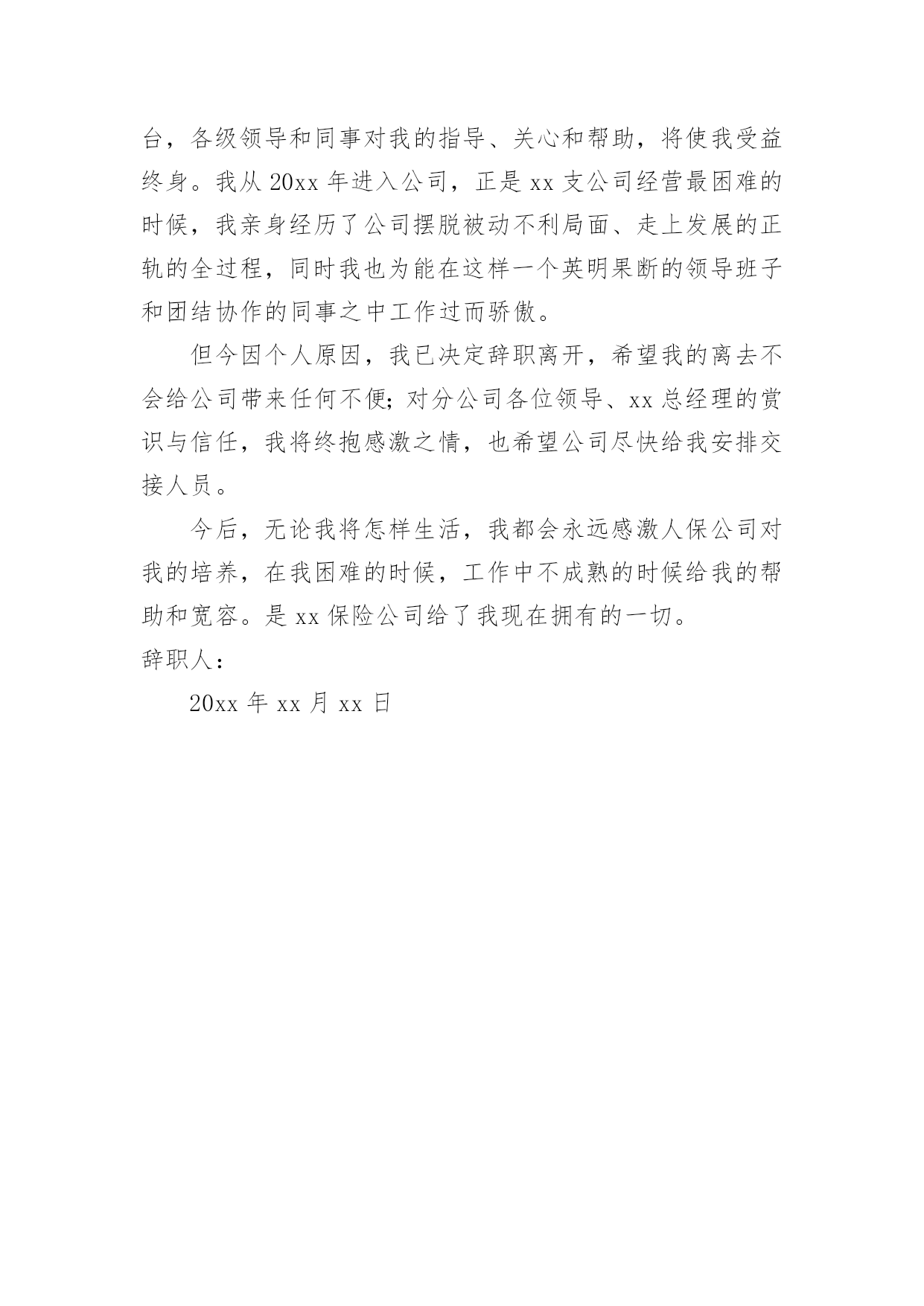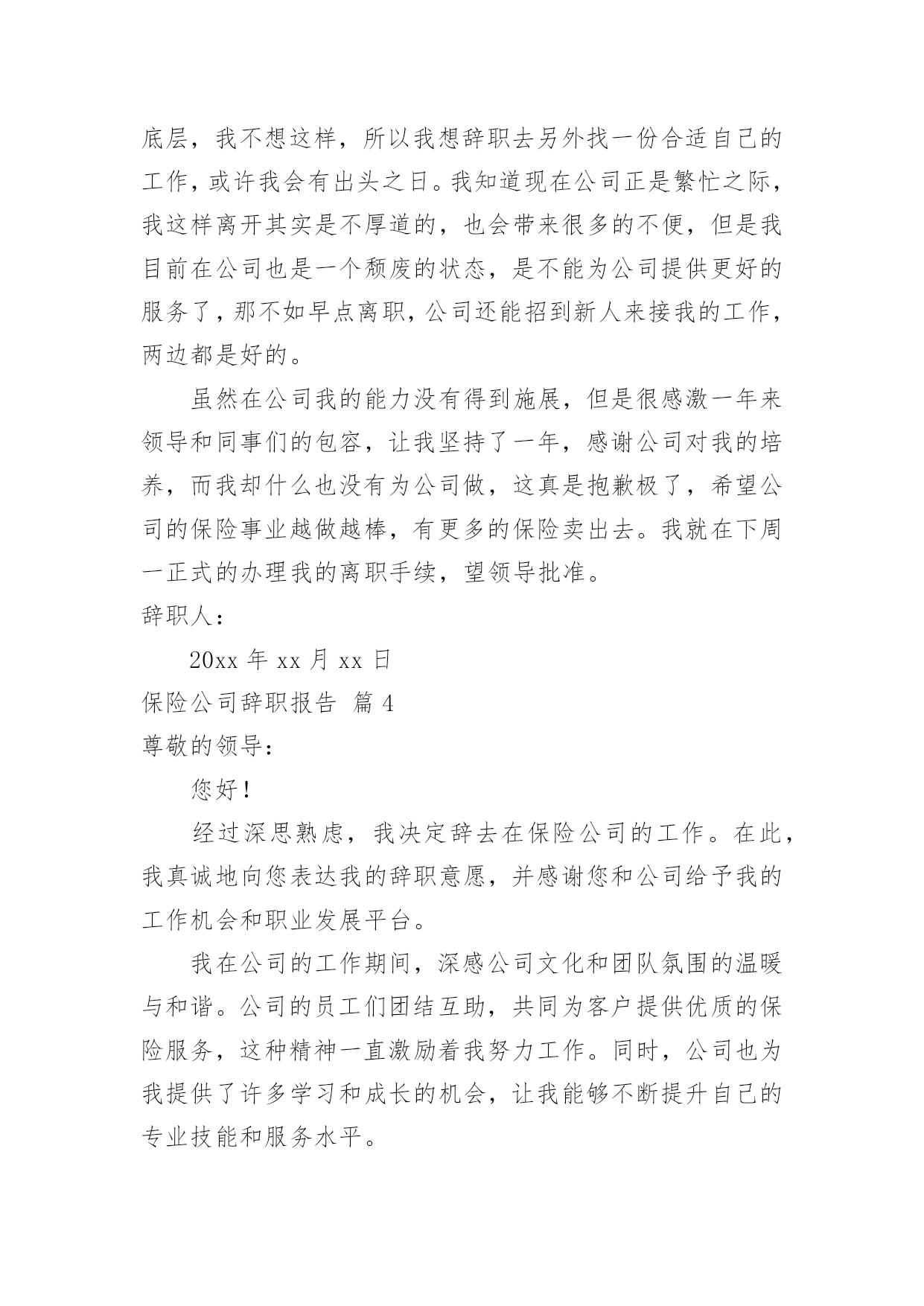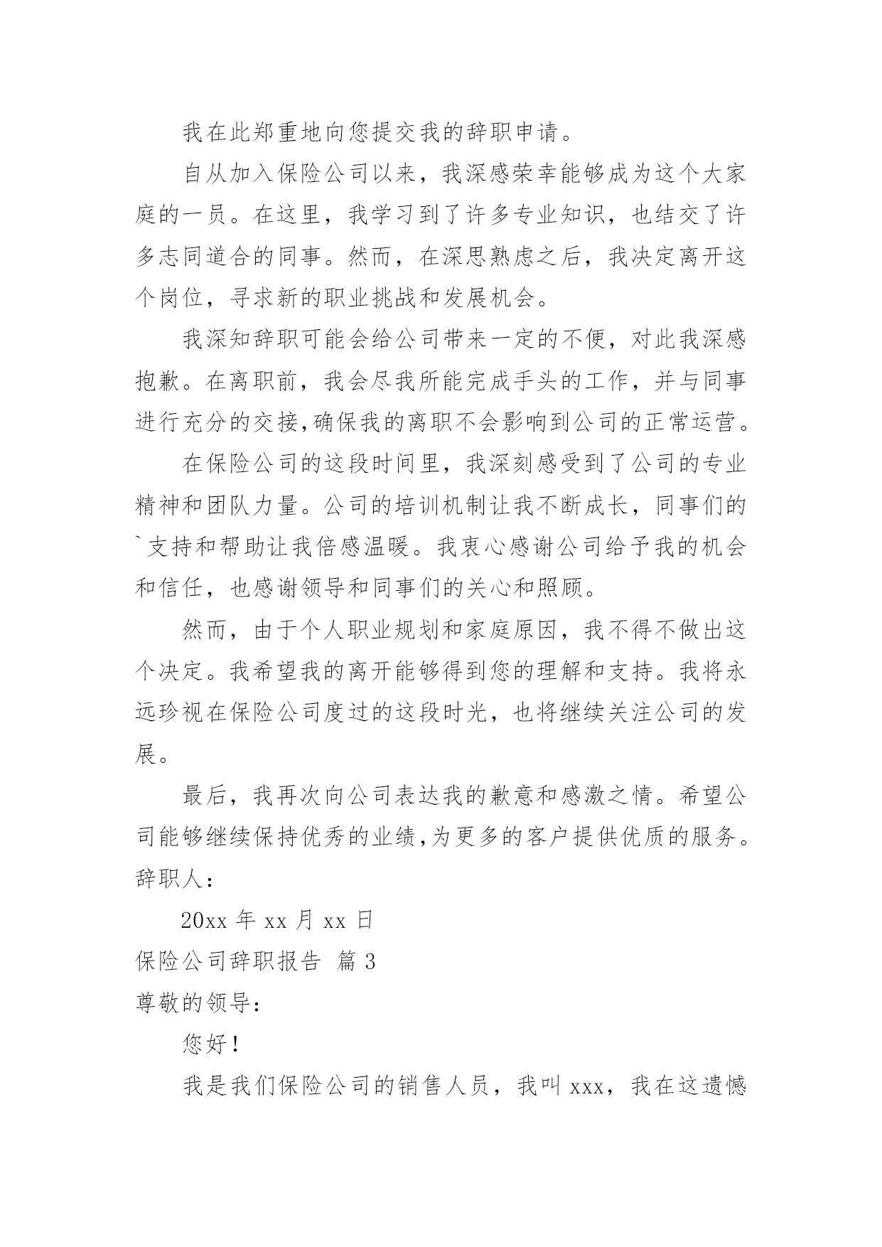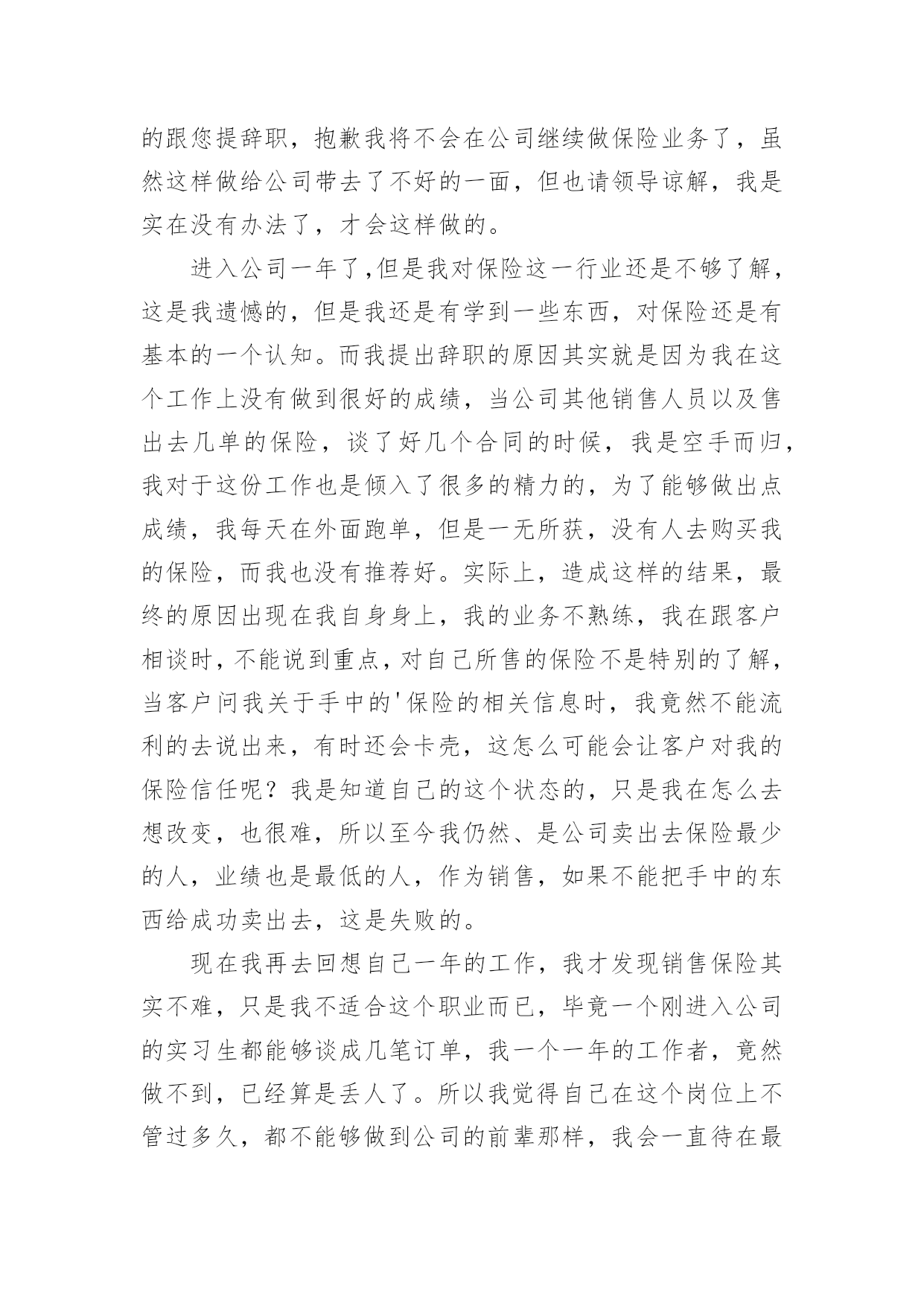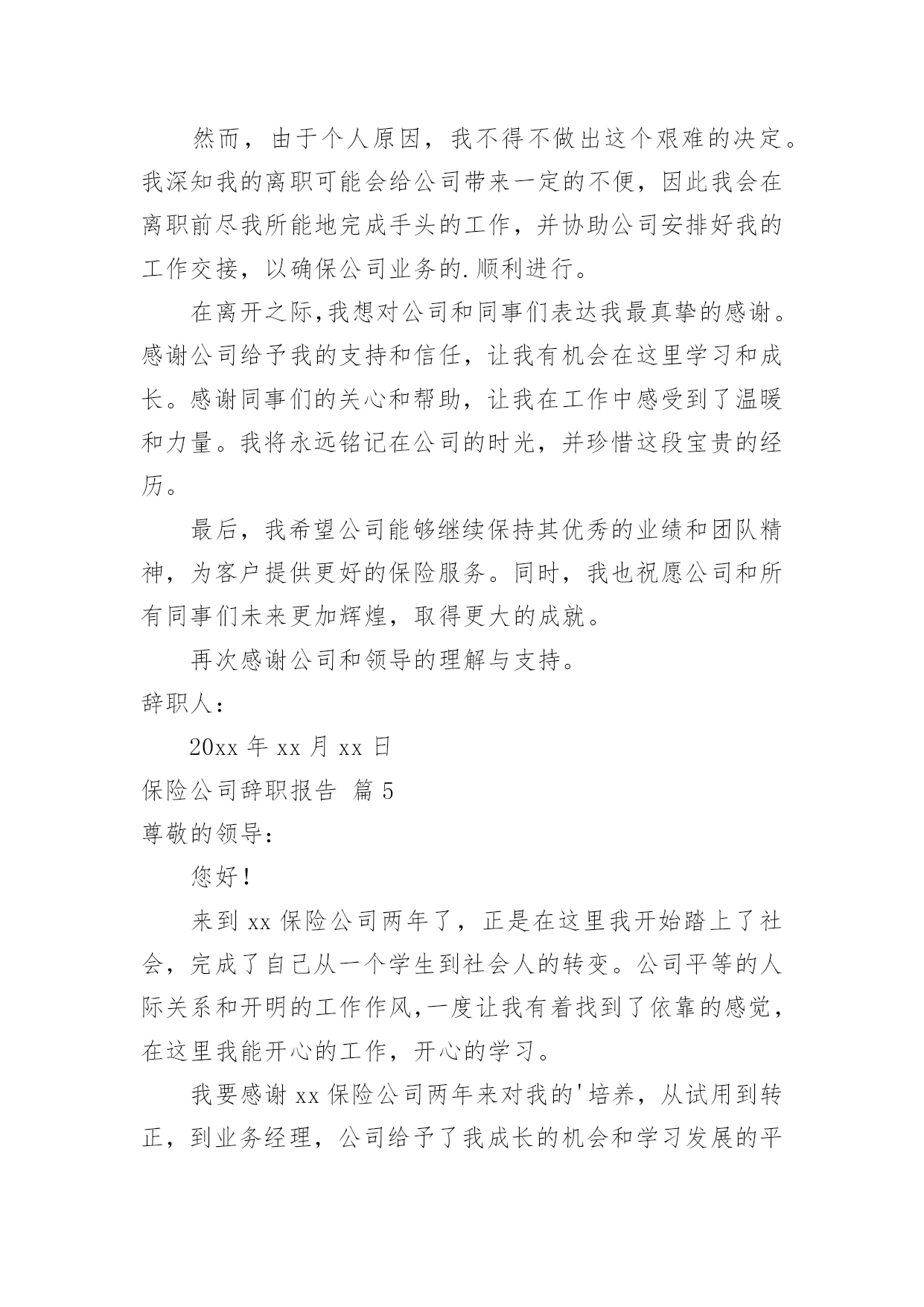保险公司辞职报告保险公司辞职报告大全(5篇)随着社会一步步向前发展,需要使用报告的情况越来越多,报告具有语言陈述性的特点。那么,报告到底怎么写才合适呢?以下是小编精心整理的保险公司辞职报告,仅供参考,欢迎大家阅读。保险公司辞职报告篇1尊敬的领导:您好!在我们公司工作已经有六个月,实习也已经结束,在这个工作过程中,我也了解了工作,同时对自己也有了一个新的认真,这是一个相互选择的过程,公司选择我们。我们也选择公司,我发现自己并不适应这份工作,所以经过了考虑之后我决定在实习结束时提出离职。我们保险行业竞争也非常激烈,每天我们都有一定的销售目标,必须要完成目标才能够完成任务,作为来到公司的新人,我按照了公司的的要求去做,但是经过了几个月时间的练习和努力总是存在这很多不足,第一个就是感到自己个部门拖后腿了,第二个就是没有完成任务的内疚,最后就是自己对这份工作并不喜欢,虽然工作是好工作,但是我发现不适合我,也不利于我的成长,所以最终我决定离开。对于公司我还是非常认可的,公司给我们的福利和待遇都是很好的`,但是因为自己的原因,我并没有做好工作,虽然我已经毕业,但是这还是我的第一份工作,我的专业也不是保险相关的行业,来到公司也是一次偶然,我曾经想要融入到公司,但是自己却总是不能把心镇静下来,能力一直都得不到多大的提升,工作以来也都没有多大成绩,我自己也感到了内疚,不想继续这样下去,同时也不希望自己的专业就此荒废,学习了四年,基础还是相对扎实的,我还是有信心能够找到合适的专业。离开之时感觉有负领导的`安排,领导对我也想当的关照,但是我觉得继续下去我的发展空间也不大,自己束缚了自己,没有走出这个圈,想要改变也比较困难,与其在岗位上继续耗着,还不如另做突破,改变环境,改变方式,做一个全新的选择,或许对我来说更加合适也说不定。当挥手道别时,感觉有很多话堵在了喉咙里无法述说,因为毕竟在公司生活了六个月时间,留下了很多回忆,留下了很多美好,想要轻轻放下实在有些不舍,但是人要向前看,与其一直踟蹰不前,还不如果断一点,当断不断,反而受累,这不是我所愿,对于这样的选择知道领导会有意见,但是这也是我的选择,还请领导能够尊重我的选择,在说保险行业需要的是敢拼有能力的人,需要有结果的人,我离开反而对公司大有裨益,可以招纳新血,在这里轻轻的说一声再见。辞职人:20xx年xx月xx日保险公司辞职报告篇2尊敬的公司领导:我在此郑重地向您提交我的辞职申请。自从加入保险公司以来,我深感荣幸能够成为这个大家庭的一员。在这里,我学习到了许多专业知识,也结交了许多志同道合的同事。然而,在深思熟虑之后,我决定离开这个岗位,寻求新的职业挑战和发展机会。我深知辞职可能会给公司带来一定的不便,对此我深感抱歉。在离职前,我会尽我所能完成手头的工作,并与同事进行充分的交接,确保我的离职不会影响到公司的正常运营。在保险公司的这段时间里,我深刻感受到了公司的专业精神和团队力量。公司的培训机制让我不断成长,同事们的`支持和帮助让我倍感温暖。我衷心感谢公司给予我的机会和信任,也感谢领导和同事们的关心和照顾。然而,由于个人职业规划和家庭原因,我不得不做出这个决定。我希望我的离开能够得到您的理解和支持。我将永远珍视在保险公司度过的这段时光,也将继续关注公司的发展。最后,我再次向公司表达我的歉意和感激之情。希望公司能够继续保持优秀的业绩,为更多的客户提供优质的服务。辞职人:20xx年xx月xx日保险公司辞职报告篇3尊敬的领导:您好!我是我们保险公司的销售人员,我叫xxx,我在这遗憾的跟您提辞职,抱歉我将不会在公司继续做保险业务了,虽然这样做给公司带去了不好的一面,但也请领导谅解,我是实在没有办法了,才会这样做的。进入公司一年了,但是我对保险这一行业还是不够了解,这是我遗憾的,但是我还是有学到一些东西,对保险还是有基本的一个认知。而我提出辞职的原因其实就是因为我在这个工作上没有做到很好的成绩,当公司其他销售人员以及售出去几单的保险,谈了好几个合同的时候,我是空手而归,我对于这份工作也是倾入了很多的精力的,为了能够做出点成绩,我每天在外面跑单,但是一无所获,没有人去购买我的保险,而我也没有推荐好。实际上,造成这样的结果,最终的原因出现在我自身身上,我的业务不熟练,我在跟客户相谈时,不能说到重点,对自己所售的保险不是特别的了解,当客户问我关于手中的'保险的相关信息时,我竟然不能流利的去说出来,有时还会卡壳,这怎么可能会让客户对我的保险信任呢?我是知道自己的这个状态的,只是我在怎么去想改变,也很难,所以至今我仍然、是公司卖出去保险最少的人,业绩也是最低的人,作为销售,如果不能把手中的东西给成功卖出去,这是失败的。现在我再去回想自己一年的工作,我才发现销售保险其实不难,只是我不适合这个职业而已,毕竟一个刚进入公司
