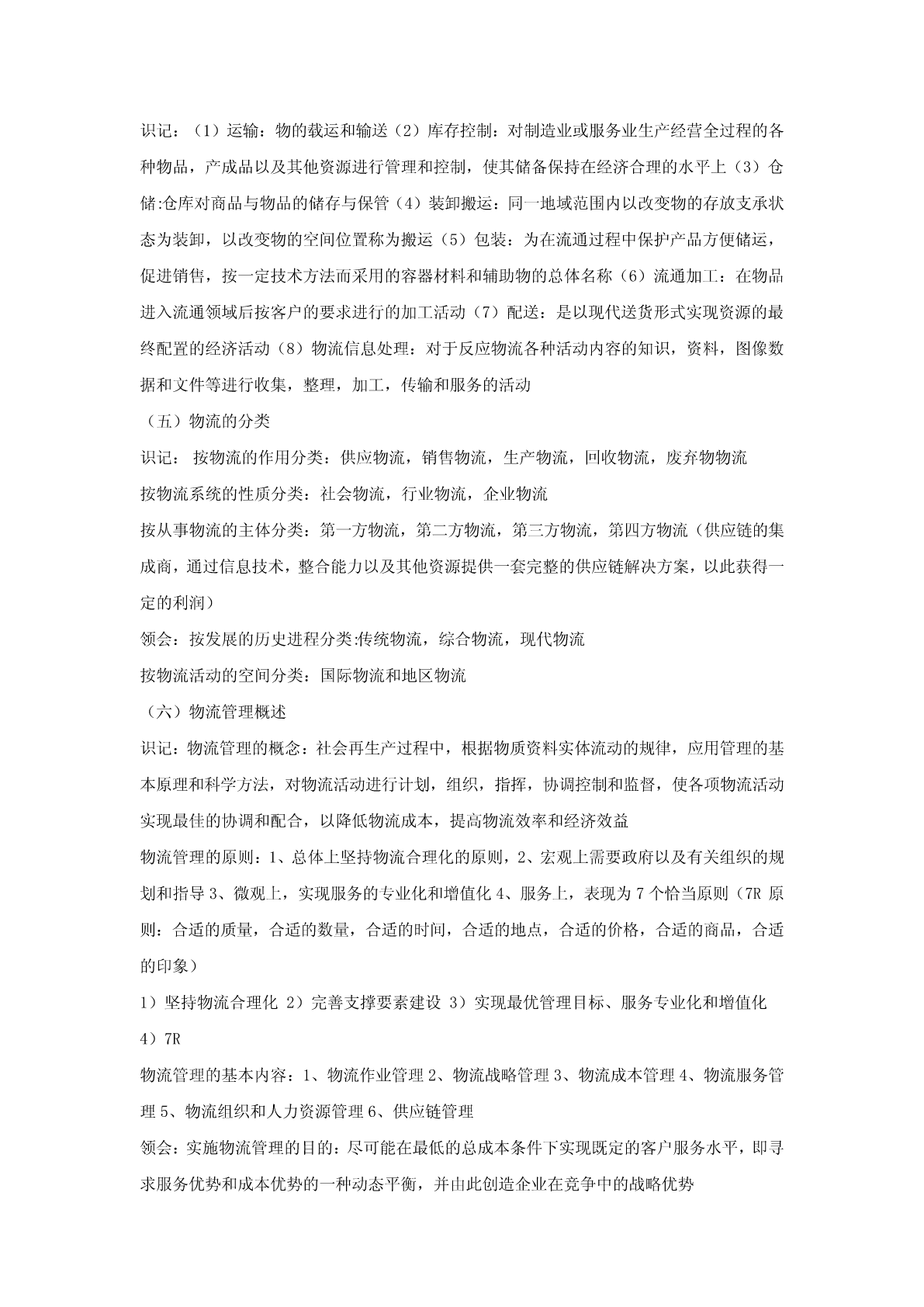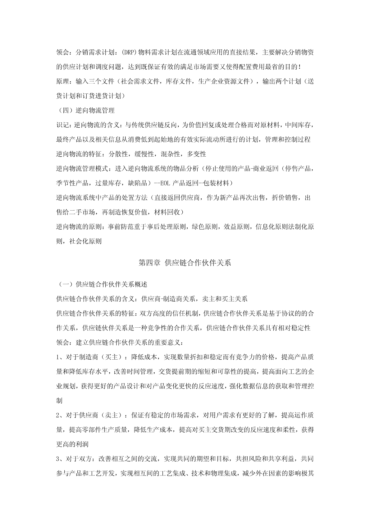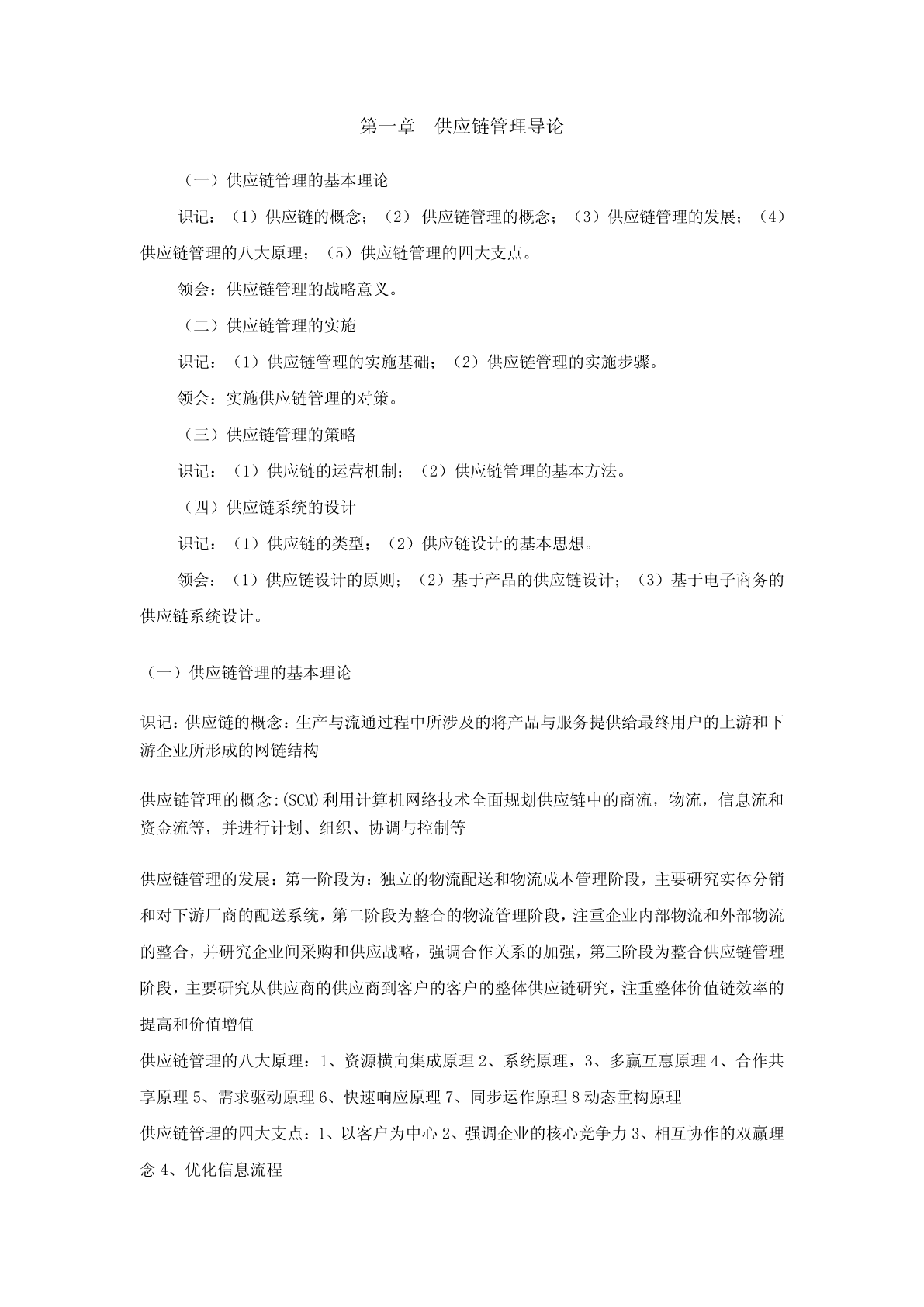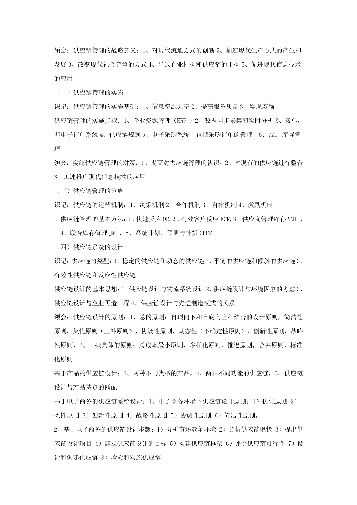 第一章供应链管理导论(一)供应链管理的基本理论识记:(1)供应链的概念;(2)供应链管理的概念;(3)供应链管理的发展;(4)供应链管理的八大原理;(5)供应链管理的四大支点。领会:供应链管理的战略意义。(二)供应链管理的实施识记:(1)供应链管理的实施基础;(2)供应链管理的实施步骤。领会:实施供应链管理的对策。(三)供应链管理的策略识记:(1)供应链的运营机制;(2)供应链管理的基本方法。(四)供应链系统的设计识记:(1)供应链的类型;(2)供应链设计的基本思想。领会:(1)供应链设计的原则;(2)基于产品的供应链设计;(3)基于电子商务的供应链系统设计。(一)供应链管理的基本理论识记:供应链的概念:生产与流通过程中所涉及的将产品与服务提供给最终用户的上游和下游企业所形成的网链结构供应链管理的概念:(SCM)利用计算机网络技术全面规划供应链中的商流,物流,信息流和资金流等,并进行计划、组织、协调与控制等供应链管理的发展:第一阶段为:独立的物流配送和物流成本管理阶段,主要研究实体分销和对下游厂商的配送系统,第二阶段为整合的物流管理阶段,注重企业内部物流和外部物流的整合,并研究企业间采购和供应战略,强调合作关系的加强,第三阶段为整合供应链管理阶段,主要研究从供应商的供应商到客户的客户的整体供应链研究,注重整体价值链效率的提高和价值增值供应链管理的八大原理:1、资源横向集成原理2、系统原理,3、多赢互惠原理4、合作共享原理5、需求驱动原理6、快速响应原理7、同步运作原理8动态重构原理供应链管理的四大支点:1、以客户为中心2、强调企业的核心竞争力3、相互协作的双赢理念4、优化信息流程领会:供应链管理的战略意义:1、对现代流通方式的创新2、加速现代生产方式的产生和发展3、改变现代社会竞争的方式4、导致企业机构和供应链的重构5、促进现代信息技术的应用(二)供应链管理的实施识记:供应链管理的实施基础:1、信息资源共享2、提高服务质量3、实现双赢供应链管理的实施步骤:1、企业资源管理(ERP)2、数据同步采集和实时分析3、接单,即电子订单系统4、供应链规划5、电子采购系统,包括采购订单的管理,6、VMI库存管理领会:实施供应链管理的对策:1、提高对供应链管理的认识,2、对现有的供应链进行整合3、加速推广现代信息技术的应用(三)供应链管理的策略识记:供应链的运营机制:1、决策机制2、合作机制3、自律机制4、激励机制供应链管理的基本方法:1、快速反应QR,2、有效客户反应ECR,3、供应商管理库存VMI,4、联合库存管理JMI,5、系统计划、预测与补货CPFR(四)供应链系统的设计识记:供应链的类型:1、稳定的供应链和动态的供应链2、平衡的供应链和倾斜的供应链3、有效性供应链和反应性供应链供应链设计的基本思想:1、供应链设计与物流系统设计2、供应链设计与环境因素的考虑3、供应链设计与企业再造工程4、供应链设计与先进制造模式的关系领会:供应链设计的原则:1、总的原则:自顶向下和自底向上相结合的设计原则,简洁性原则,集优原则(互补原则),协调性原则,动态性(不确定性原则),创新性原则,战略性原则,2、一些具体的原则:总成本最小原则,多样化原则,推迟原则,合并原则,标准化原则基于产品的供应链设计:1、两种不同类型的产品,2、两种不同功能的供应链,3、供应链设计与产品特点的匹配基于电子商务的供应链系统设计:1、电子商务环境下供应链设计原则:1)优化原则2)柔性原则3)创新性原则4)战略性原则5)协调性原则6)简洁性原则,2、基于电子商务的供应链设计步骤:1)分析市场竞争环境2)分析供应链现状3)提出供应链设计项目4)建立供应链设计的目标5)构建供应链框架6)评价供应链可行性7)设计和创建供应链8)检验和实施供应链基于电子商务的供应链设计的重构策略:组织重构、流程重构、资源重构第二章物流概述(一)物流的发展过程识记:物流概念的产生:最早是在英国文献中记载,最早是军事需要出发,战时军火供应物流概念的发展:三个阶段:1、物流概念的孕育阶段2、分销物流学阶段3、现代物流学阶段物流的含义:指物品从供应地向接收地的实体流动过程,根据实际需要将运输,储存,装卸,搬运,包装,流通加工,配送,信息处理等基本功能实施有机结合(二)现代物流的内涵与特点识记:现代物流的内涵:根据客户的需要,以最经济的费用,将物流从供给地向需求地转移的过程现代物流的基本特征:1、物流反应快速化2、物流功能集成化3、物