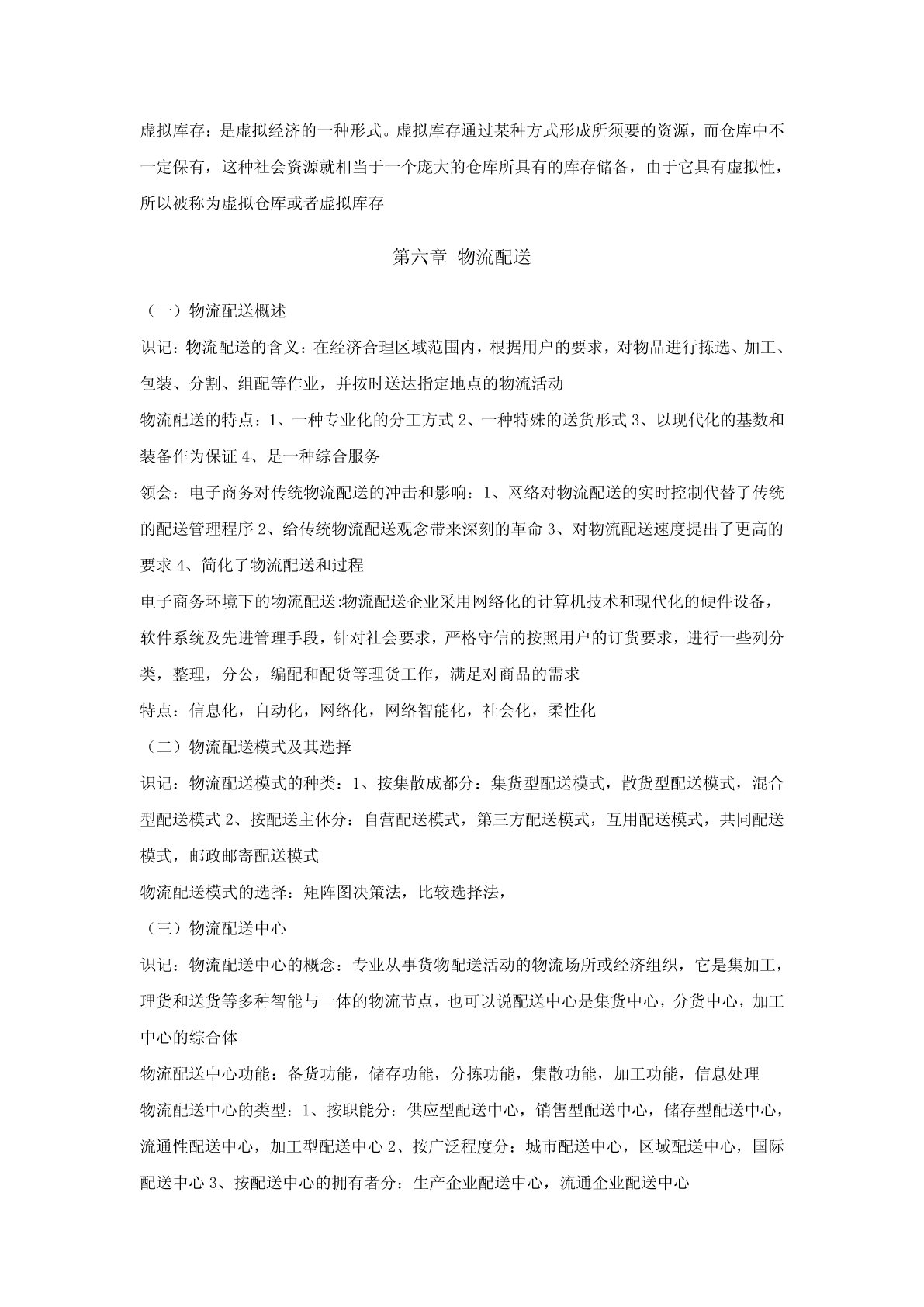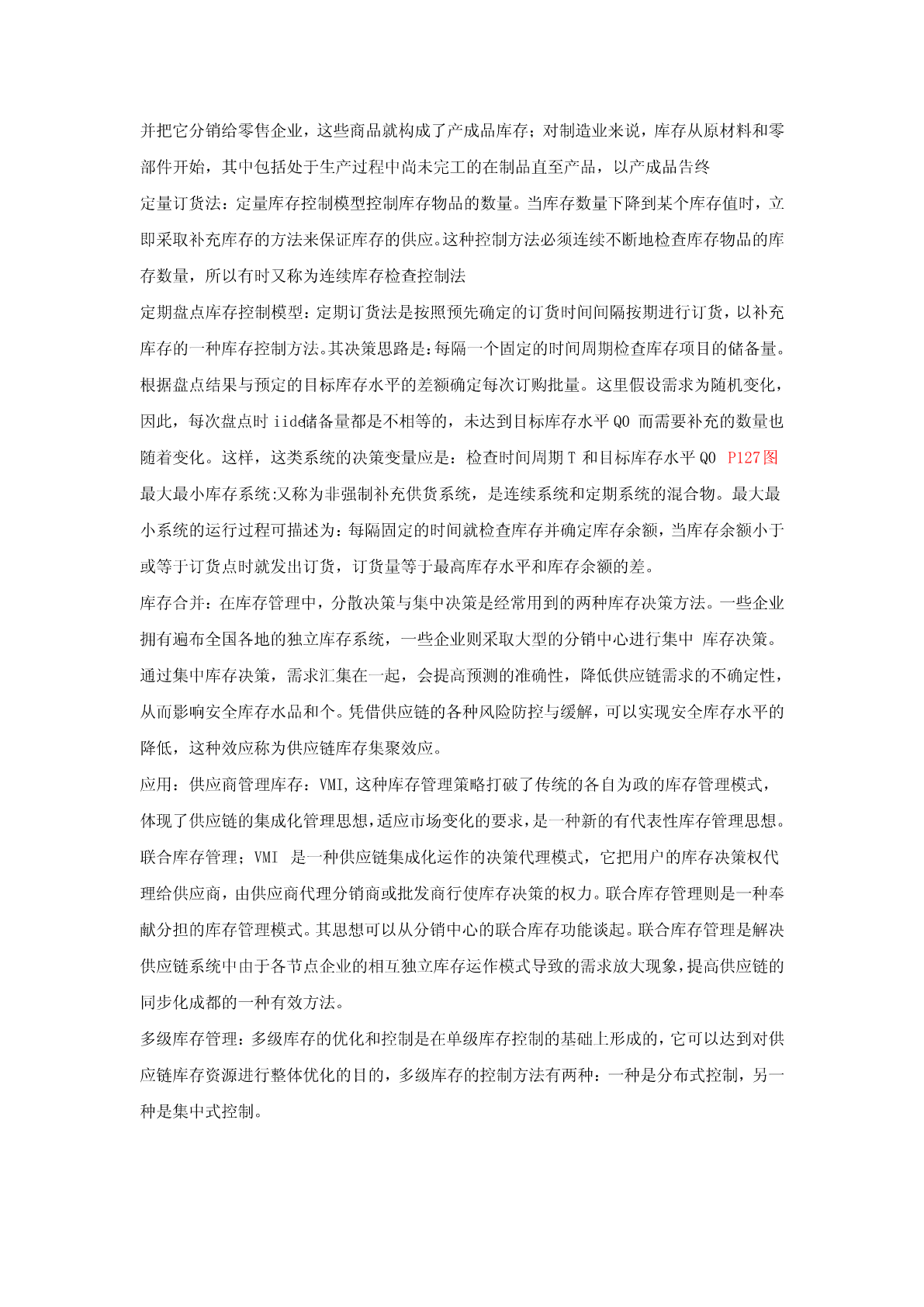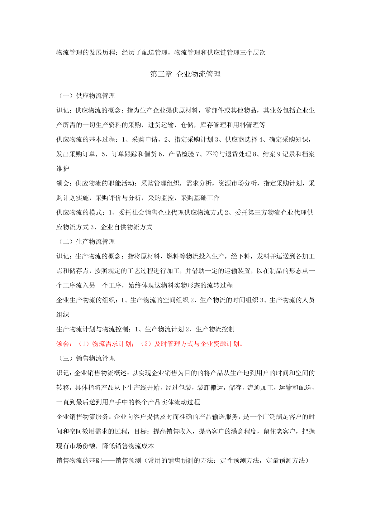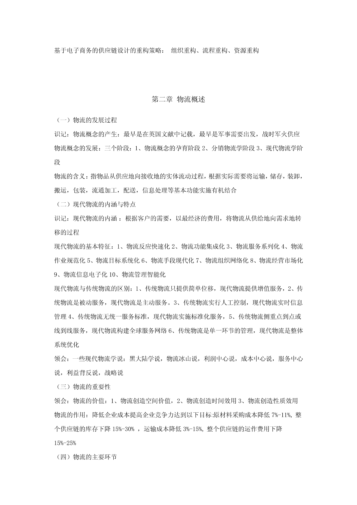 第一章供应链管理导论(一)供应链管理的基本理论识记:(1)供应链的概念;(2)供应链管理的概念;(3)供应链管理的发展;(4)供应链管理的八大原理;(5)供应链管理的四大支点。领会:供应链管理的战略意义。(二)供应链管理的实施识记:(1)供应链管理的实施基础;(2)供应链管理的实施步骤。领会:实施供应链管理的对策。(三)供应链管理的策略识记:(1)供应链的运营机制;(2)供应链管理的基本方法。(四)供应链系统的设计识记:(1)供应链的类型;(2)供应链设计的基本思想。领会:(1)供应链设计的原则;(2)基于产品的供应链设计;(3)基于电子商务的供应链系统设计。(一)供应链管理的基本理论识记:供应链的概念:生产与流通过程中所涉及的将产品与服务提供给最终用户的上游和下游企业所形成的网链结构供应链管理的概念:(SCM)利用计算机网络技术全面规划供应链中的商流,物流,信息流和资金流等,并进行计划、组织、协调与控制等供应链管理的发展:第一阶段为:独立的物流配送和物流成本管理阶段,主要研究实体分销和对下游厂商的配送系统,第二阶段为整合的物流管理阶段,注重企业内部物流和外部物流的整合,并研究企业间采购和供应战略,强调合作关系的加强,第三阶段为整合供应链管理阶段,主要研究从供应商的供应商到客户的客户的整体供应链研究,注重整体价值链效率的提高和价值增值供应链管理的八大原理:1、资源横向集成原理2、系统原理,3、多赢互惠原理4、合作共享原理5、需求驱动原理6、快速响应原理7、同步运作原理8动态重构原理供应链管理的四大支点:1、以客户为中心2、强调企业的核心竞争力3、相互协作的双赢理念4、优化信息流程领会:供应链管理的战略意义:1、对现代流通方式的创新2、加速现代生产方式的产生和发展3、改变现代社会竞争的方式4、导致企业机构和供应链的重构5、促进现代信息技术的应用(二)供应链管理的实施识记:供应链管理的实施基础:1、信息资源共享2、提高服务质量3、实现双赢供应链管理的实施步骤:1、企业资源管理(ERP)2、数据同步采集和实时分析3、接单,即电子订单系统4、供应链规划5、电子采购系统,包括采购订单的管理,6、VMI库存管理领会:实施供应链管理的对策:1、提高对供应链管理的认识,2、对现有的供应链进行整合3、加速推广现代信息技术的应用(三)供应链管理的策略识记:供应链的运营机制:1、决策机制2、合作机制3、自律机制4、激励机制供应链管理的基本方法:1、快速反应QR,2、有效客户反应ECR,3、供应商管理库存VMI,4、联合库存管理JMI,5、系统计划、预测与补货CPFR(四)供应链系统的设计识记:供应链的类型:1、稳定的供应链和动态的供应链2、平衡的供应链和倾斜的供应链3、有效性供应链和反应性供应链供应链设计的基本思想:1、供应链设计与物流系统设计2、供应链设计与环境因素的考虑3、供应链设计与企业再造工程4、供应链设计与先进制造模式的关系领会:供应链设计的原则:1、总的原则:自顶向下和自底向上相结合的设计原则,简洁性原则,集优原则(互补原则),协调性原则,动态性(不确定性原则),创新性原则,战略性原则,2、一些具体的原则:总成本最小原则,多样化原则,推迟原则,合并原则,标准化原则基于产品的供应链设计:1、两种不同类型的产品,2、两种不同功能的供应链,3、供应链设计与产品特点的匹配基于电子商务的供应链系统设计:1、电子商务环境下供应链设计原则:1)优化原则2)柔性原则3)创新性原则4)战略性原则5)协调性原则6)简洁性原则,2、基于电子商务的供应链设计步骤:1)分析市场竞争环境2)分析供应链现状3)提出供应链设计项目4)建立供应链设计的目标5)构建供应链框架6)评价供应链可行性7)设计和创建供应链8)检验和实施供应链基于电子商务的供应链设计的重构策略:组织重构、流程重构、资源重构第二章物流概述(一)物流的发展过程识记:物流概念的产生:最早是在英国文献中记载,最早是军事需要出发,战时军火供应物流概念的发展:三个阶段:1、物流概念的孕育阶段2、分销物流学阶段3、现代物流学阶段物流的含义:指物品从供应地向接收地的实体流动过程,根据实际需要将运输,储存,装卸,搬运,包装,流通加工,配送,信息处理等基本功能实施有机结合(二)现代物流的内涵与特点识记:现代物流的内涵:根据客户的需要,以最经济的费用,将物流从供给地向需求地转移的过程现代物流的基本特征:1、物流反应快速化2、物流功能集成化3、物