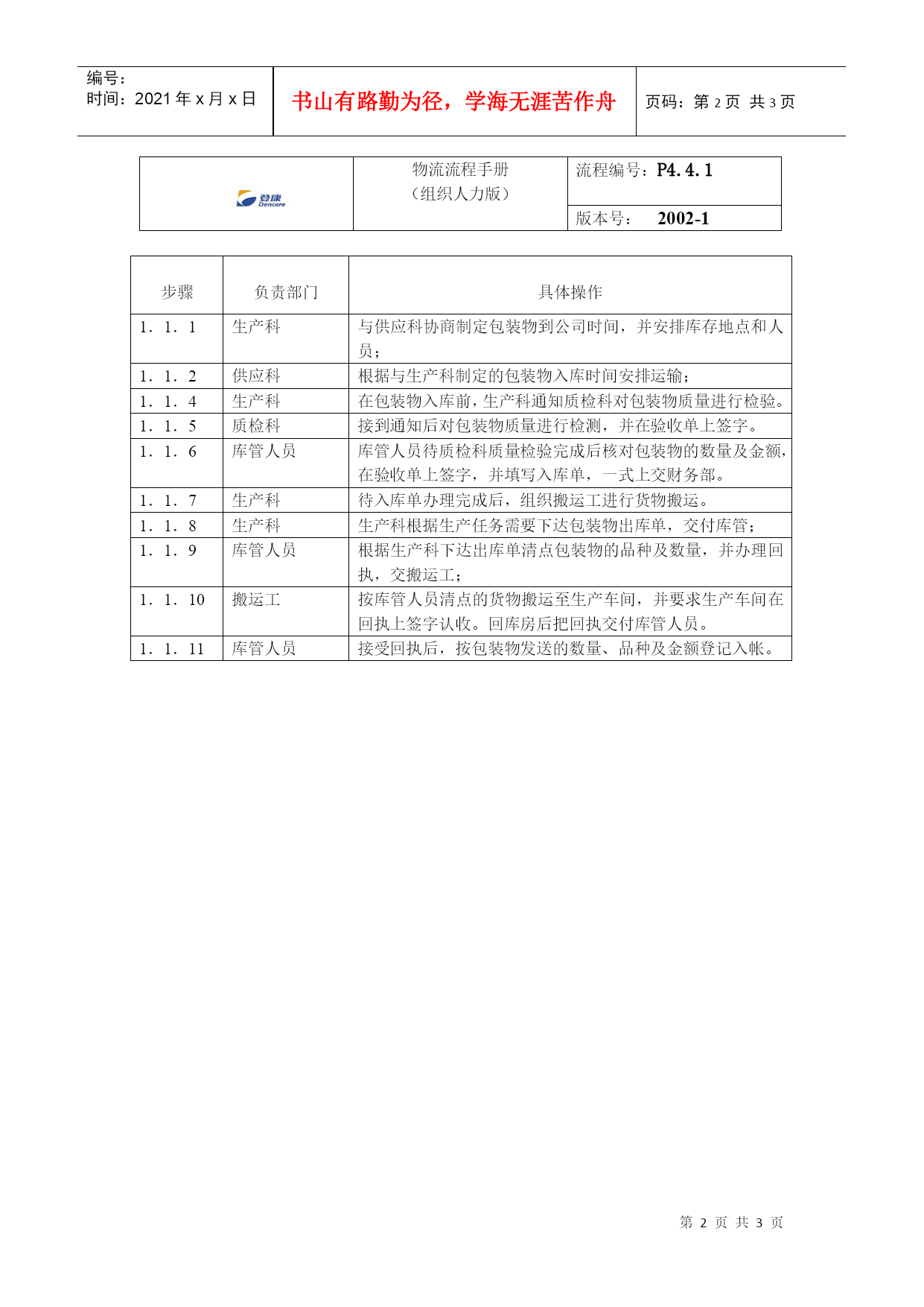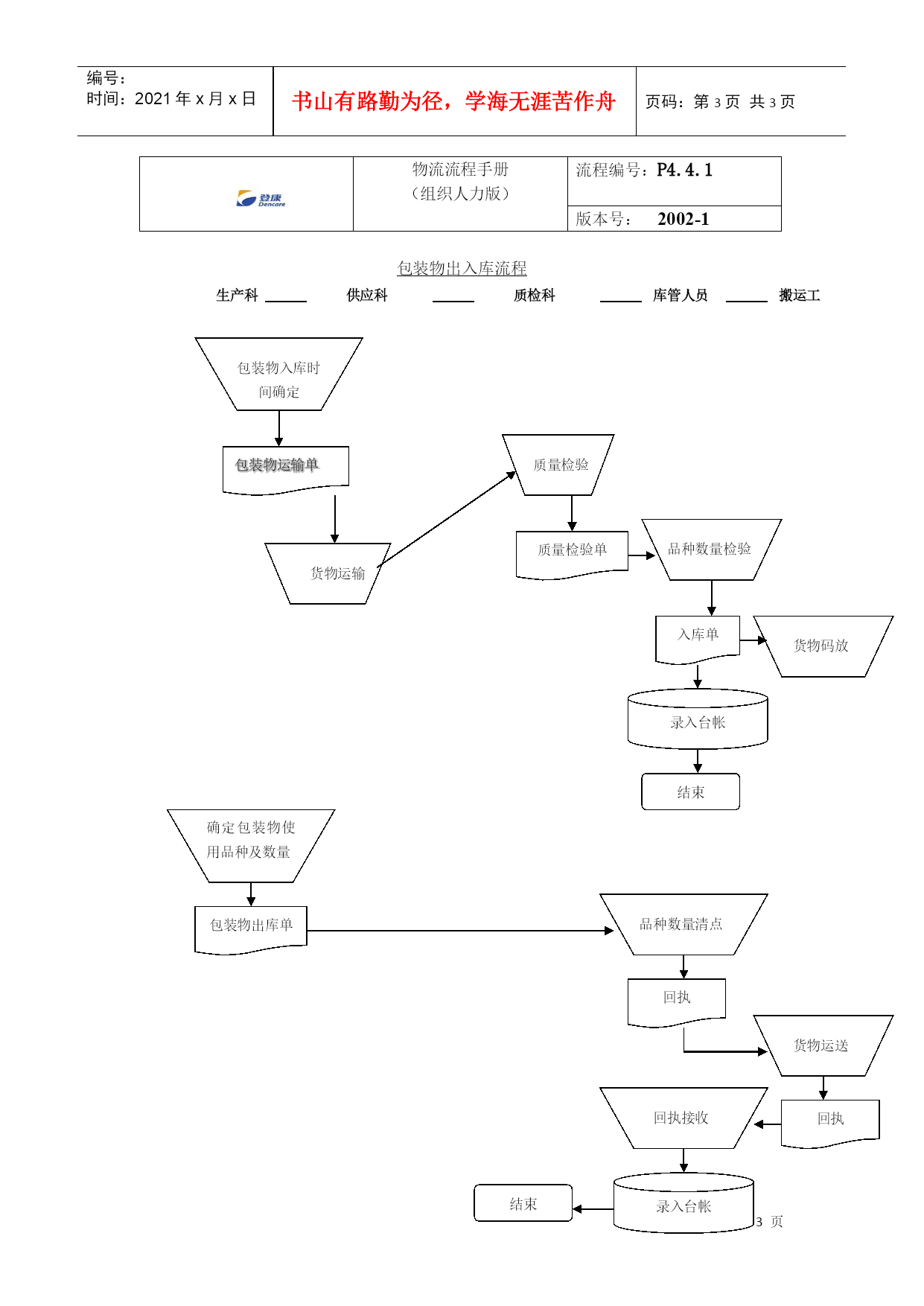 编号:时间:2021年x月x日书山有路勤为径,学海无涯苦作舟页码:第PAGE3页共NUMPAGES3页第PAGE\*MERGEFORMAT3页共NUMPAGES\*MERGEFORMAT3页物流流程手册(组织人力版)流程编号:P4.4.1版本号:2002-1项目物流流程-包装物管理流程生效日期修改版本编制人:失效序号序号日期1.1适用范围本流程适用于公司对包装物入库出库的各项工作。1.2控制目的本流程旨用规范对包装物出入库工作的规范化管理。1.3执行部门生产科、运输科、供应科、质检科、财务科1.4关键控制点1.4.1及时性1.4.2安全性物流流程手册(组织人力版)流程编号:P4.4.1版本号:2002-1步骤负责部门具体操作1.1.1生产科与供应科协商制定包装物到公司时间,并安排库存地点和人员;1.1.2供应科根据与生产科制定的包装物入库时间安排运输;1.1.4生产科在包装物入库前,生产科通知质检科对包装物质量进行检验。1.1.5质检科接到通知后对包装物质量进行检测,并在验收单上签字。1.1.6库管人员库管人员待质检科质量检验完成后核对包装物的数量及金额,在验收单上签字,并填写入库单,一式上交财务部。1.1.7生产科待入库单办理完成后,组织搬运工进行货物搬运。1.1.8生产科生产科根据生产任务需要下达包装物出库单,交付库管;1.1.9库管人员根据生产科下达出库单清点包装物的品种及数量,并办理回执,交搬运工;1.1.10搬运工按库管人员清点的货物搬运至生产车间,并要求生产车间在回执上签字认收。回库房后把回执交付库管人员。1.1.11库管人员接受回执后,按包装物发送的数量、品种及金额登记入帐。物流流程手册(组织人力版)流程编号:P4.4.1版本号:2002-1供应科质检科搬运工库管人员生产科包装物出入库流程包装物入库时间确定质量检验包装物运输单品种数量检验质量检验单货物运输入库单货物码放录入台帐结束确定包装物使用品种及数量结束录入台帐回执接收回执货物运送回执品种数量清点包装物出库单
