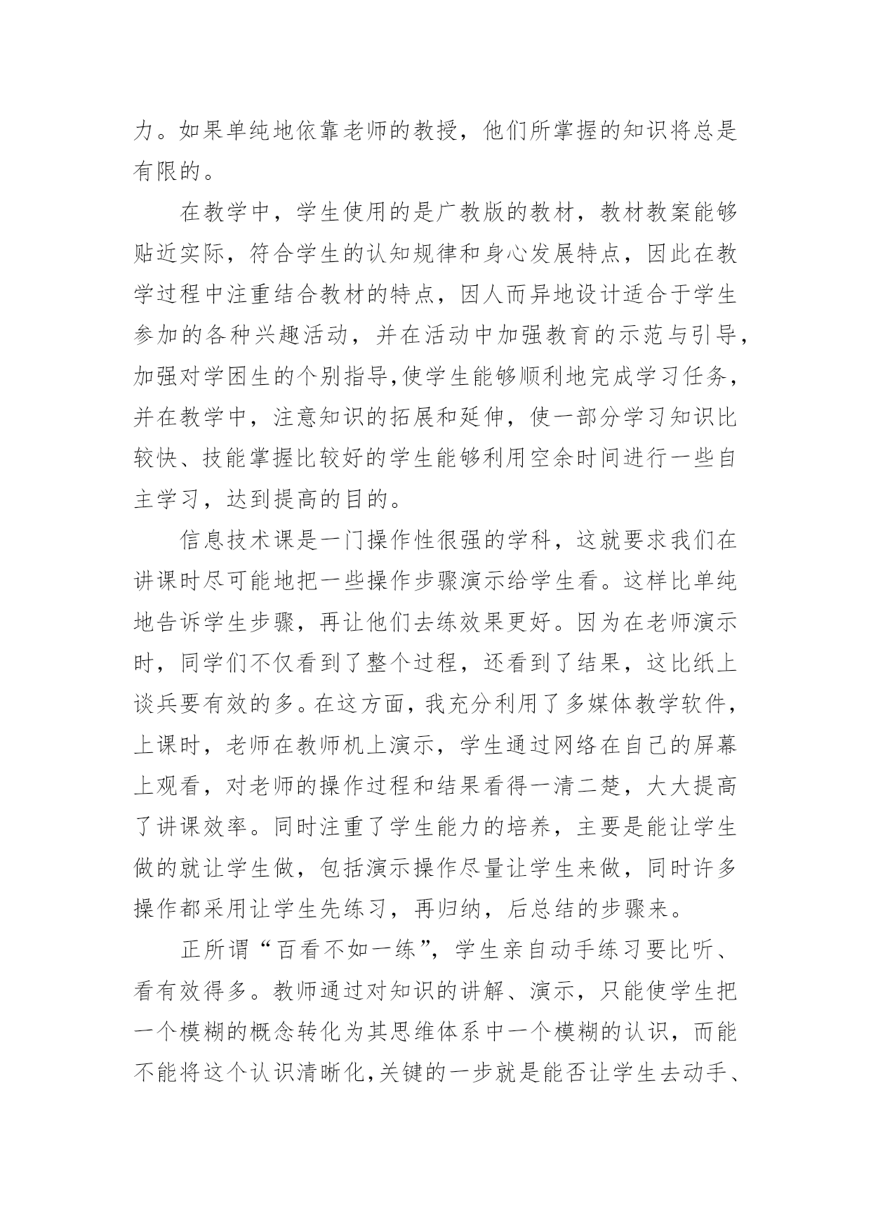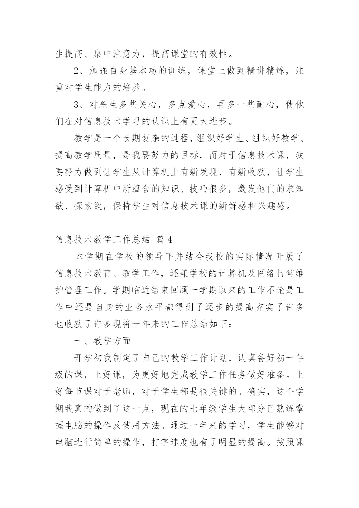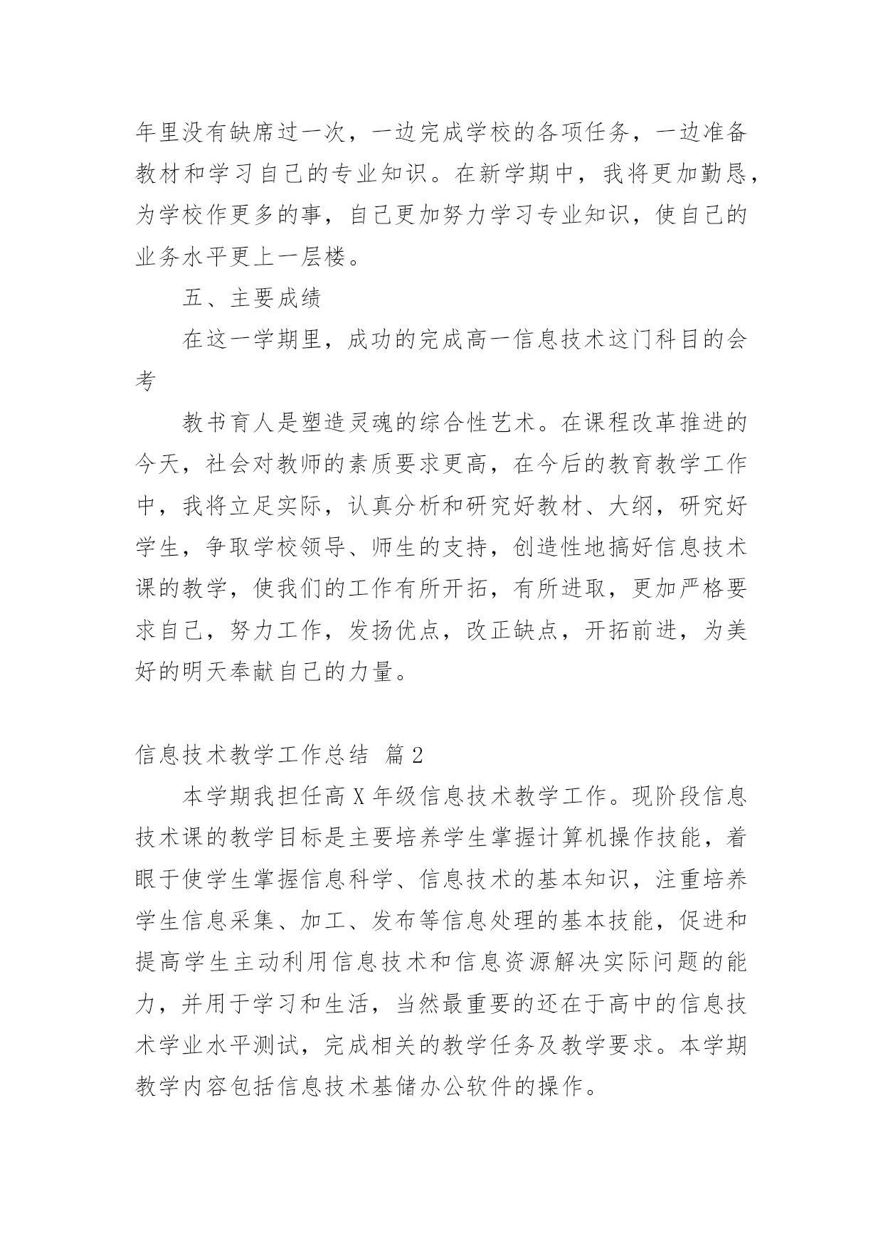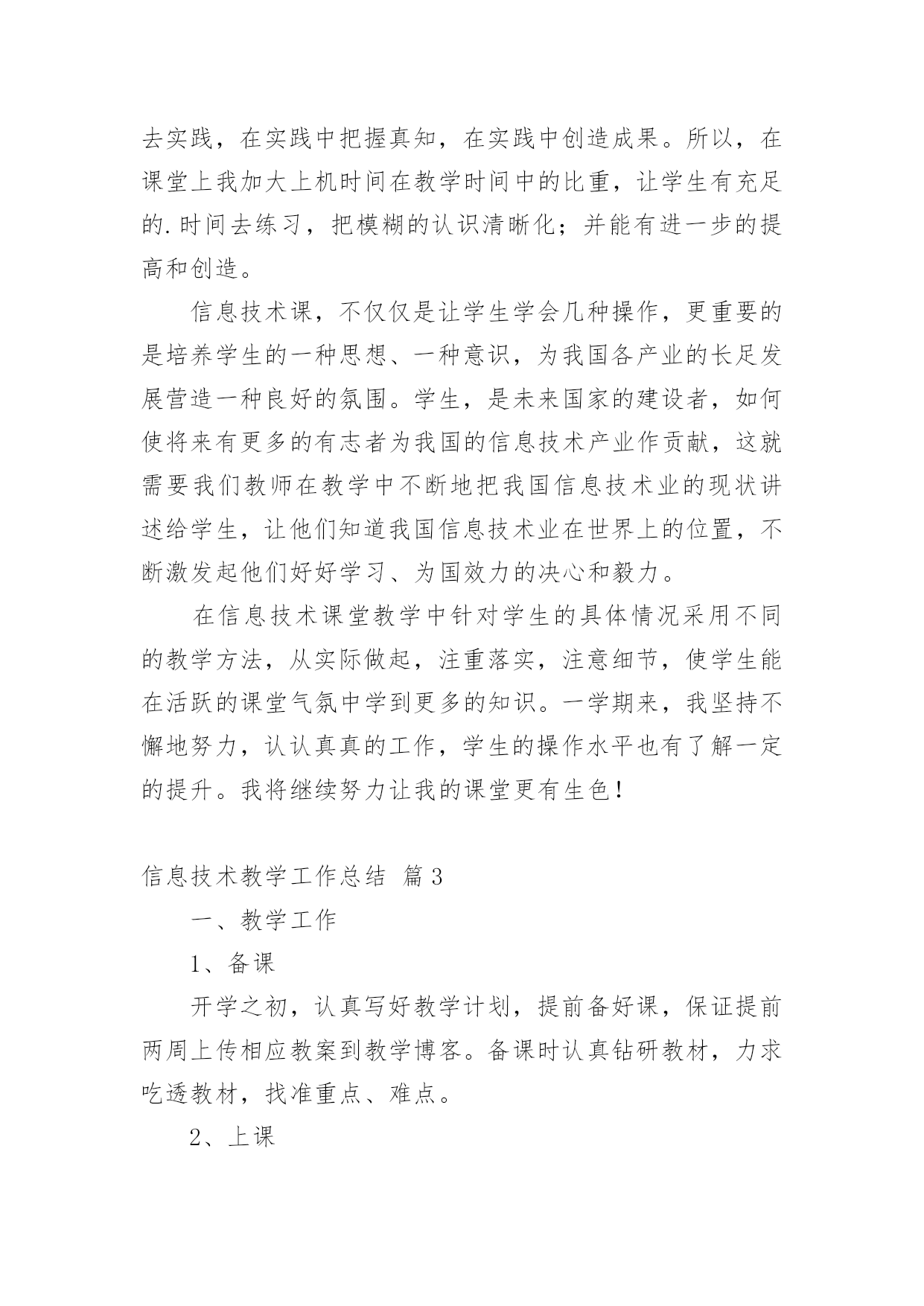 信息技术教学工作总结信息技术教学工作总结模板合集10篇总结是把一定阶段内的有关情况分析研究,做出有指导性结论的书面材料,它能够给人努力工作的动力,快快来写一份总结吧。总结怎么写才不会千篇一律呢?下面是小编精心整理的信息技术教学工作总结10篇,欢迎阅读,希望大家能够喜欢。信息技术教学工作总结篇1一、思想认识我在思想上严于律己,热爱党的教育事业,全面贯彻党的教育方针,以党员的要求严格要求自己,鞭策自己,力争思想上和工作上在同事、学生的心目中都树立起榜样的作用。积极参加学校组织的各项政治活动,如学校的党员冬训活动。一学期来,我服从学校的工作安排,配合领导和老师们做好校内外的各项工作。我相信在以后的工作学习中,我会在党组织的关怀下,在同事们的帮助下,通过自己的努力,克服缺点,取得更大的进步。新学期即将来临,我将更加努力工作,勤学苦练,使自己真正成为一个经受得起任何考验的人民教师。二、教学工作在教学工作方面,整学期的教学任务都非常重,独自一人担任高一8个班级的信息技术课,一周课时高达17节,但不管怎样,为了把自己的教学水平提高,我坚持经常看电脑报、信息技术奥赛书籍等,还经常网上找一些优秀的教案课件学习,还争取机会多出外听课,从中学习别人的长处,领悟其中的教学艺术。平时还虚心请教有经验的老师。在备课过程中认真分析教材,根据教材的特点及学生的实际情况设计教案。一学期来,认真备课、上课、听课、评课,及时批改作业、讲评作业,做好课后辅导工作,广泛涉猎各种知识,形成比较完整的知识结构,严格要求学生,尊重学生,发这学年我还一个人承担了高一信息技术选修课程《asp网页制作》和《数据库管理》课题。我查阅了很多的书籍和资料;三、学校工作我严格要求自己,工作实干,并能完成学校给予的各项任务。由于我们是信息技术教师,这个特殊的职业决定了我们必须还有很多的学校工作要做,我服从党和学校领导的安排,兢兢业业,主要完成了学校电脑室3的维护任务。在以后的工作,我将一如既往,脚踏实地,我会更加积极地配合学校领导完成各项任务,为学校的美好明天更加努力。四、考勤方面我在做好各项教育教学工作的同时,严格遵守学校的各项规章制度。处理好学校工作与个人之间的'关系,一个学年里没有缺席过一次,一边完成学校的各项任务,一边准备教材和学习自己的专业知识。在新学期中,我将更加勤恳,为学校作更多的事,自己更加努力学习专业知识,使自己的业务水平更上一层楼。五、主要成绩在这一学期里,成功的完成高一信息技术这门科目的会考教书育人是塑造灵魂的综合性艺术。在课程改革推进的今天,社会对教师的素质要求更高,在今后的教育教学工作中,我将立足实际,认真分析和研究好教材、大纲,研究好学生,争取学校领导、师生的支持,创造性地搞好信息技术课的教学,使我们的工作有所开拓,有所进取,更加严格要求自己,努力工作,发扬优点,改正缺点,开拓前进,为美好的明天奉献自己的力量。信息技术教学工作总结篇2本学期我担任高X年级信息技术教学工作。现阶段信息技术课的教学目标是主要培养学生掌握计算机操作技能,着眼于使学生掌握信息科学、信息技术的基本知识,注重培养学生信息采集、加工、发布等信息处理的基本技能,促进和提高学生主动利用信息技术和信息资源解决实际问题的能力,并用于学习和生活,当然最重要的还在于高中的信息技术学业水平测试,完成相关的教学任务及教学要求。本学期教学内容包括信息技术基储办公软件的操作。一、不断提高个人素养积极参加学校组织的政治学习,提高自己的政治素质和理论素养,注重自己思想道德水平的提高。平时积极参加教研活动,在工作之余,学习与农远工作和信息技术教学及计算机维护的相关知识,努力提高个人的业务水平,为信息技术教学工作打下良好的基础。二、扎实开展教学工作备课对于每门课程的教学而言,都是必不可少的环节,信息技术学科教学也不例外。在备课的过程中,我首先对所要教授的知识进行全面的研究、归纳、总结,并根据教授对象的不同特点找到教授的方法与方式。在此基础上将所备内容在计算机上进行逐一推敲、验证、演练,以使一些空洞的知识具有可操作性;同时,还将每个知识点构造成一个操作性实例,通过对实例的演练让学生对知识点产生准确、完整的认识,由此得出相关的结论。从而做到对人、书、机三者进行有机结合的备课,备课不只是在教案本上备课,而是把工作重点放在电子备课上。根据信息技术学科的基本特点,我在教学过程中当坚持以学生为主体,即在教师为主导、学生为主体的双主教学模式下进一步强调学生的主体地位。因为计算机课程操作性强、更新速度快、创造性强的特点都要求我们必须强调学生在教学活动中的主体地位。学生只有通过自主地学习,才能在掌握基础知识的基础上,发现问题,解决问题,从而提高自己的操作水平,跟上知识的发展更新并进一步发挥自己的创造力。如果单纯地依靠老师的教授,他们所